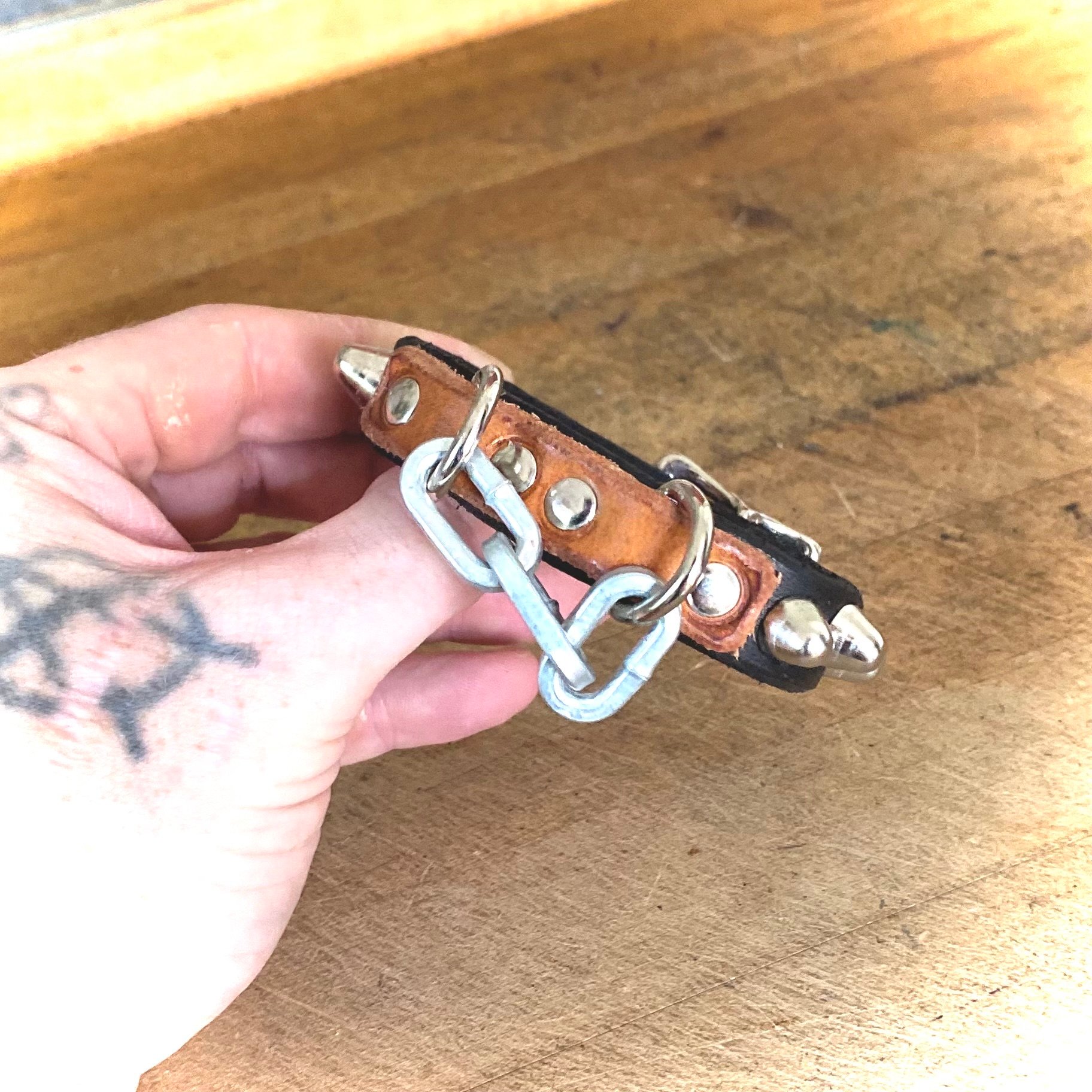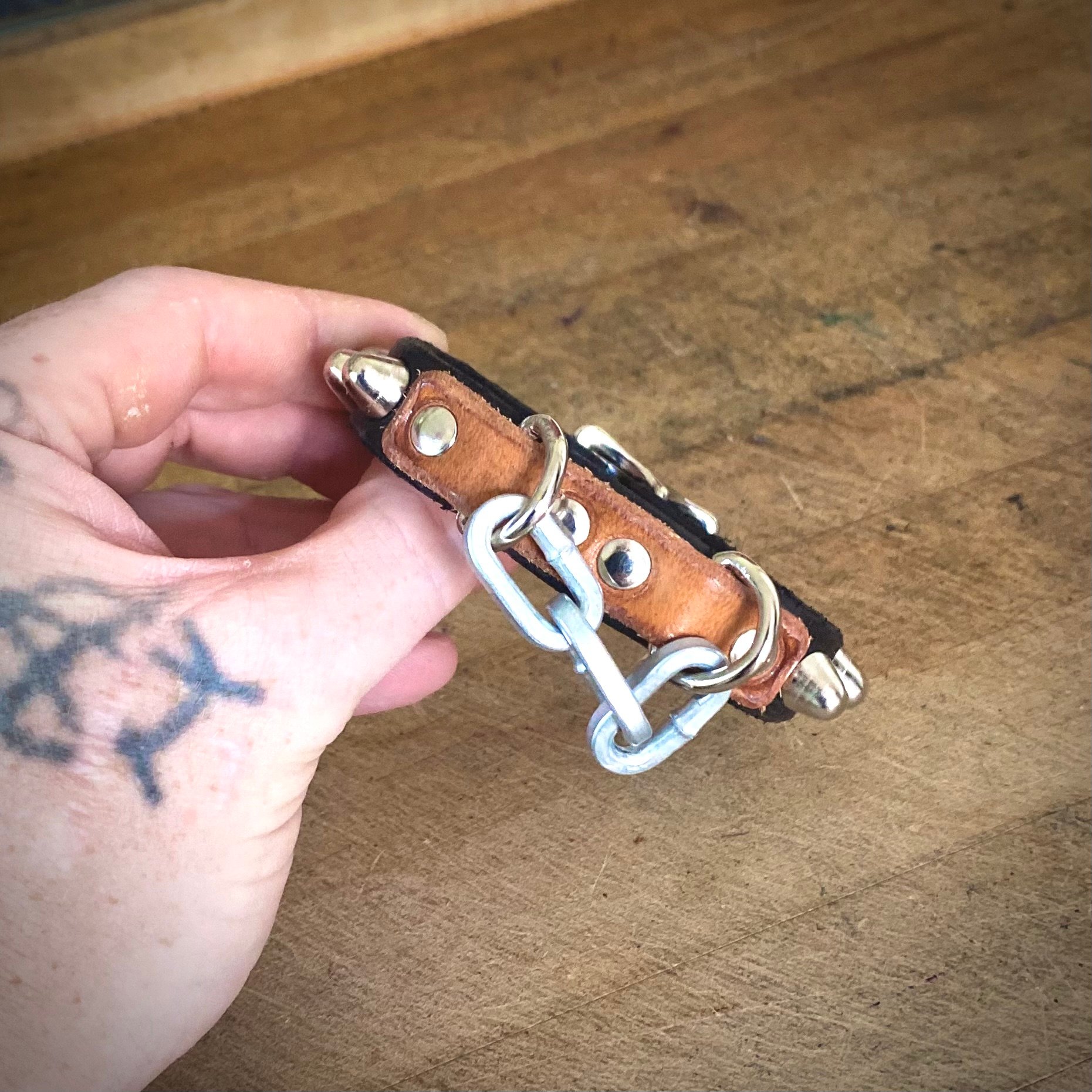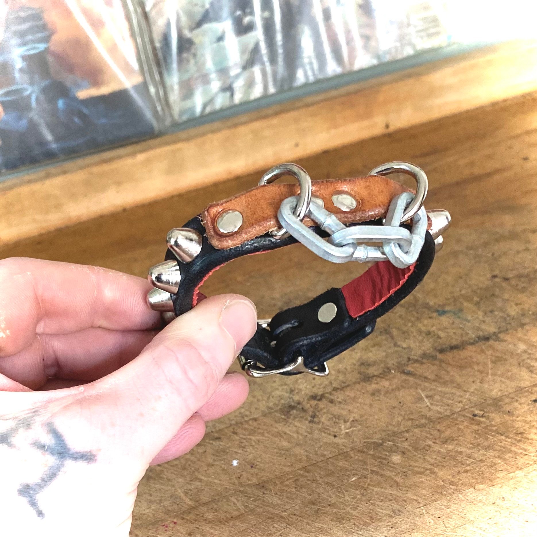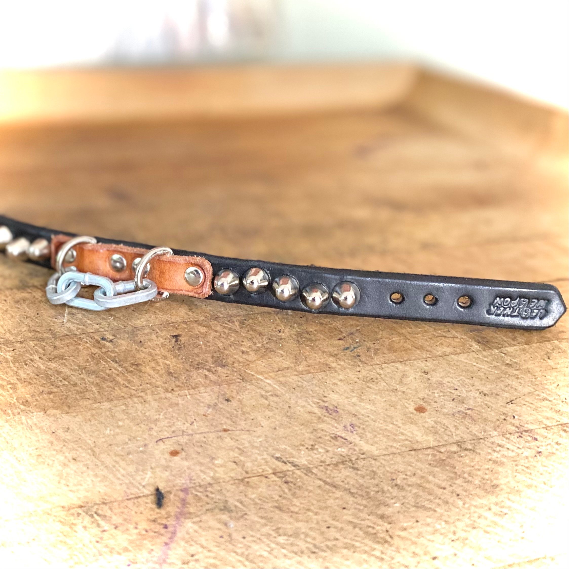 Hard-chain bit on 1/2” black leather strap with studs and 1/2” nickel buckle & D-Ring.