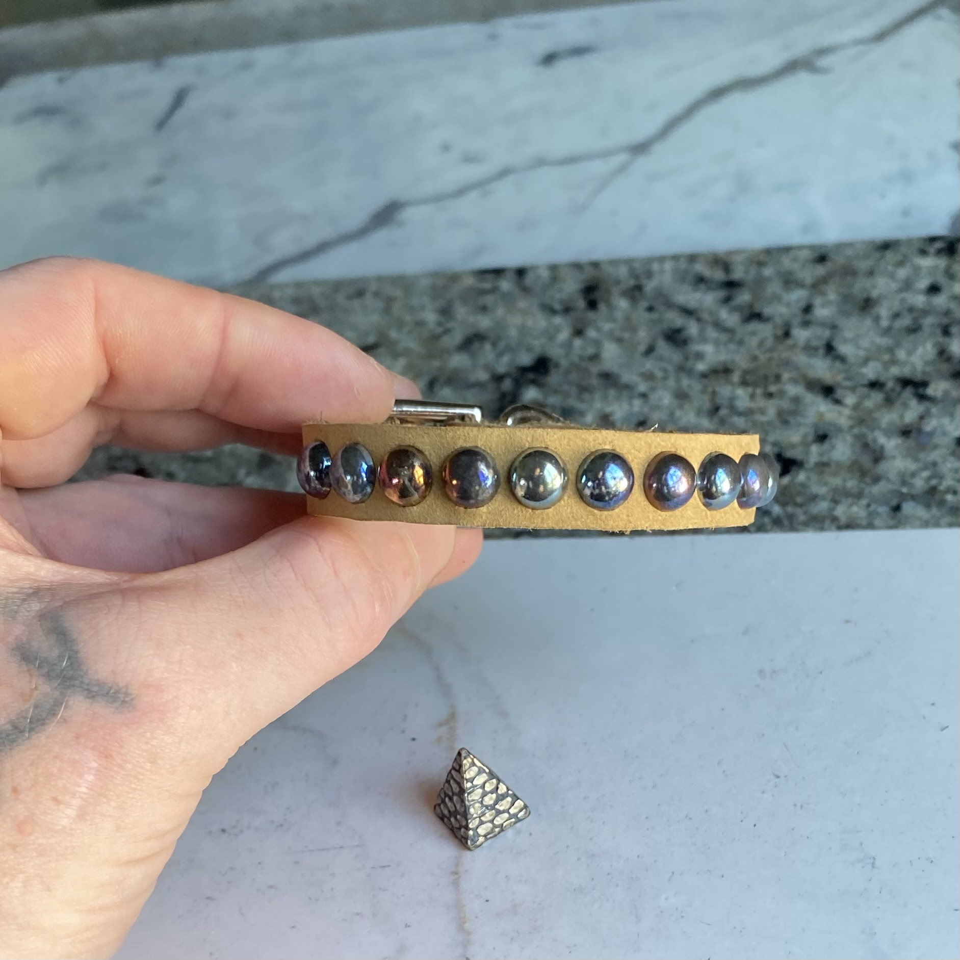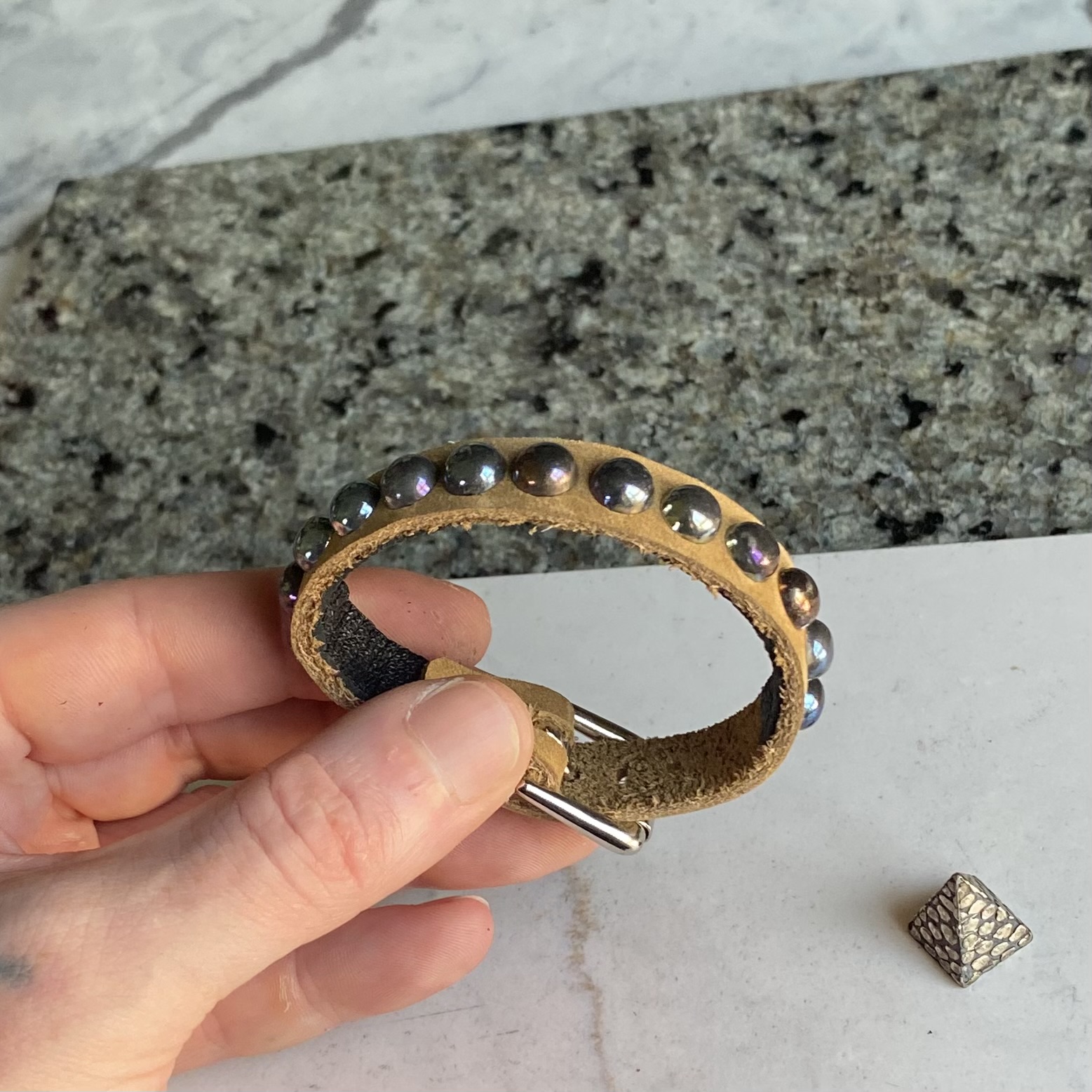 1/2” Tan leather with rainbow small domestuds, roller buckle and d-ring.