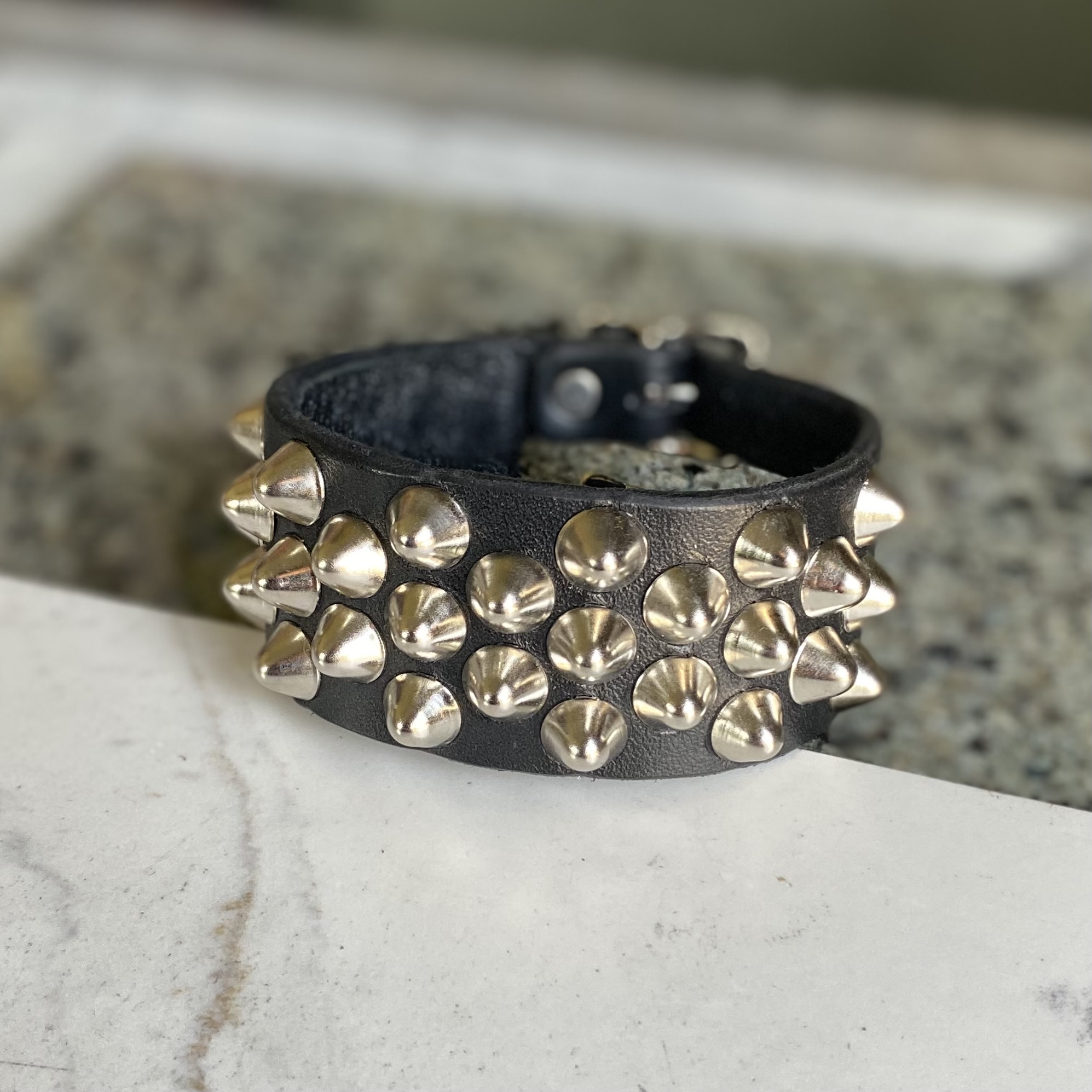 3-2-3 standard British studs on twinstrap 2” black leather & finished with self keeper buckles.