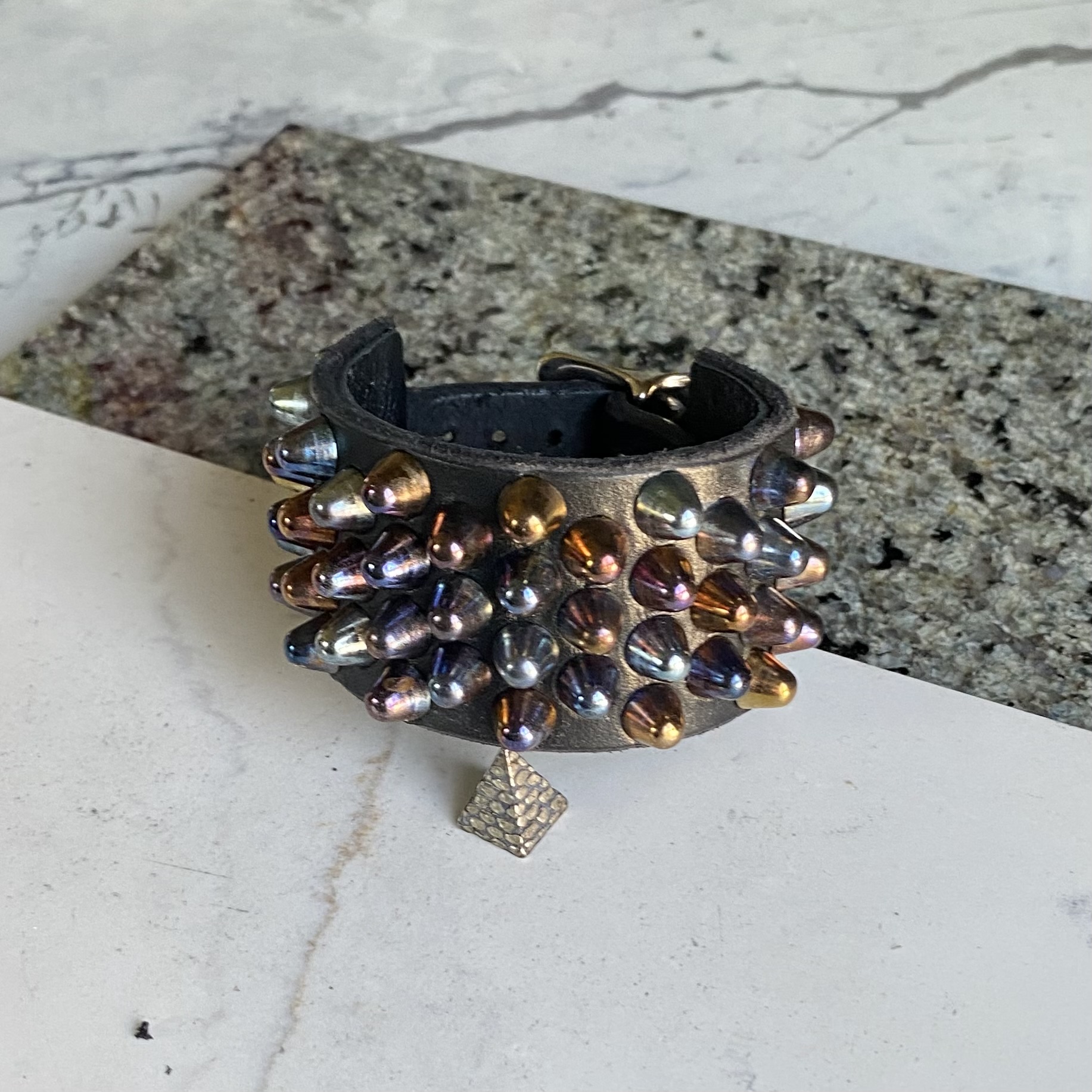 4-3-4 rainbow’d short british studs set on black leather with all nickel hardware and protective leather backing layer for your wrist.