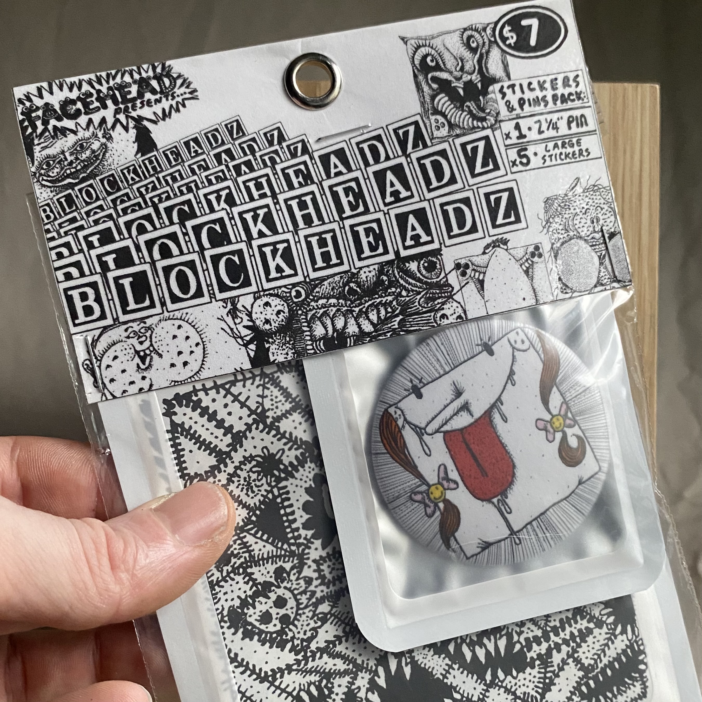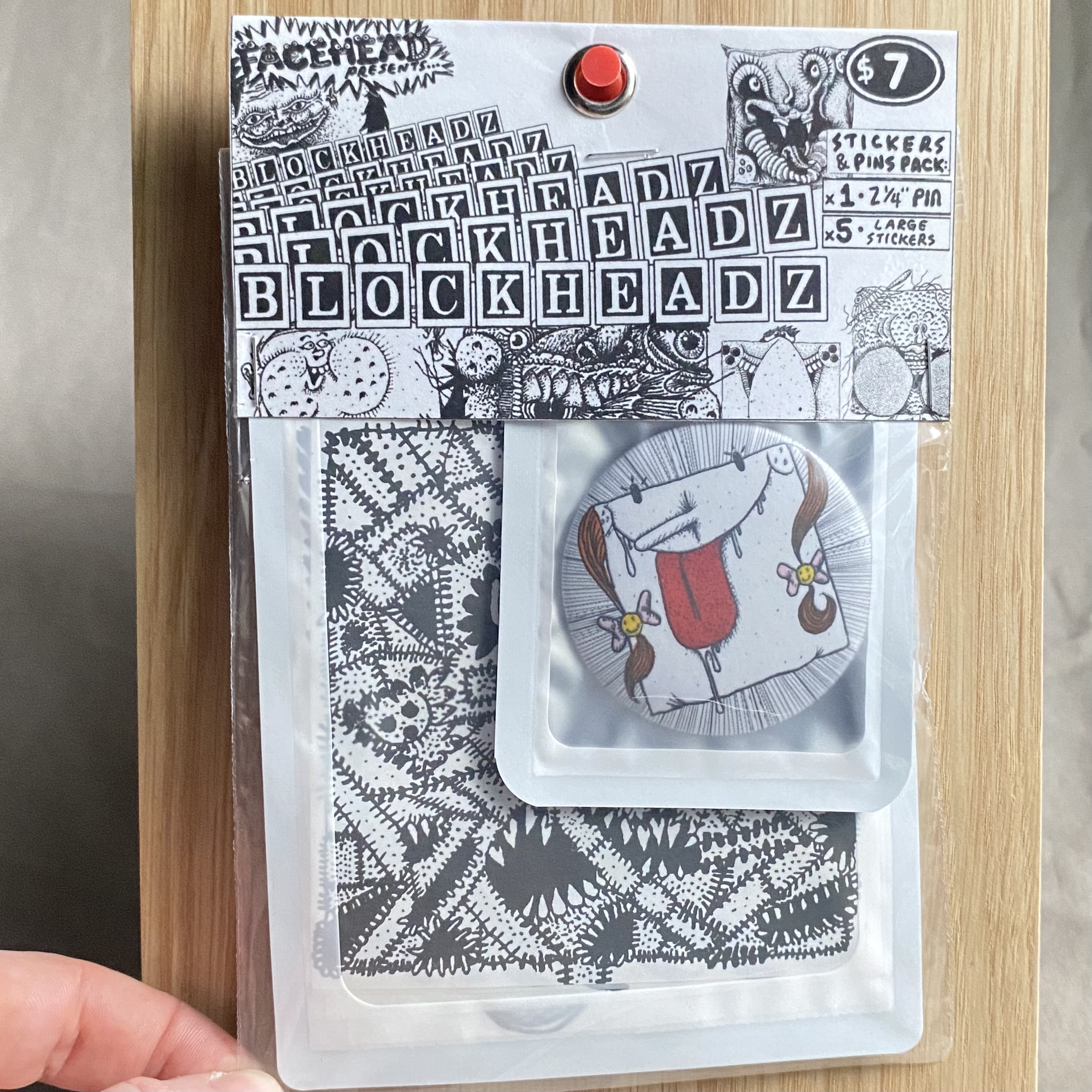 Assorted Sticker and Pin packs of varying prices/arrangements, consisting of 100 different characters by yours truly, Face-Head/Leatherhead.