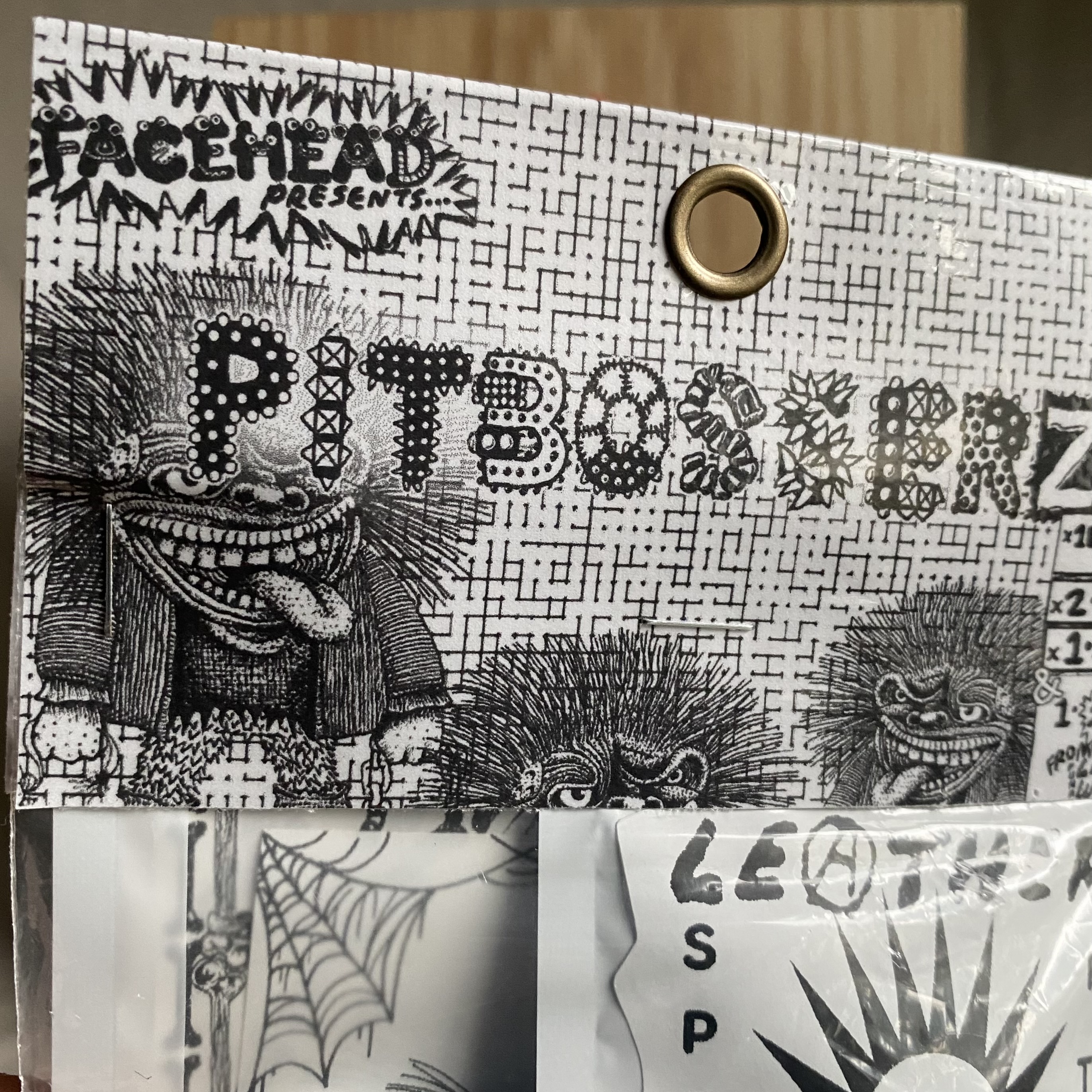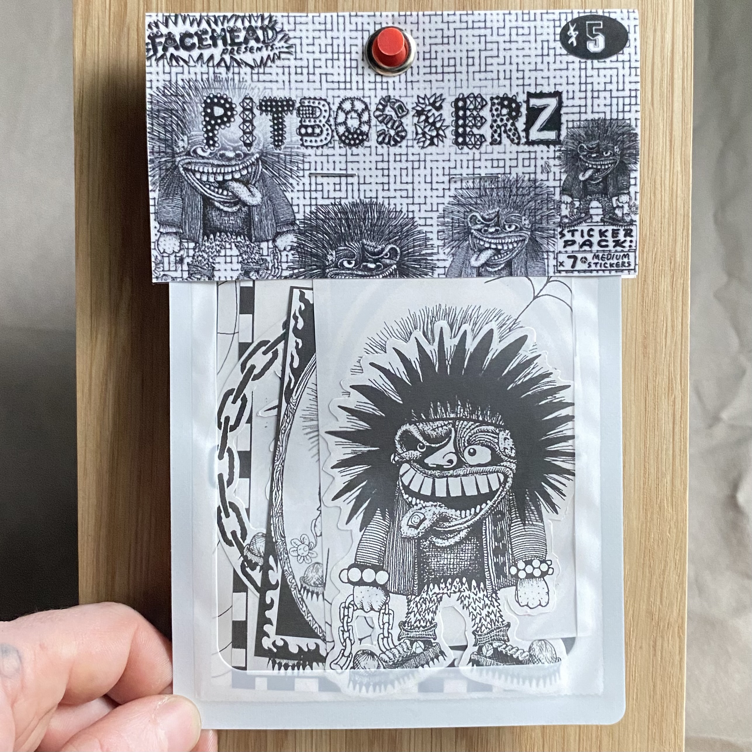 PITBOSSERZ: PUNKER BULLYBOYZ OF THE PIT!! A heavy-duty cretin boppin’ punk character I drew for Long-Knife’s logo spot on a gig flier I illustrated in 2023. For this set of characters, I expanded on one of them that i drew on the flier and added tons of different facial aspects/clothes/faces etc., as well as adding Hundreds of original border designs I drew for the project…So there are Many original pieces that make up this sticker line!