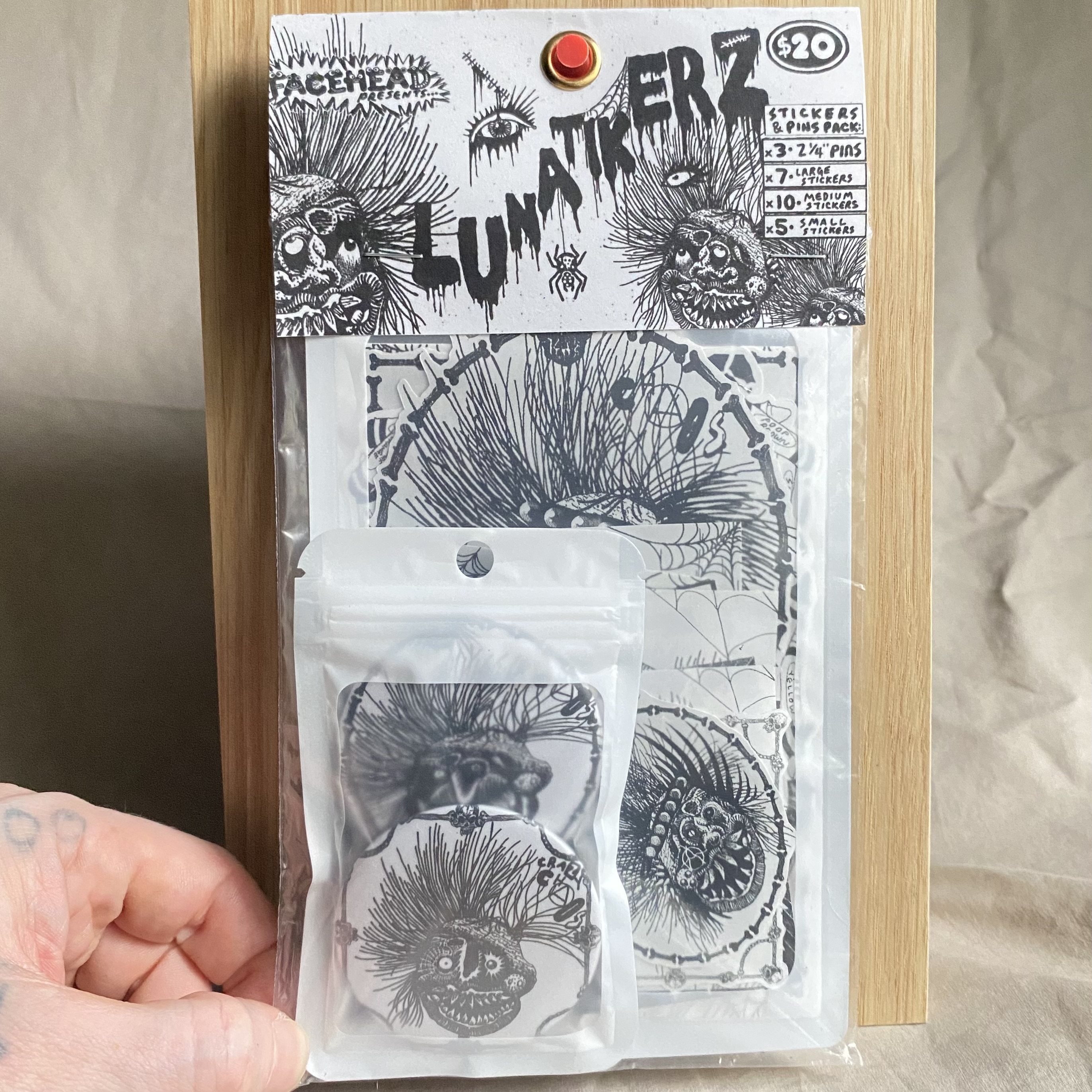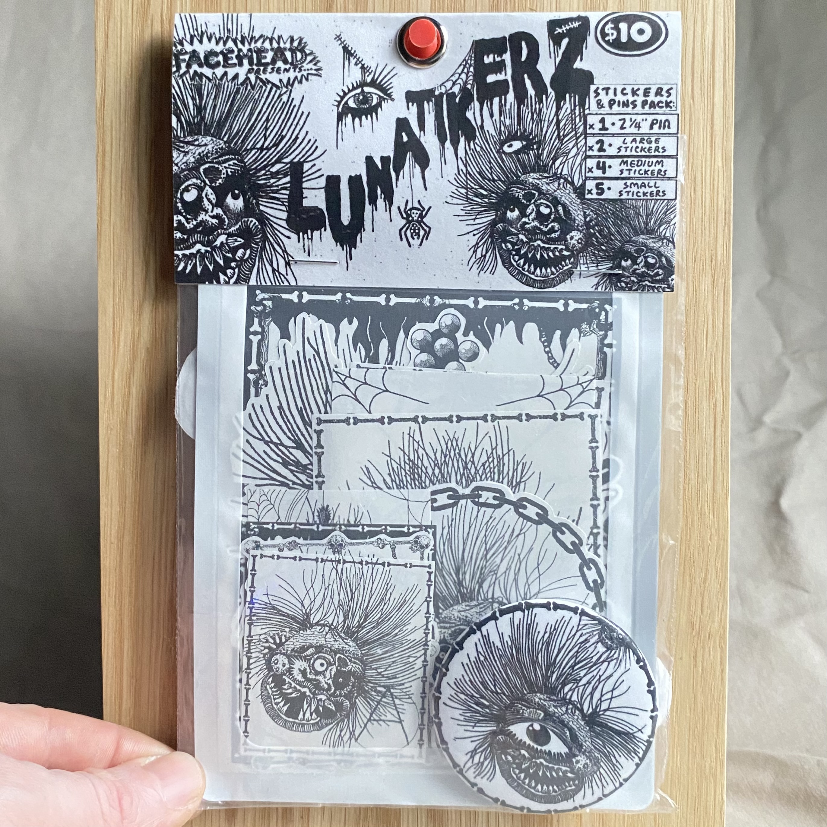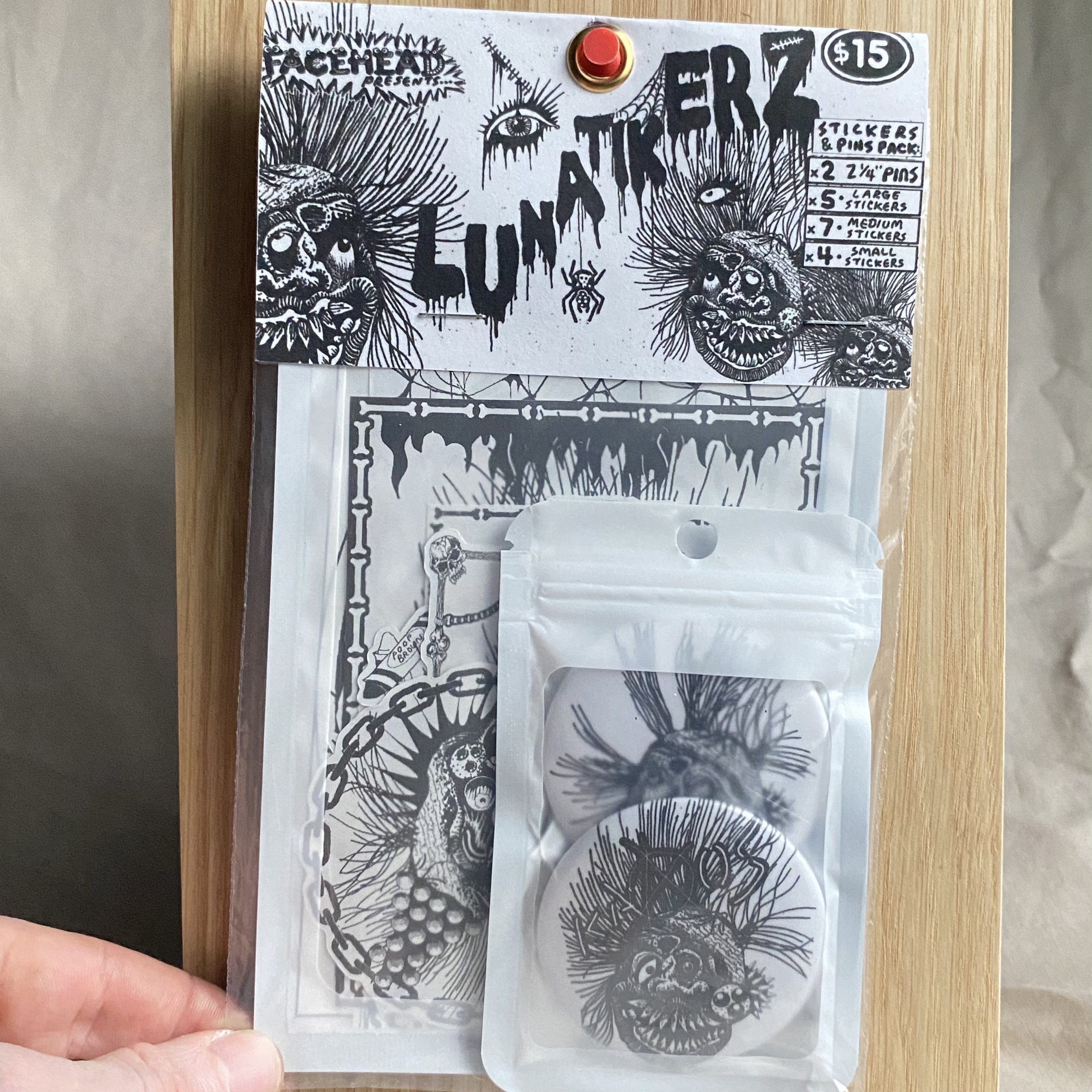This listing is for Assorted Sticker and Pin packs of varying prices/arrangements, consisting of the aforementioned wild brutalizers drawn by yours truly, Face-Head/Leatherhead.