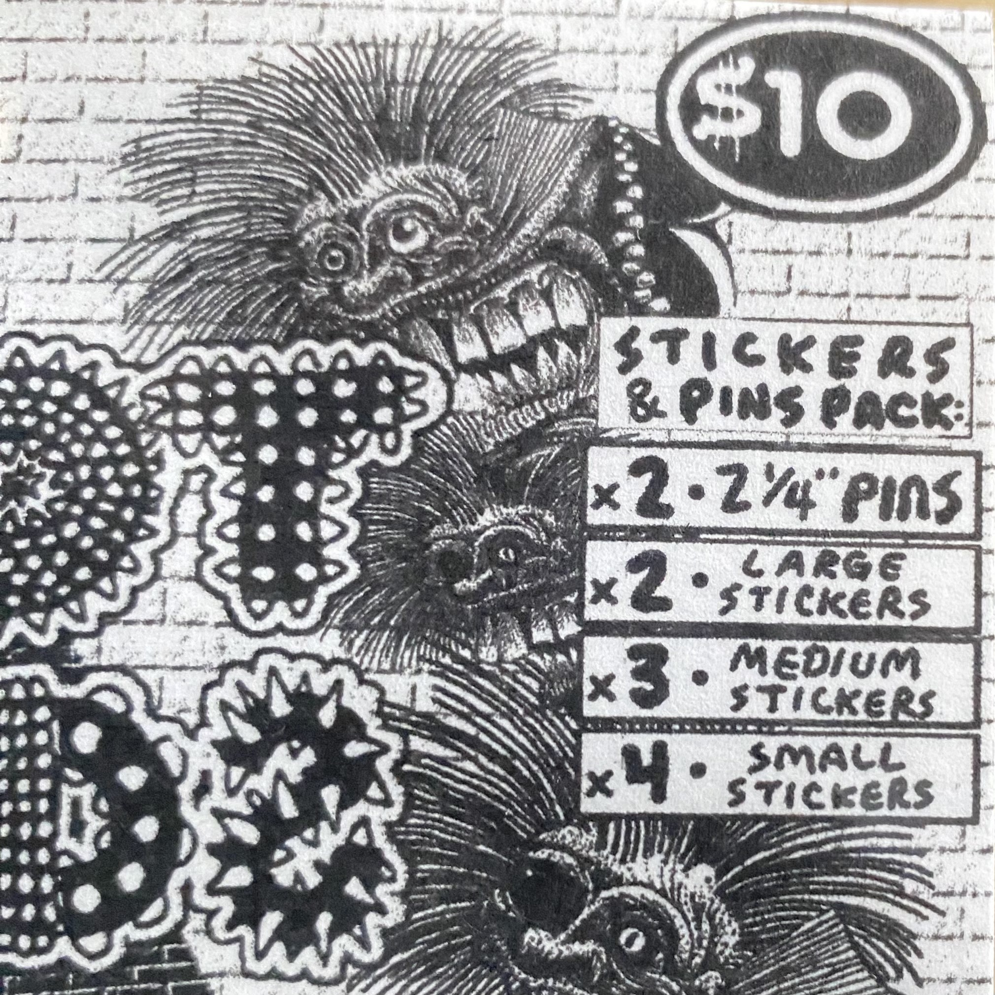 1-Pin, 2 Large Stickers, 4 Medium Stickers, 5 Small Stickers ($10.00)