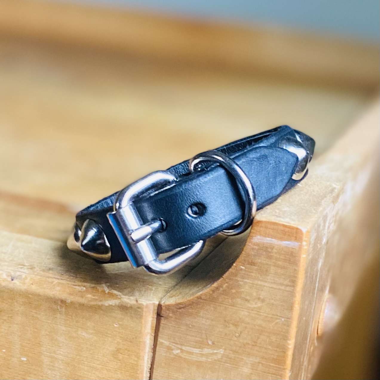 Black bridle leather with single row of standard cones and nickel hardware. Comes with protective Leather layer on backside of bracelet, over stud prongs to protect wrist