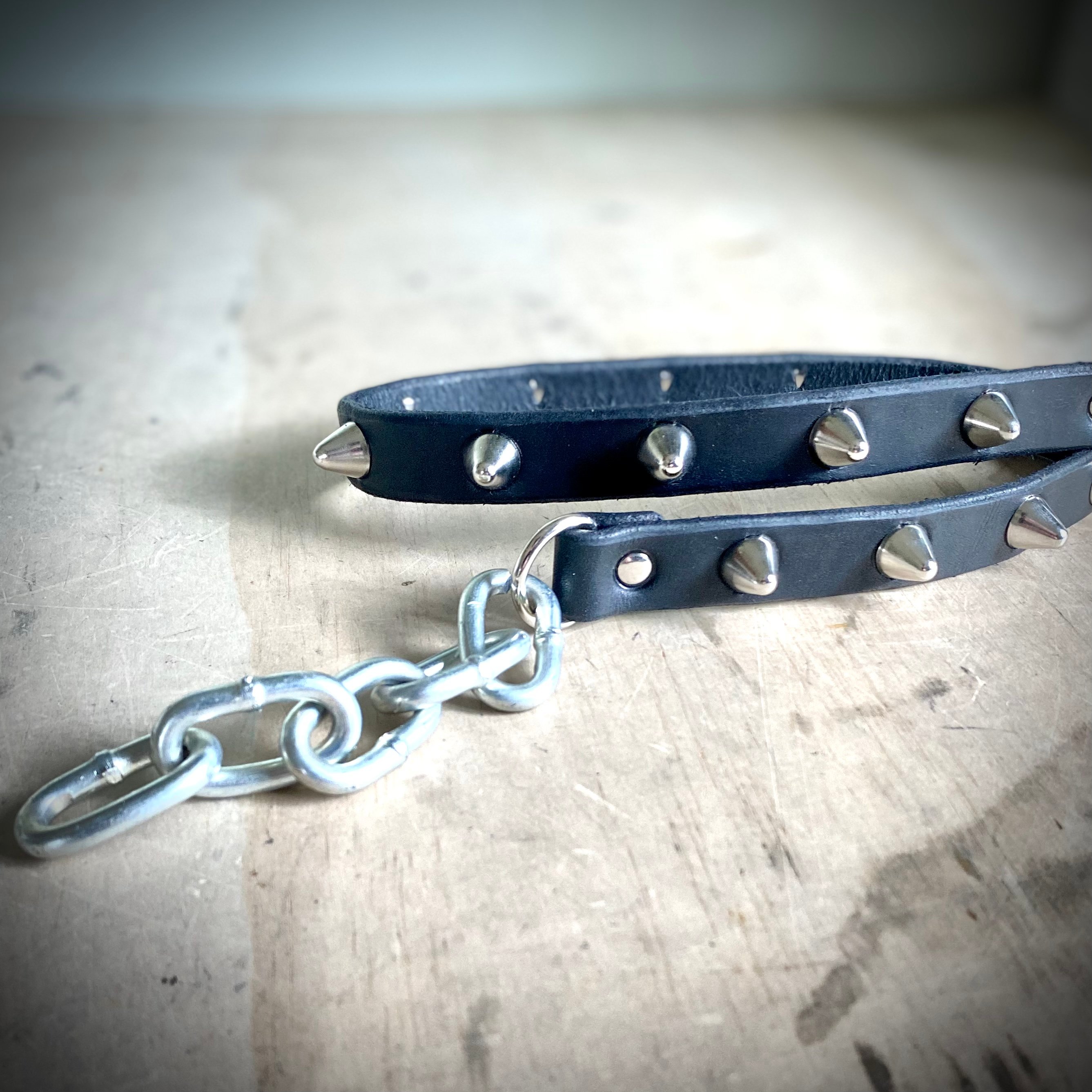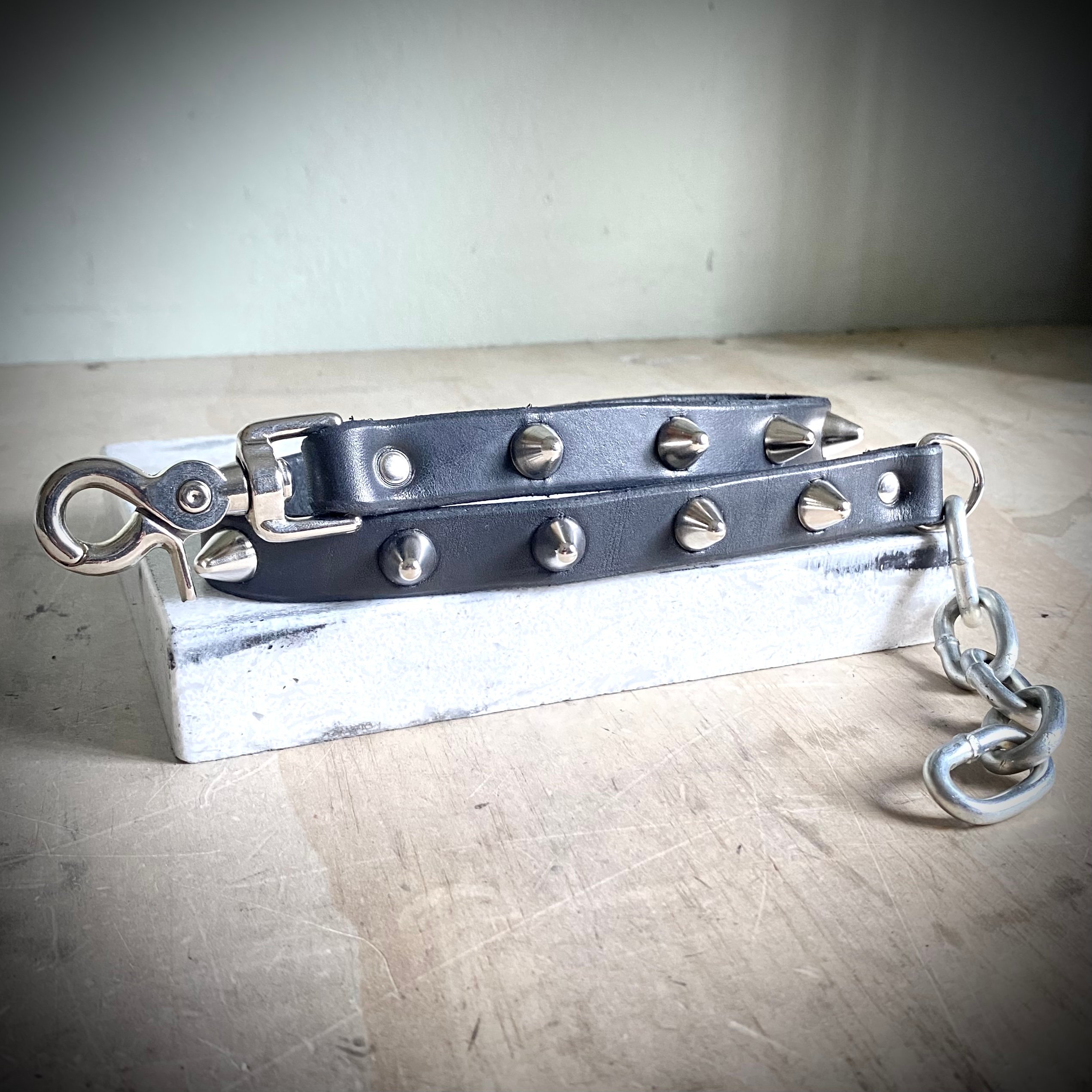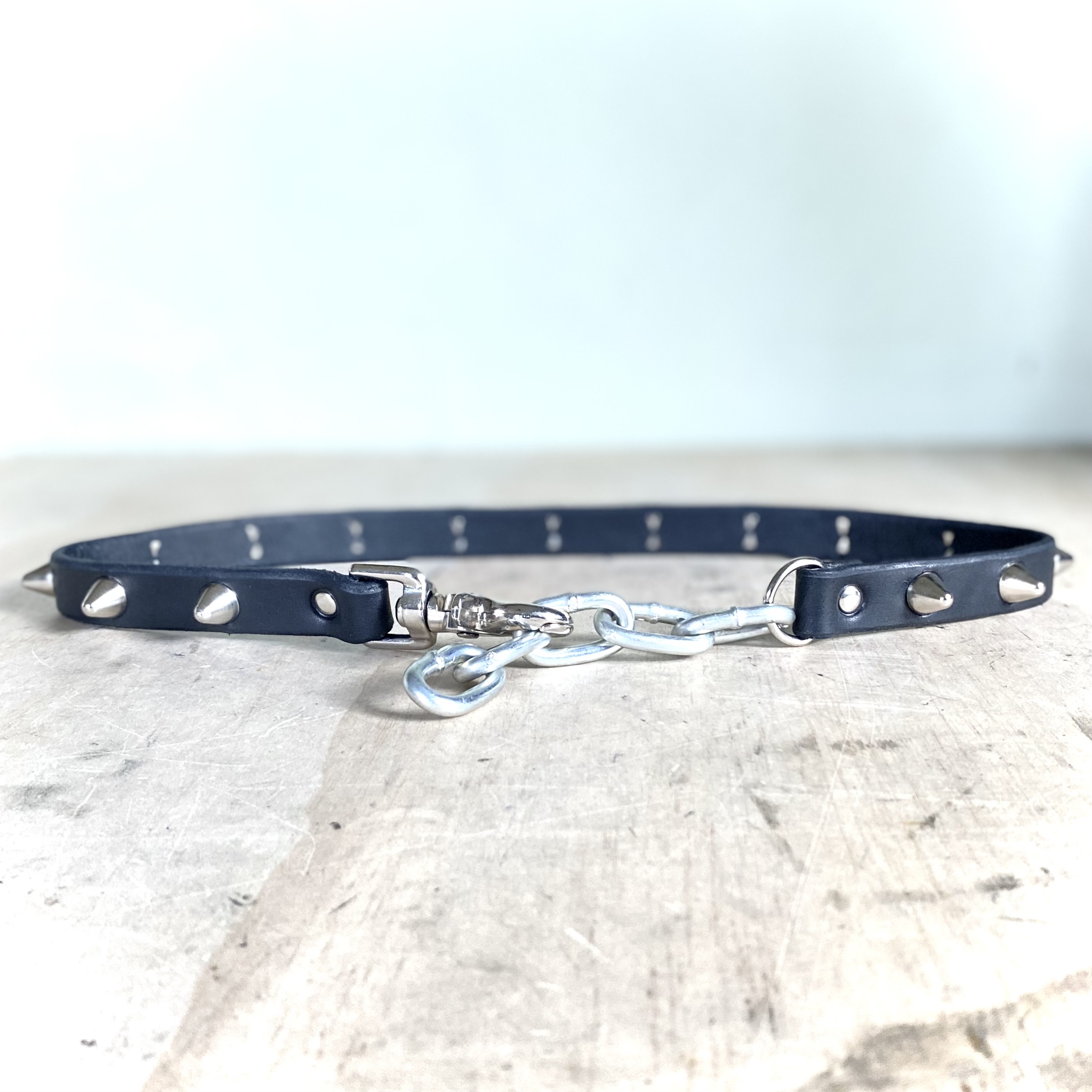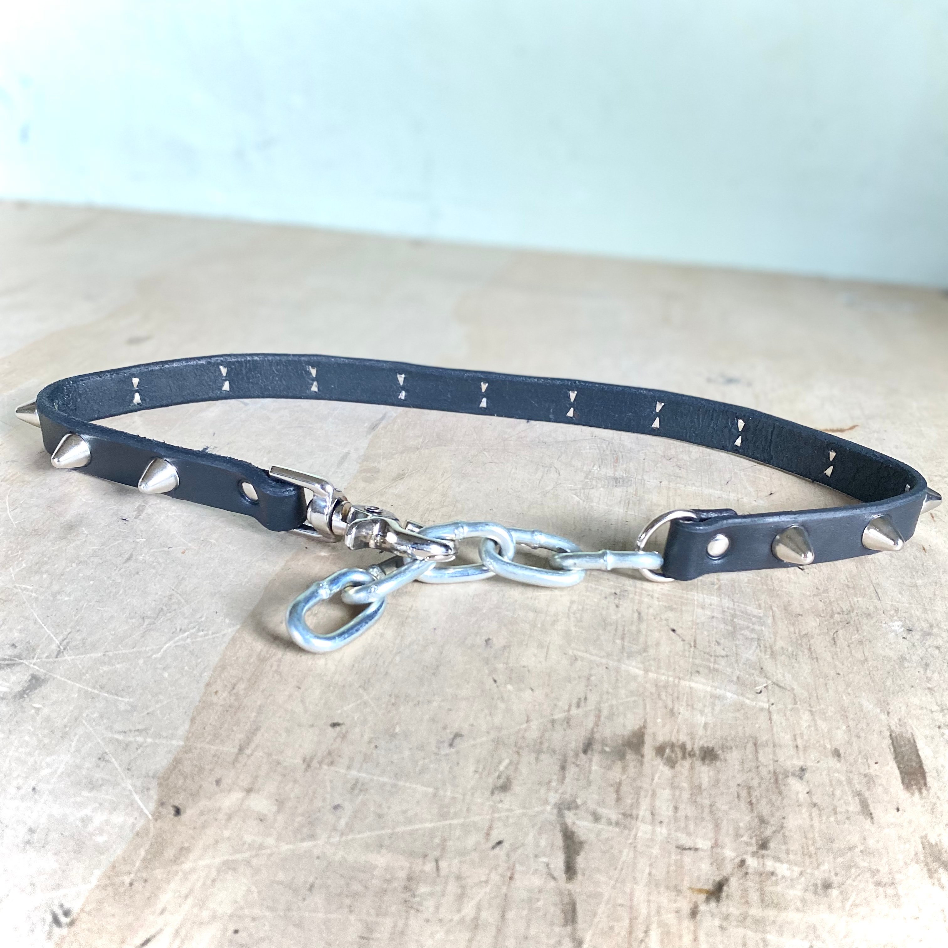 Narrow black leather with british cones and small nickel clasp connection to chain