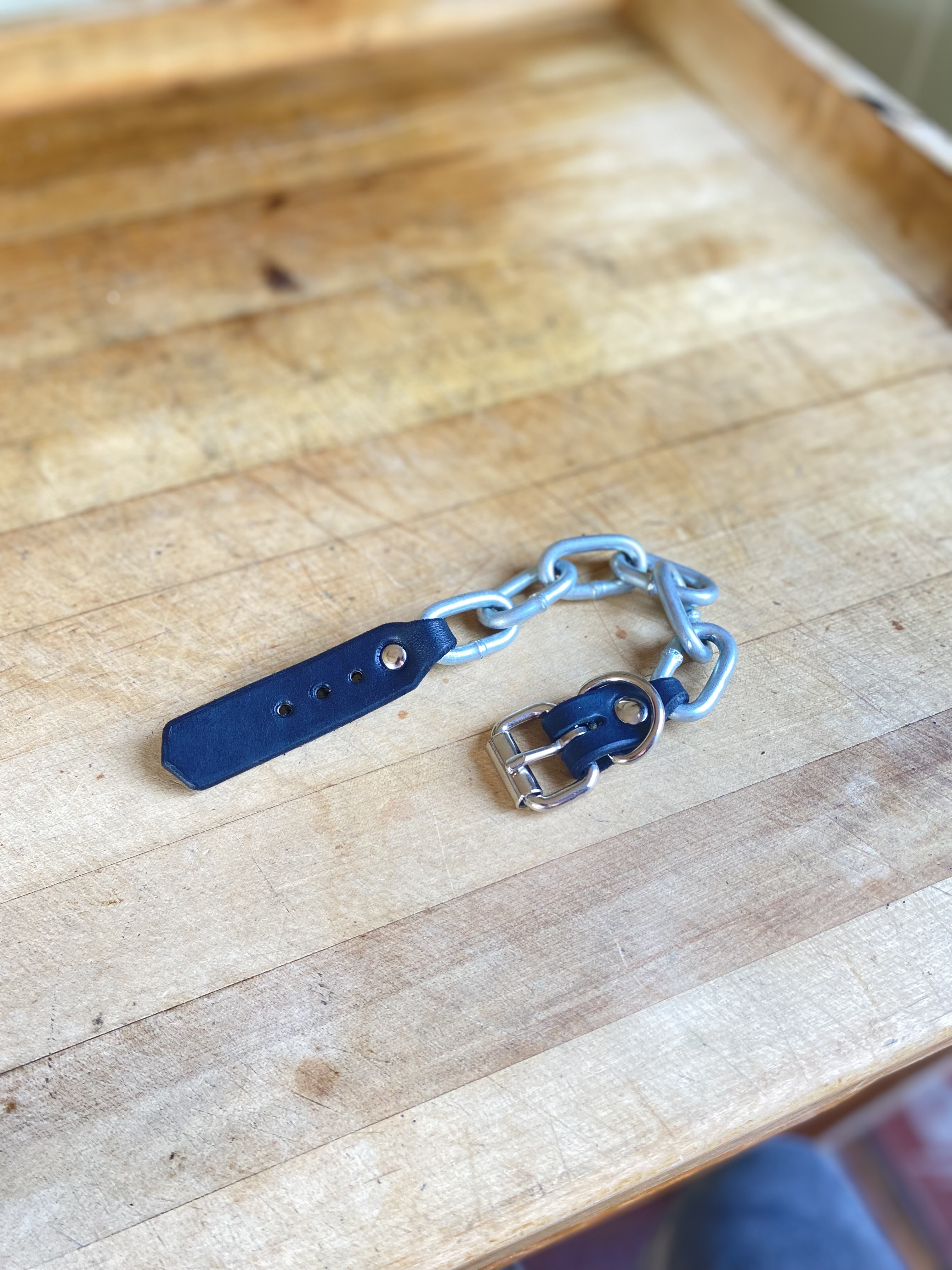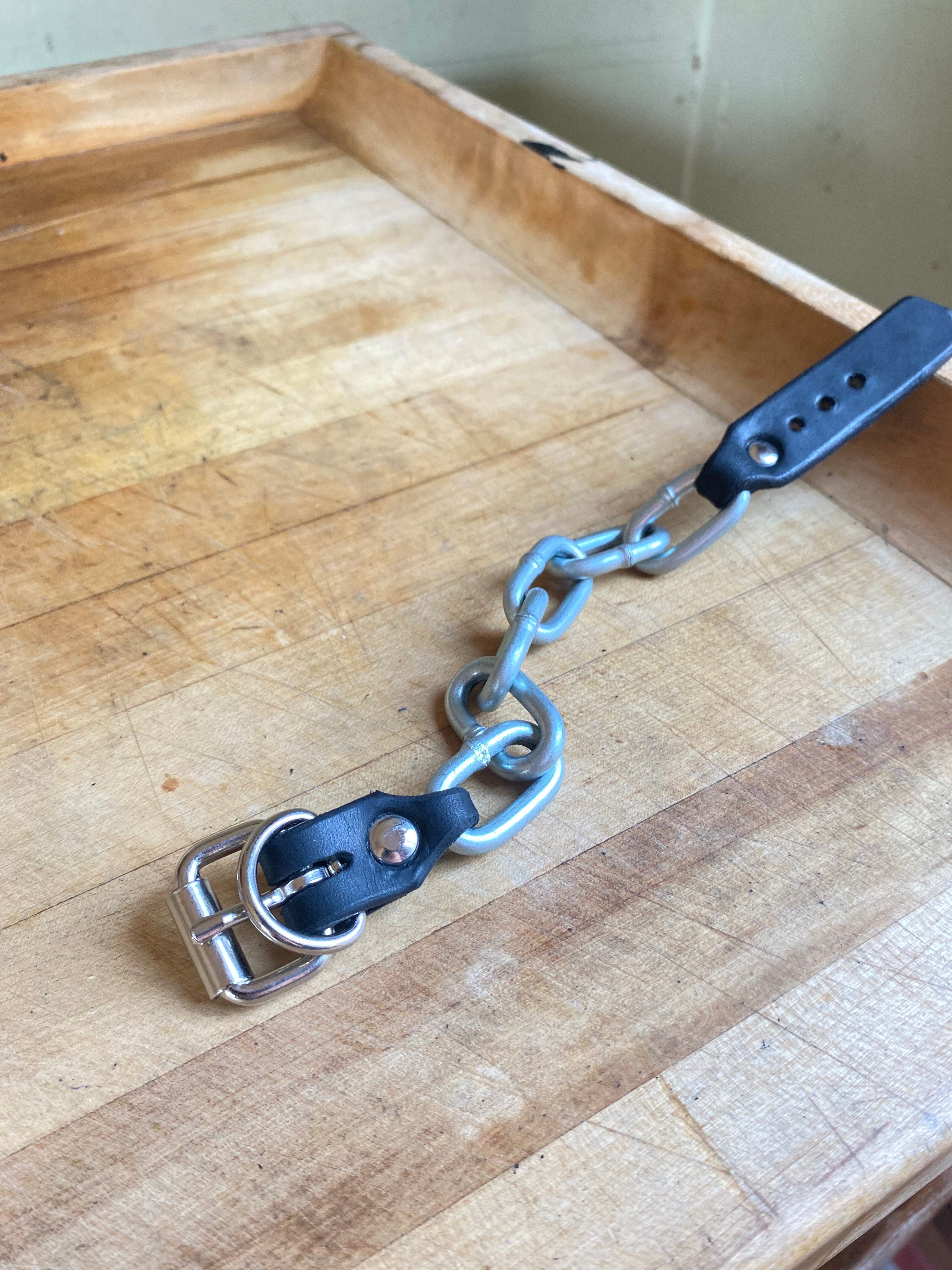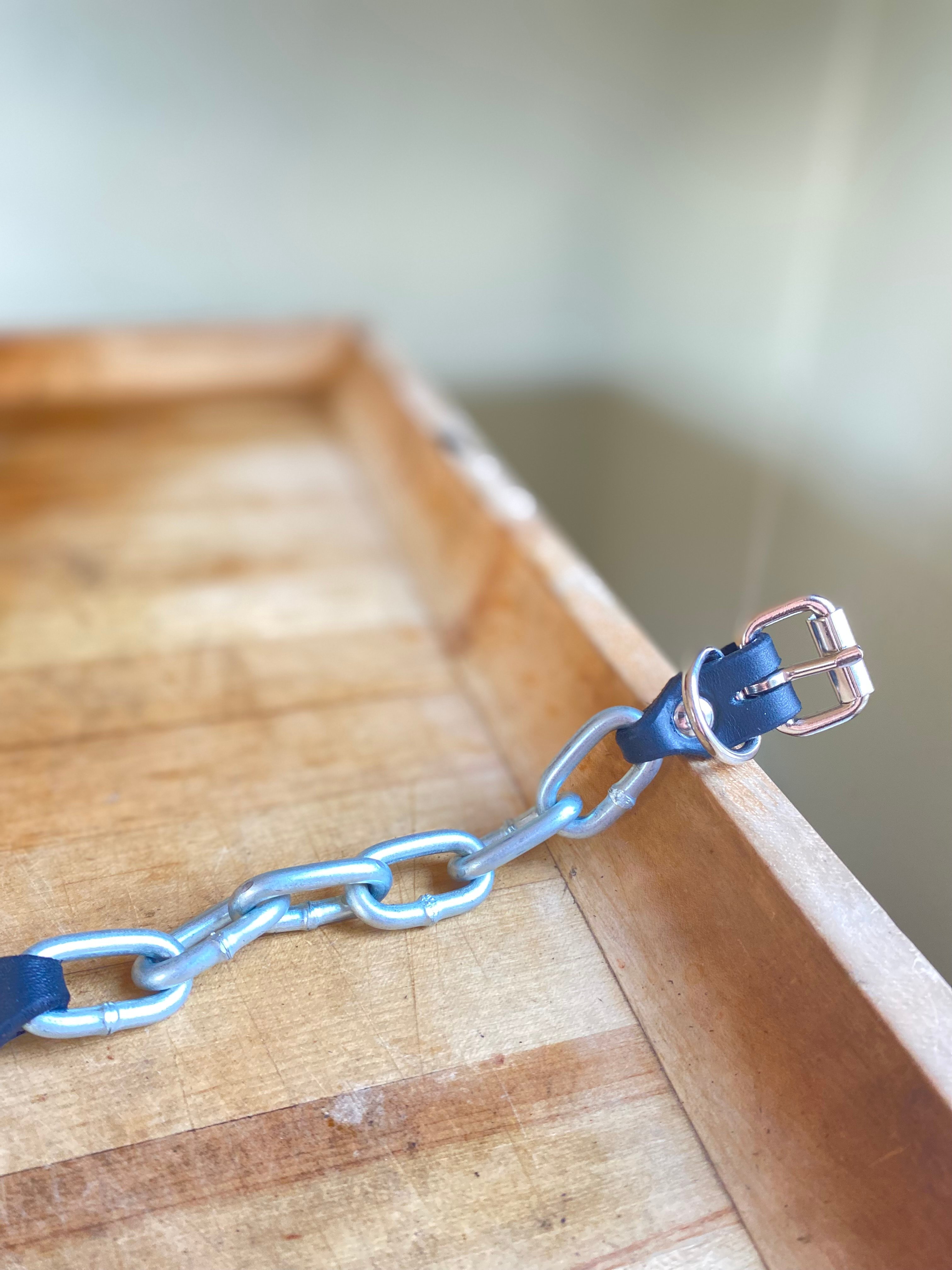 Heavy hardknock chain connected with riveted leather strap and nickel buckle with strap loop. Gear for the toughest street in town