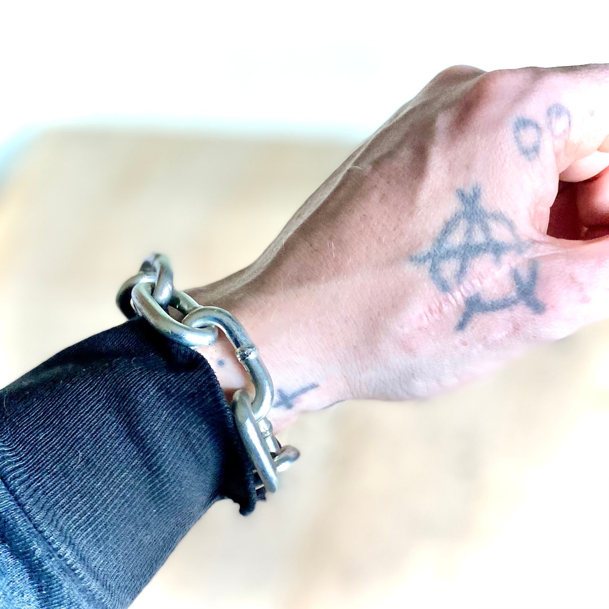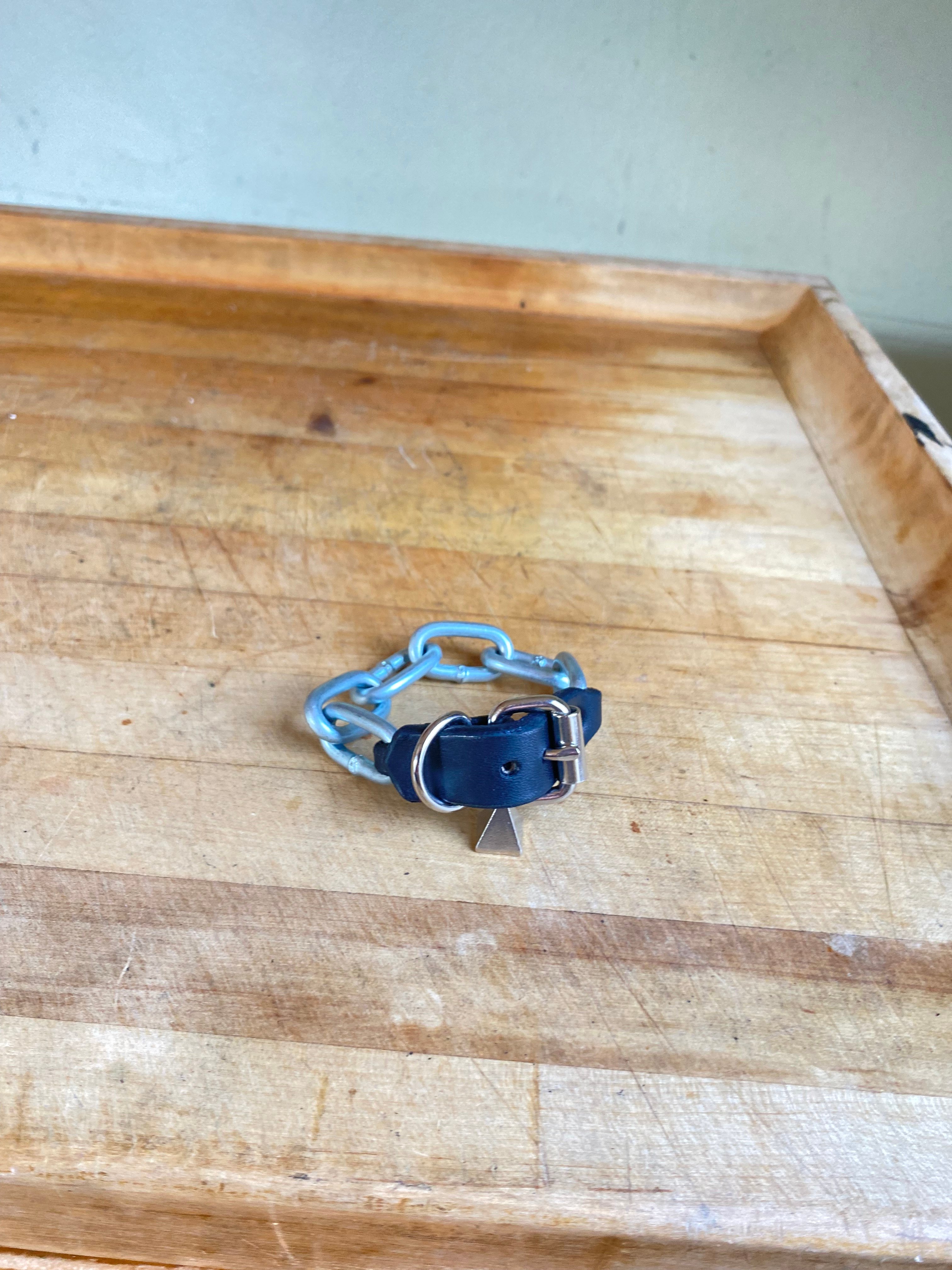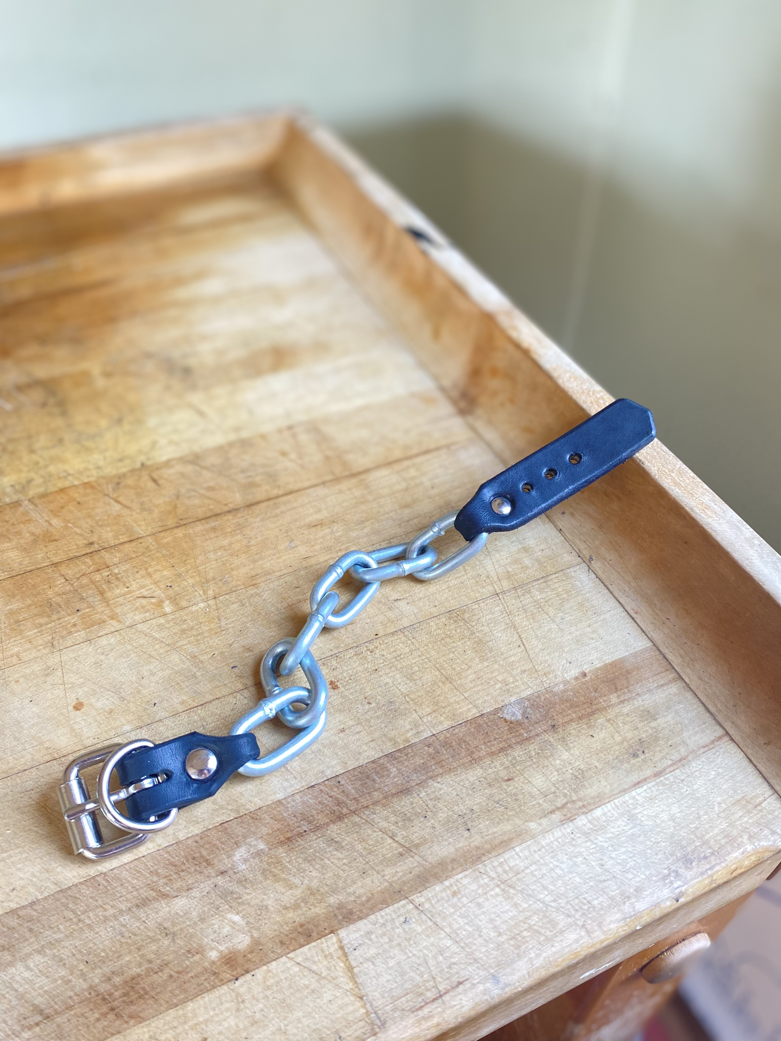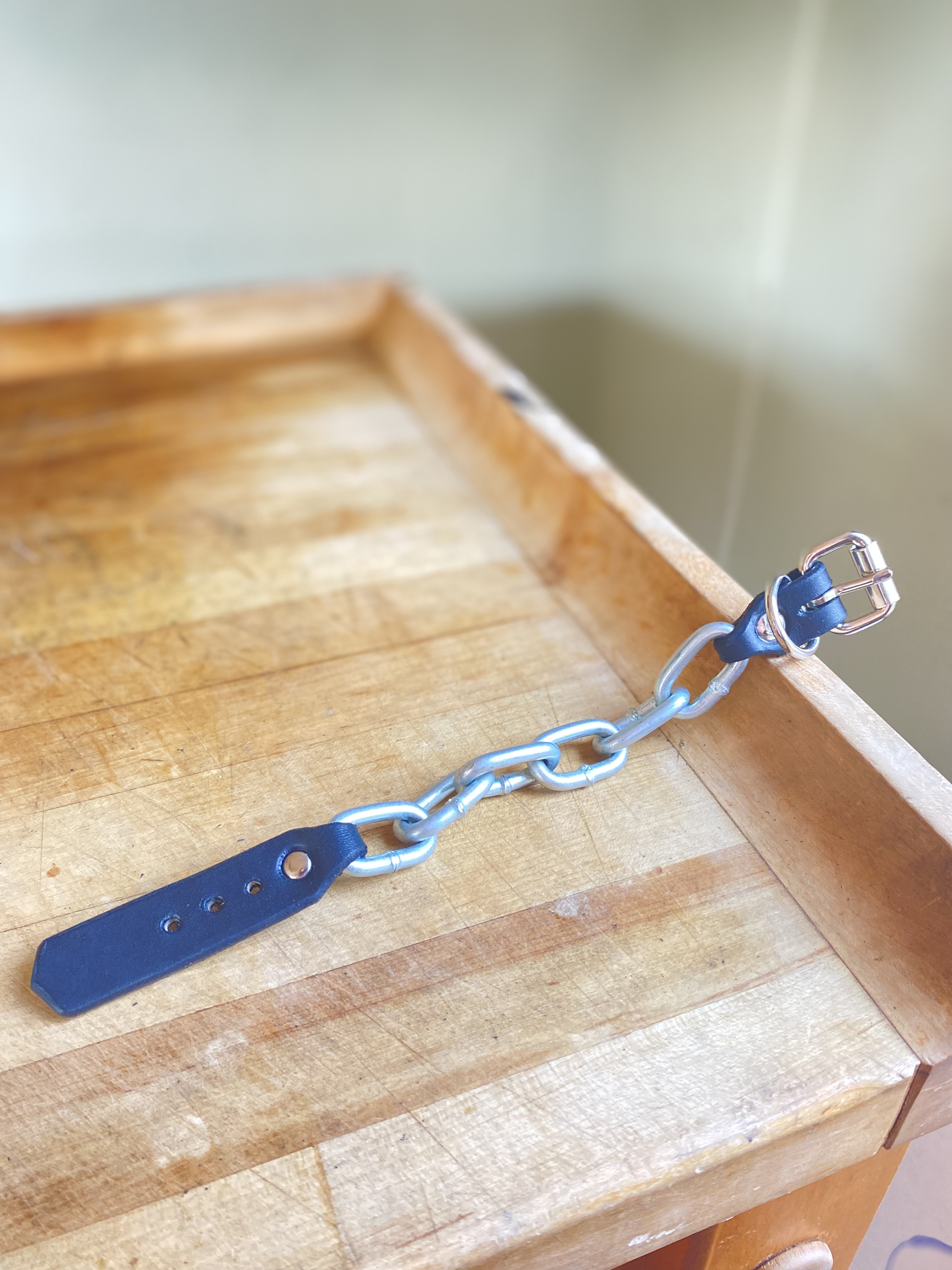 Heavy hardknock chain connected with riveted leather strap and nickel buckle with strap loop. Gear for the toughest street in town