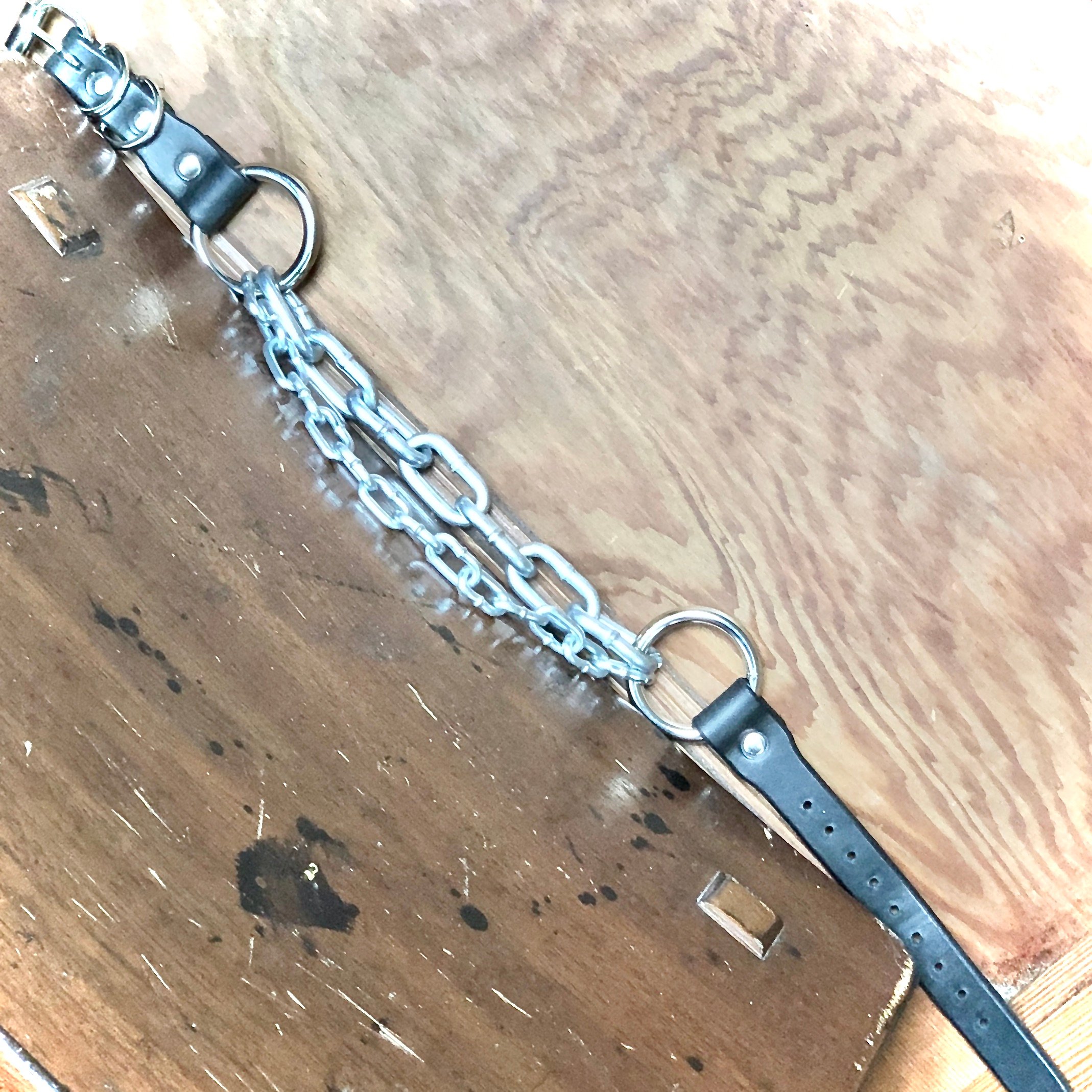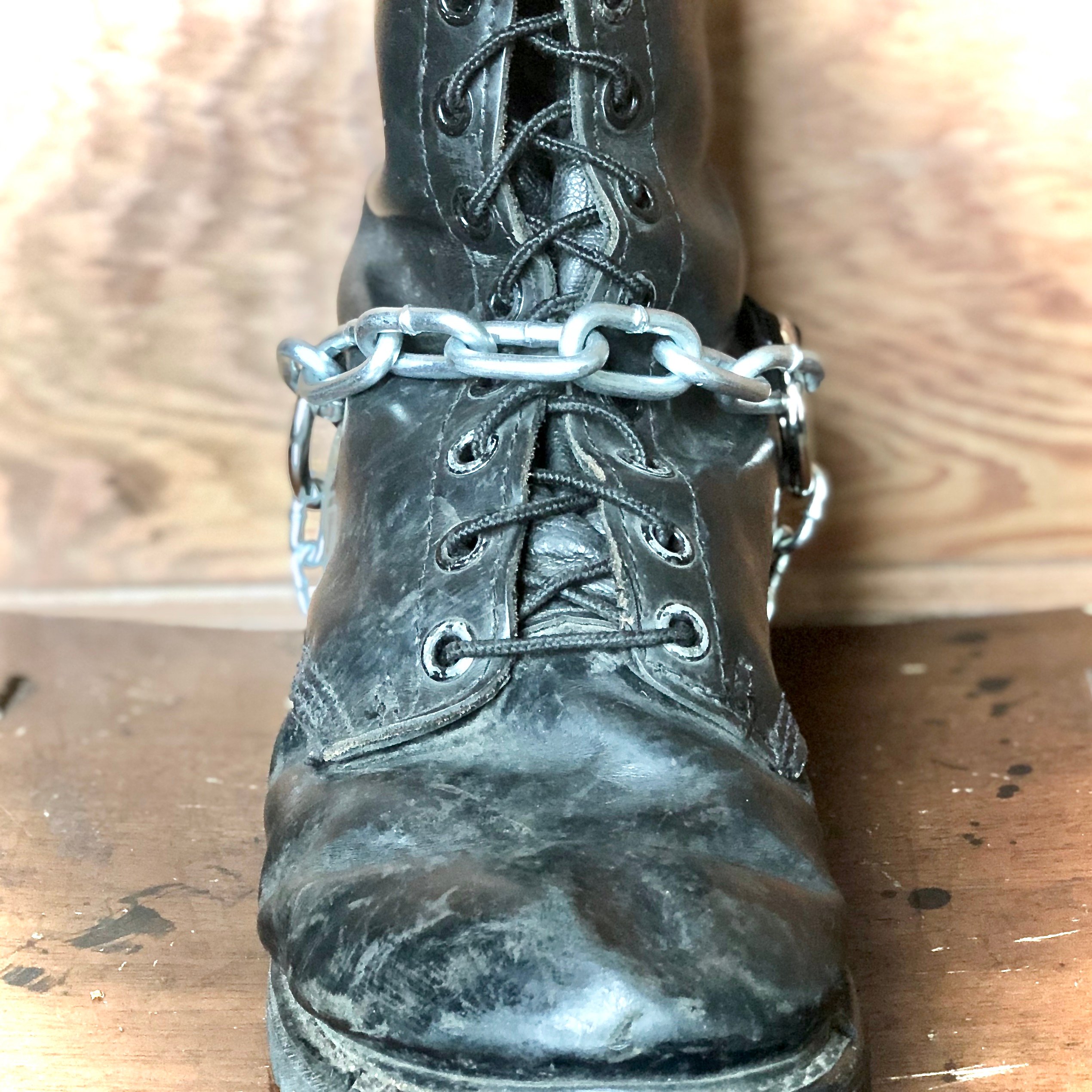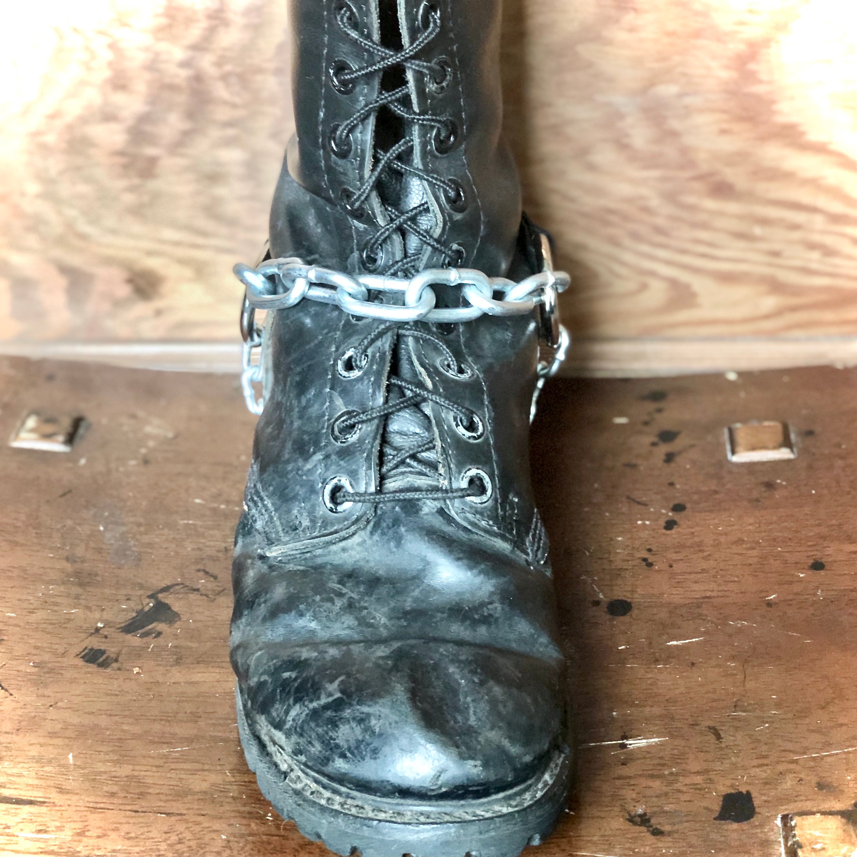 A chain bootstrap made w/ Black genuine leather with nickel hardware and large chain strand; sized to fit you,