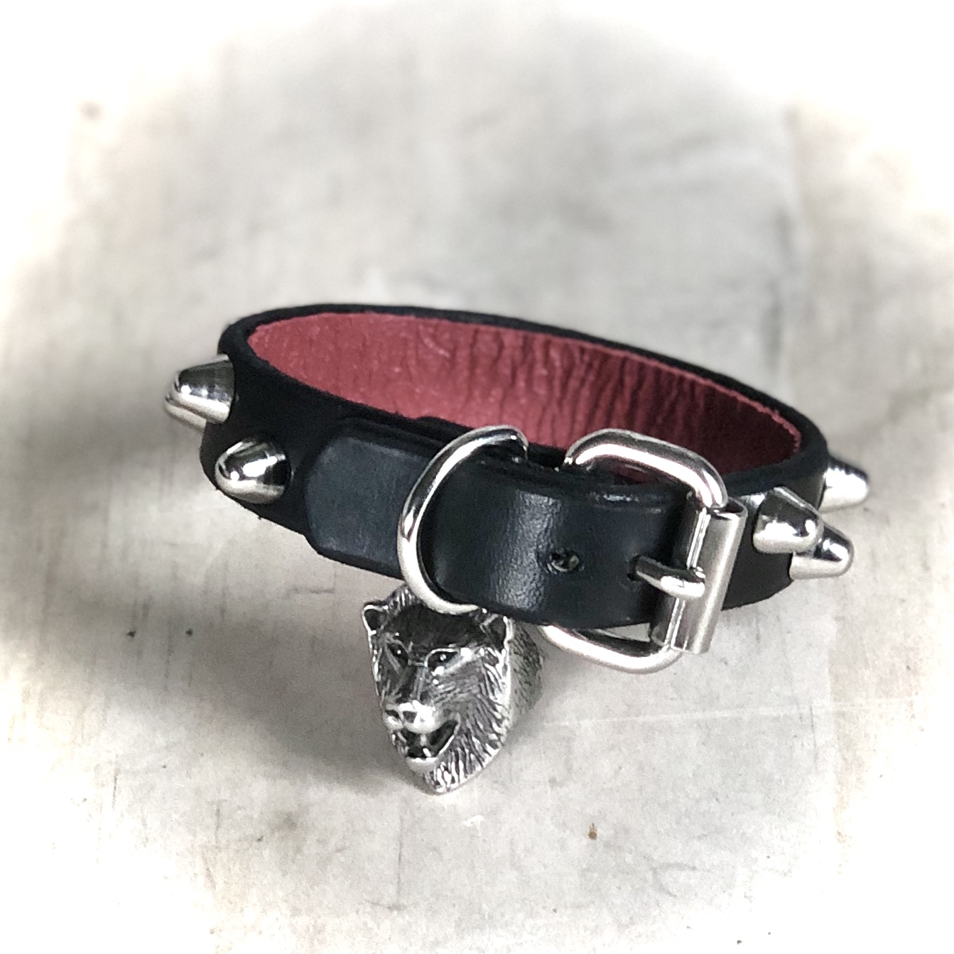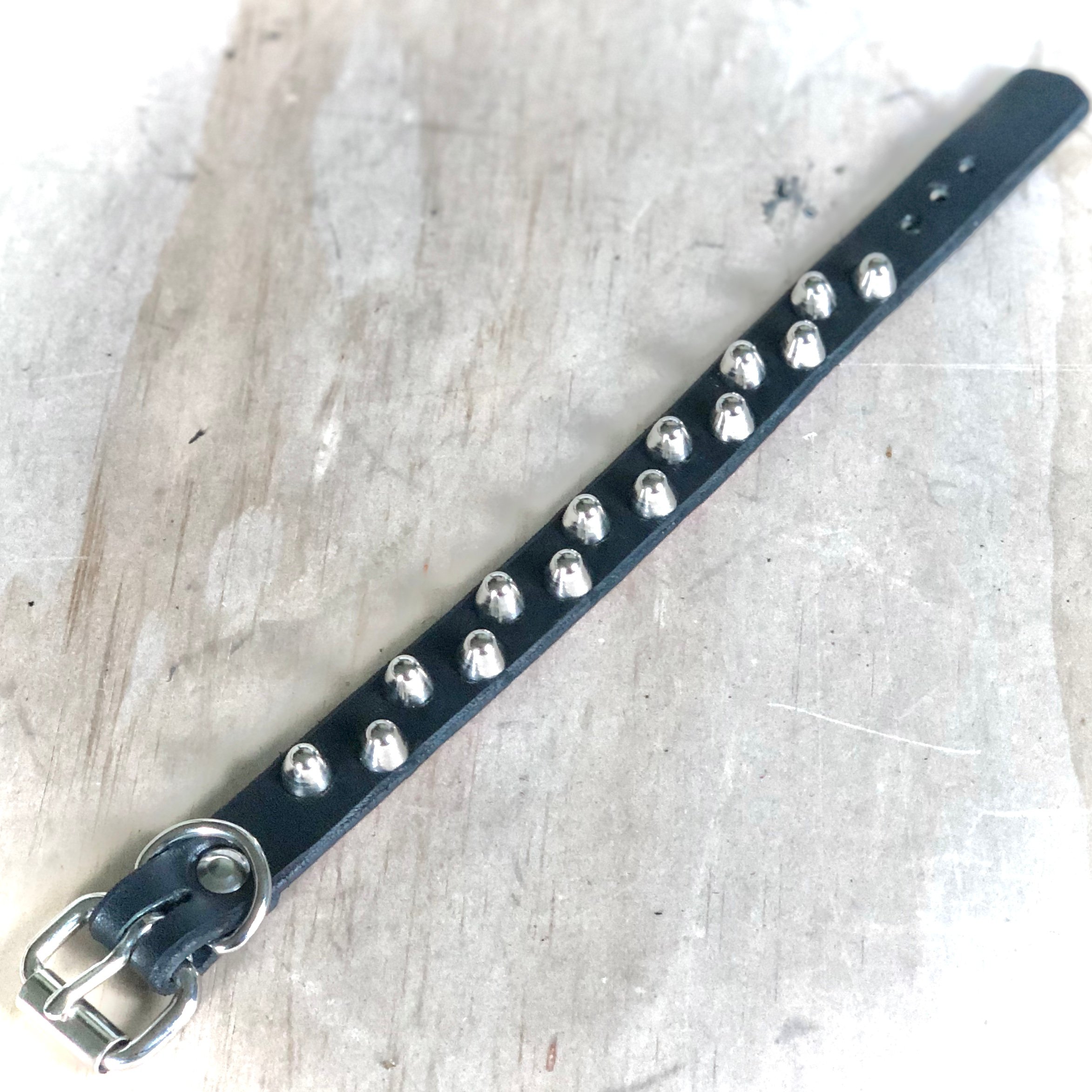 Short british studs staggered on black leather with nickel hardware. Made to order and sized to fit you.