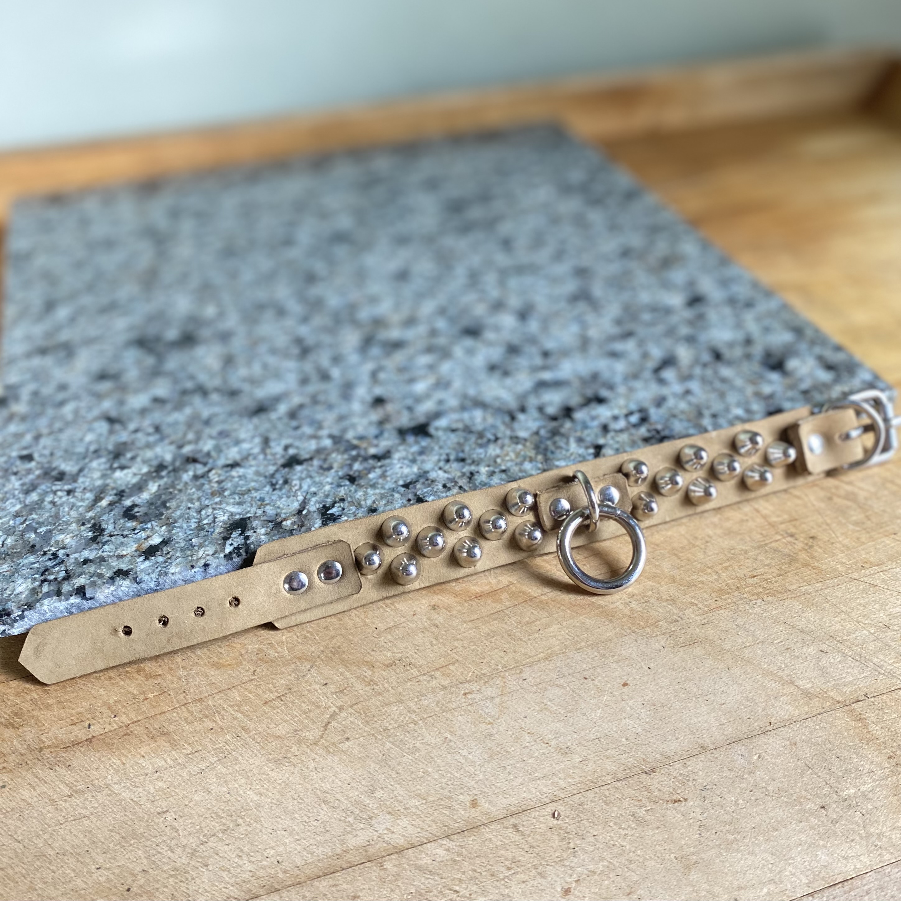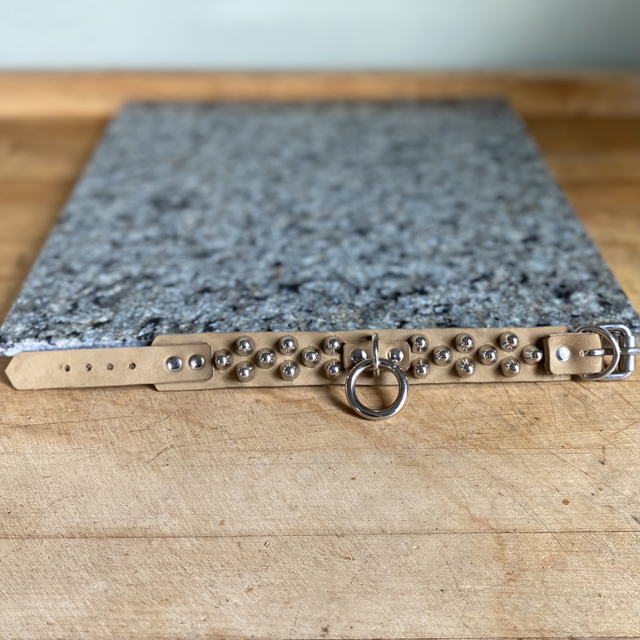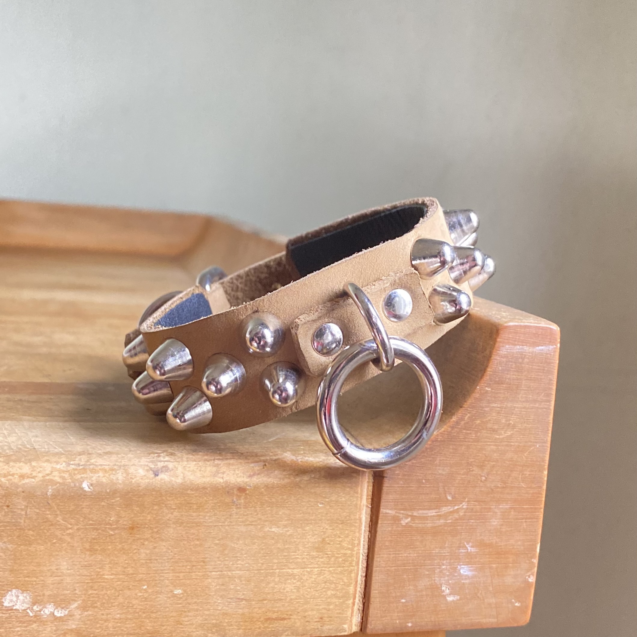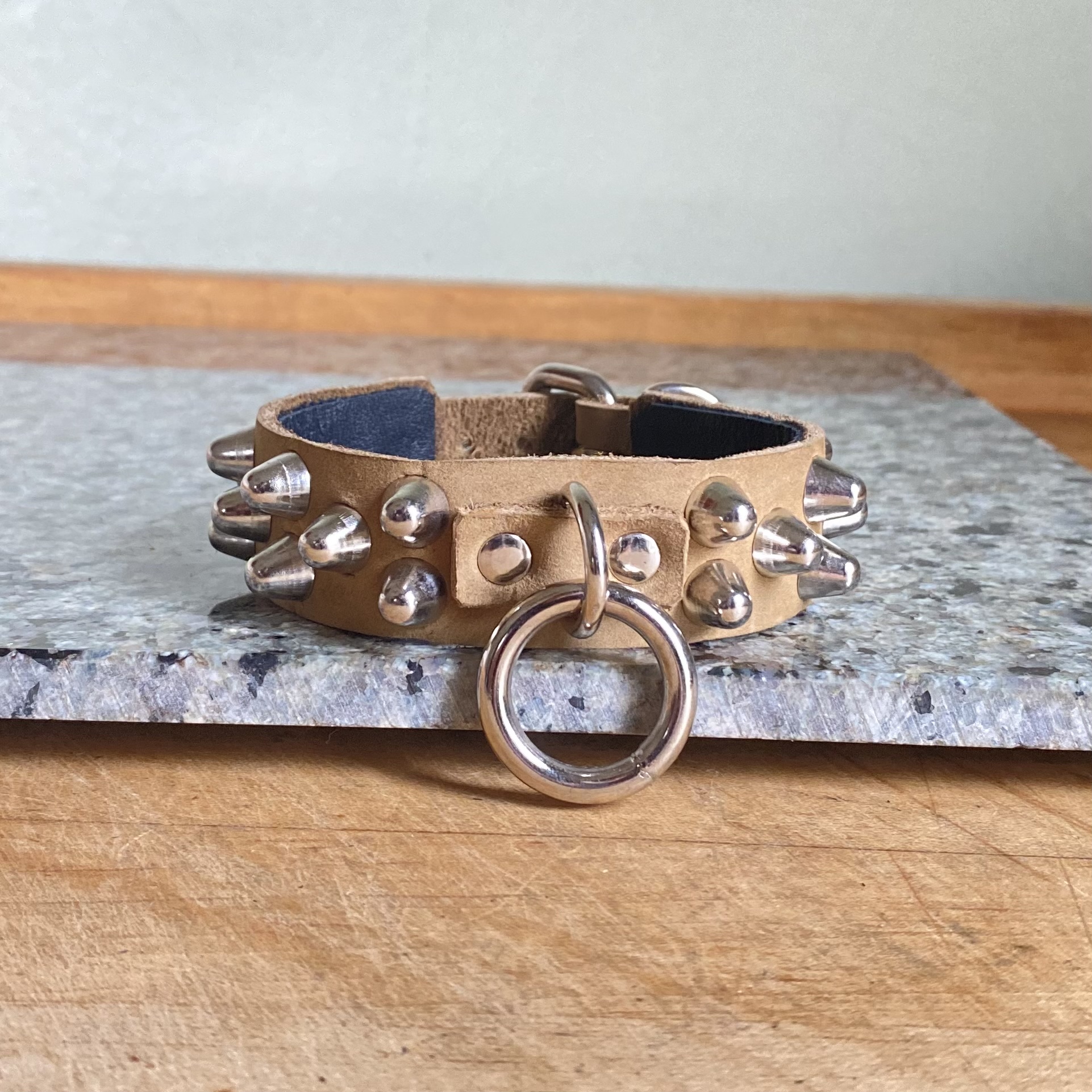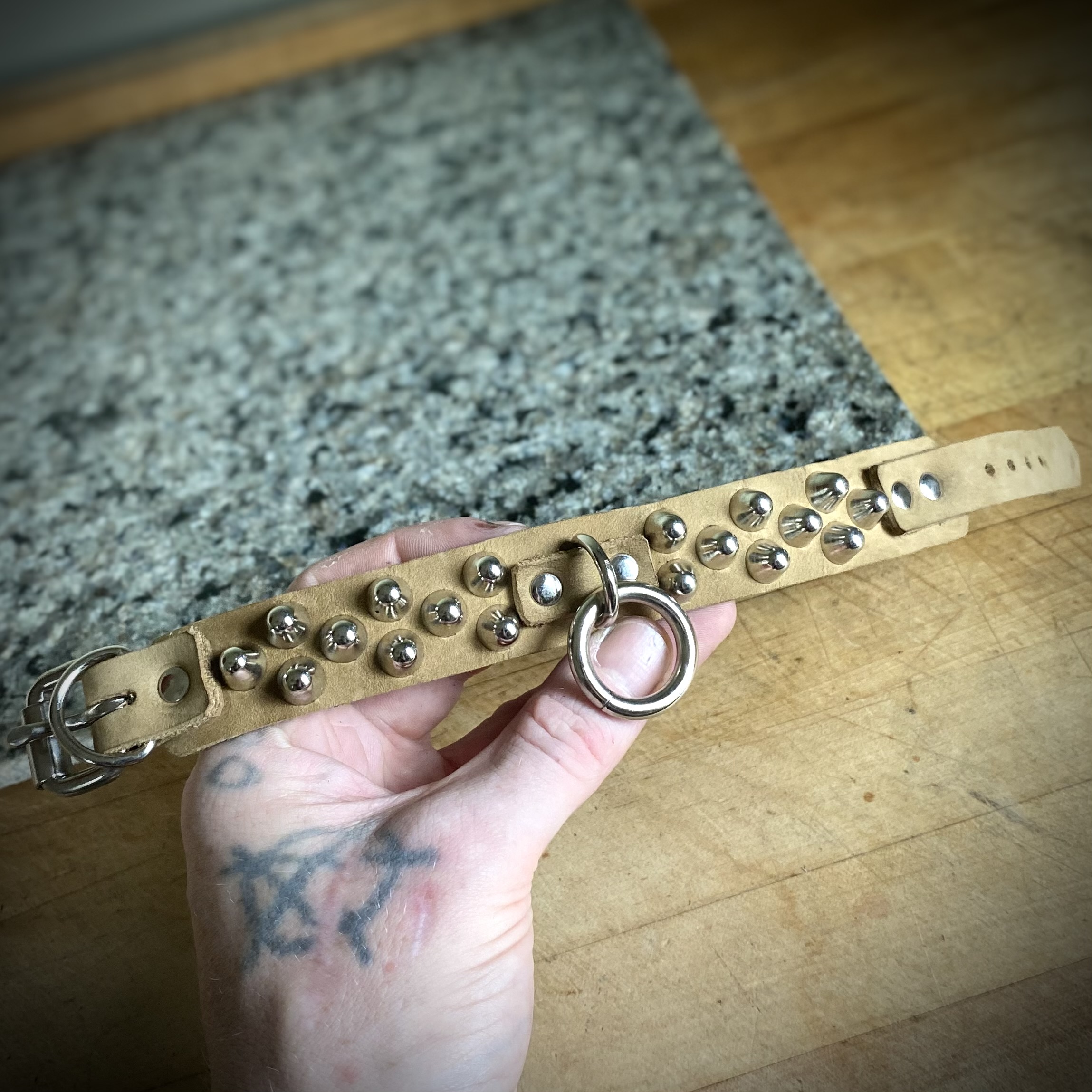 Beautiful tan color leather w/ 3/4” O-ring, short british studs & nickel hardware on segmented leather setup.