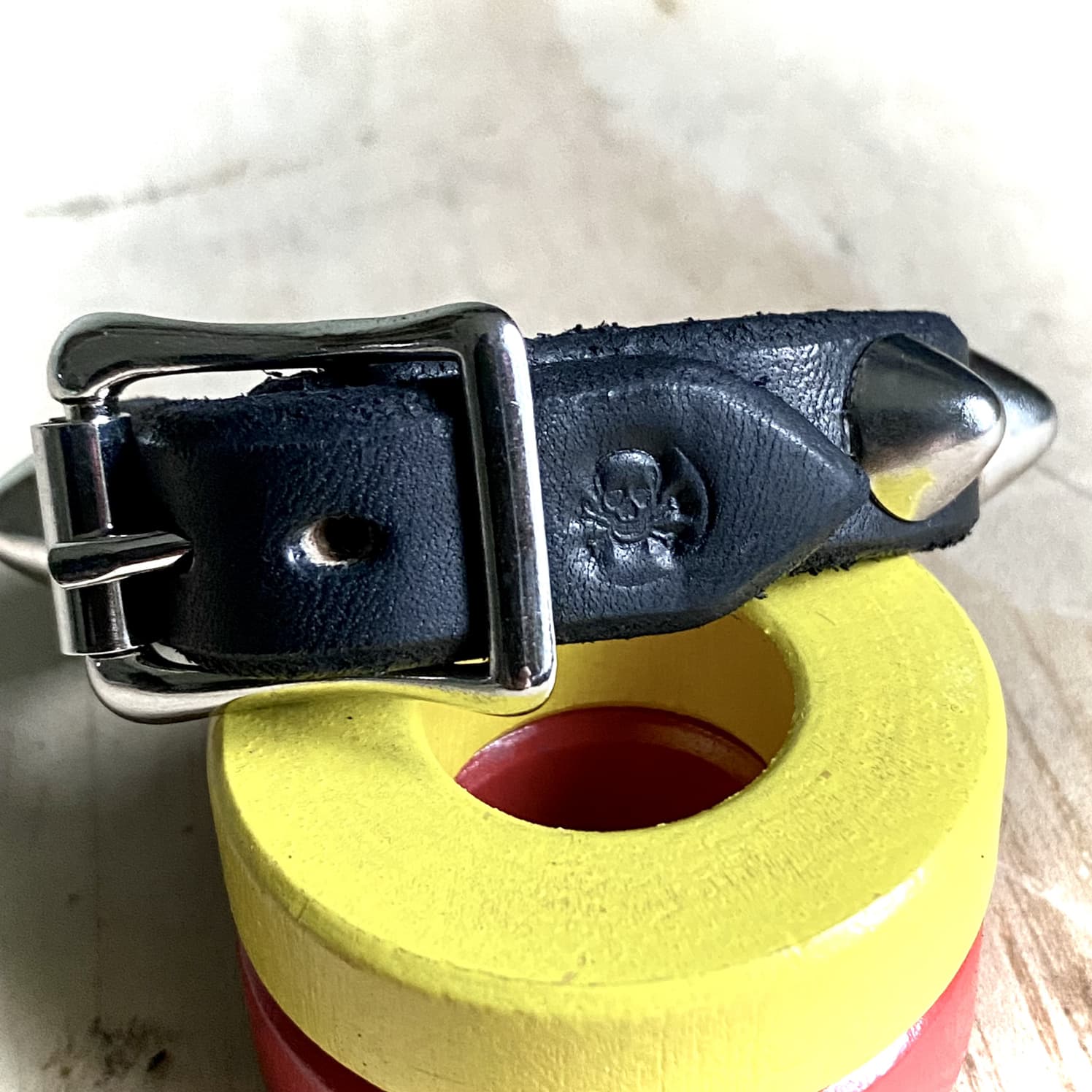 Standard british studs on genuine black bridle leather, stamped with a skull and crossbones and finished with nickel hardware.