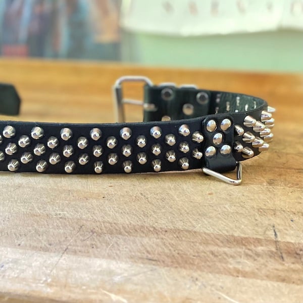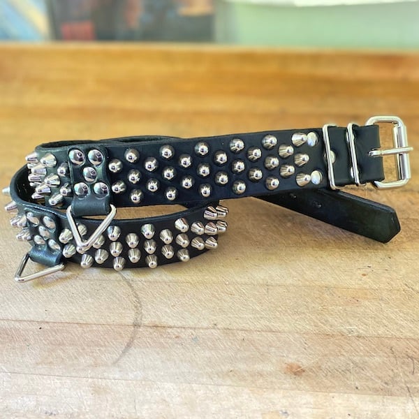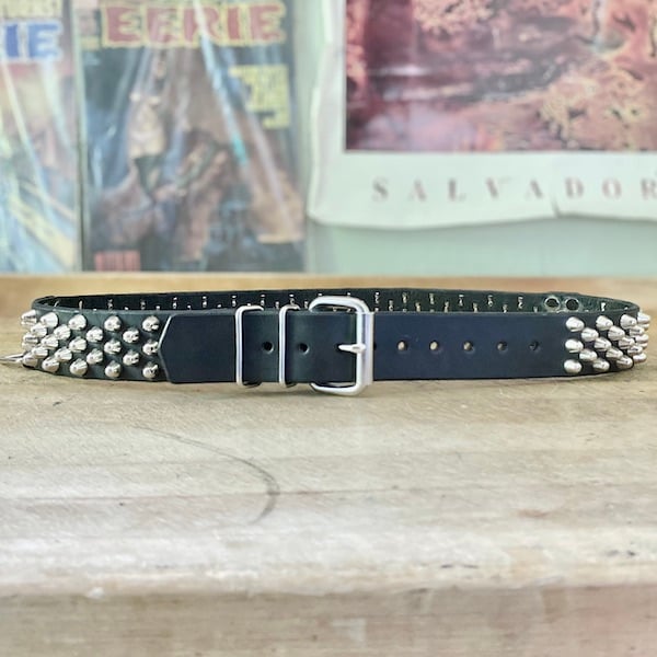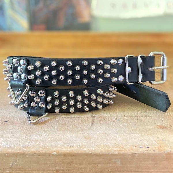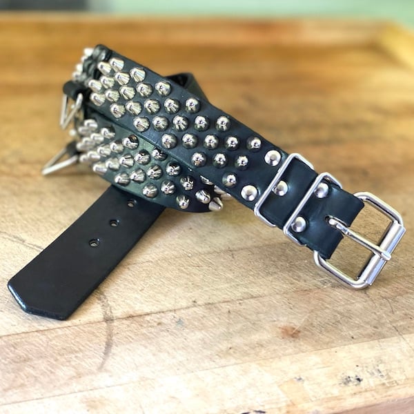 Hardware includes 2-triangle keyrings, 2 strap-keepers, 1.75” nickel roller buckle & 3-2-3 offset studding short british cones.