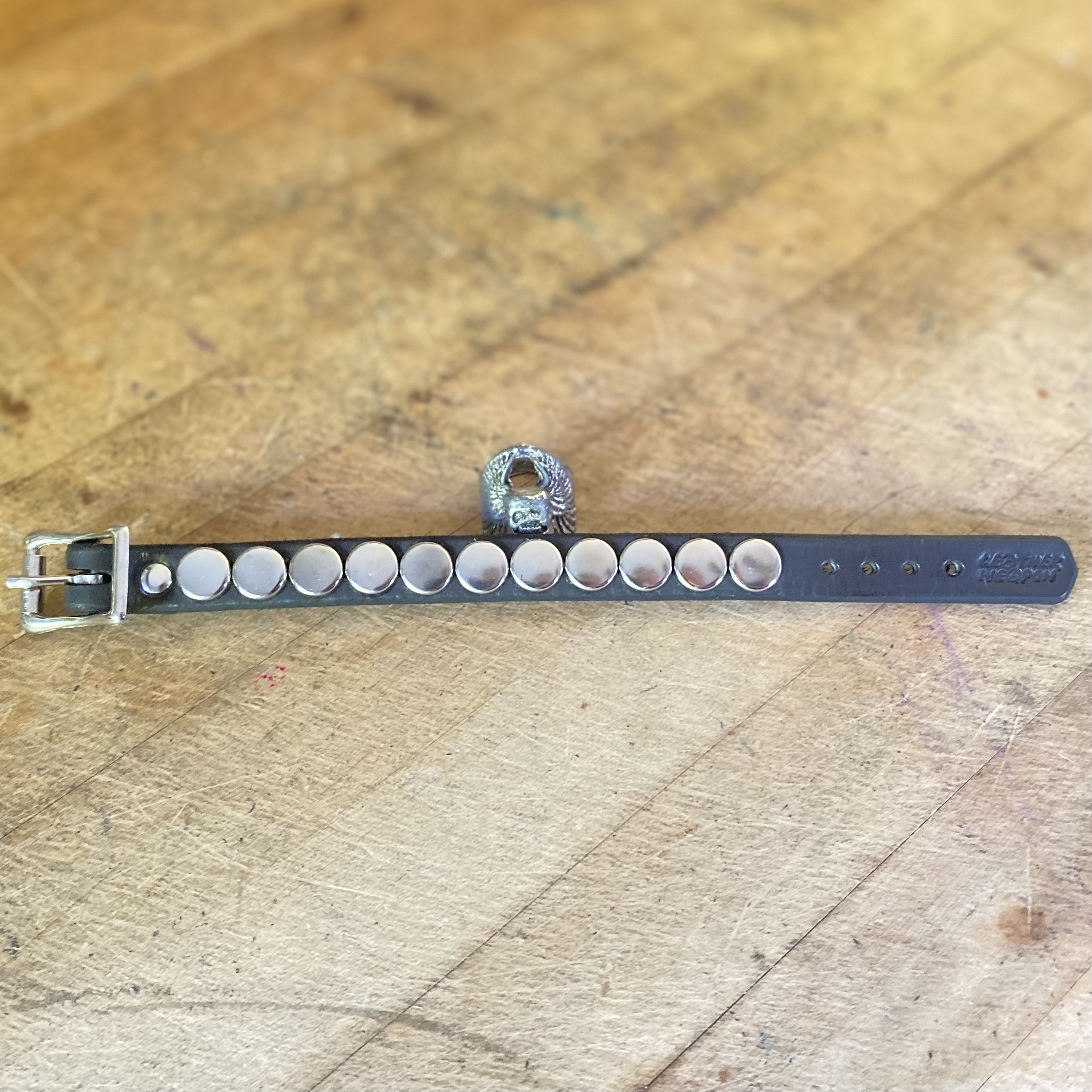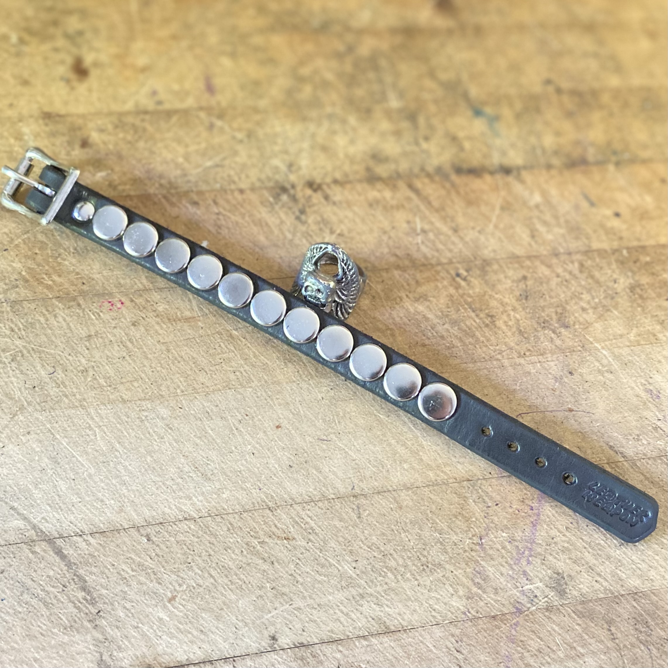 Flat circle studs on black leather with self-keeping buckle and protective inner-layer of thin leather over stud prongs to protect wrist.