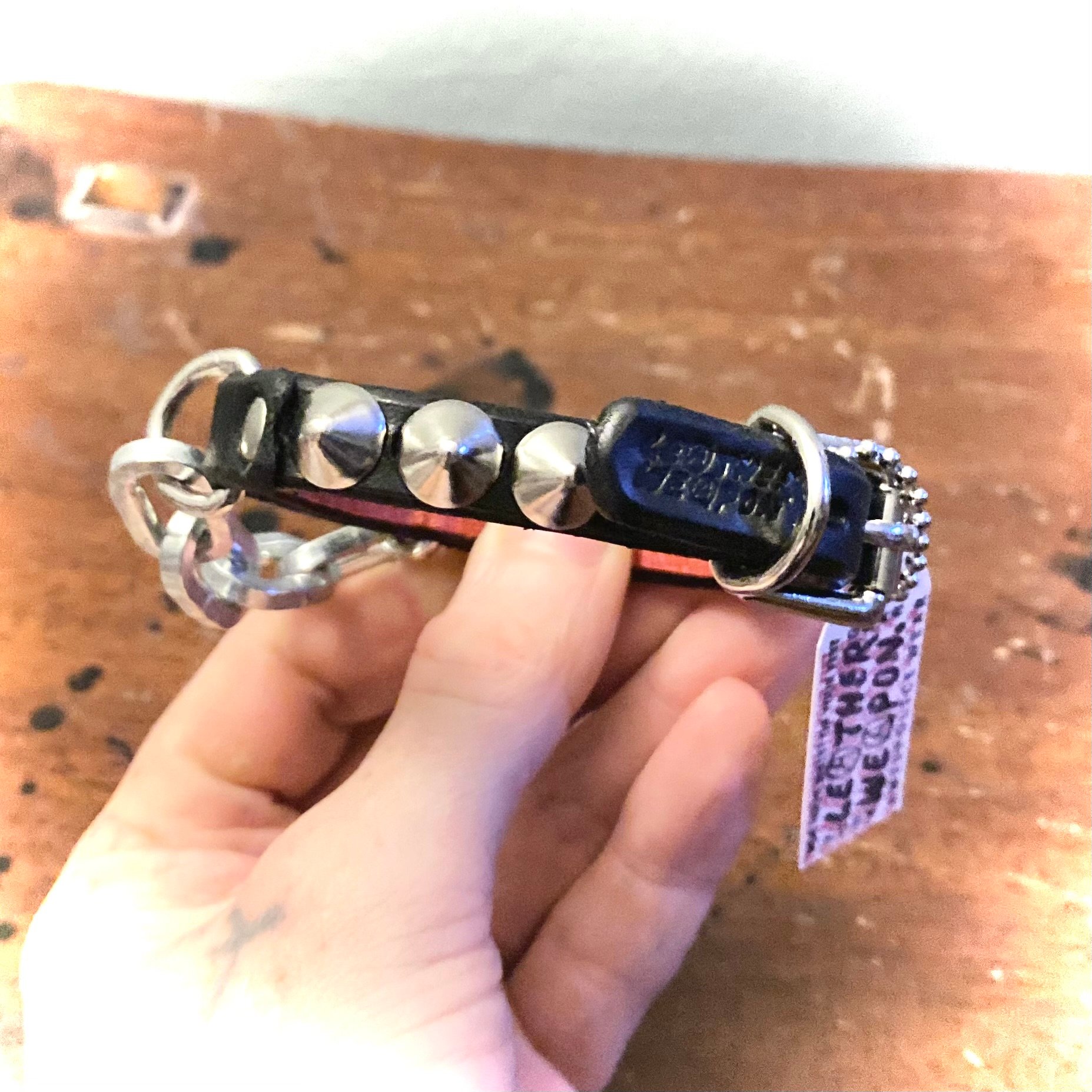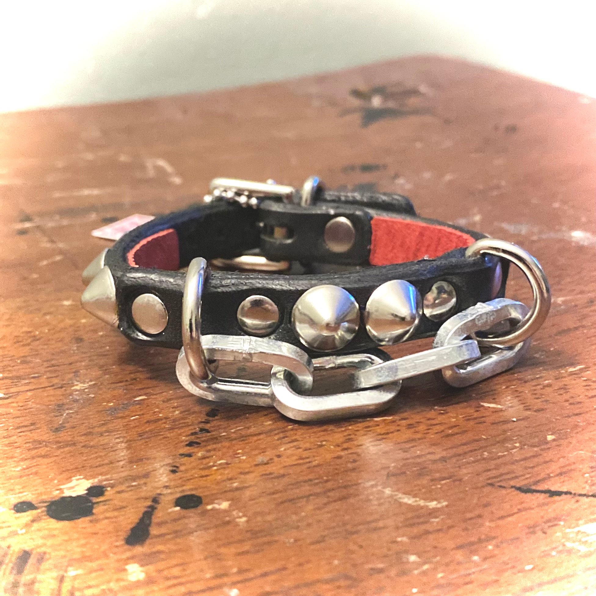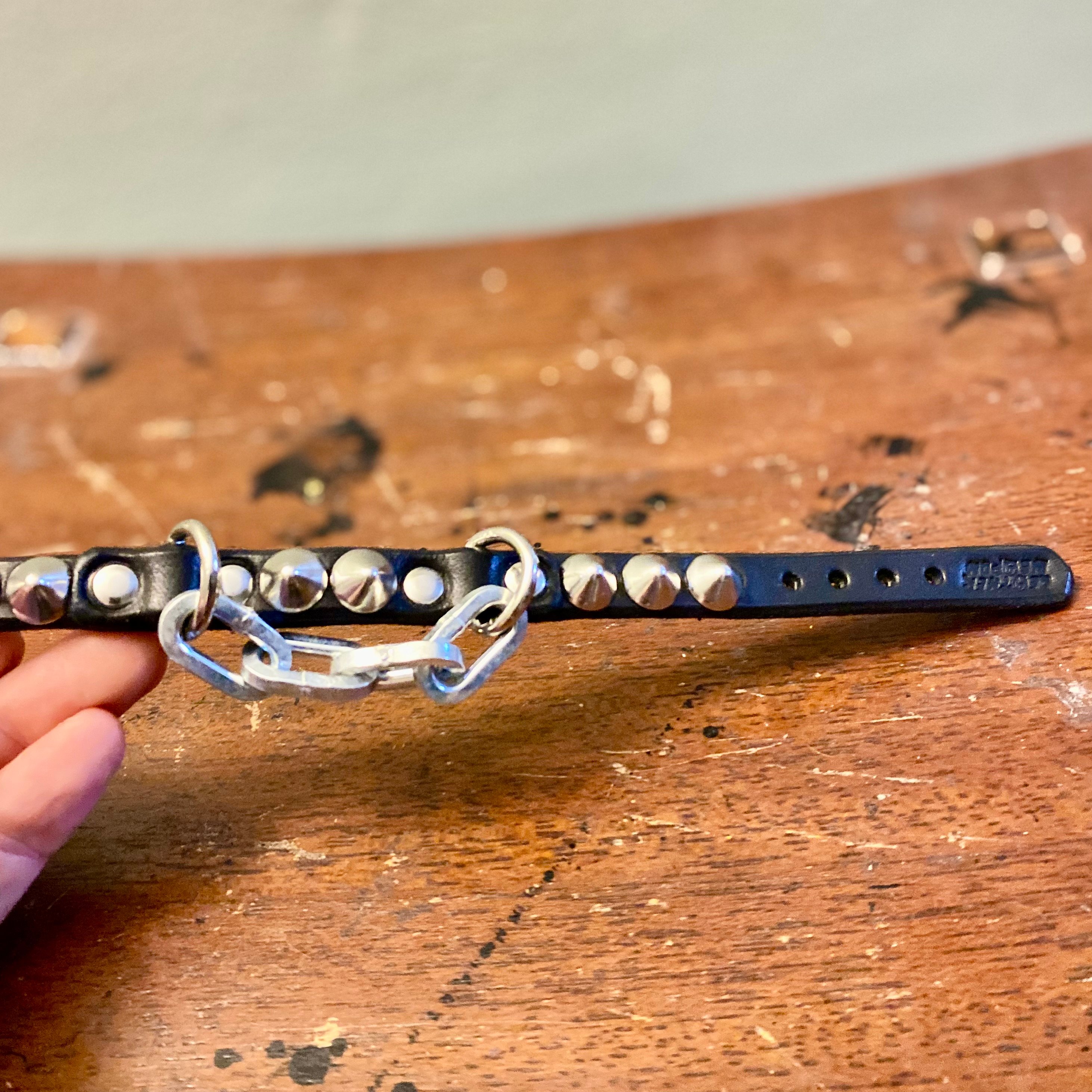 Hard-chain bit on 1/2” black leather strap with studs and 1/2” nickel buckle & D-Ring.