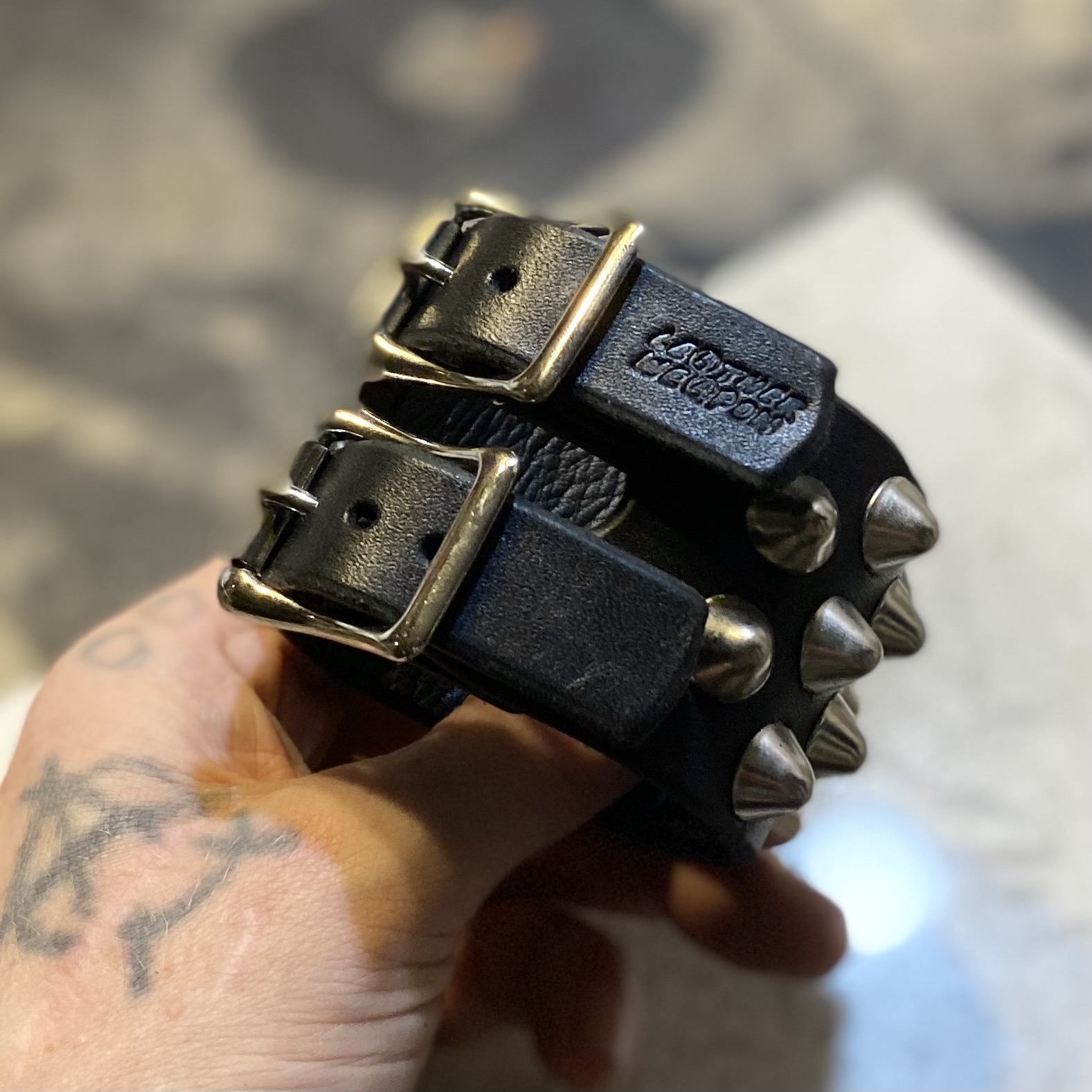 3-2-3 standard British studs on twinstrap 2” black leather & finished with self keeper buckles.