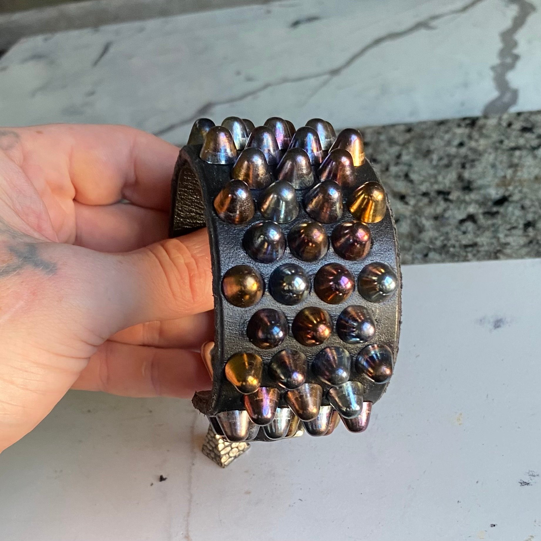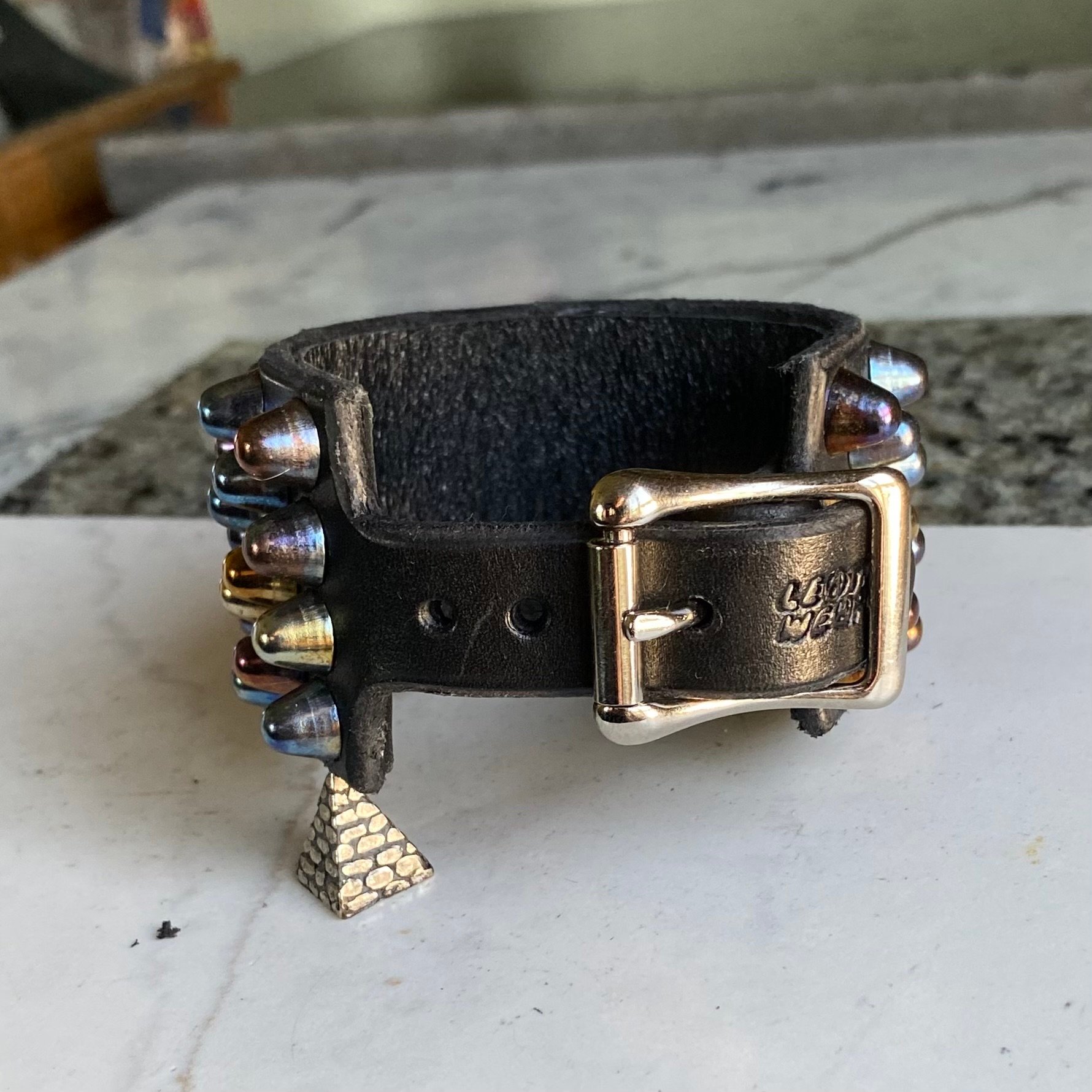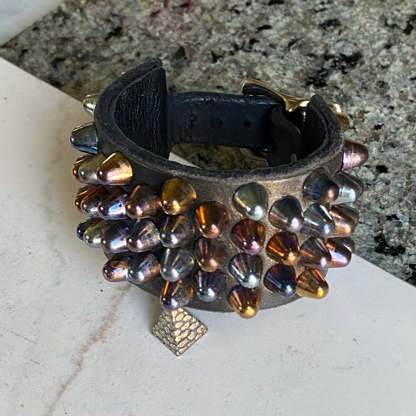 4-3-4 rainbow’d short british studs set on black leather with all nickel hardware and protective leather backing layer for your wrist.