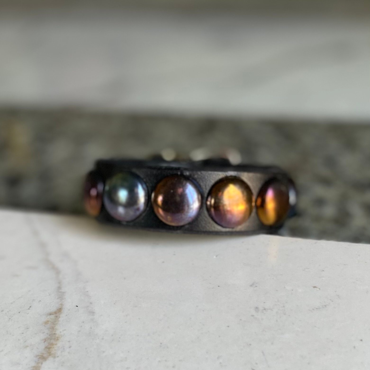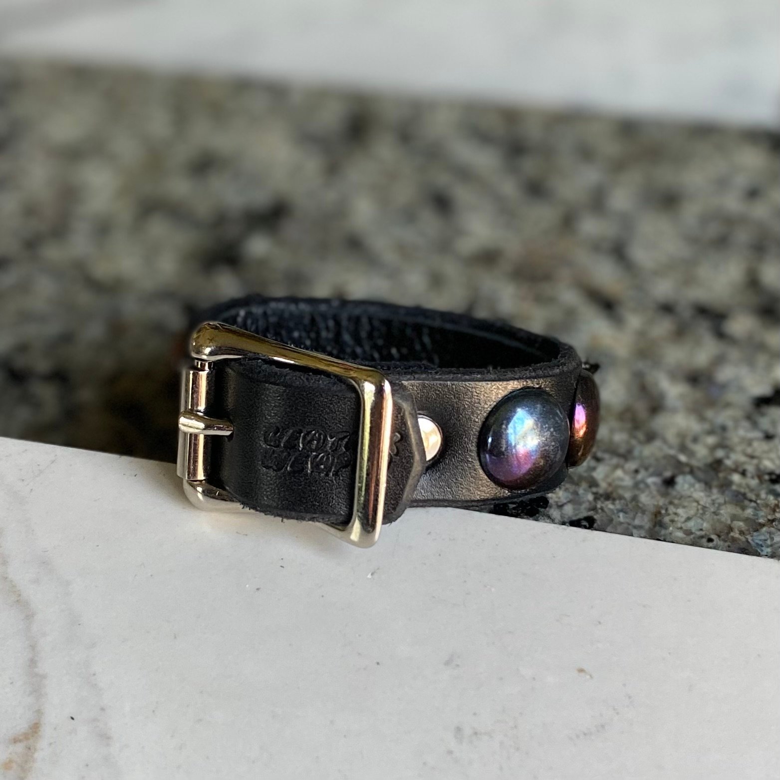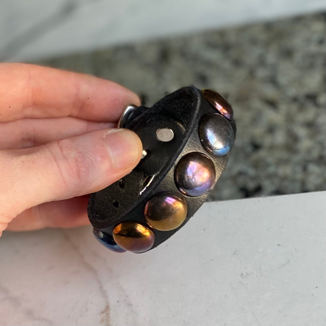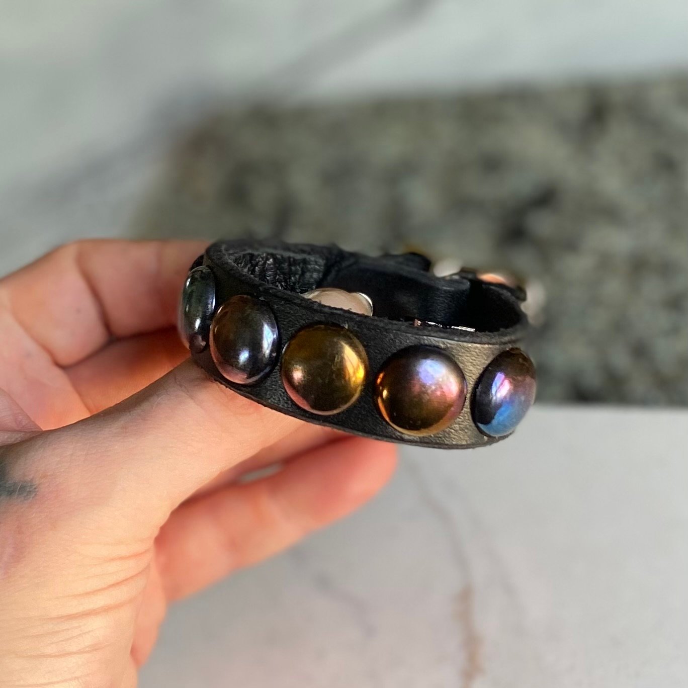 Rainbow large dome studs on 3/4” wide black leather with roller buckle.