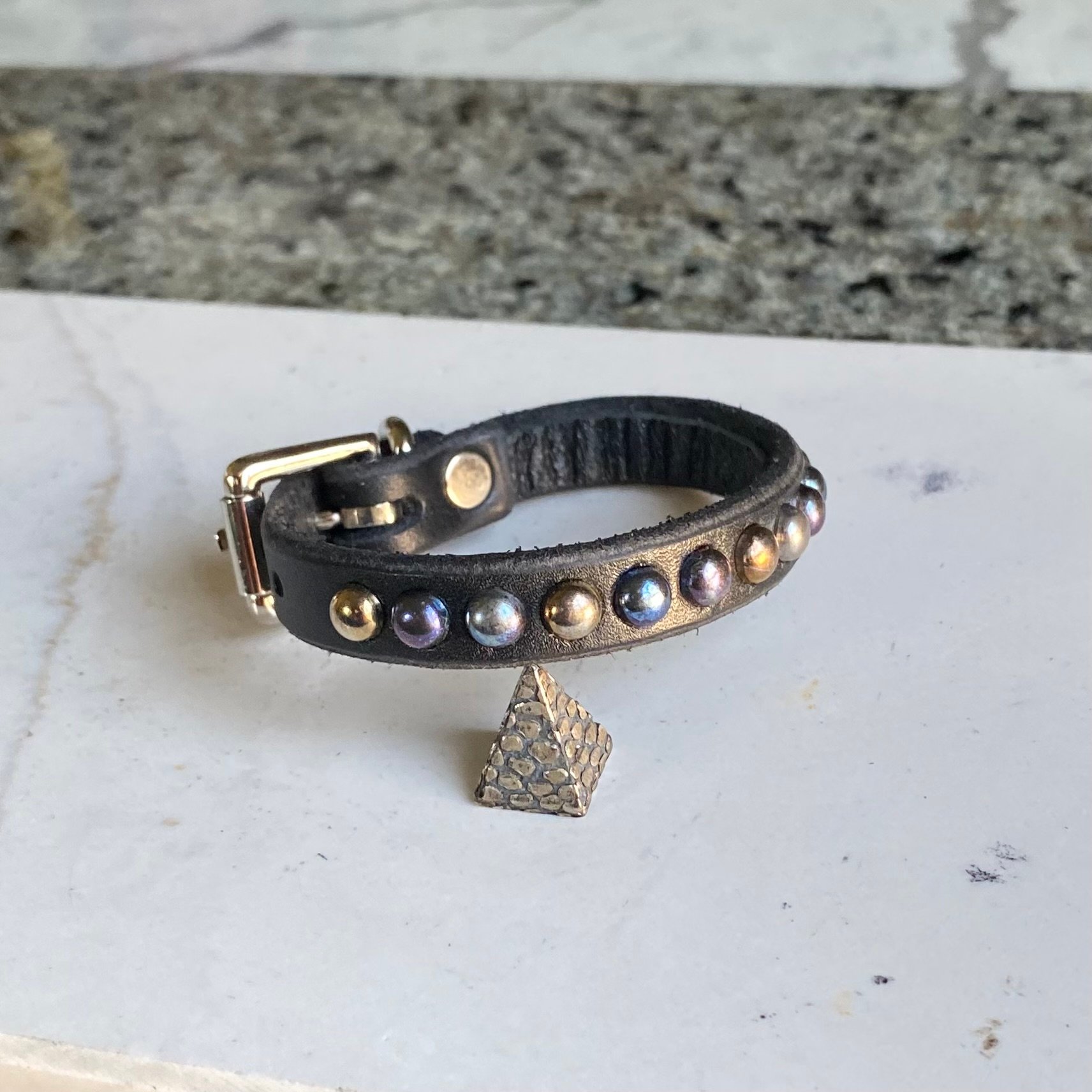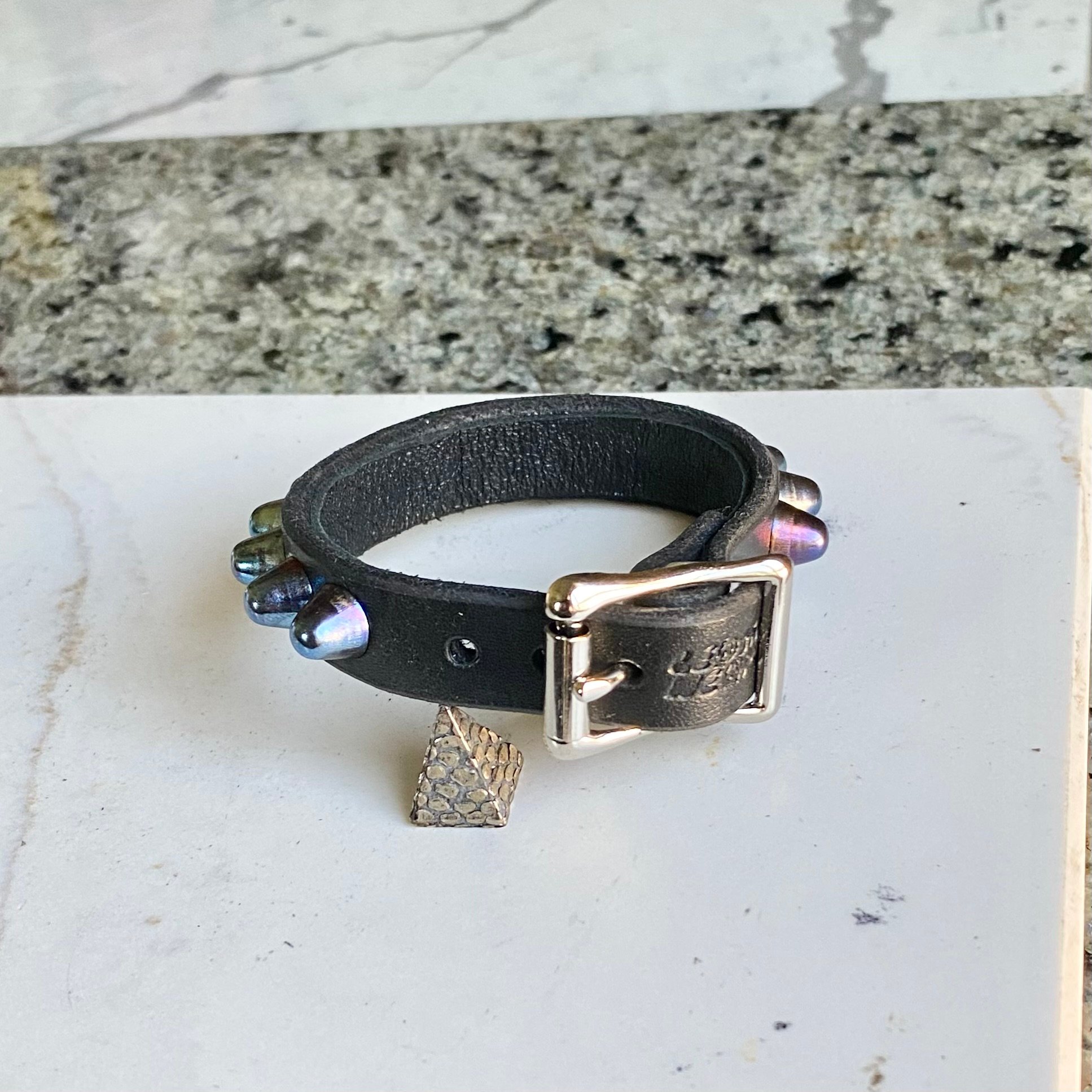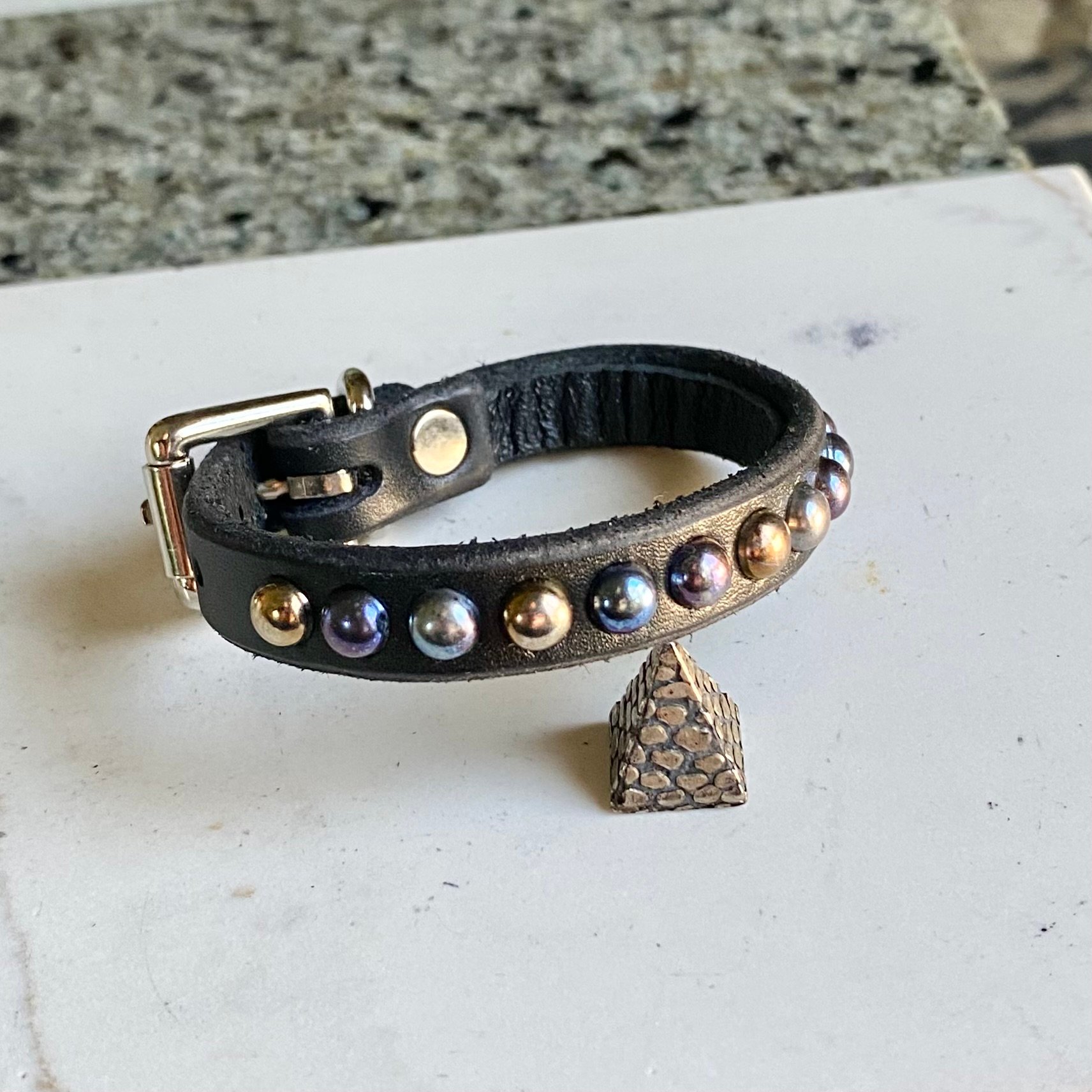 Rainbow tiny dome studs on 1/2” wide black leather with roller buckle.