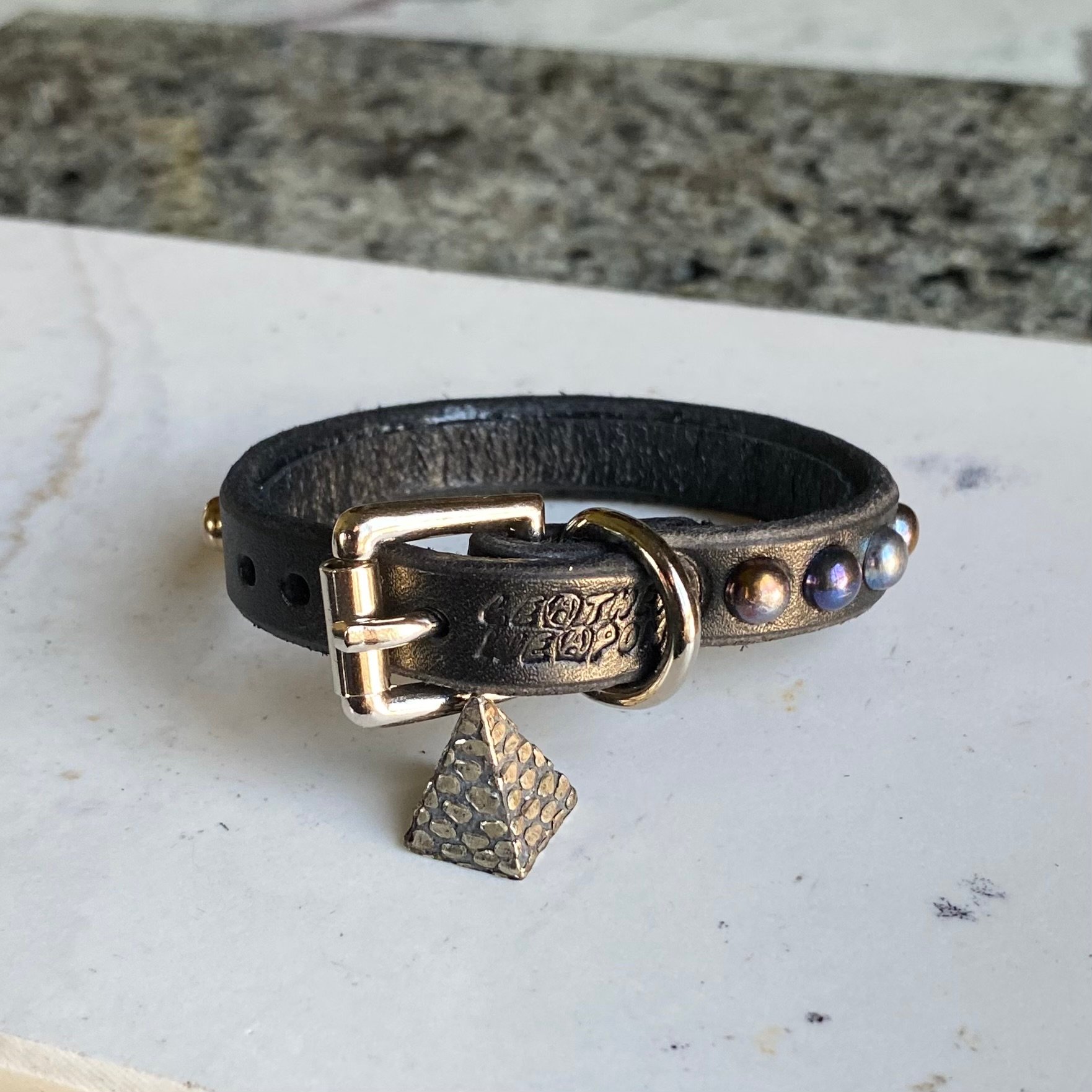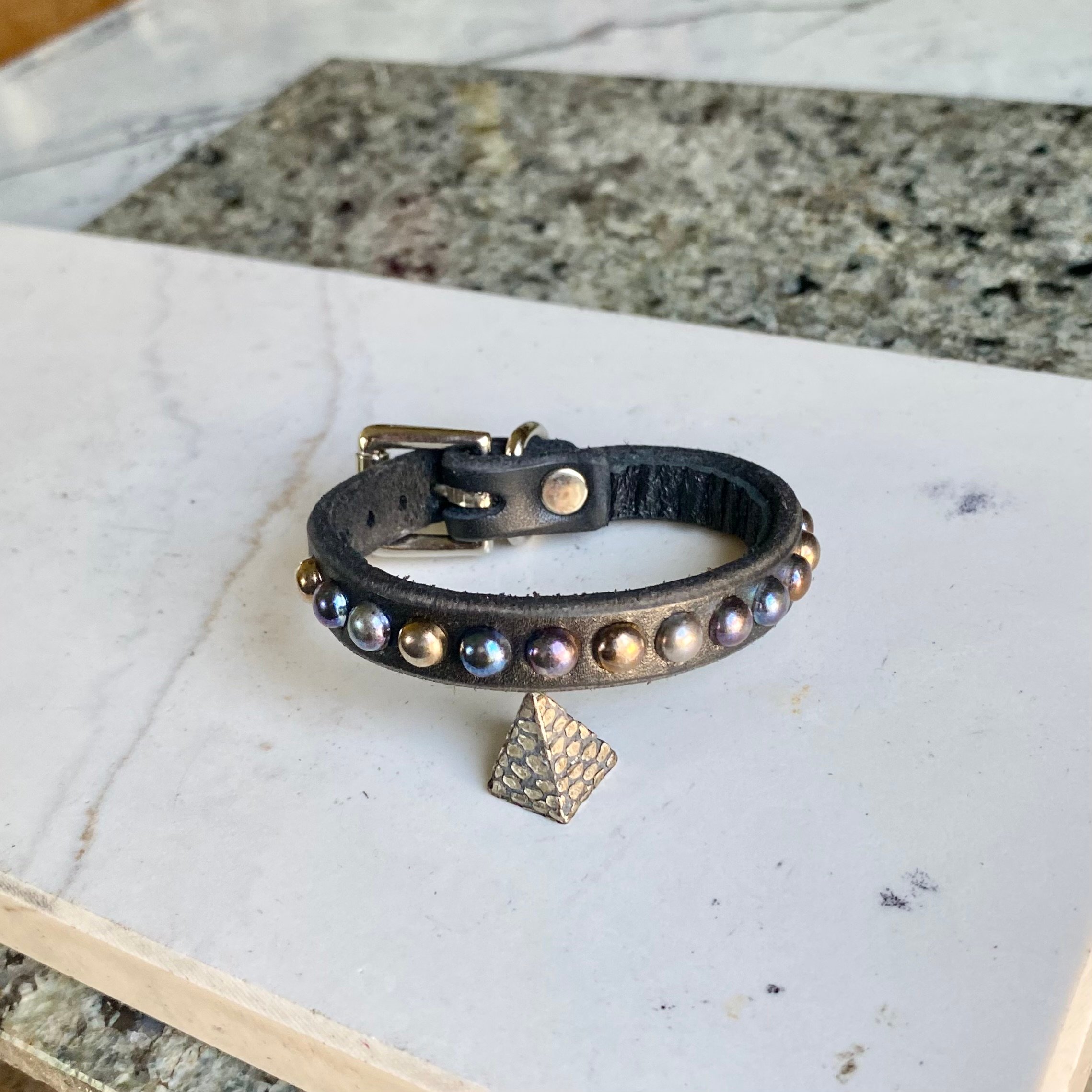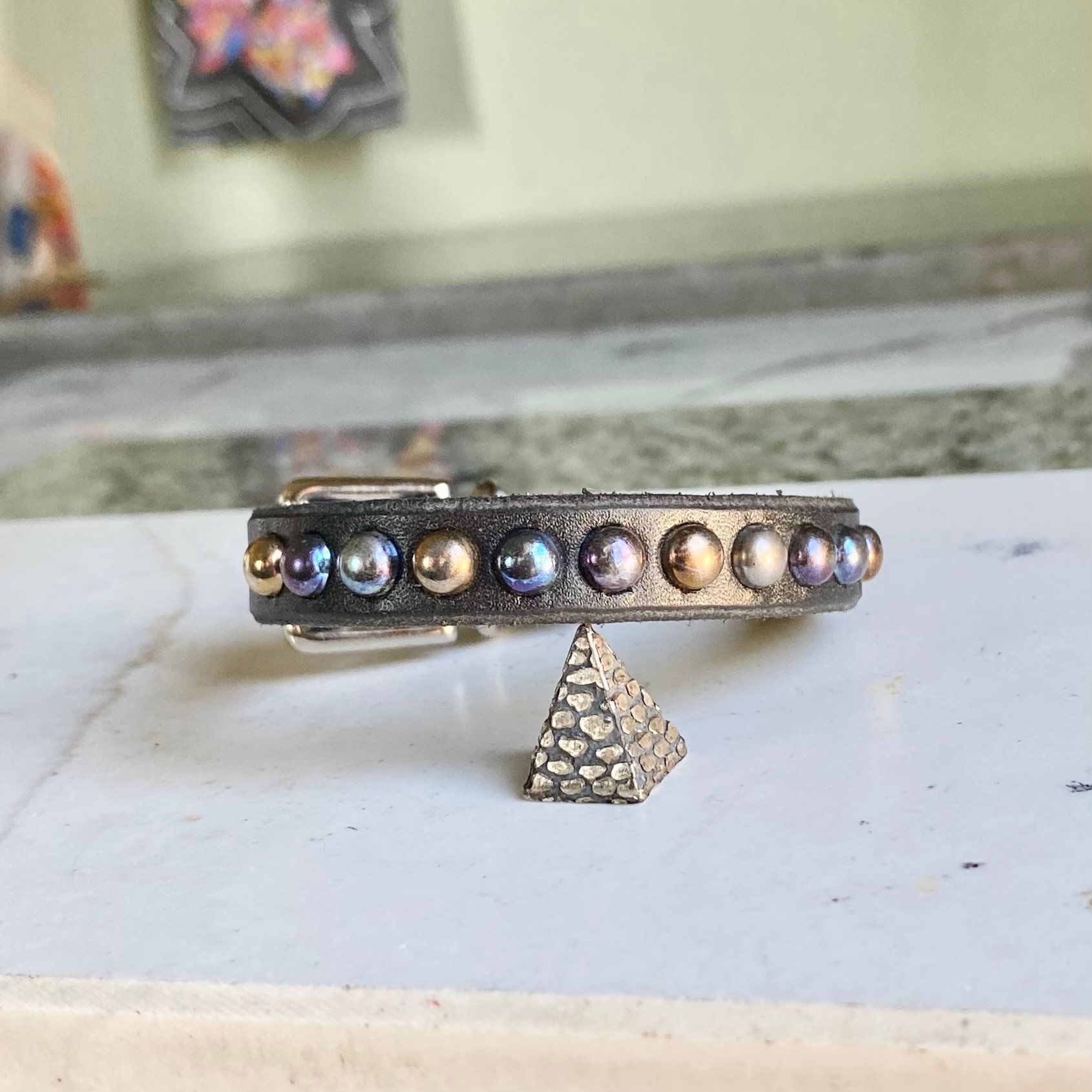 Rainbow tiny dome studs on 1/2” wide black leather with roller buckle.