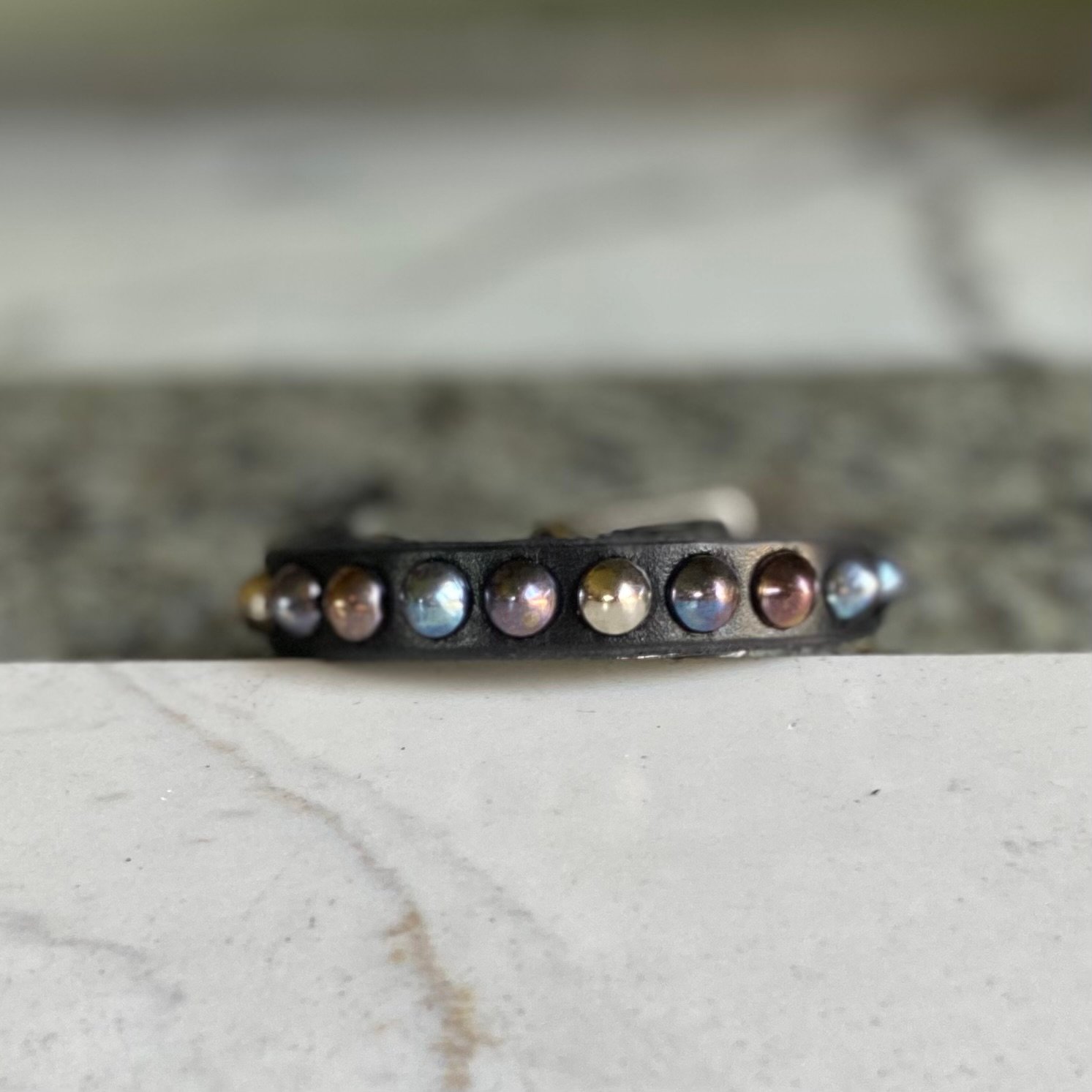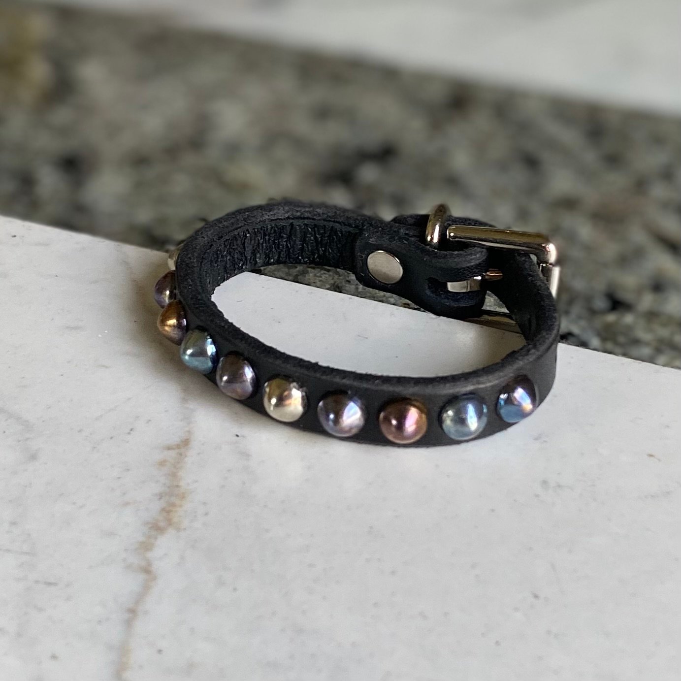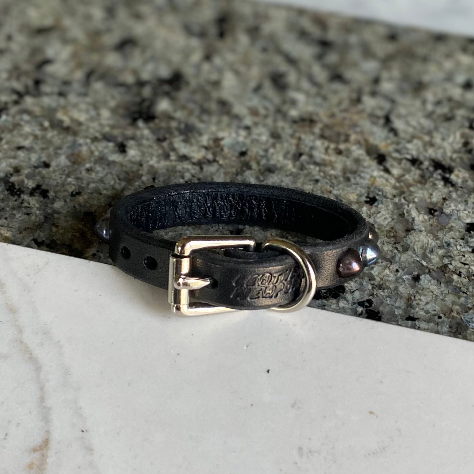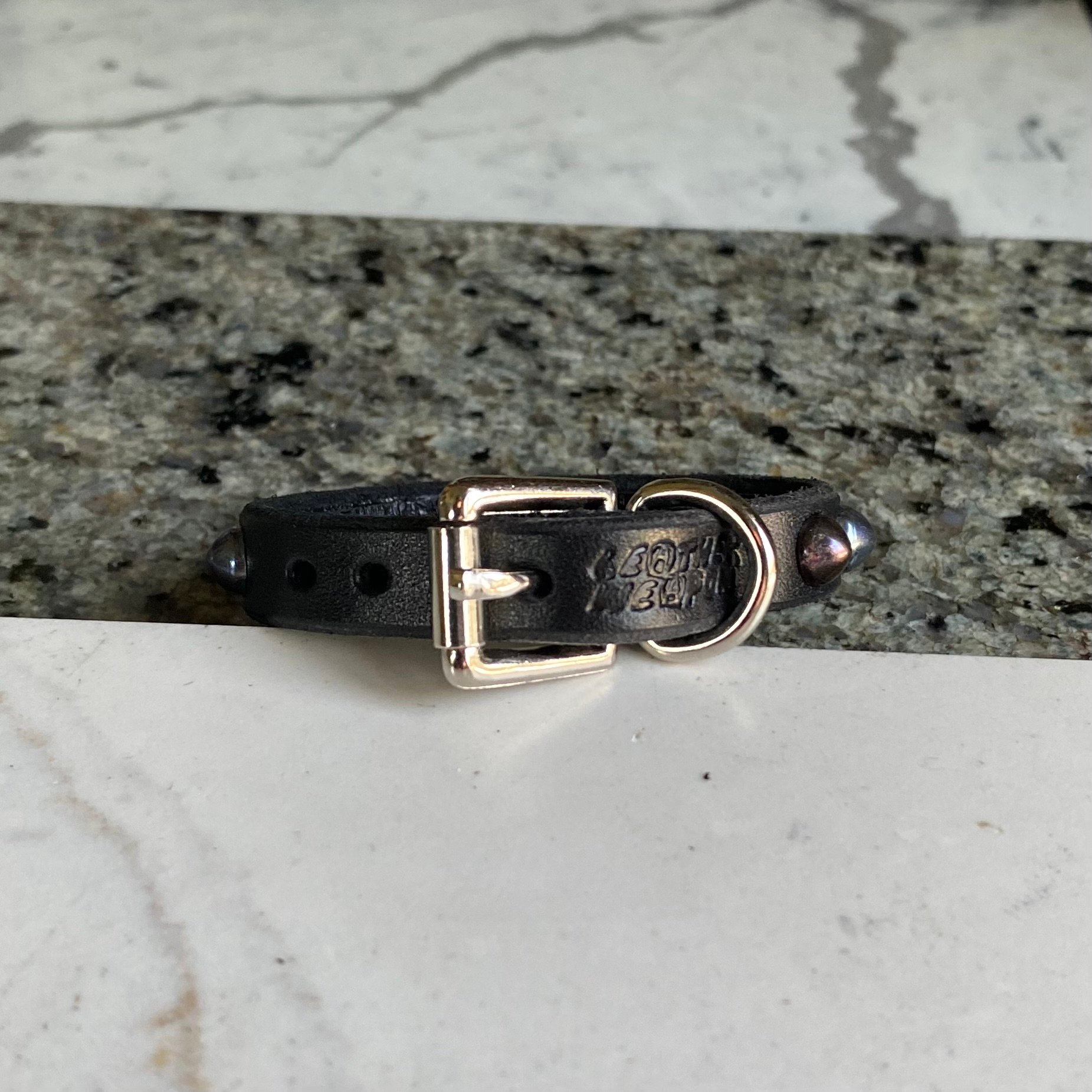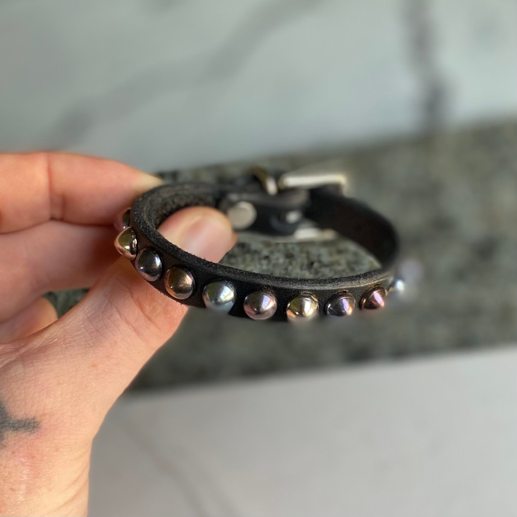 Rainbow mini standard cones on 1/2” wide black leather with roller buckle.