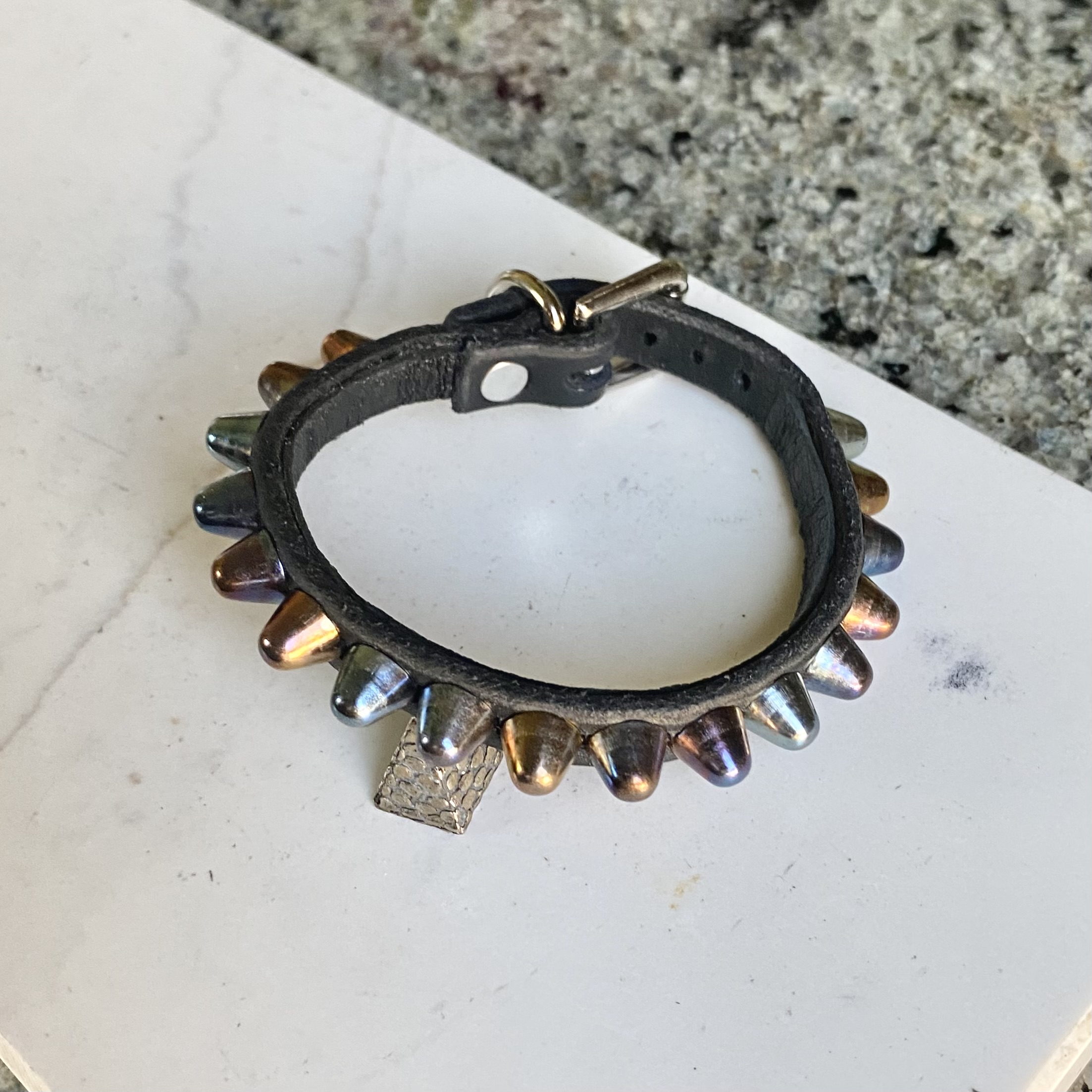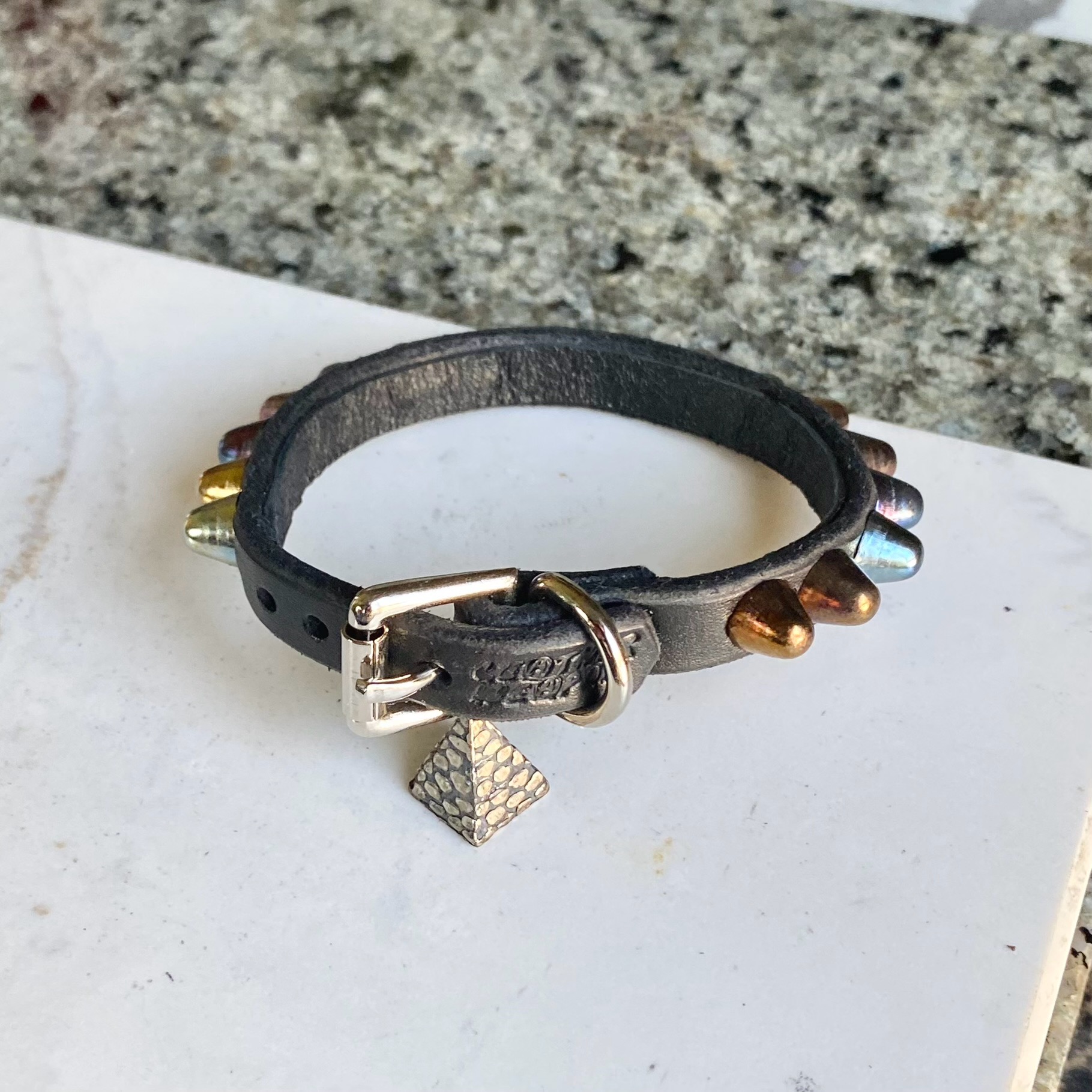 Rainbow short British studs on black leather with roller buckle/d-ring.