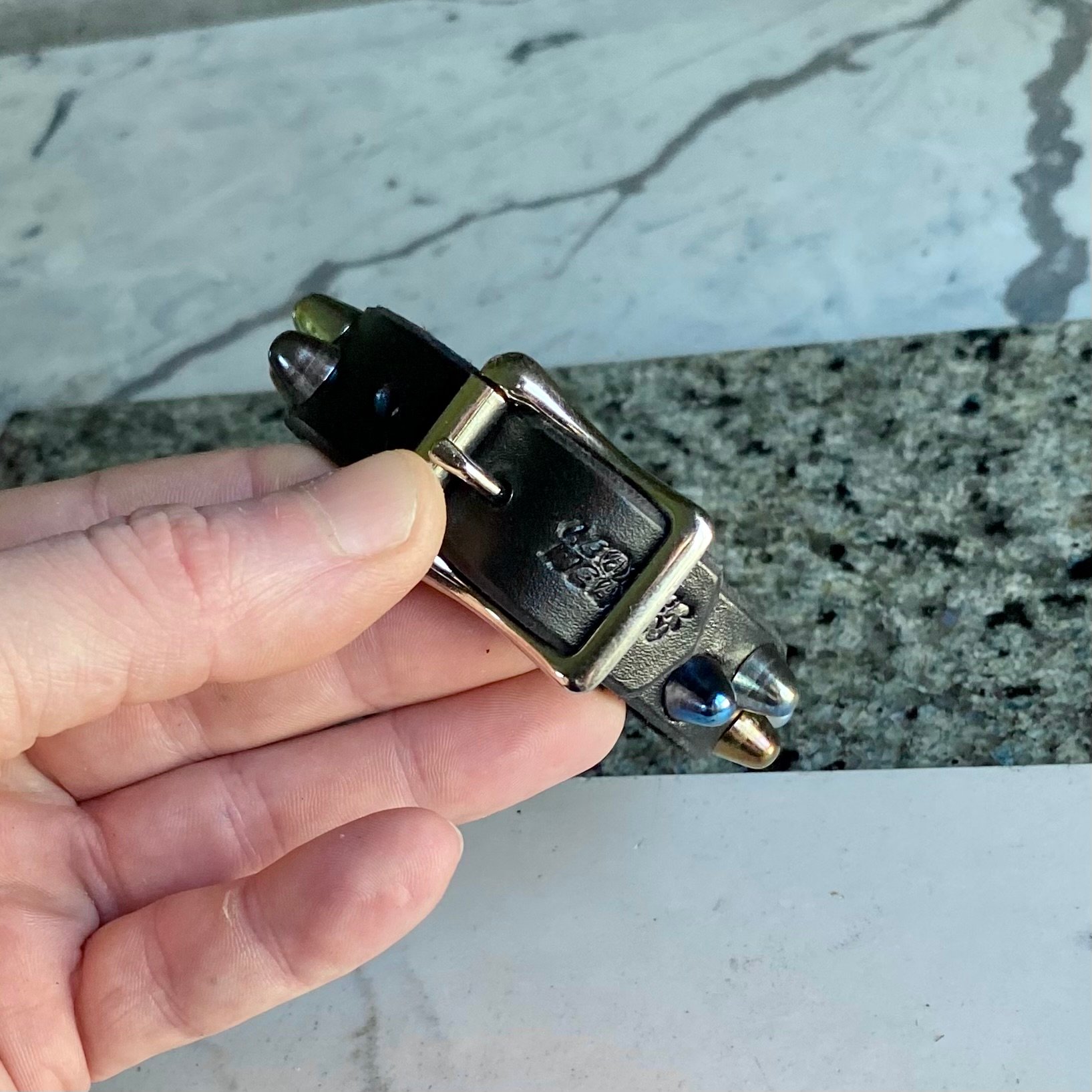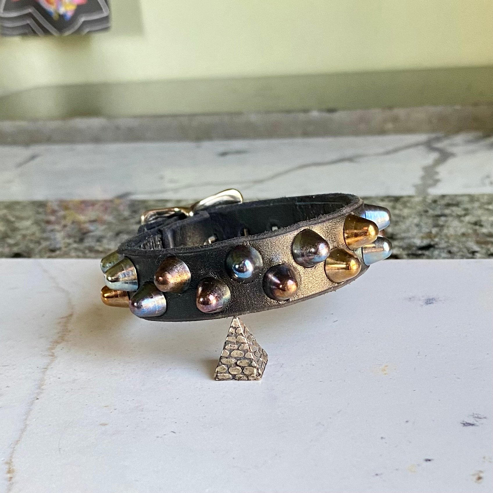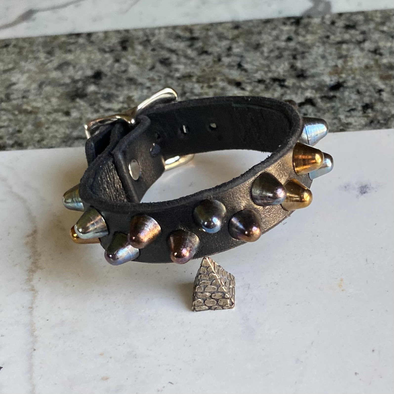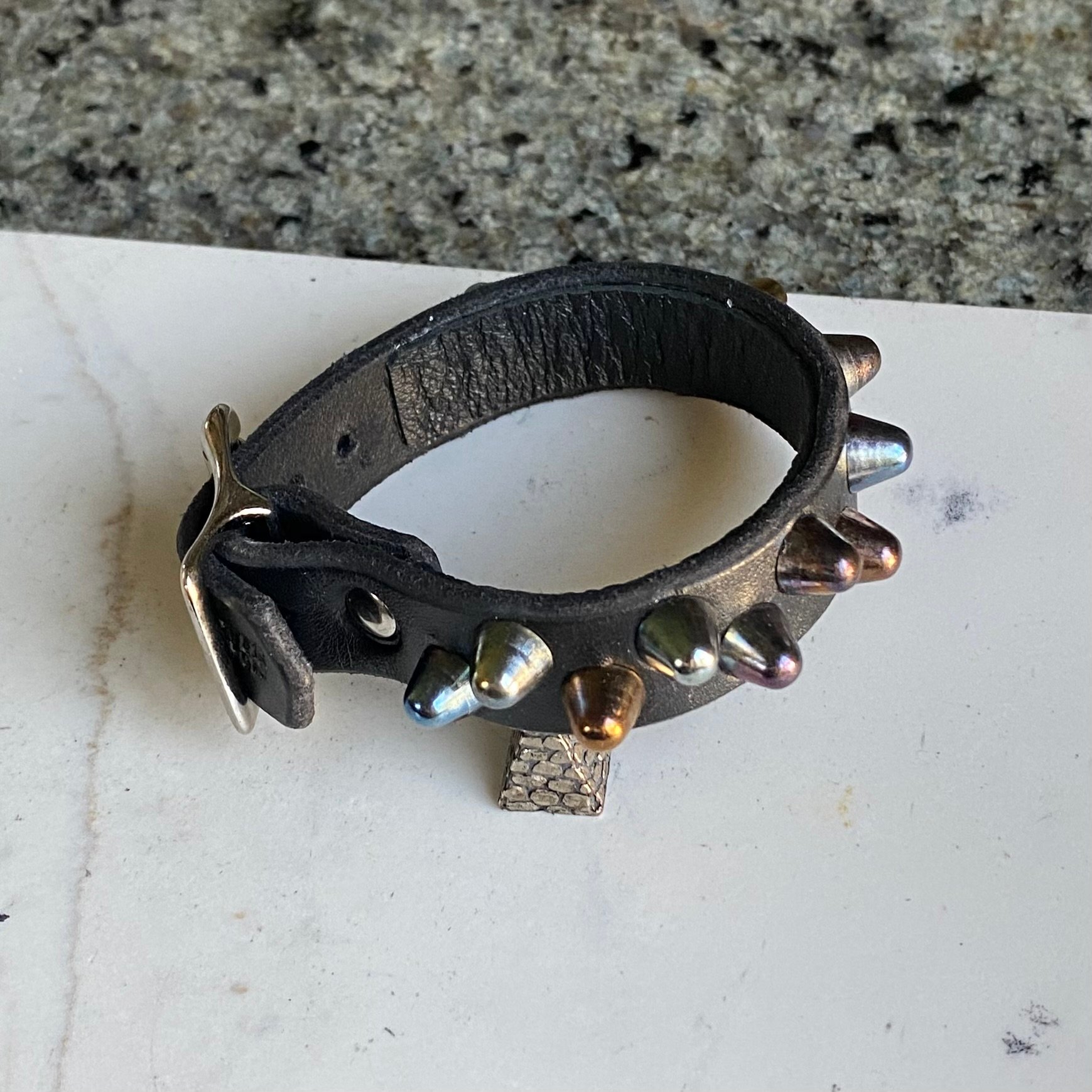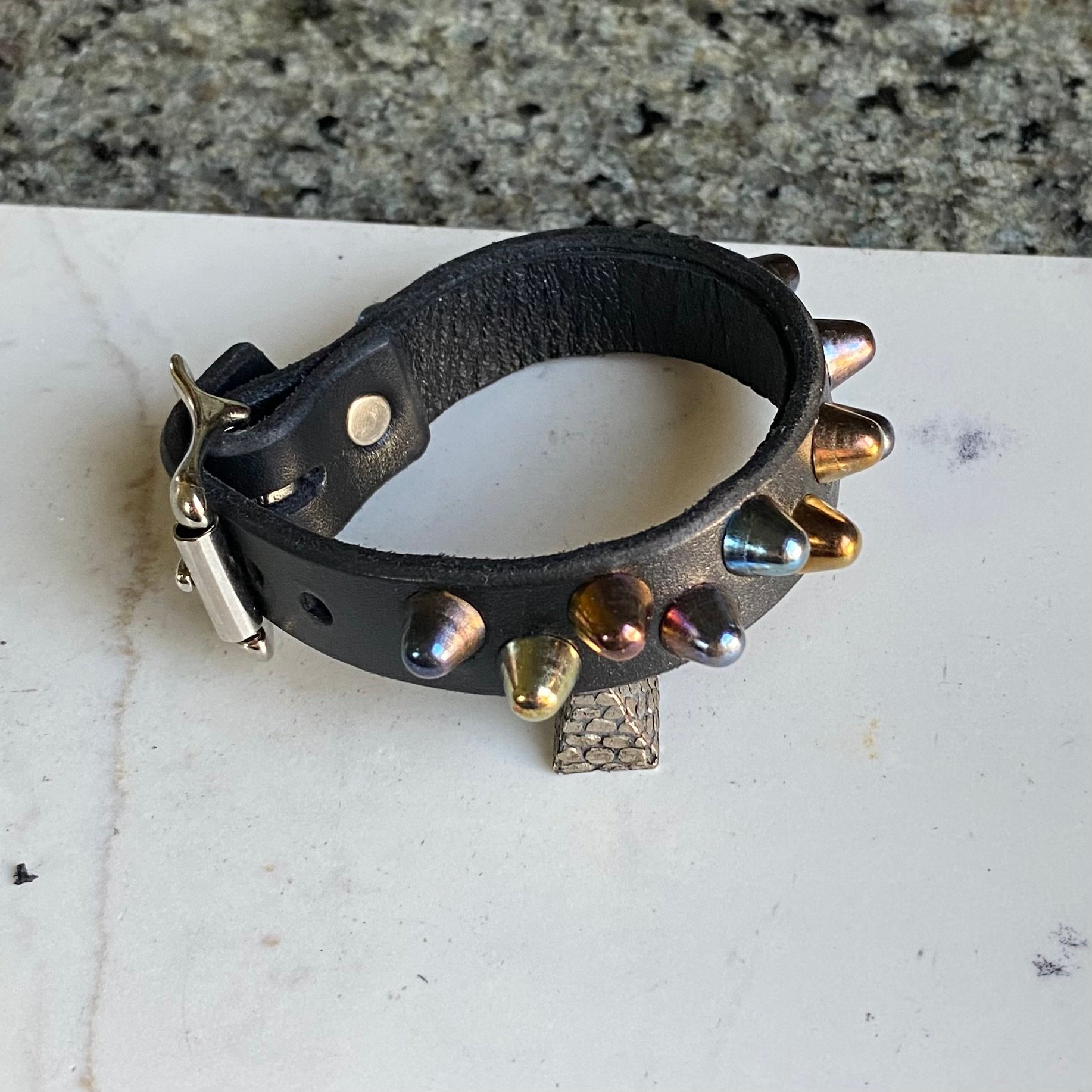 Rainbow short British studs on black leather with self keeper buckle.