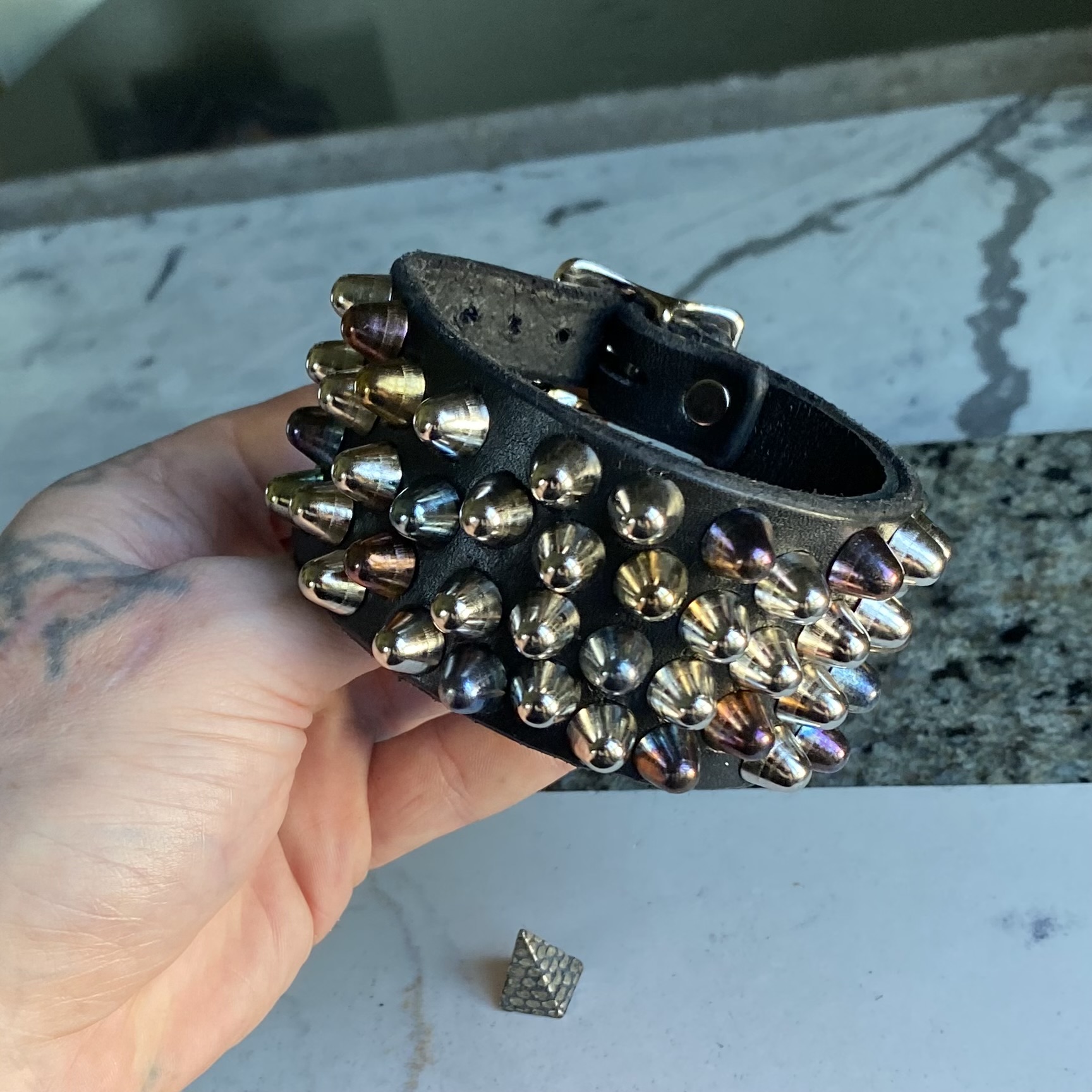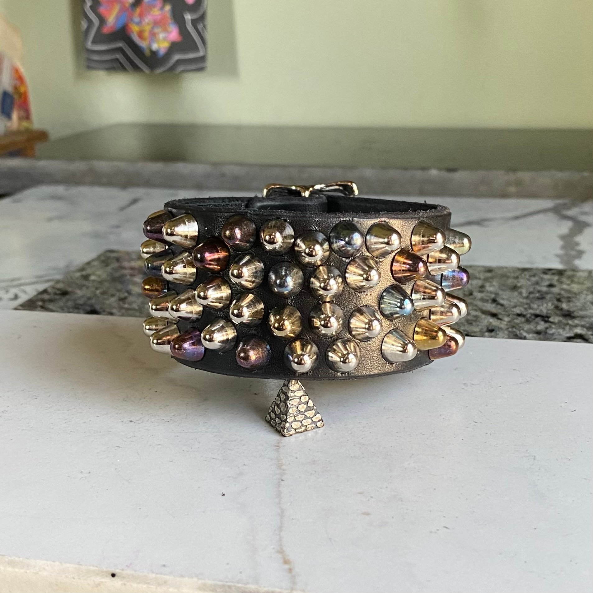 Chaotic rainbow’d short british studs set on black leather with all nickel hardware and protective leather backing layer for your wrist.