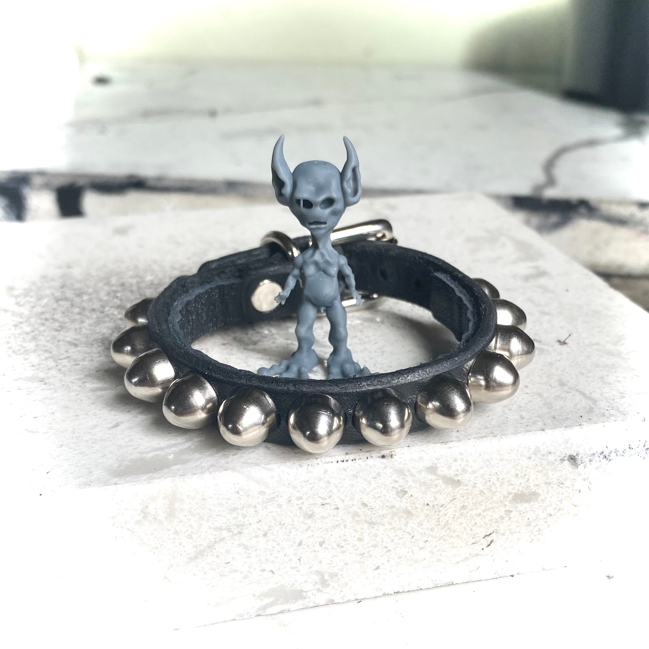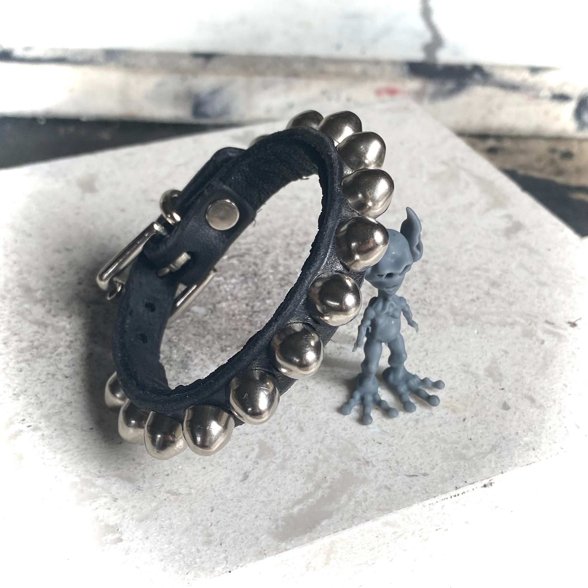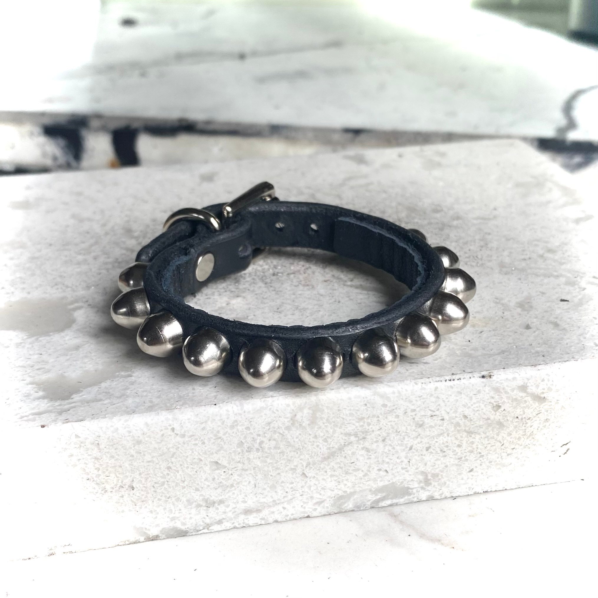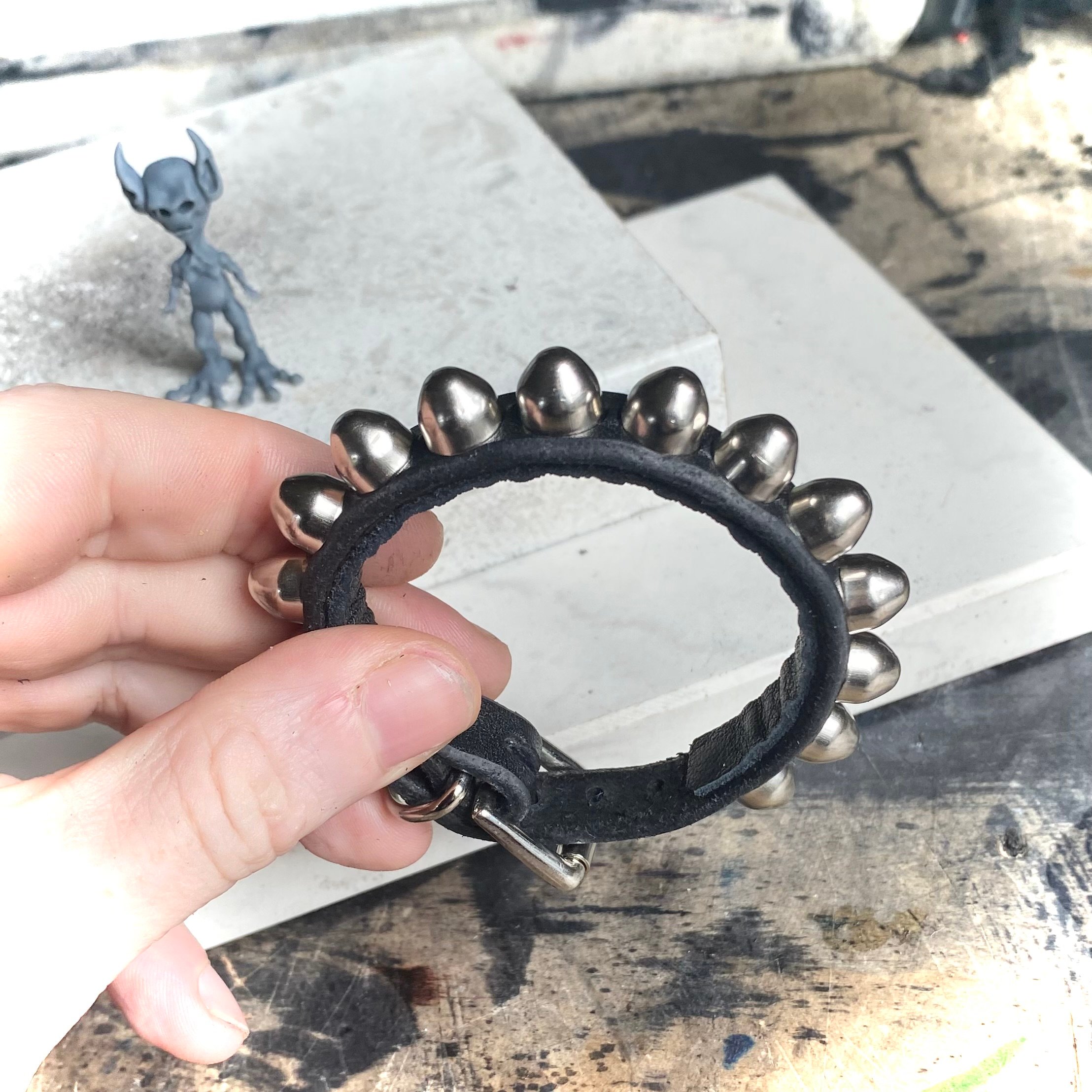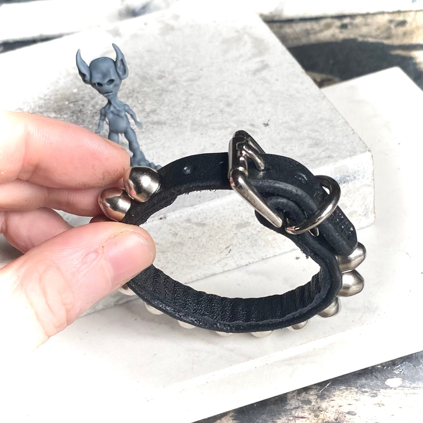 Bullet studs on 1/2” black leather with roller buckle/d-ring.
