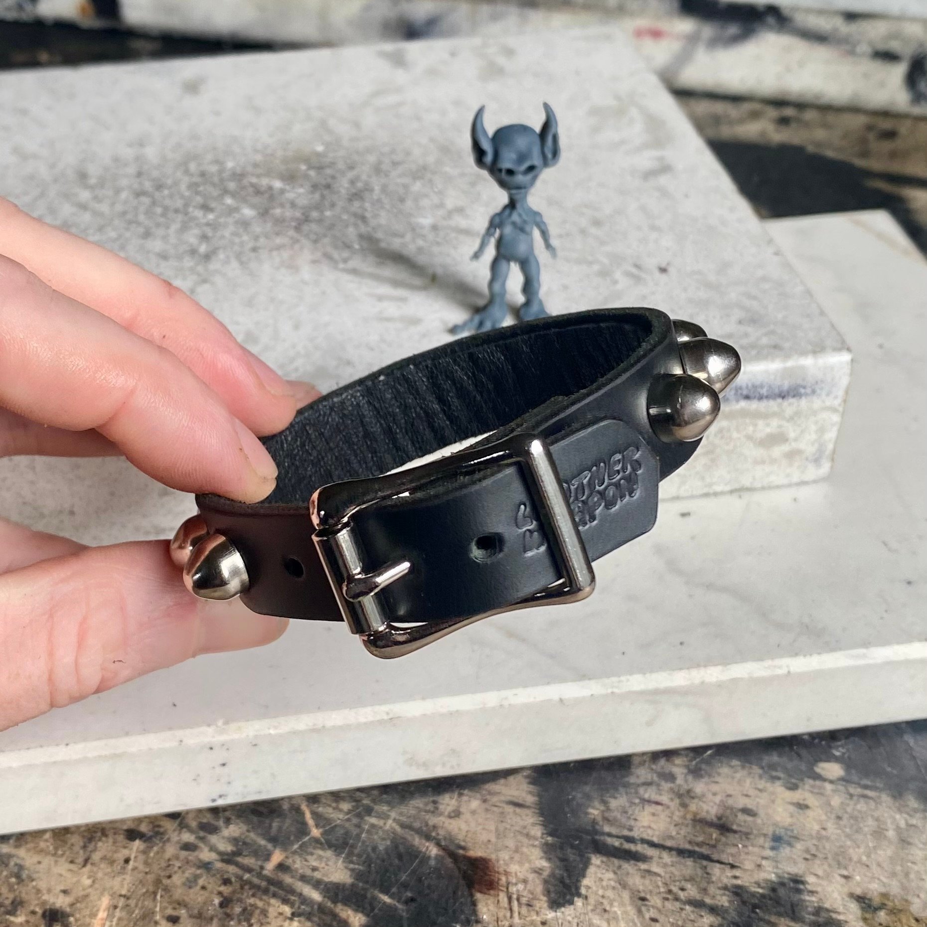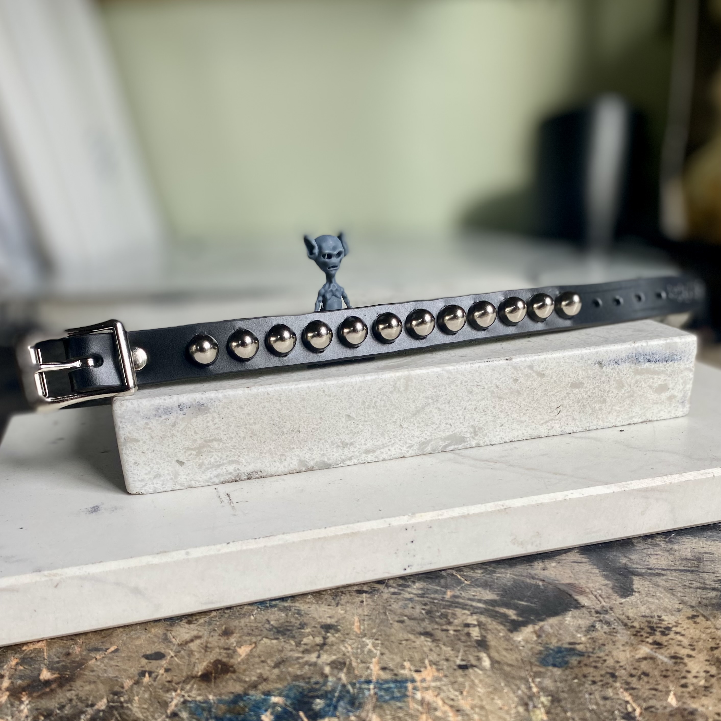 Bullet studs on 5/8” black leather with choice of self keeper as pictured or roller buckle/d-ring for $1 more.