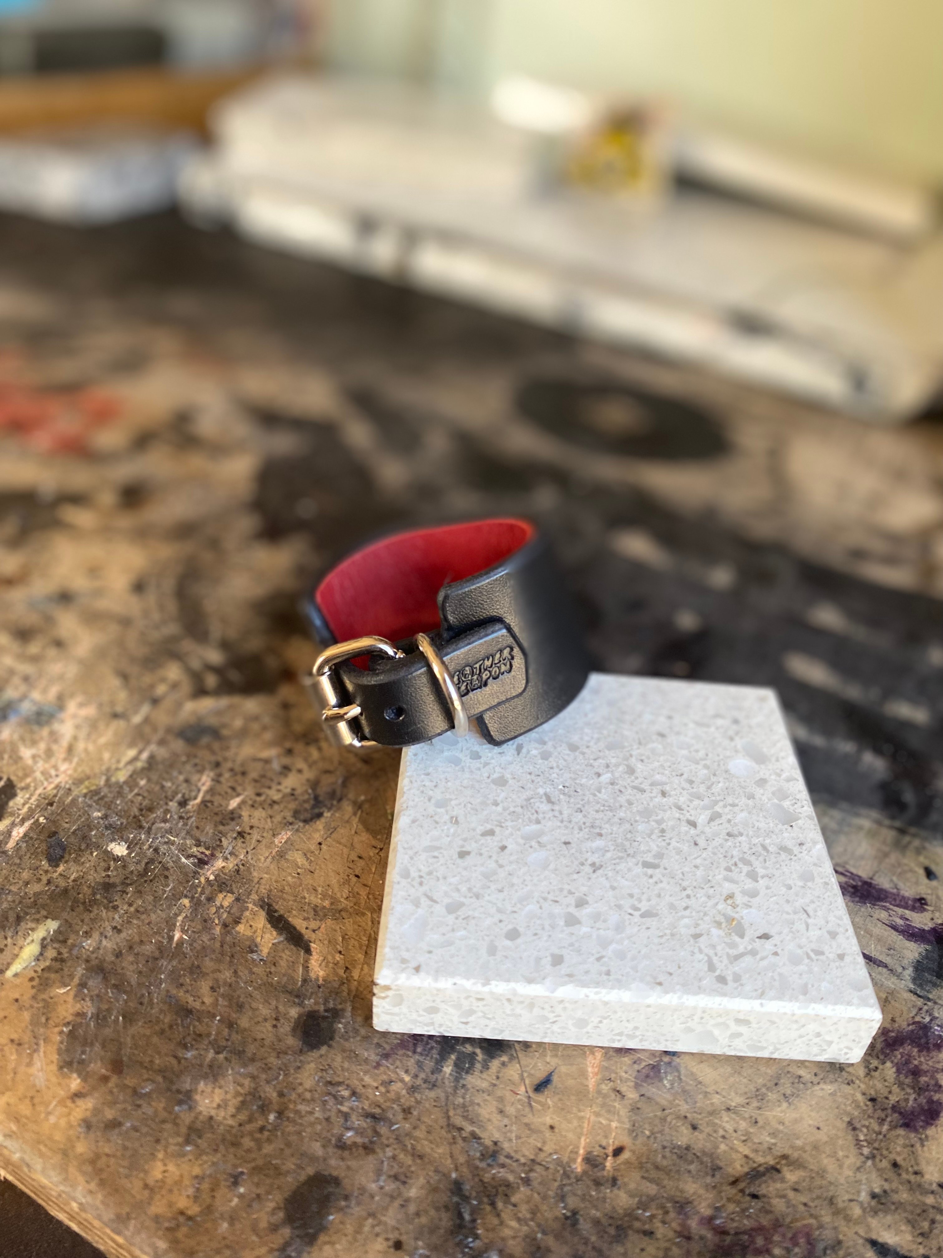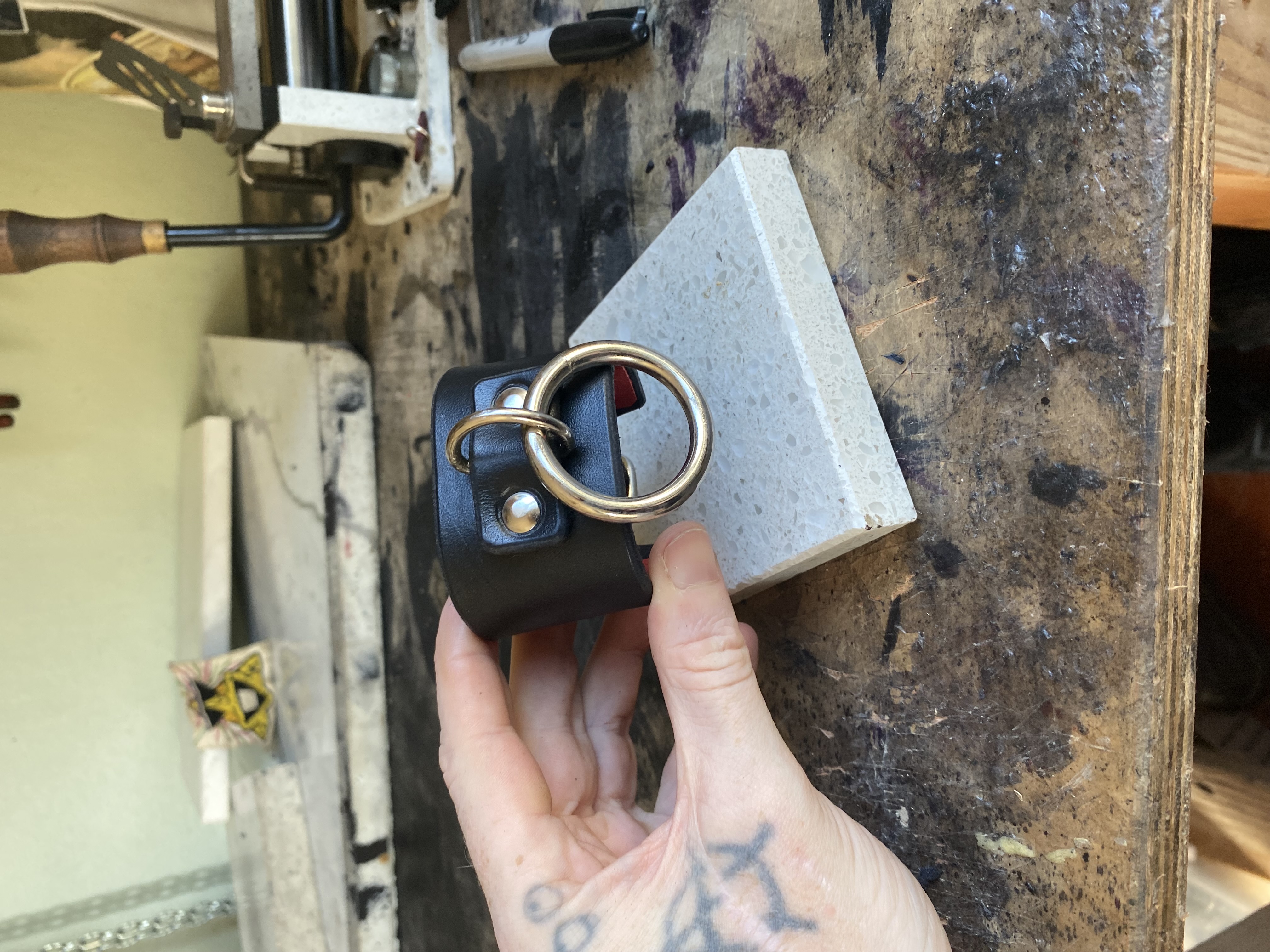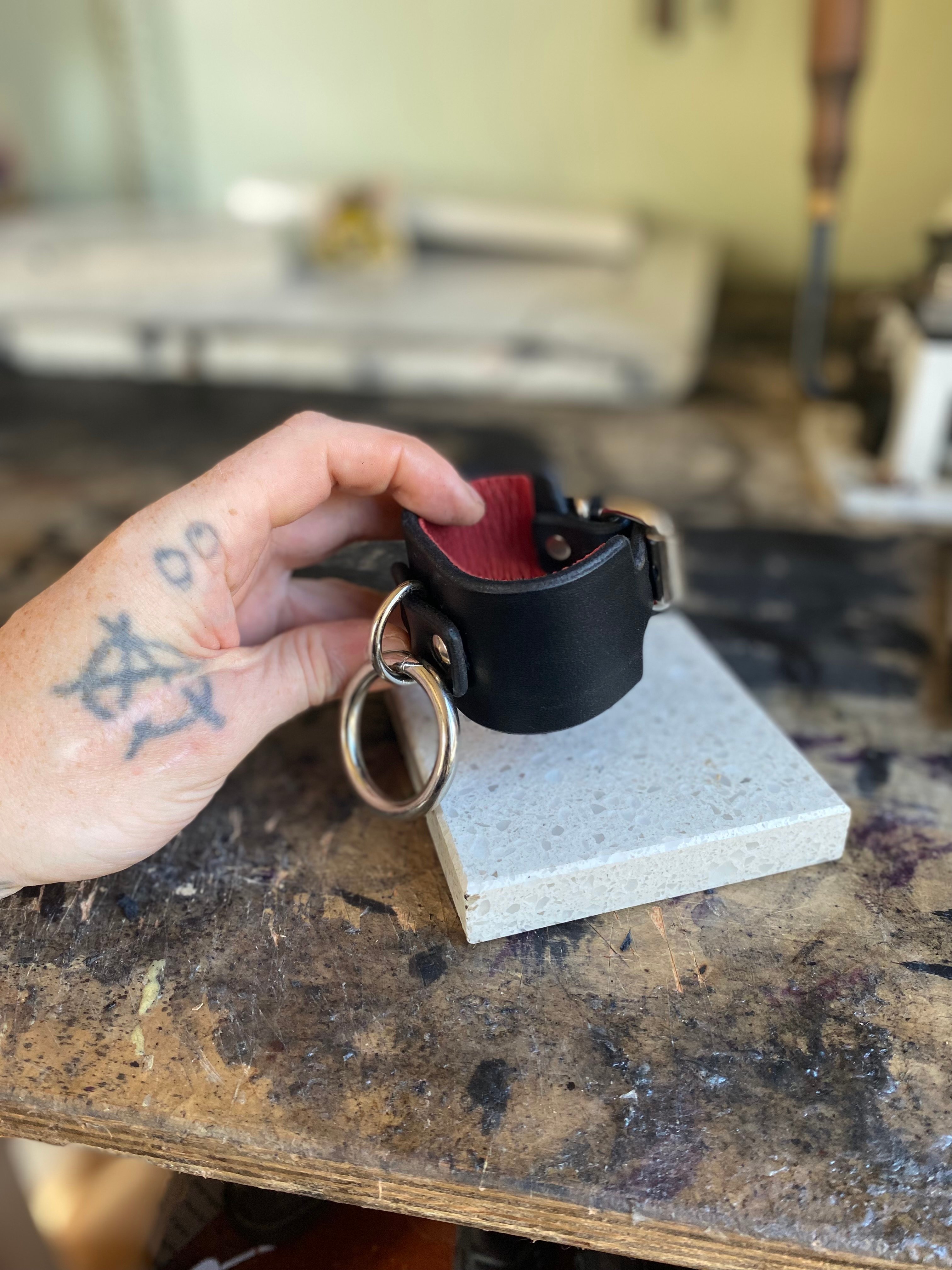 Genuine leather with bondage ring, made to fit your personal wrist measurement.