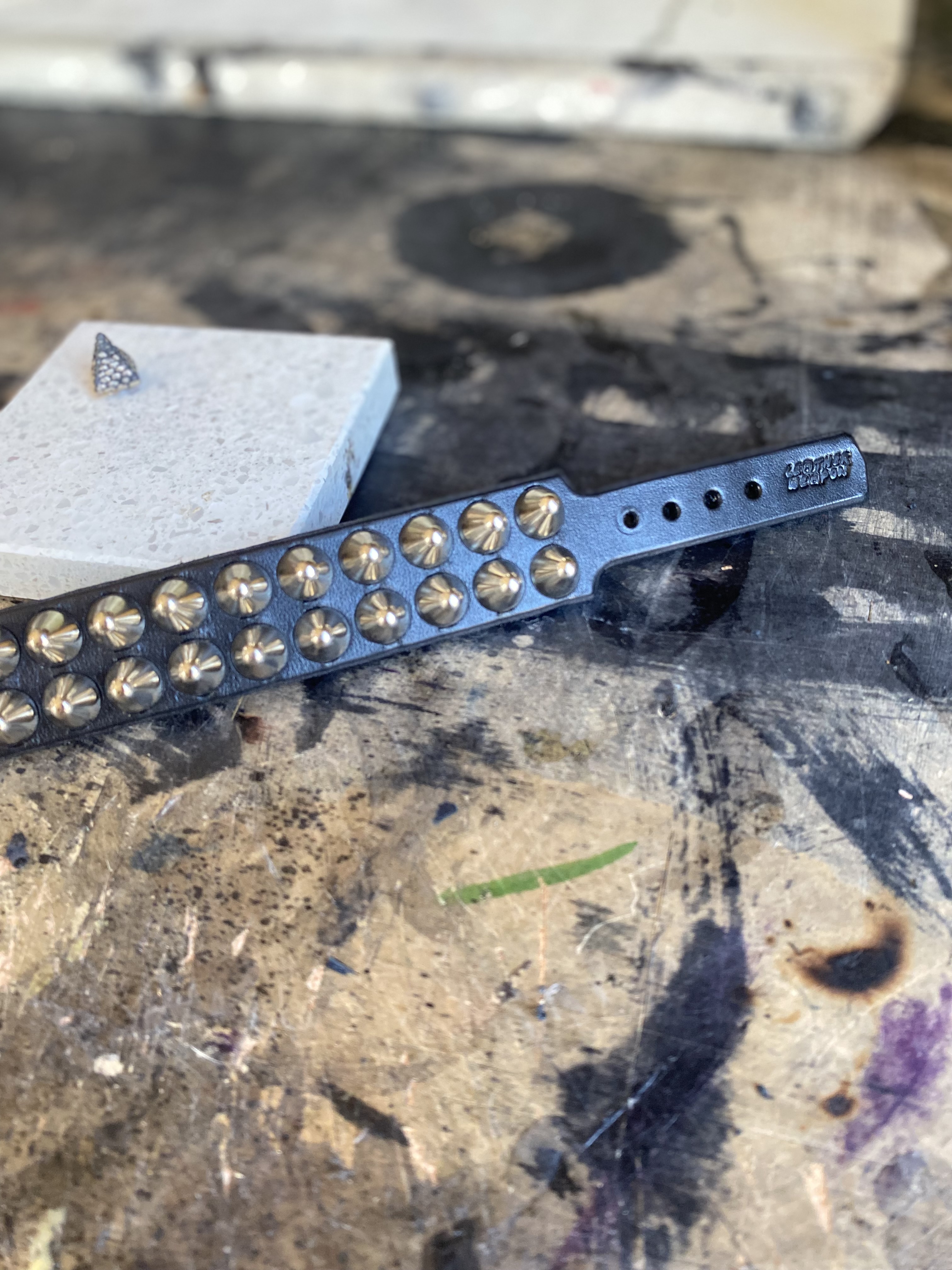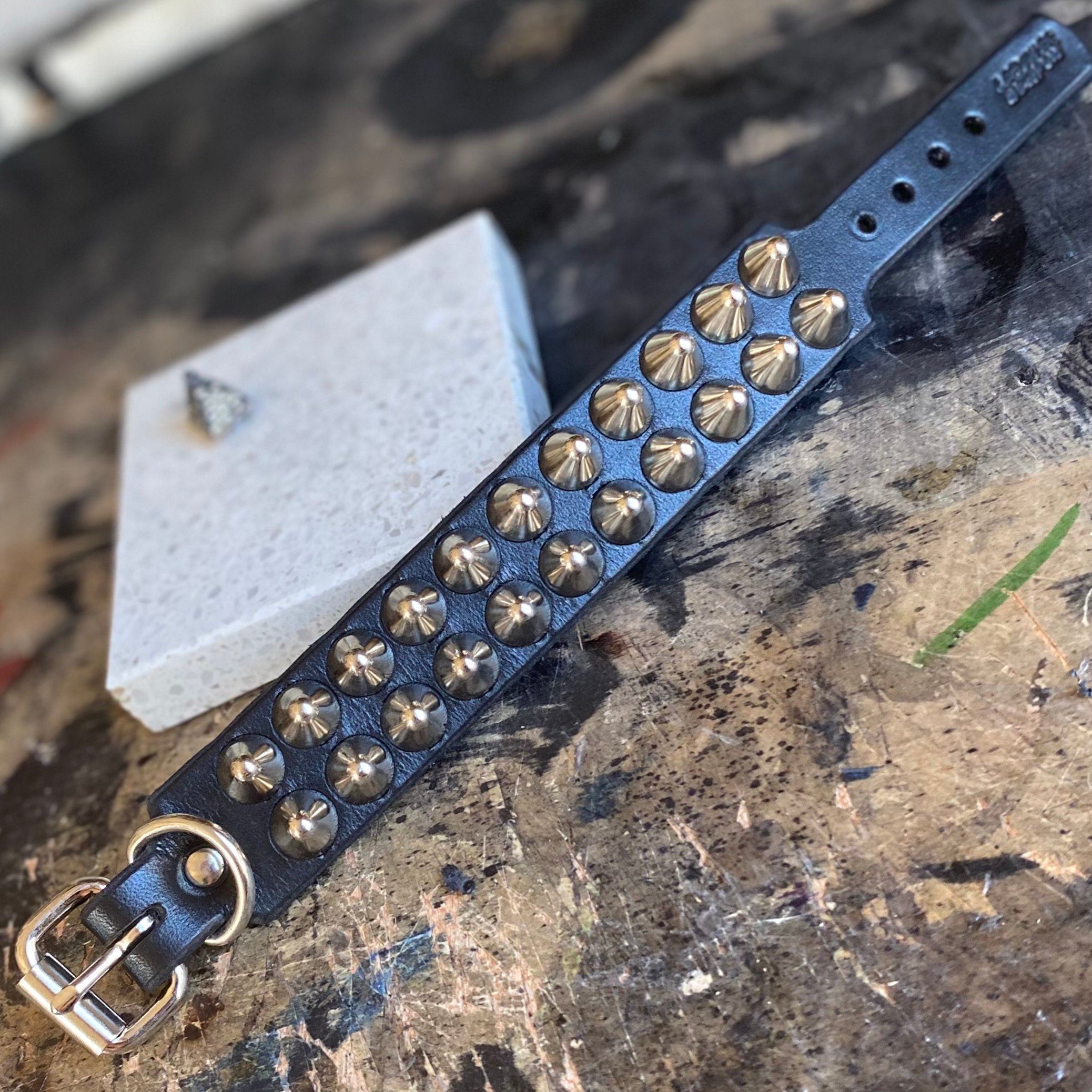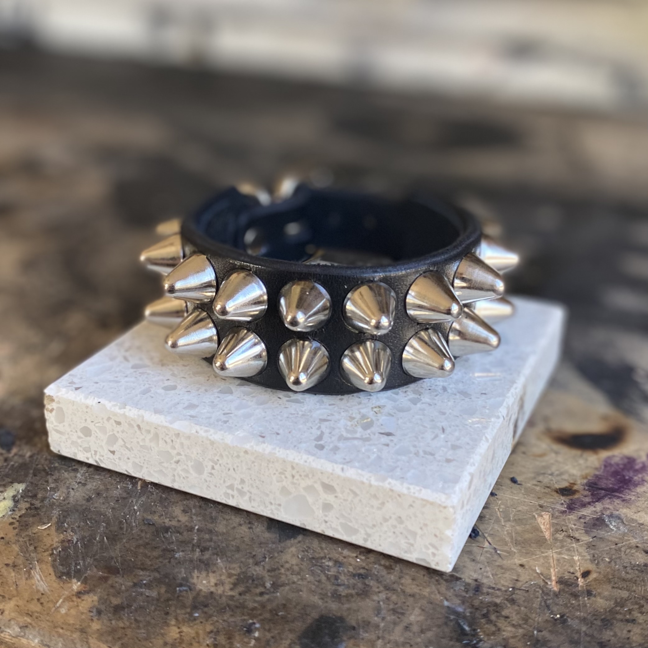 Double Row of tall British Cones on Genuine black leather with nickel buckle/d-ring.
