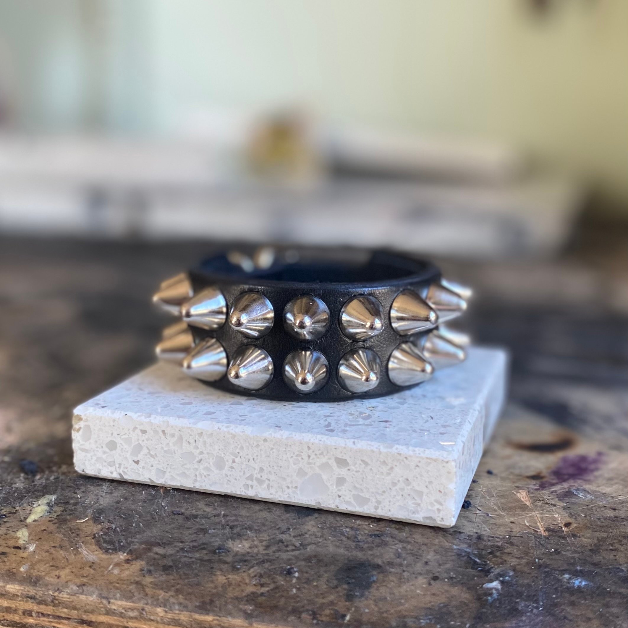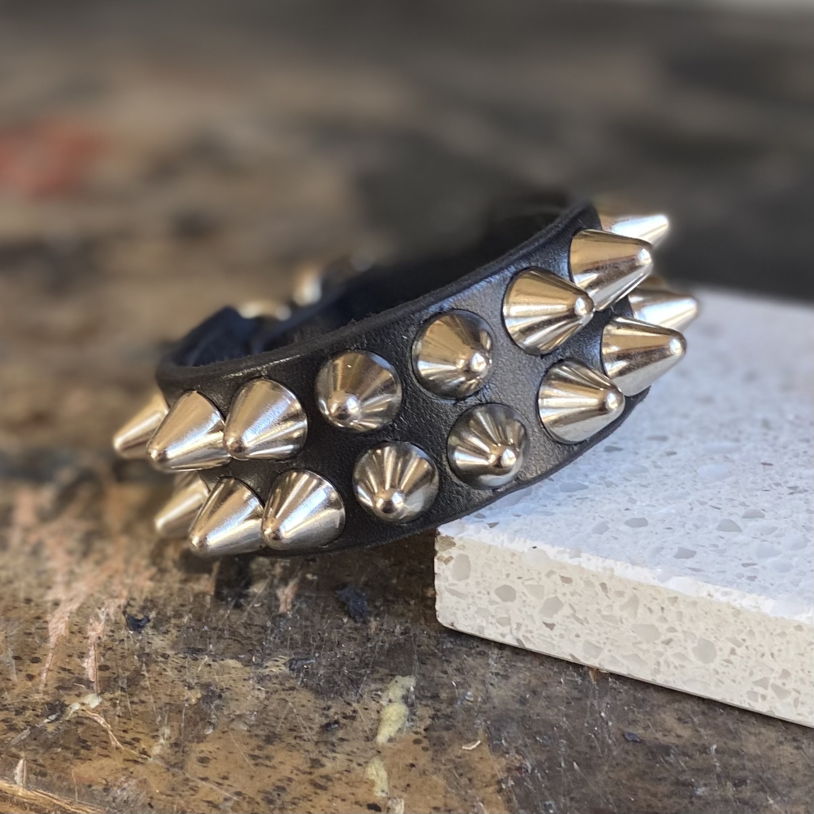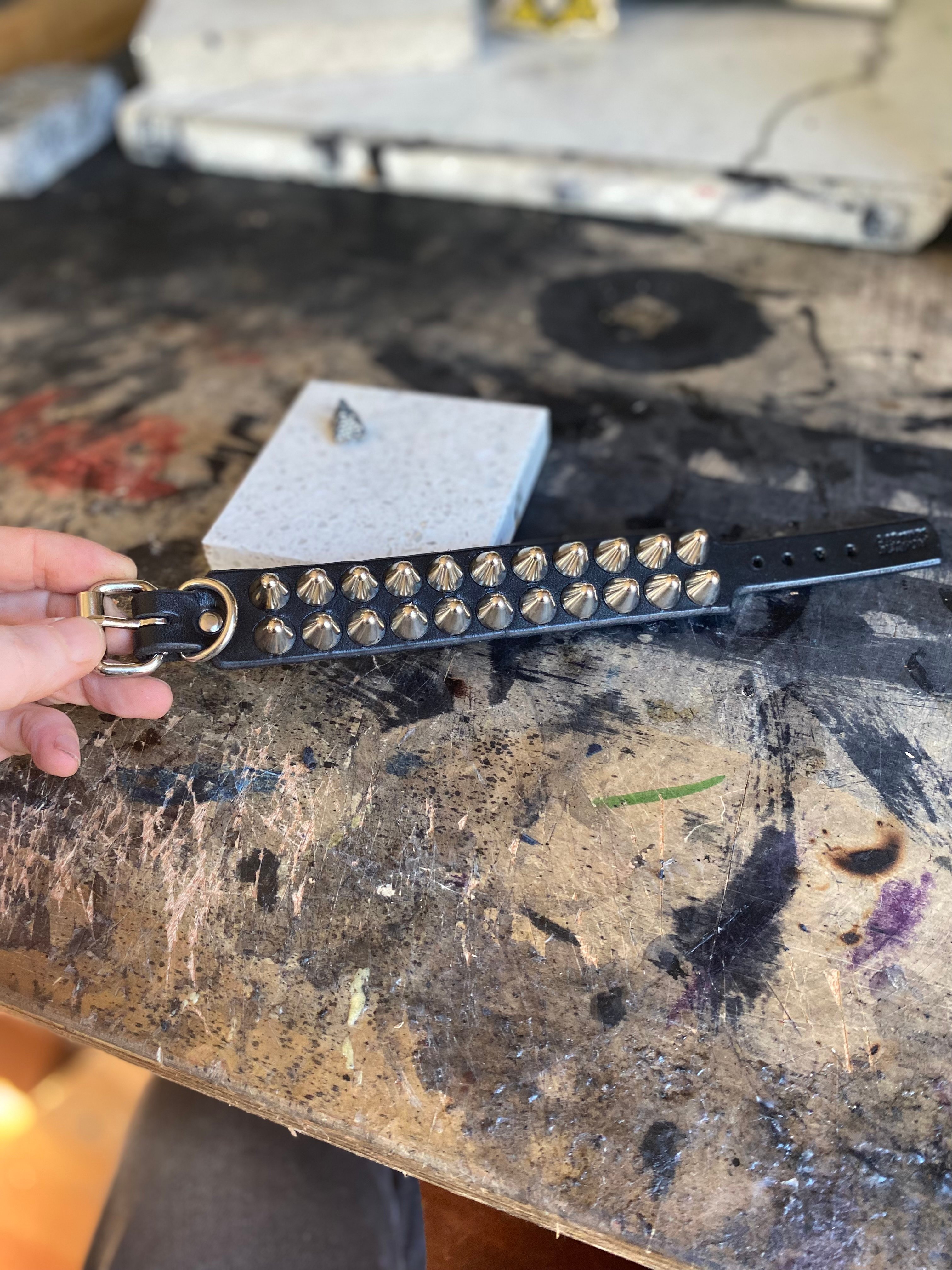 Double Row of tall British Cones on Genuine black leather with nickel buckle/d-ring.