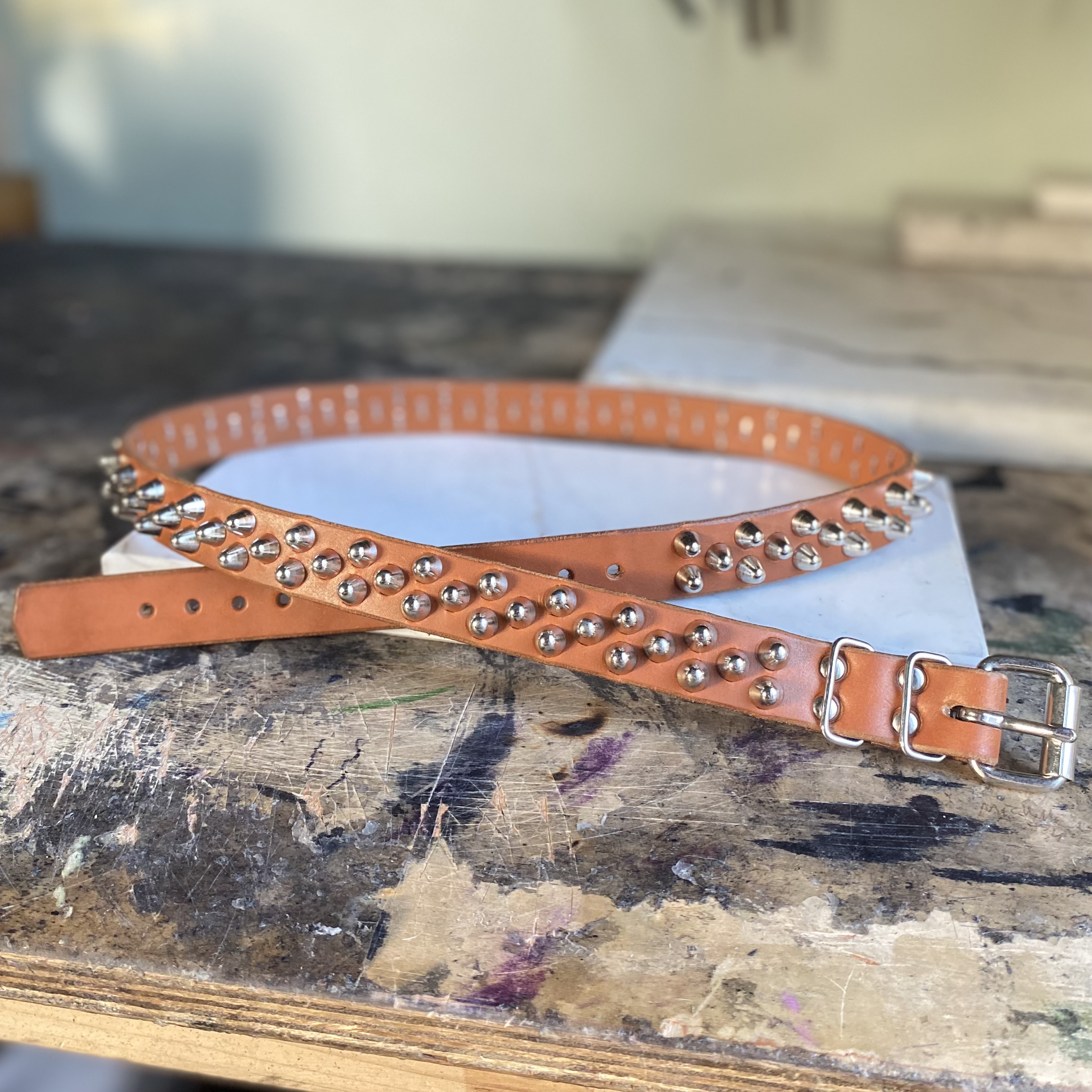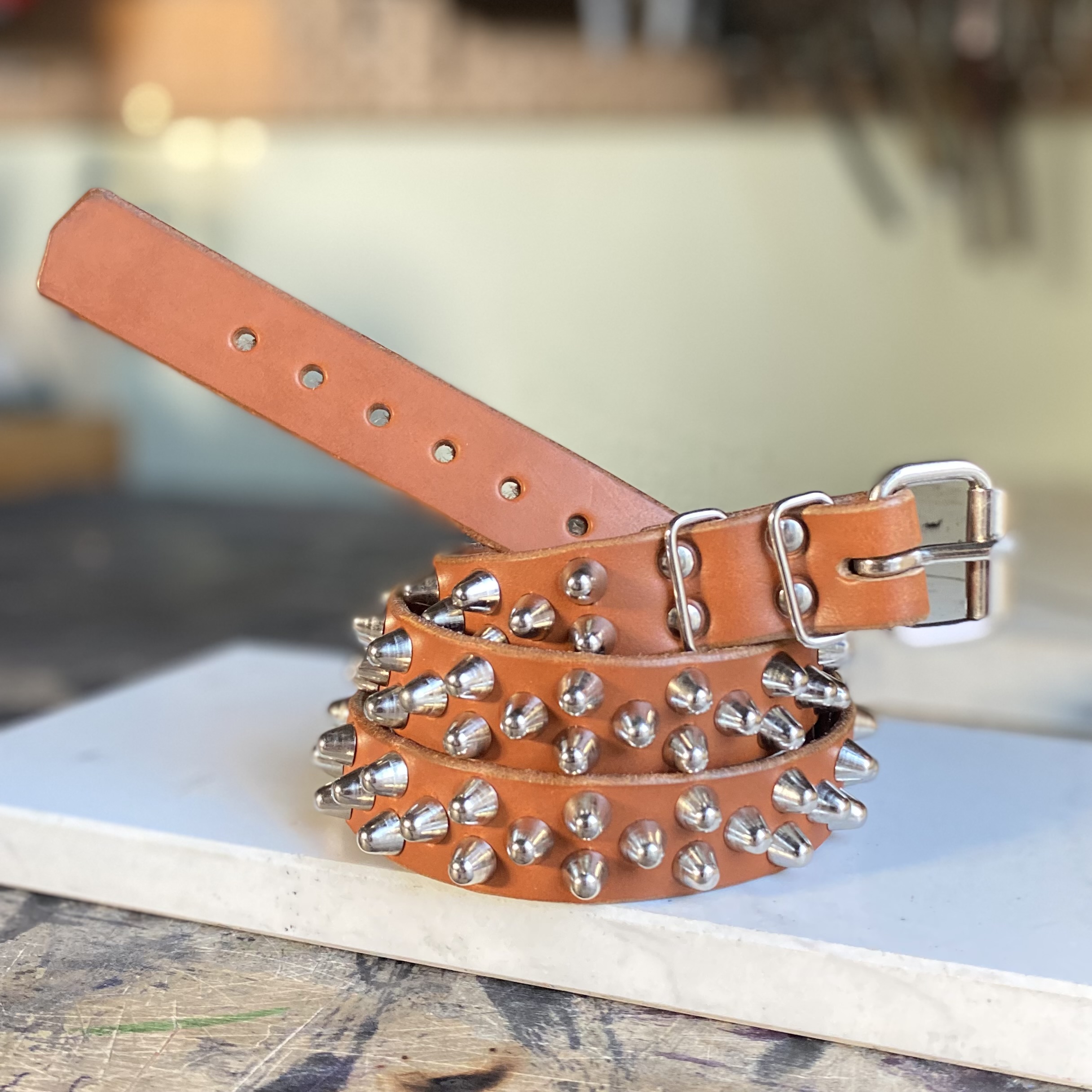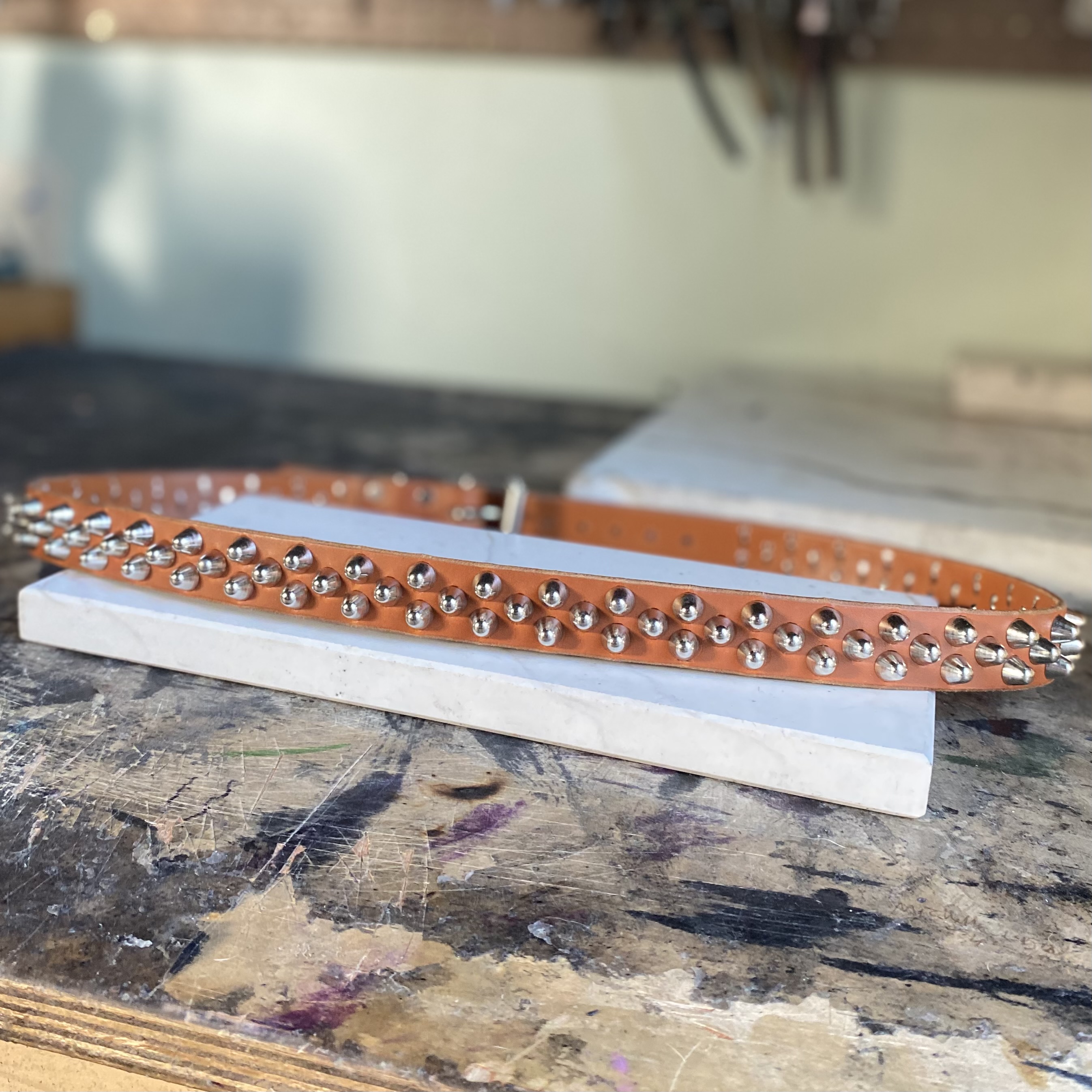 Genuine British tan leather finished with two d-rings, roller buckle & short British studs.