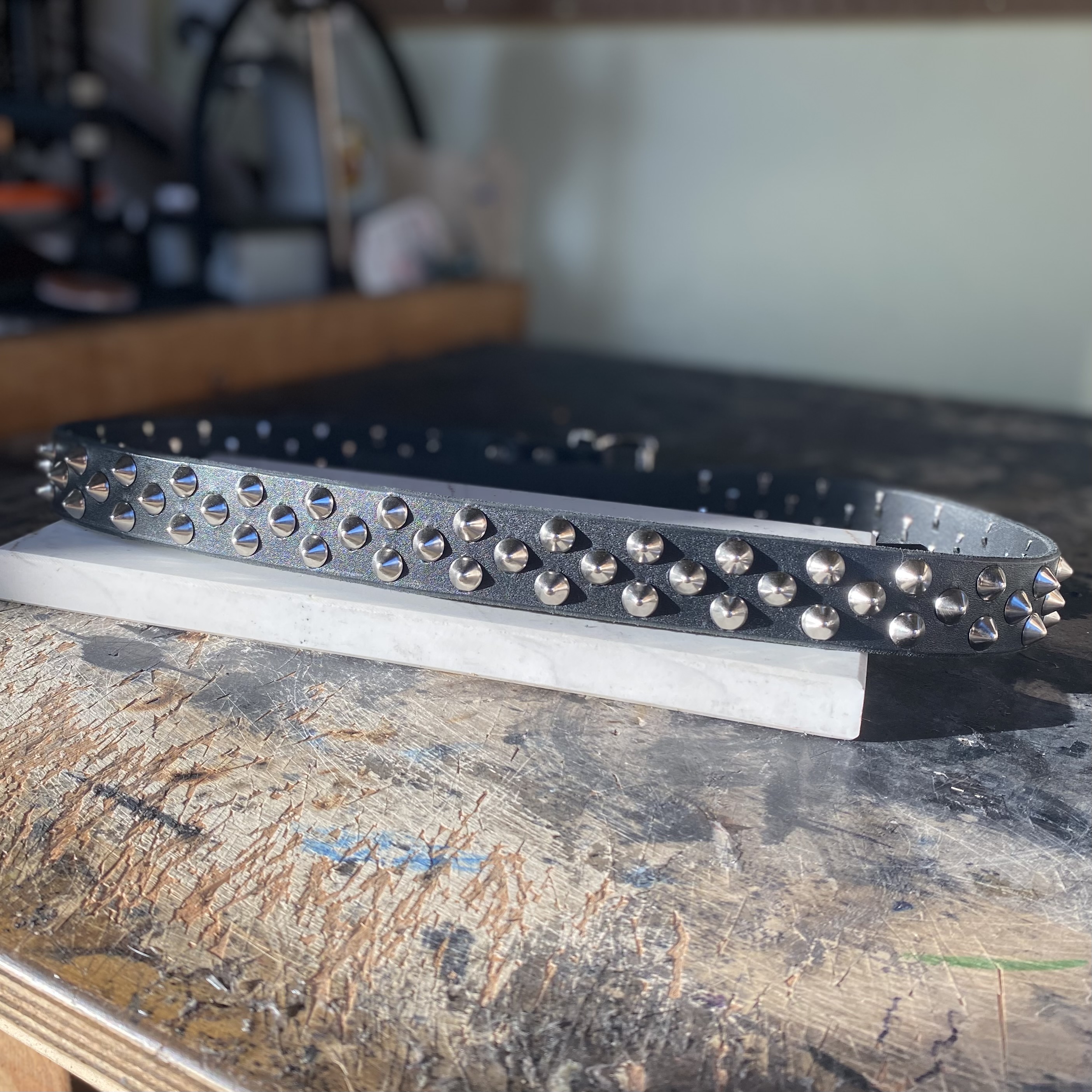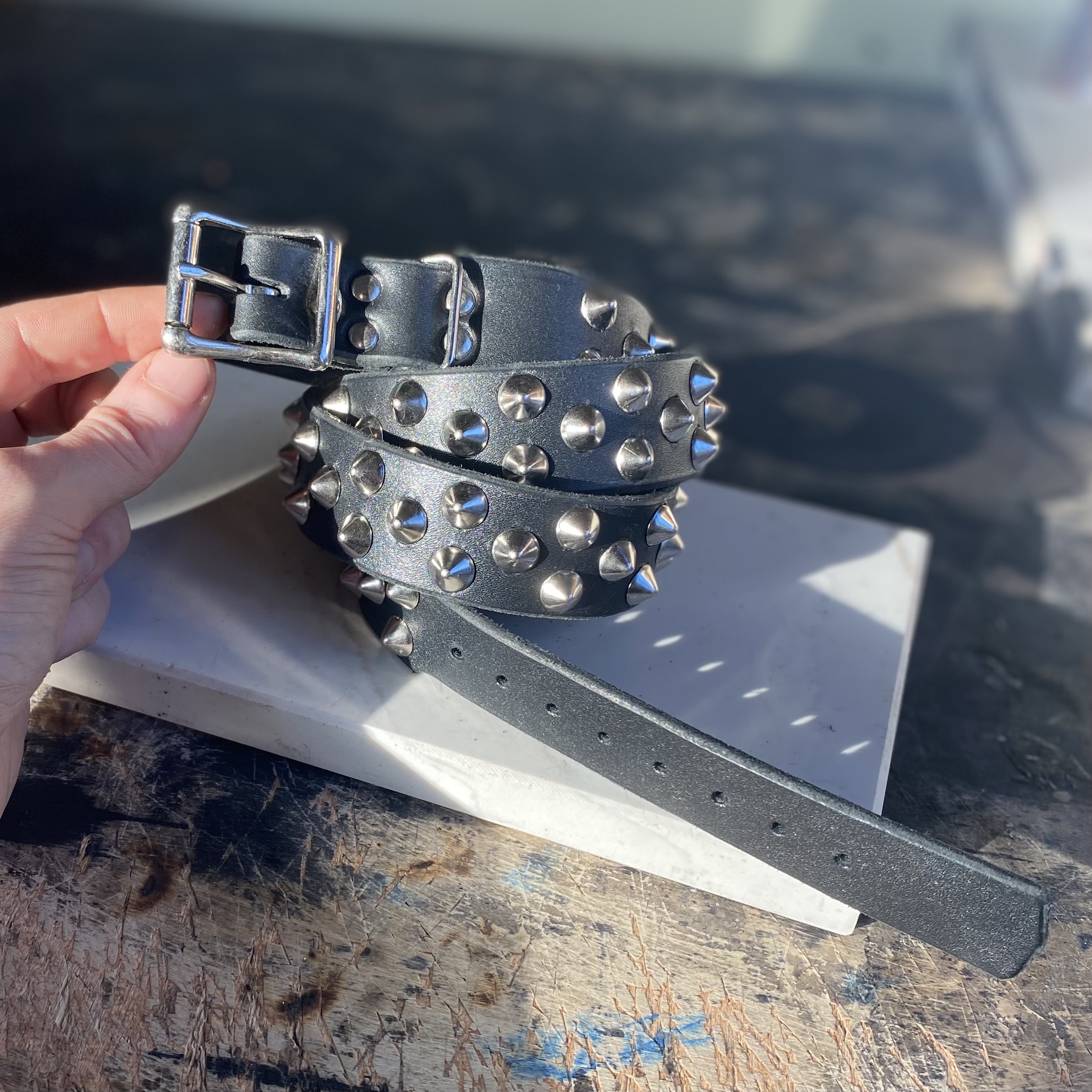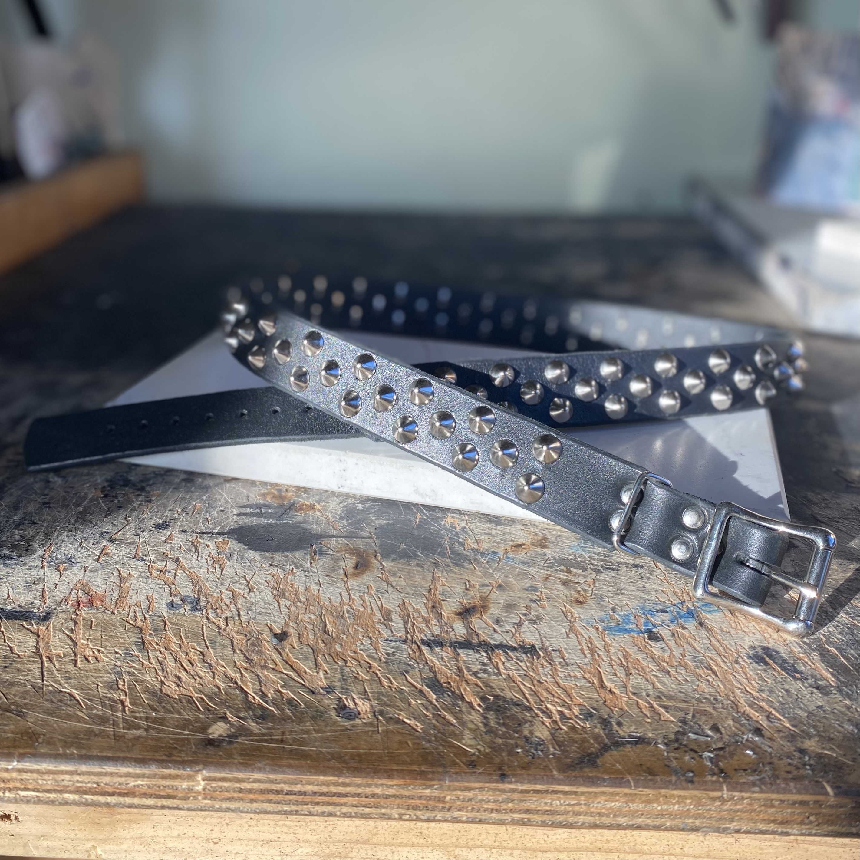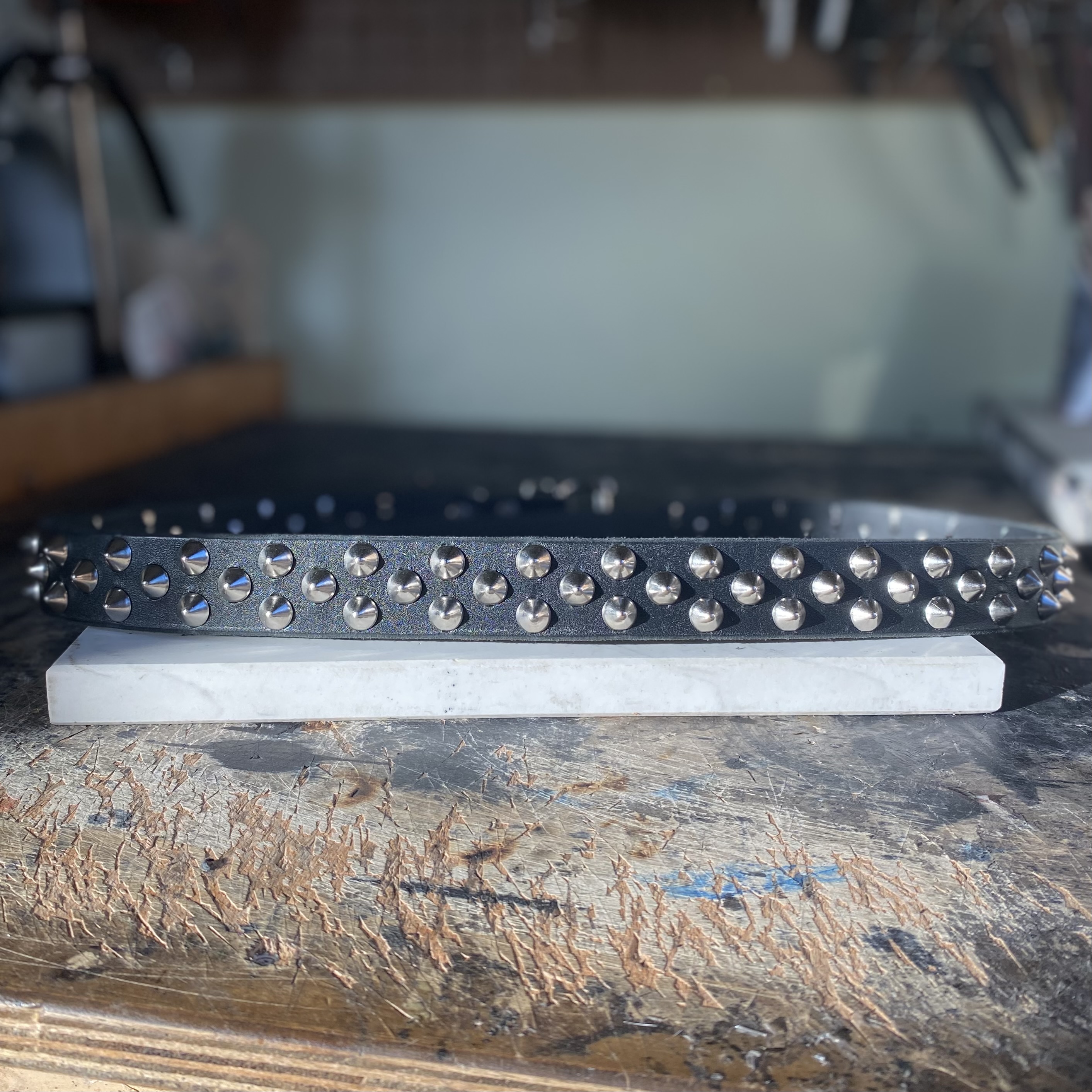 Genuine black leather 1.25” wide tapered down to a 1” buckle & strap, finished with self keeper buckle & 2-1-2 small standard cones.
