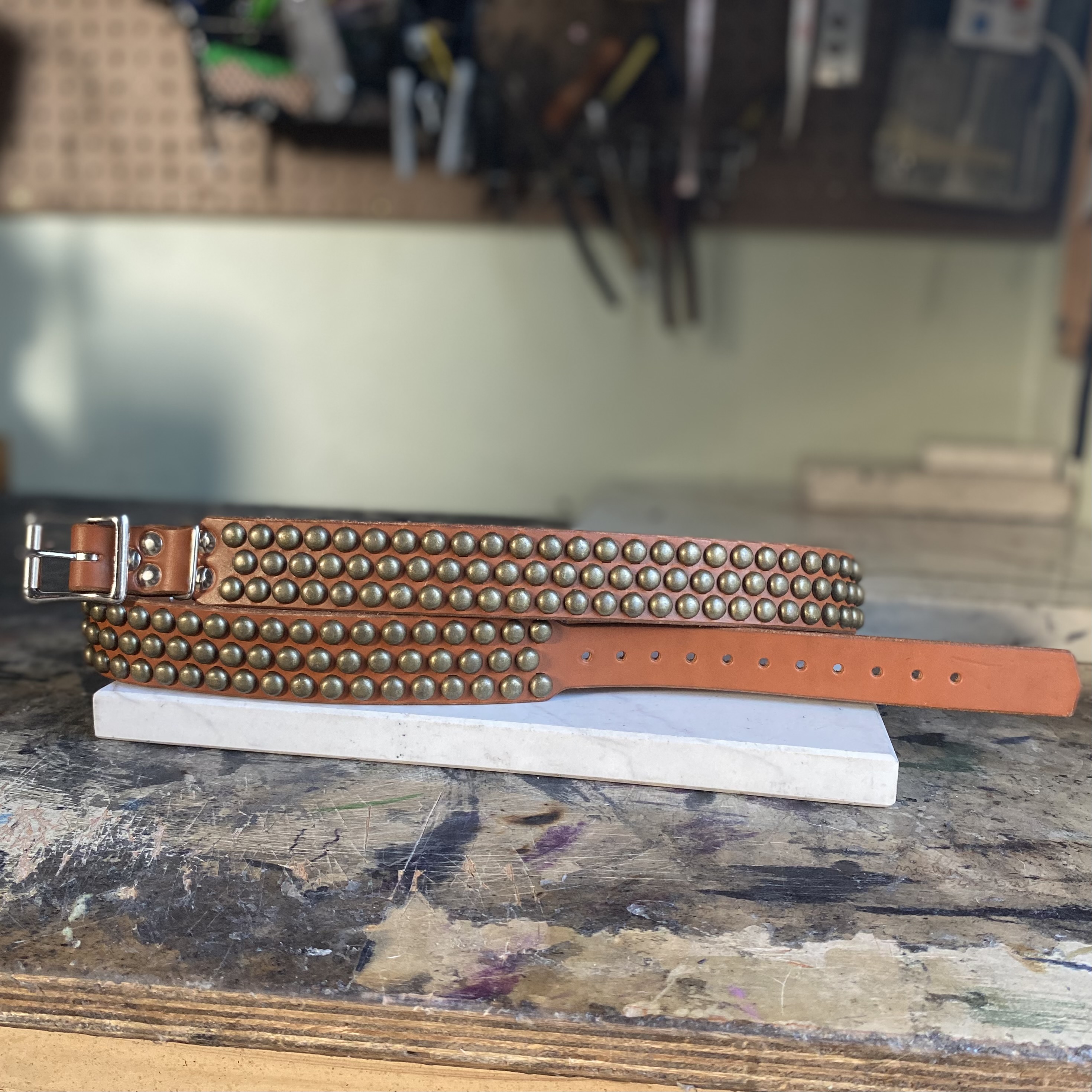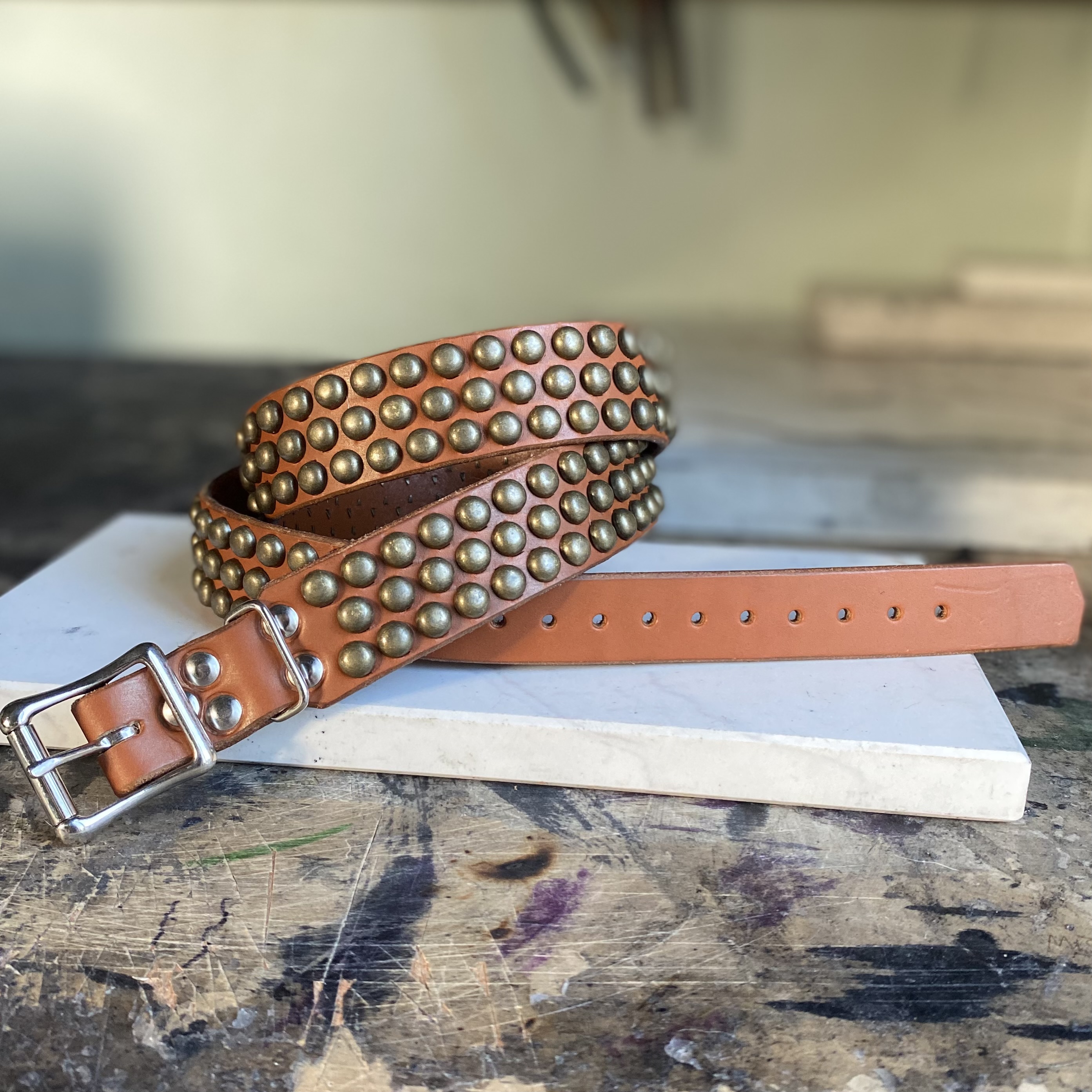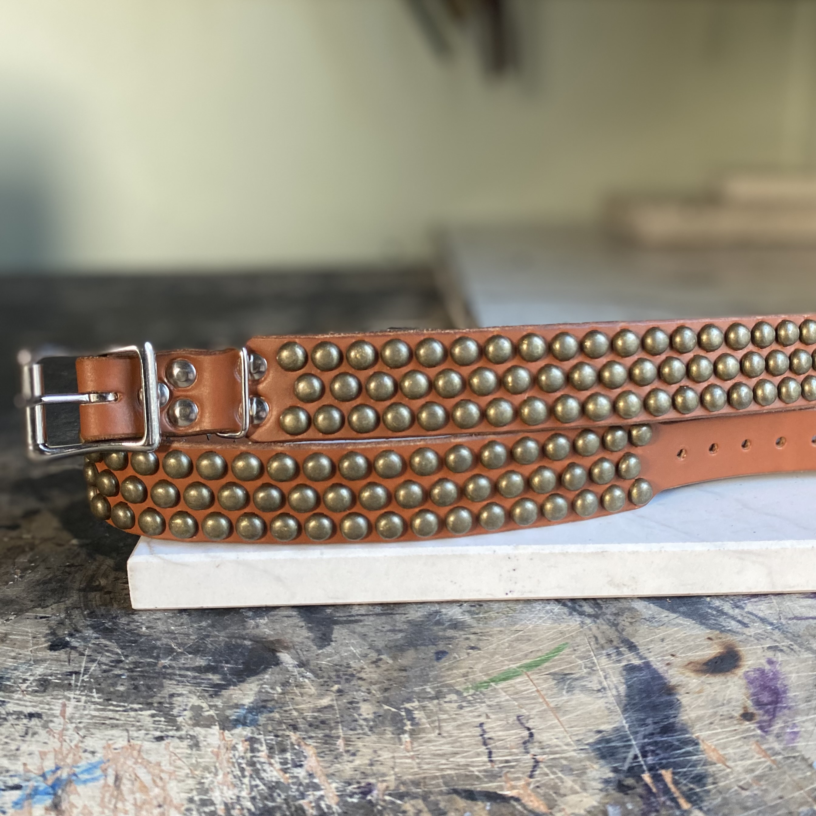 Genuine british tan leather 1 & 3/8” wide tapered down to 1” buckle and strap, finished with self keeper buckle & brass dome studs.