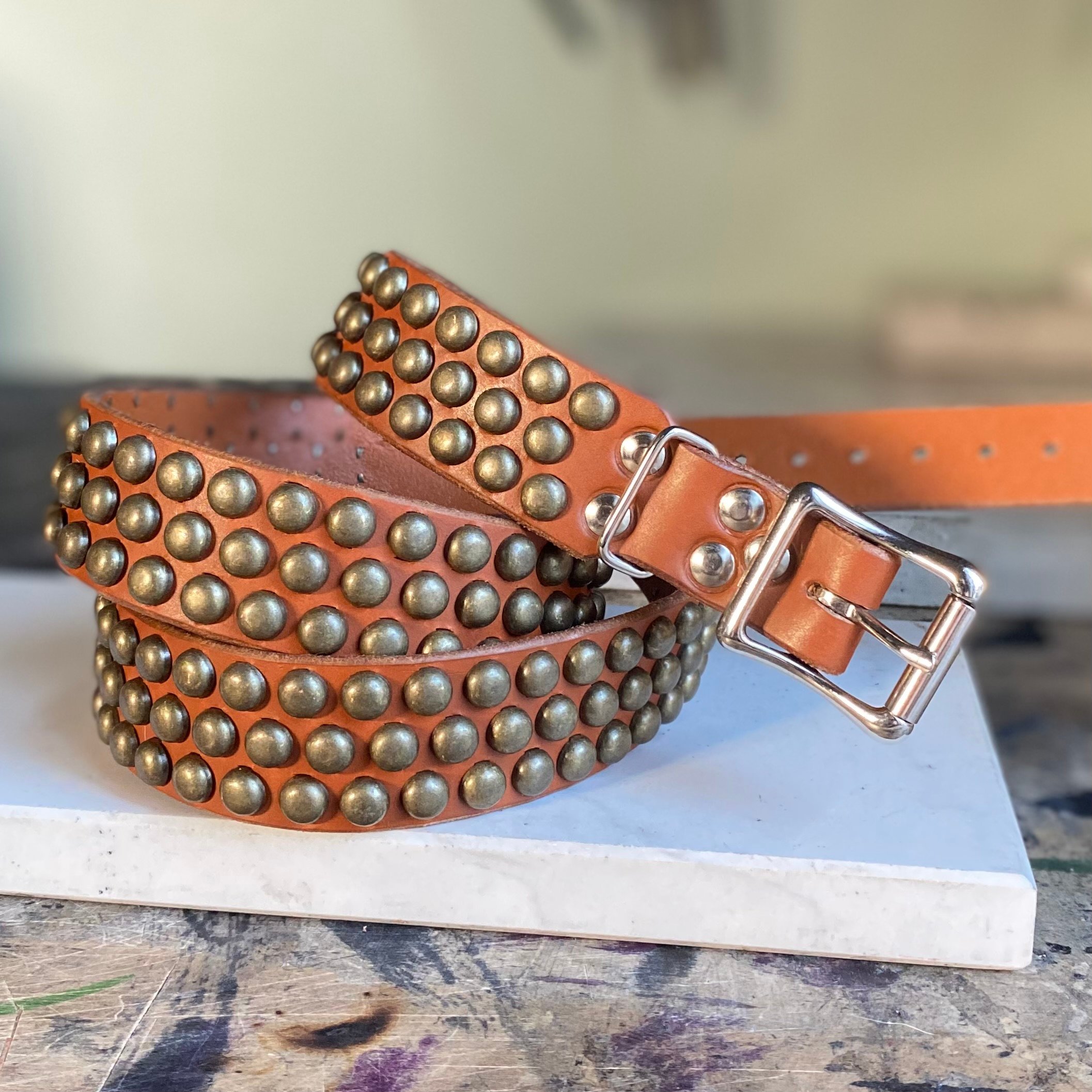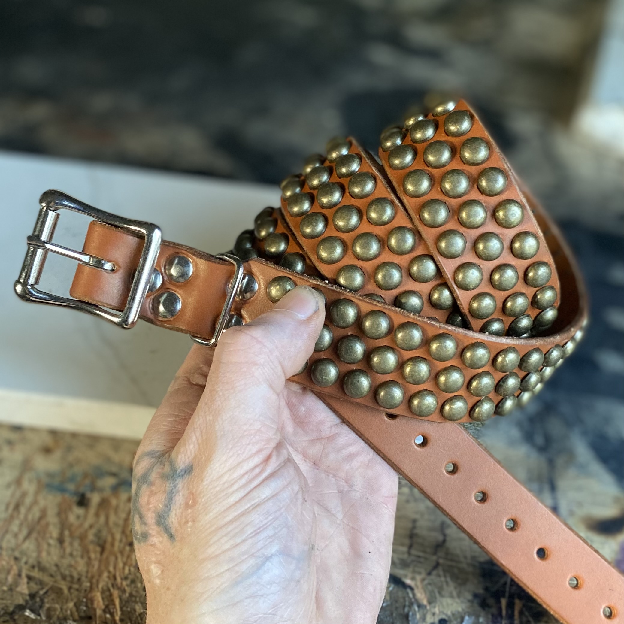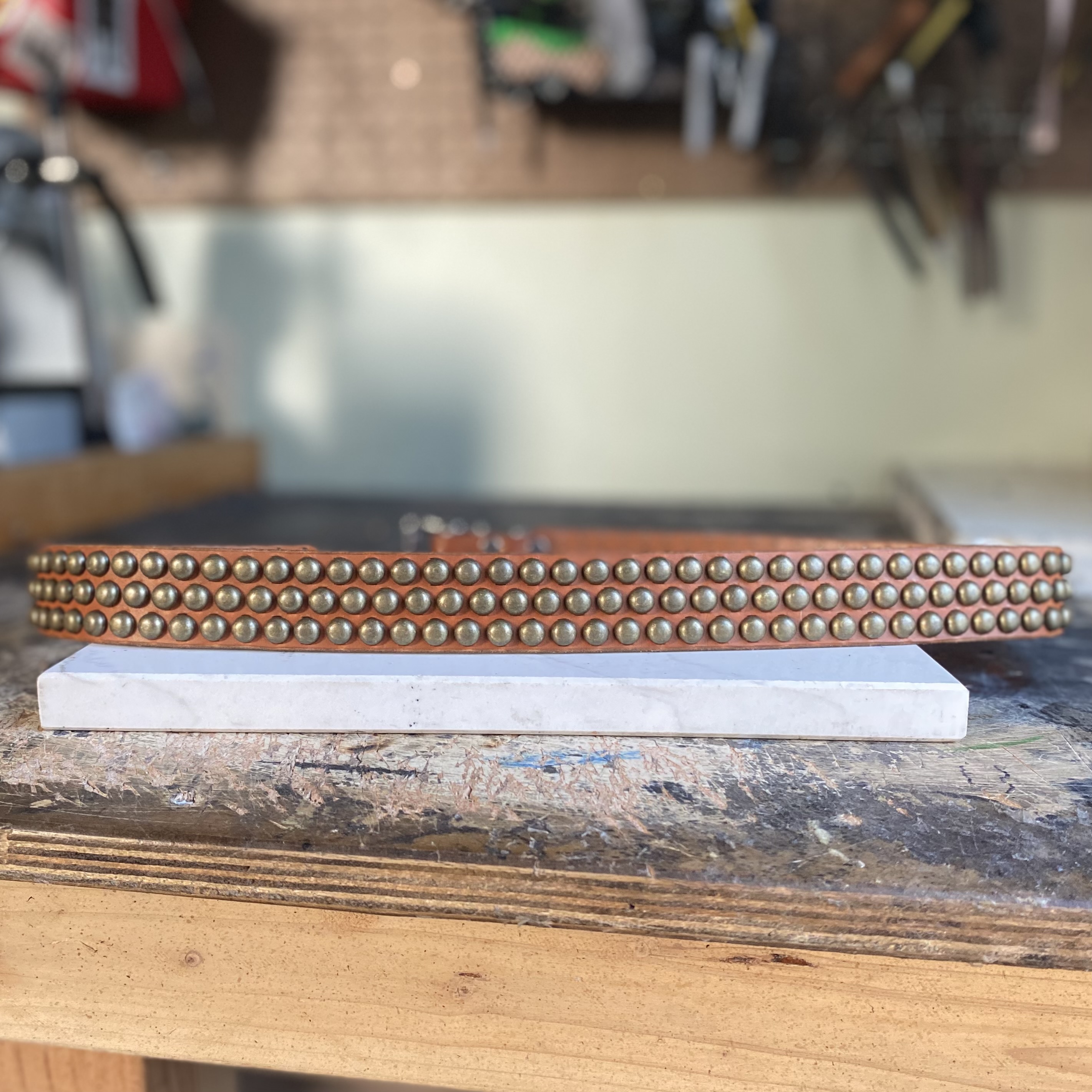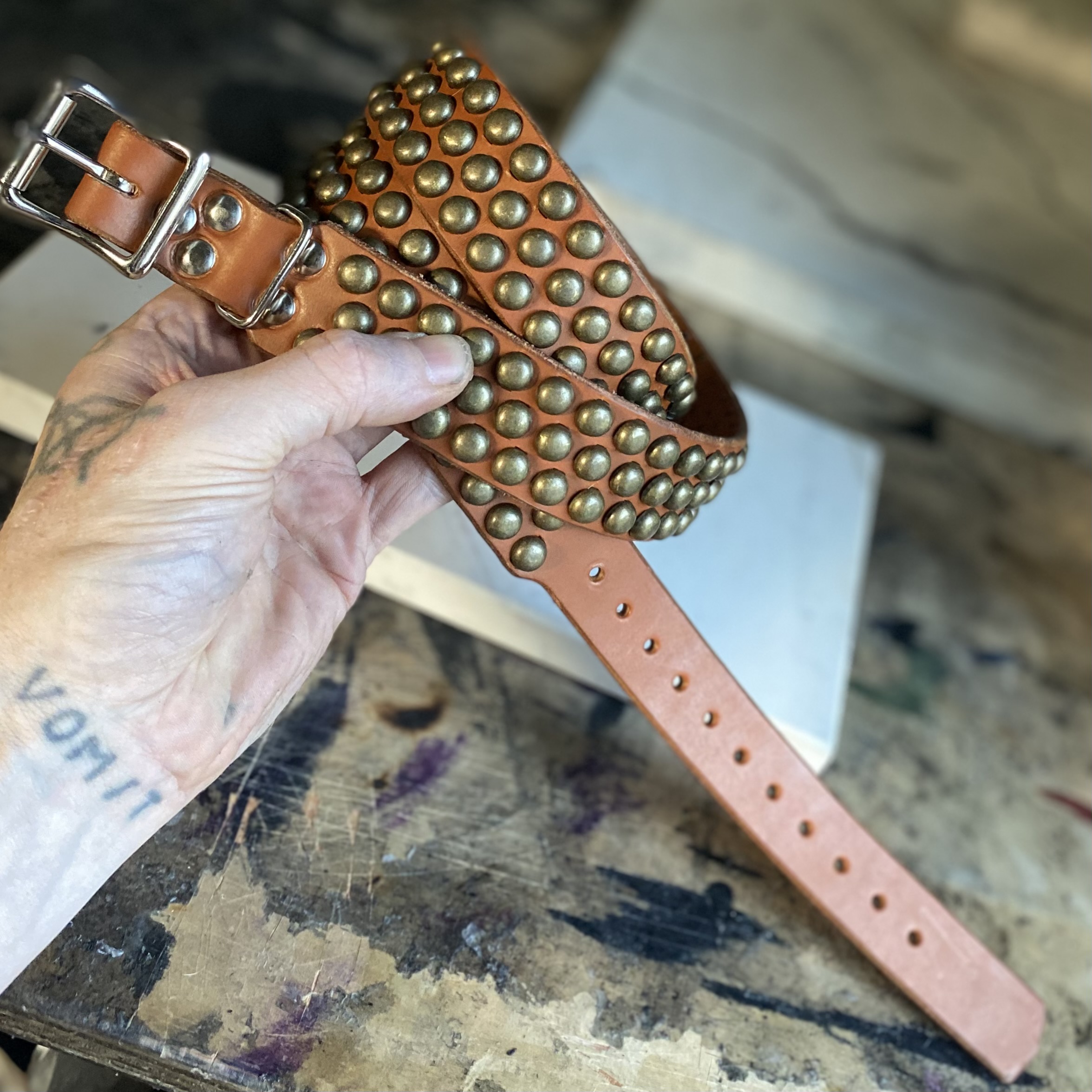 Genuine british tan leather 1 & 3/8” wide tapered down to 1” buckle and strap, finished with self keeper buckle & brass dome studs.