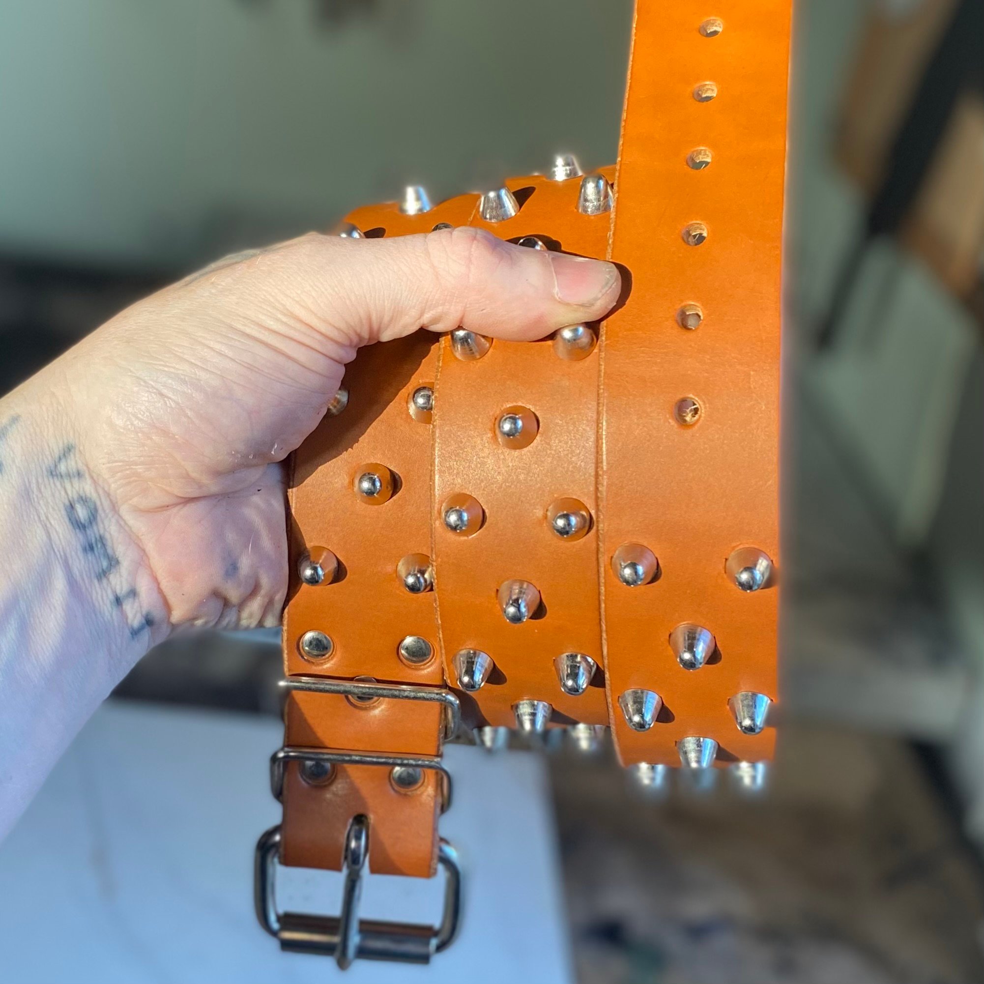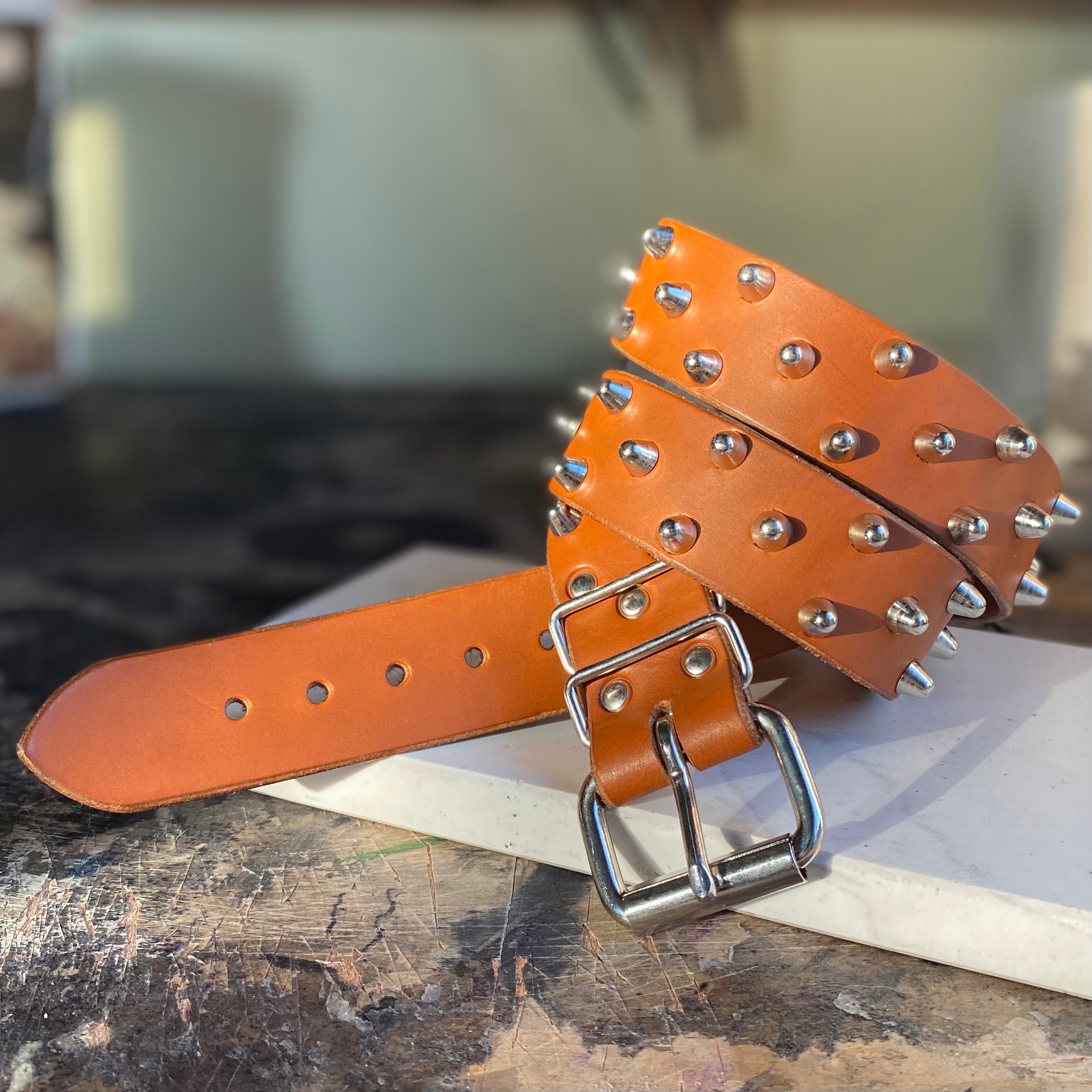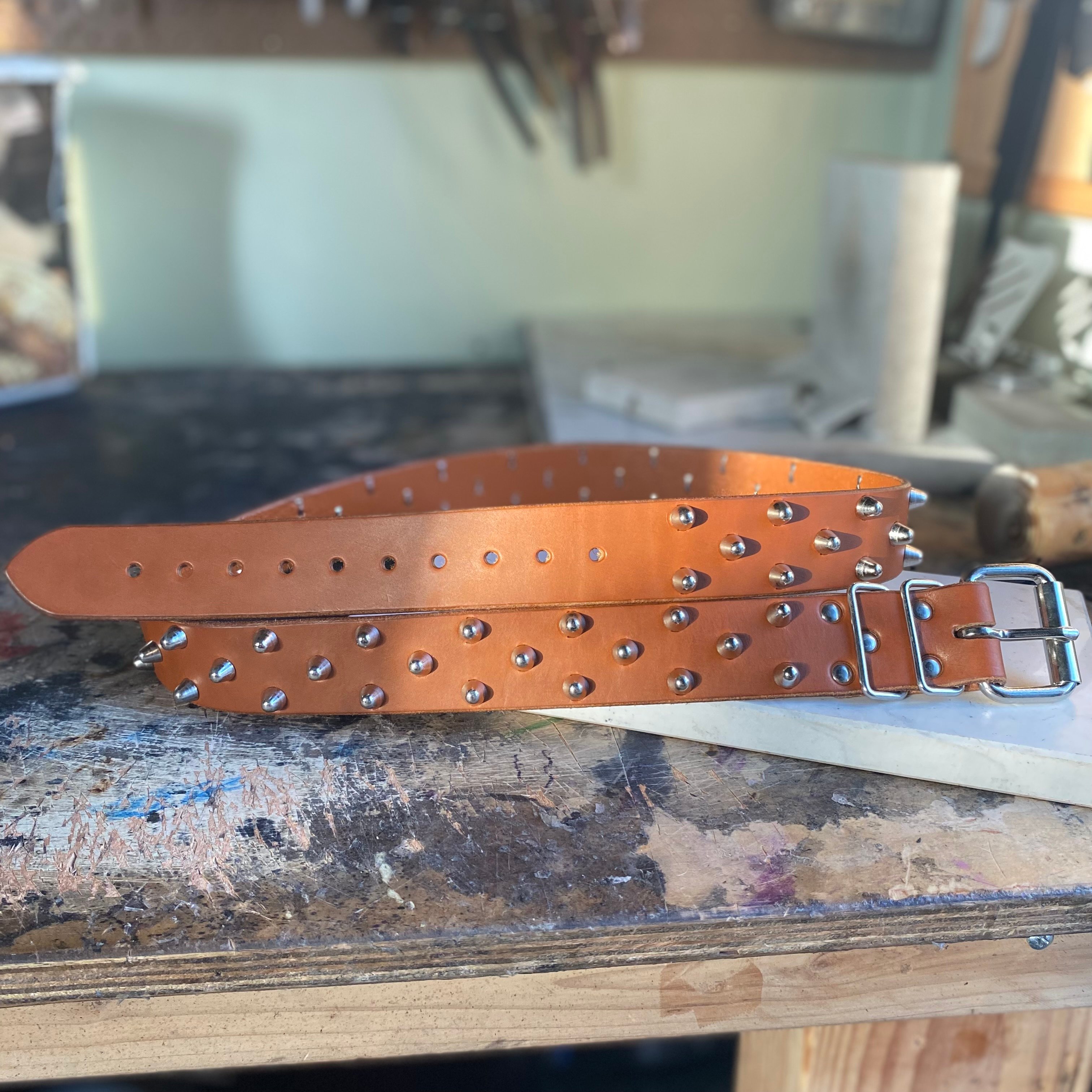 Genuine British tan leather 1.5” wide, finished with roller buckle & short British studs.