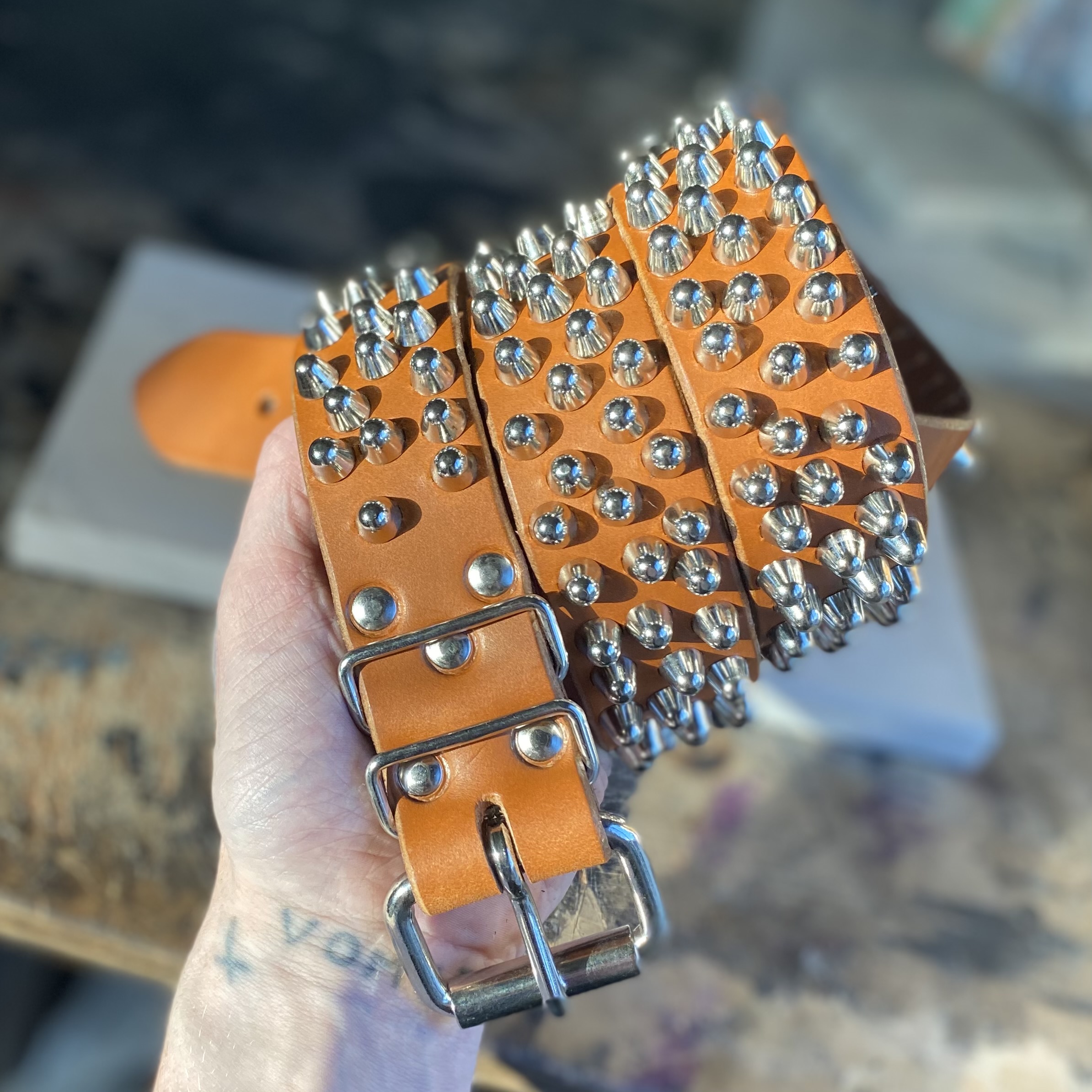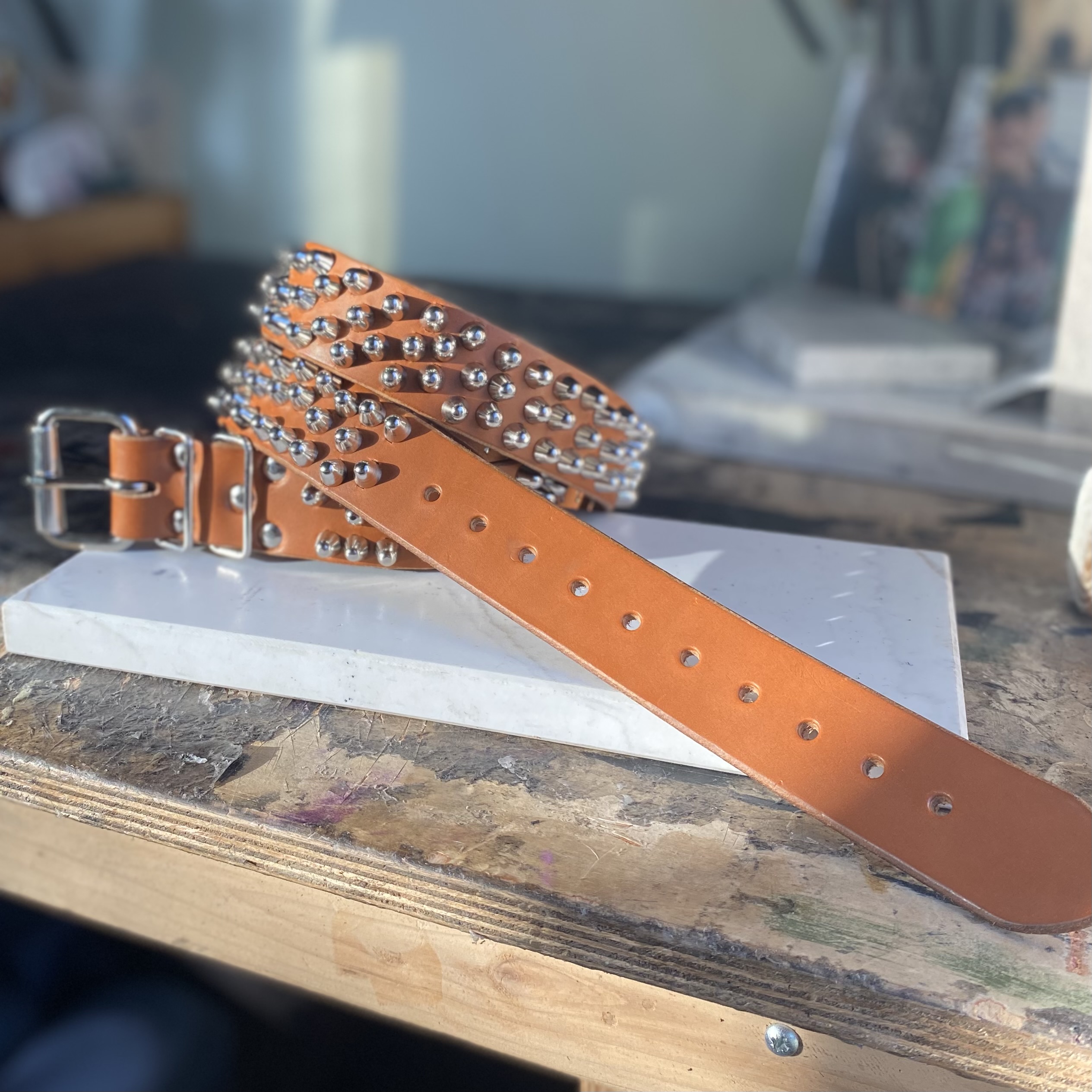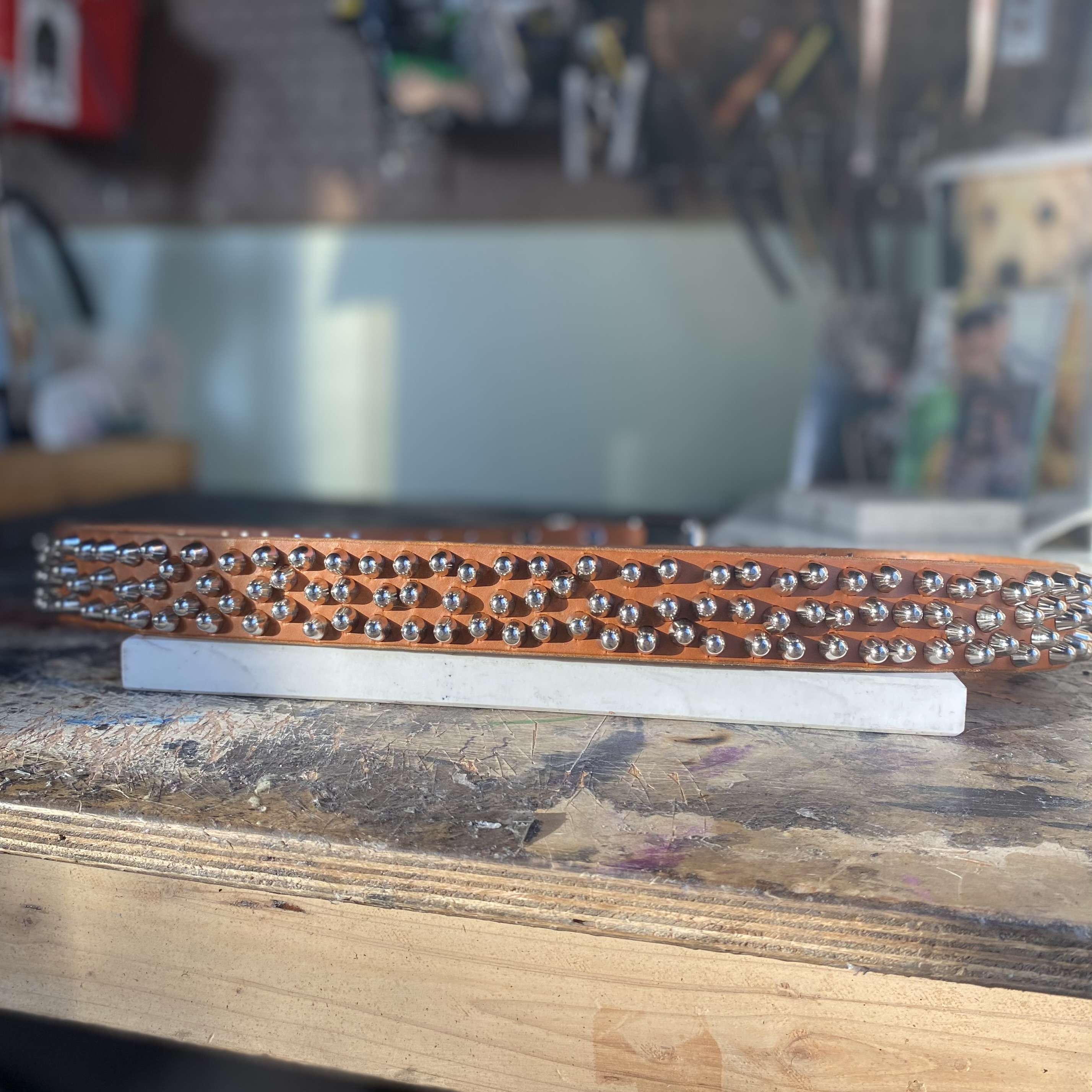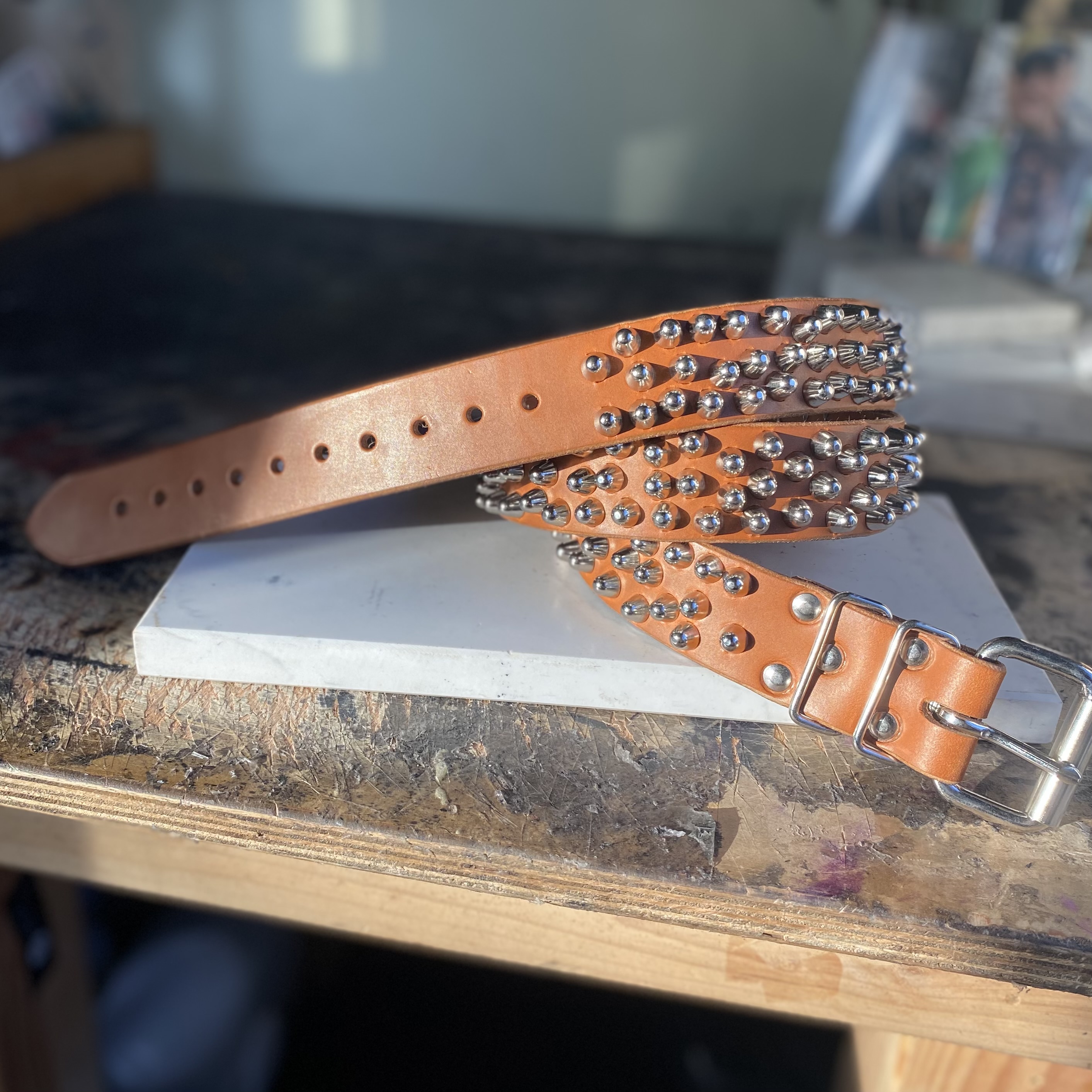 Genuine British tan leather 1.5” wide, finished with roller buckle & short British studs.