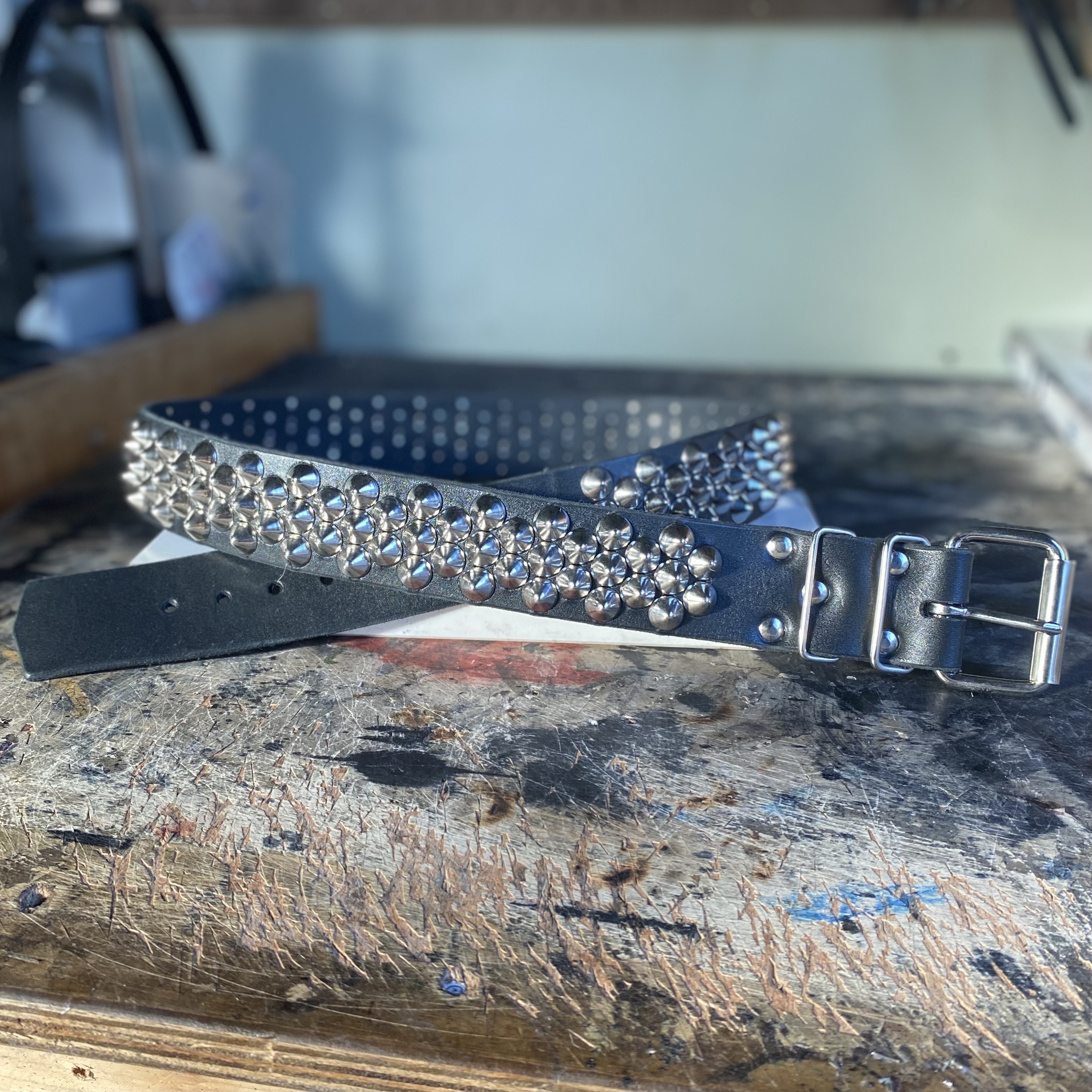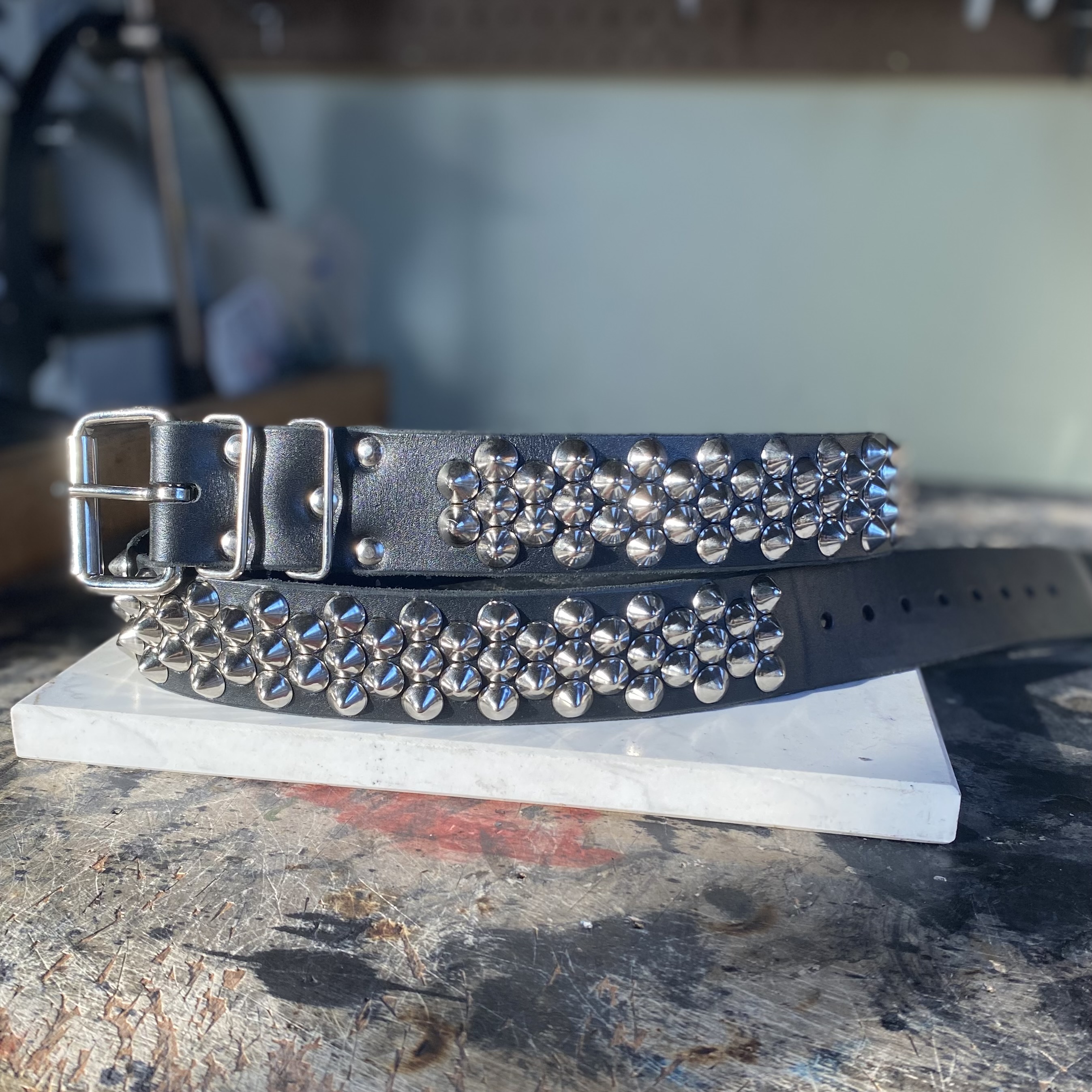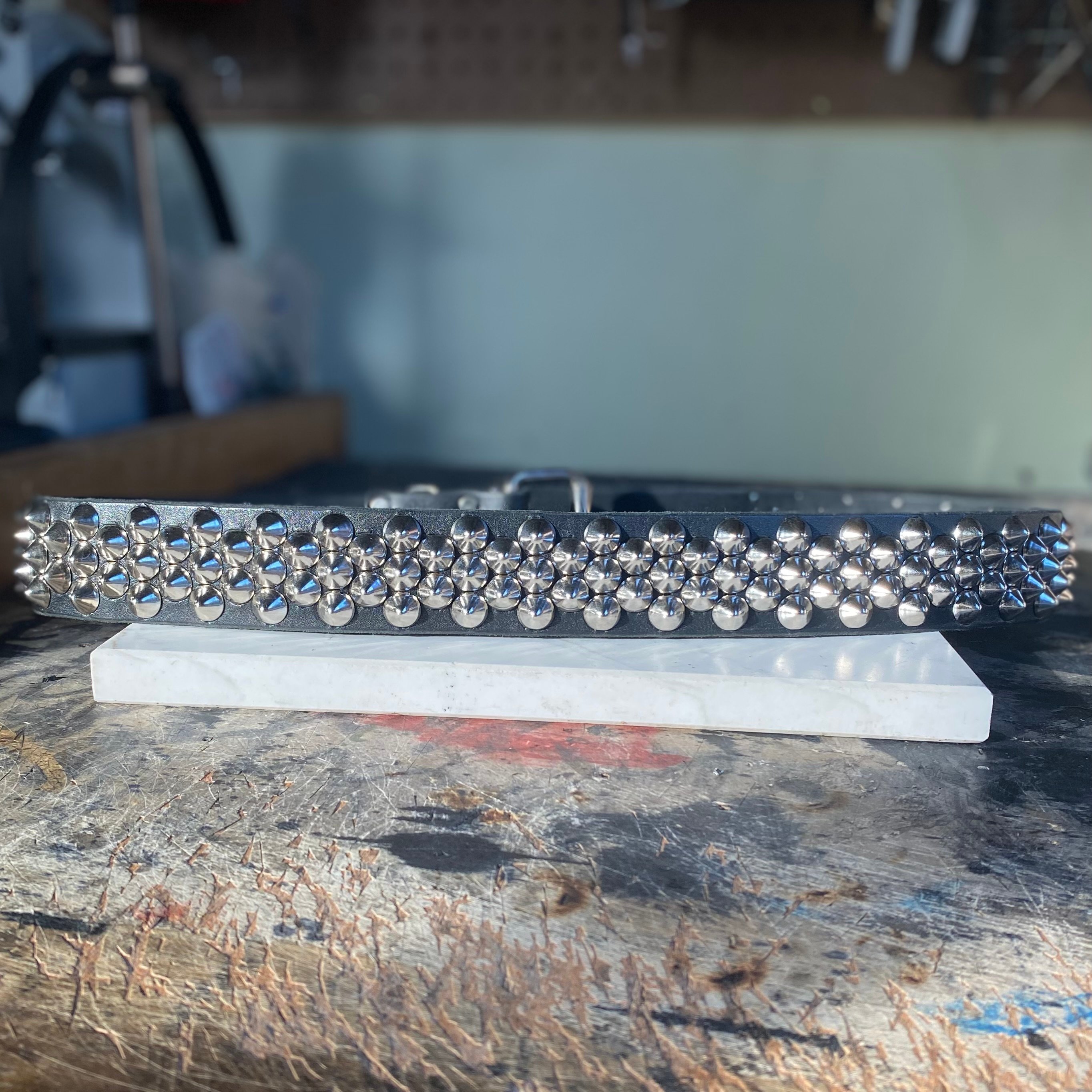 Genuine black leather 1.75” wide, finished with roller buckle & standard cones.
