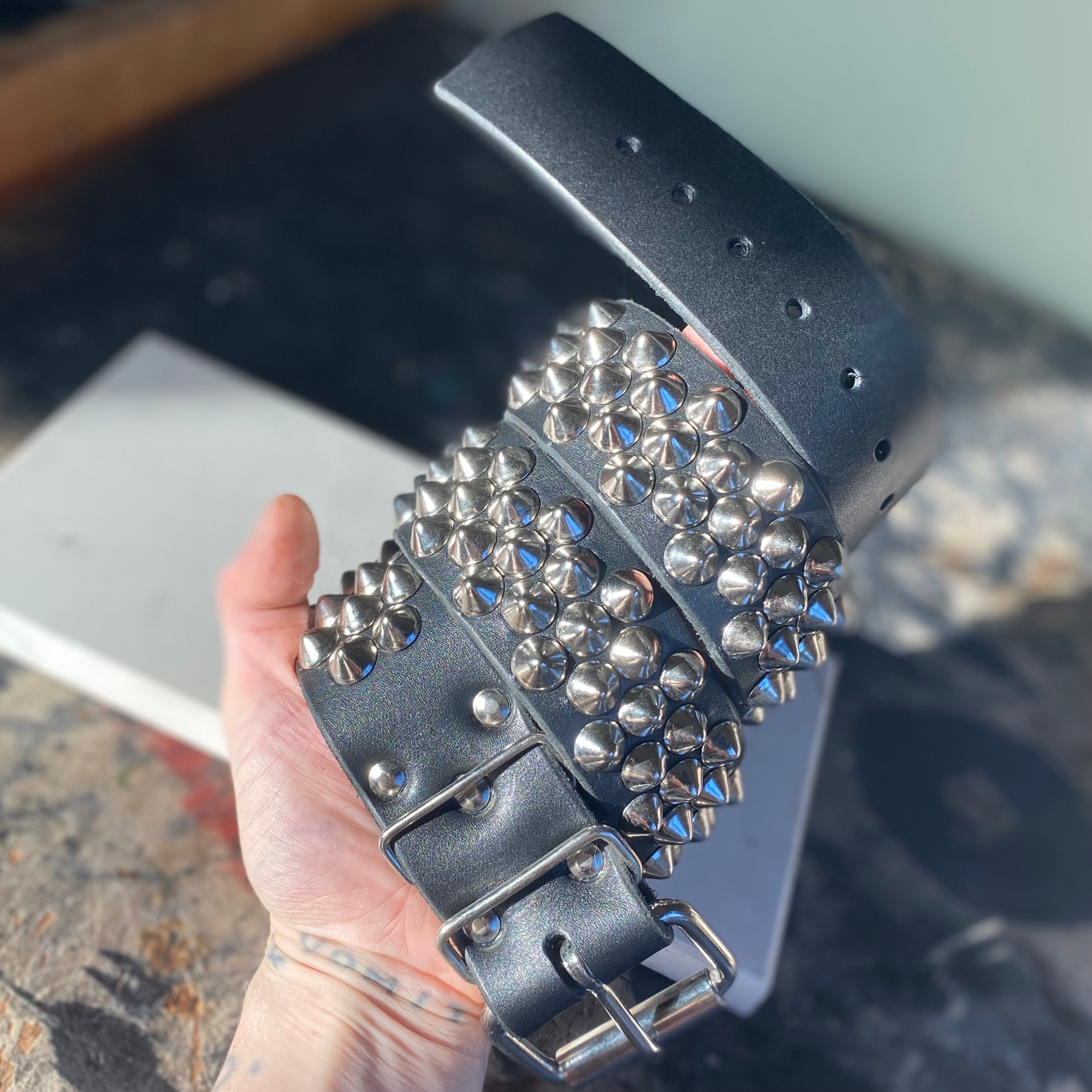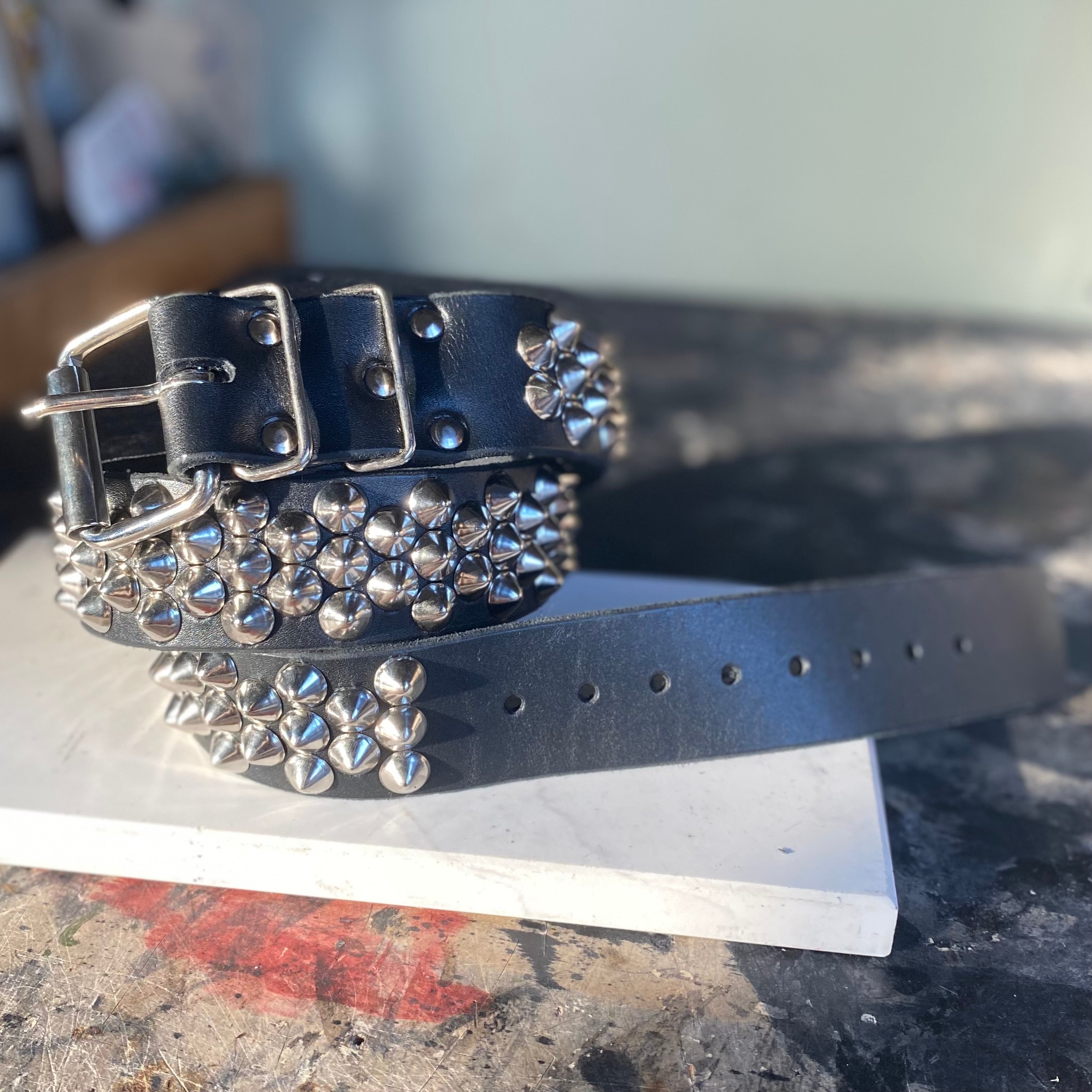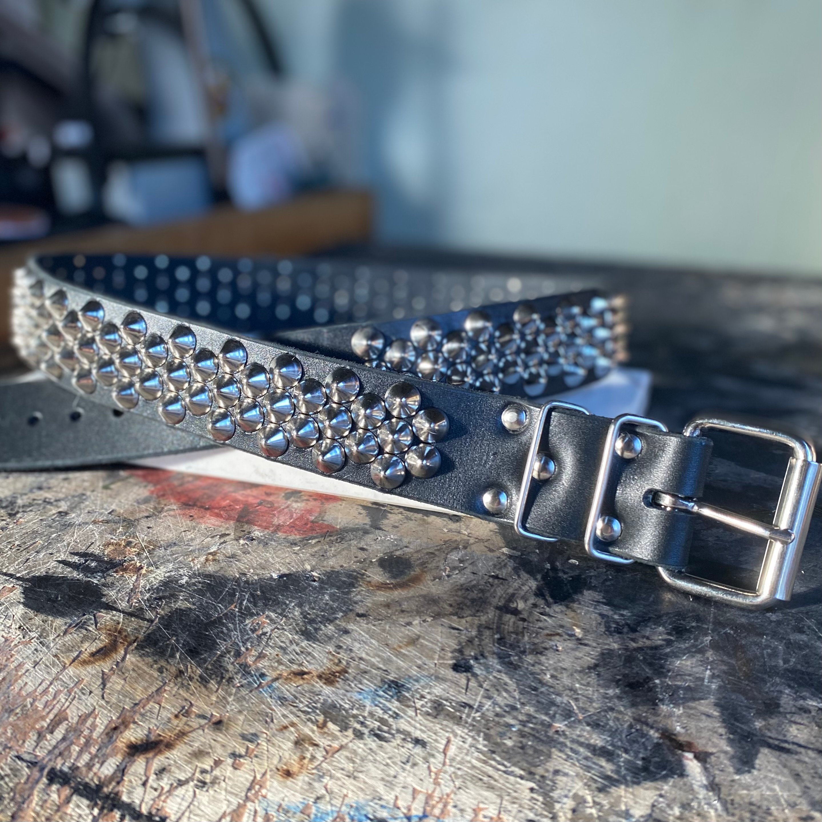 Genuine black leather 1.75” wide, finished with roller buckle & standard cones.