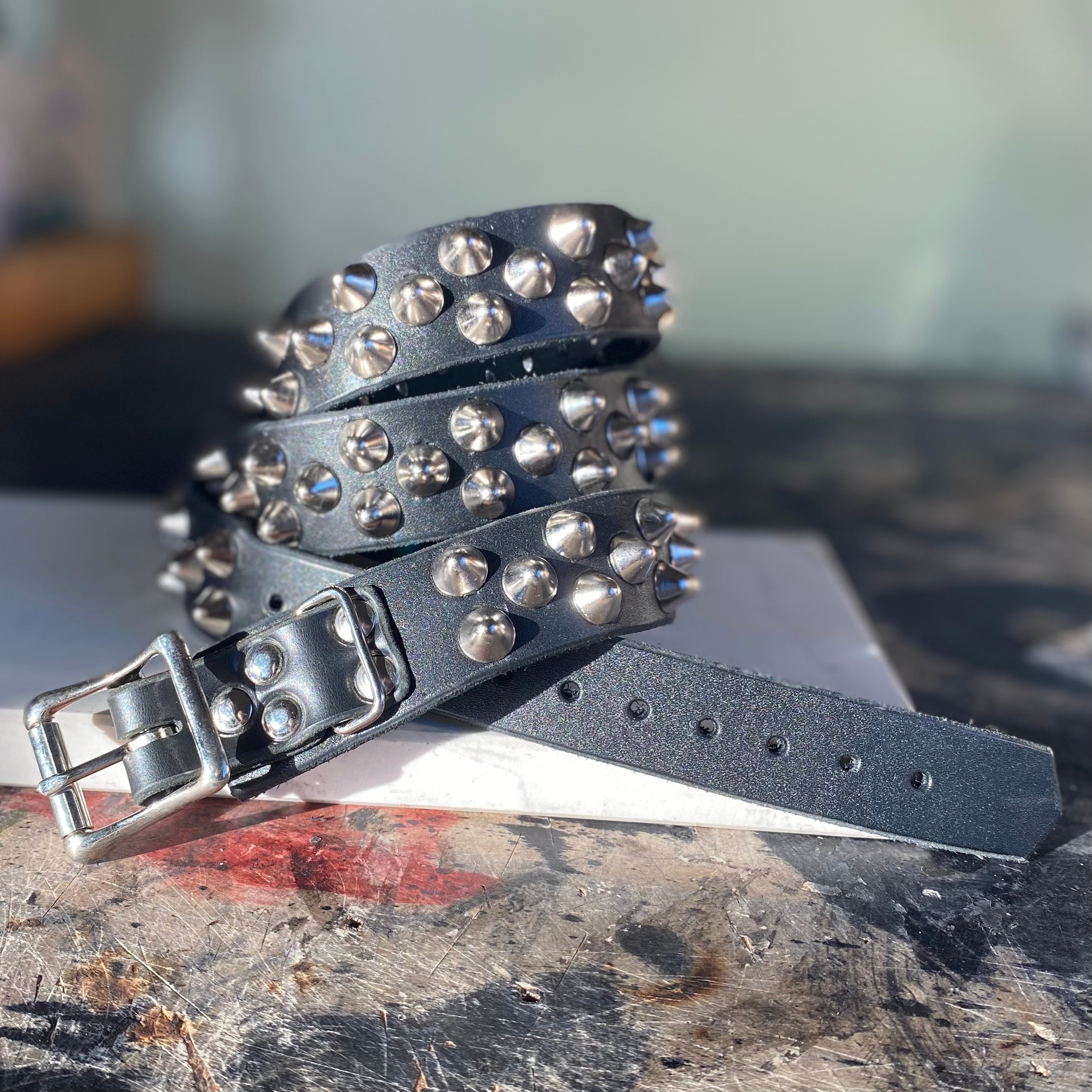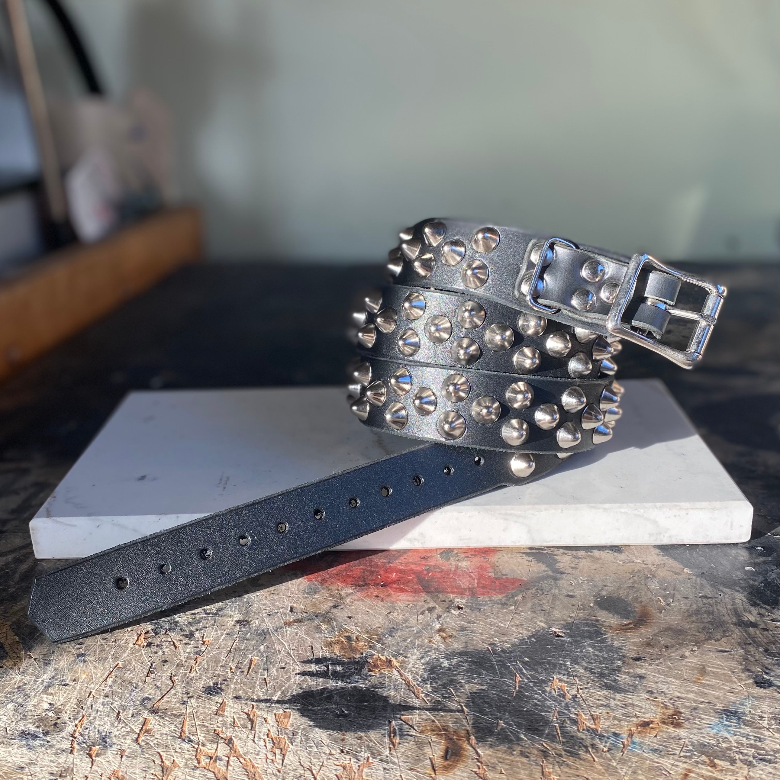 Genuine black leather 1 & 3/8” wide tapered down to a 1” buckle & strap, finished with self keeper buckle & 2-1-2 standard British cones.