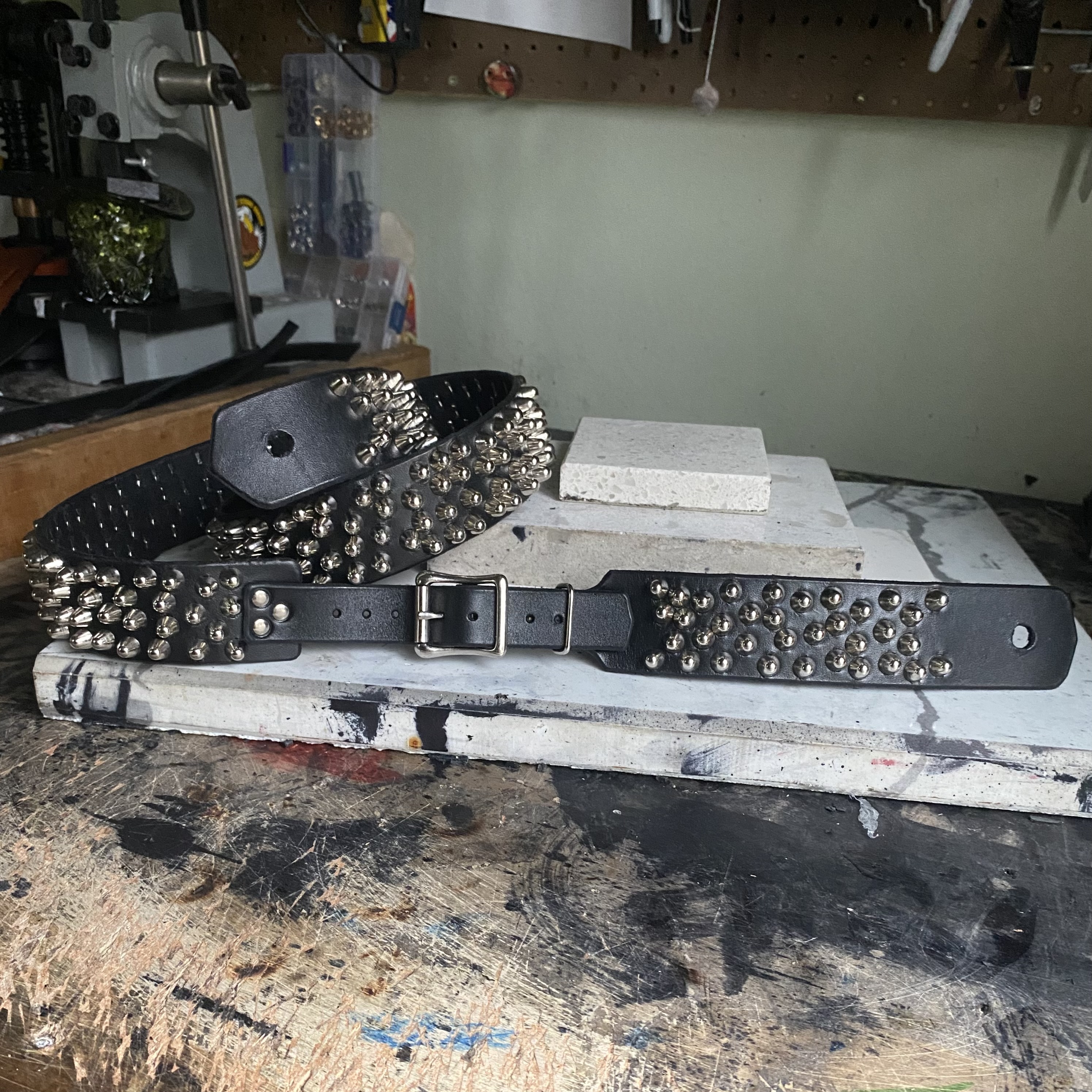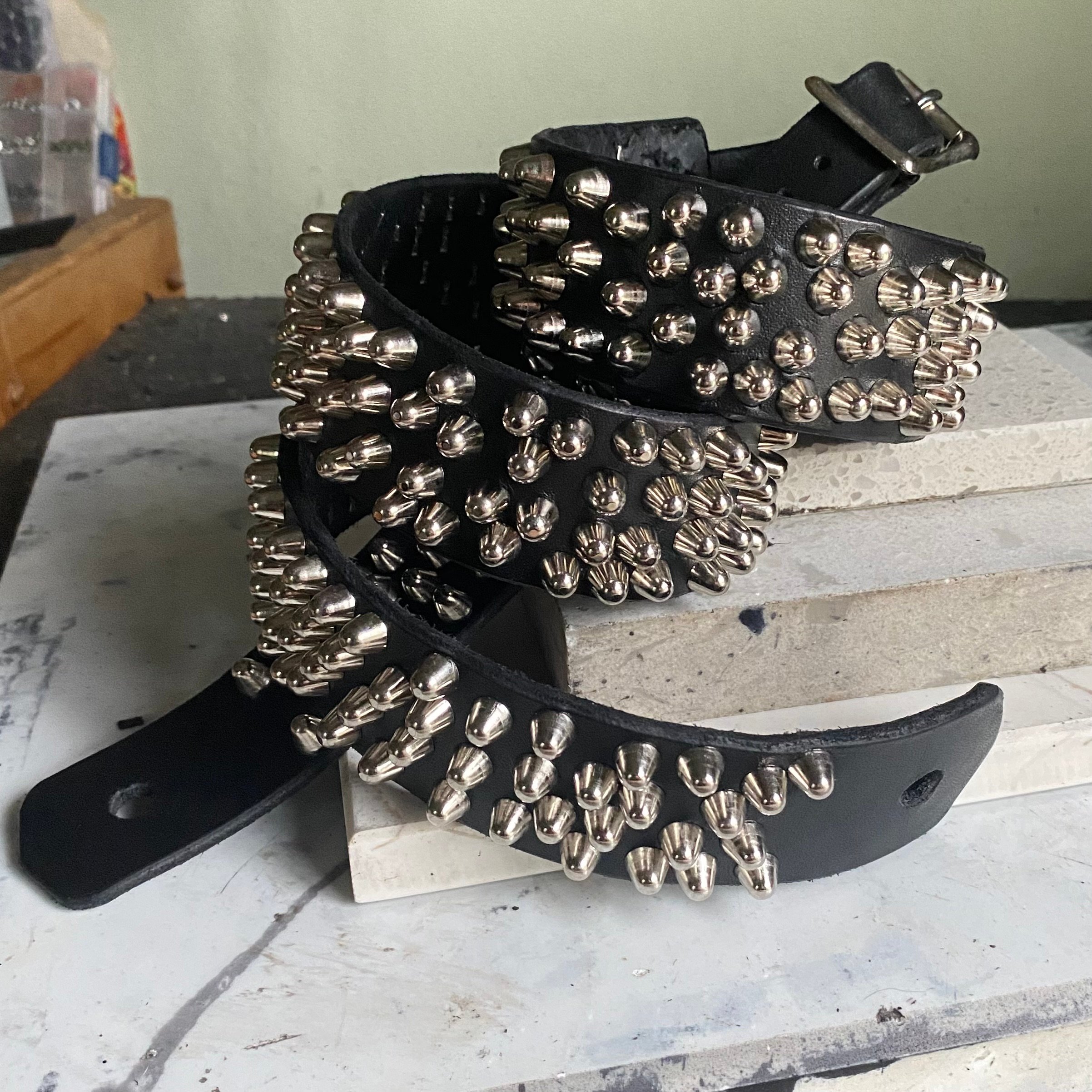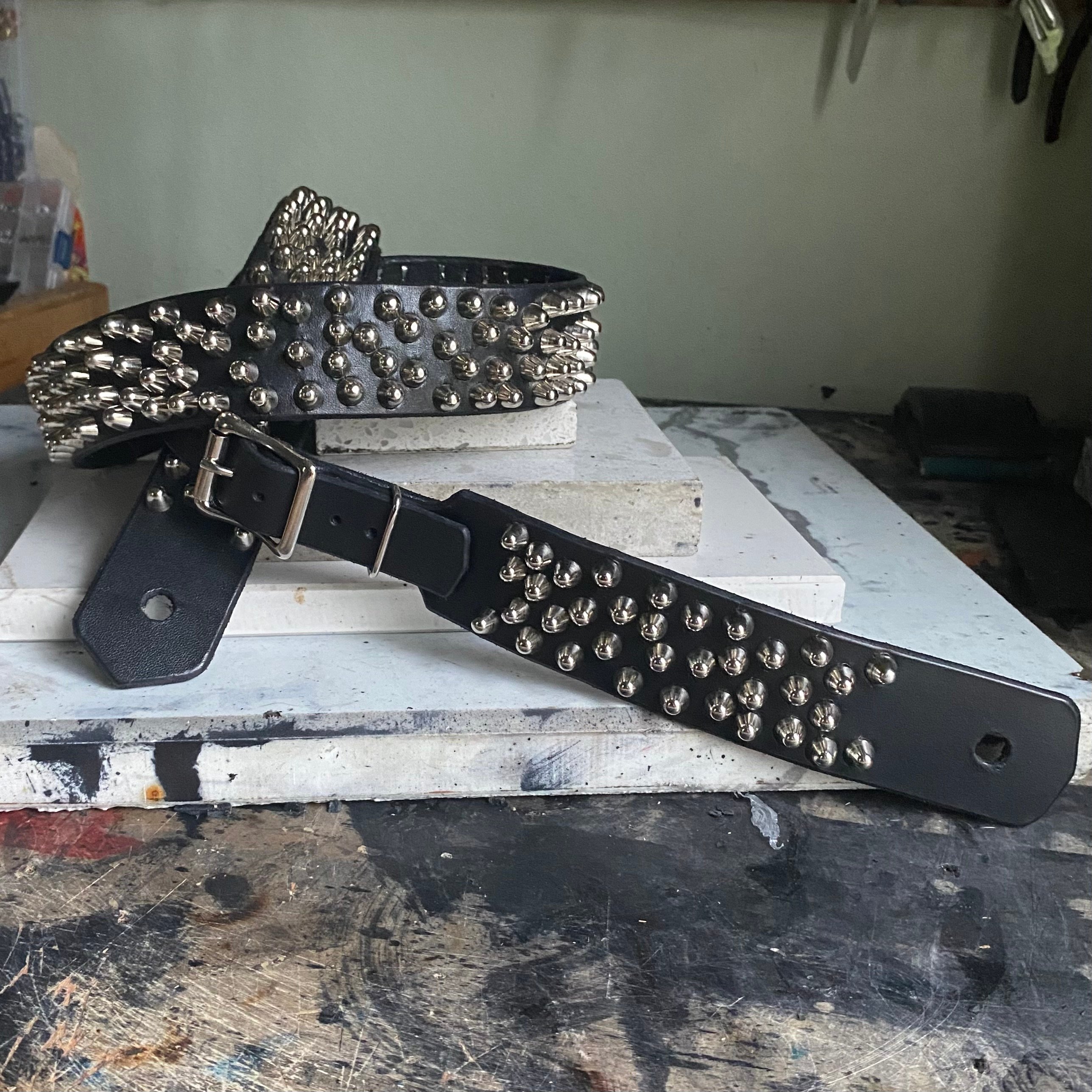 Genuine black leather 1.75” wide guitar strap, short British studs and buckle/strap for adjustment