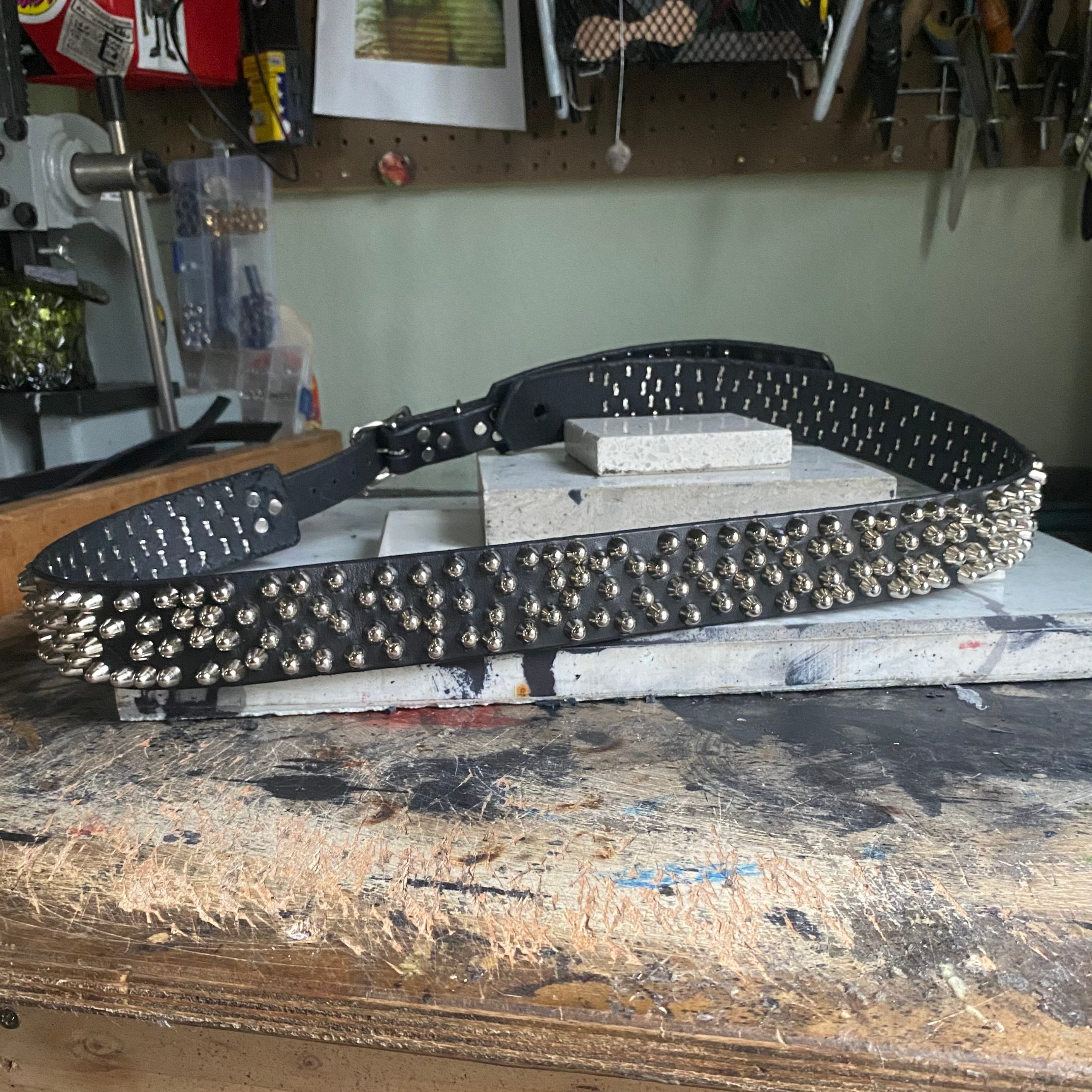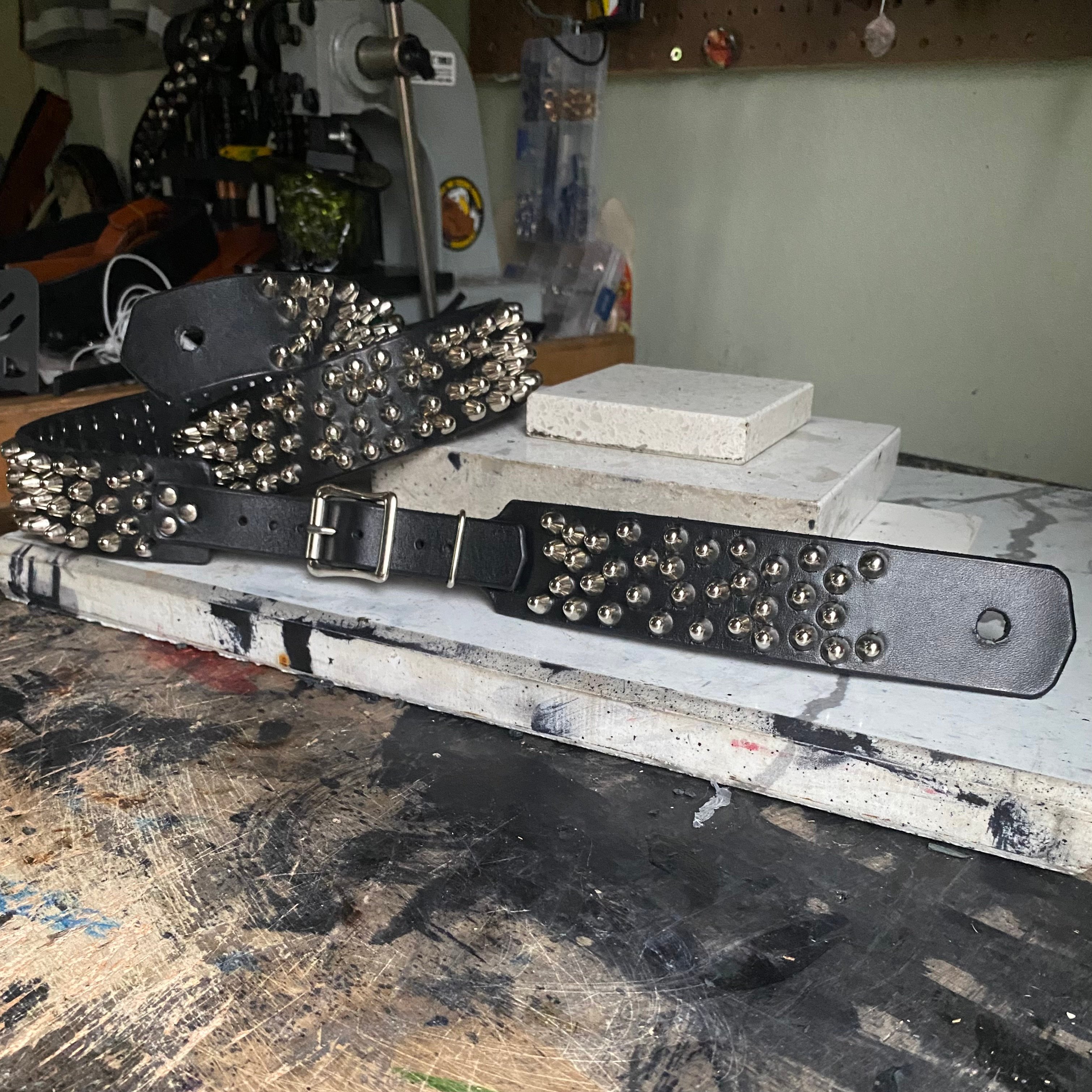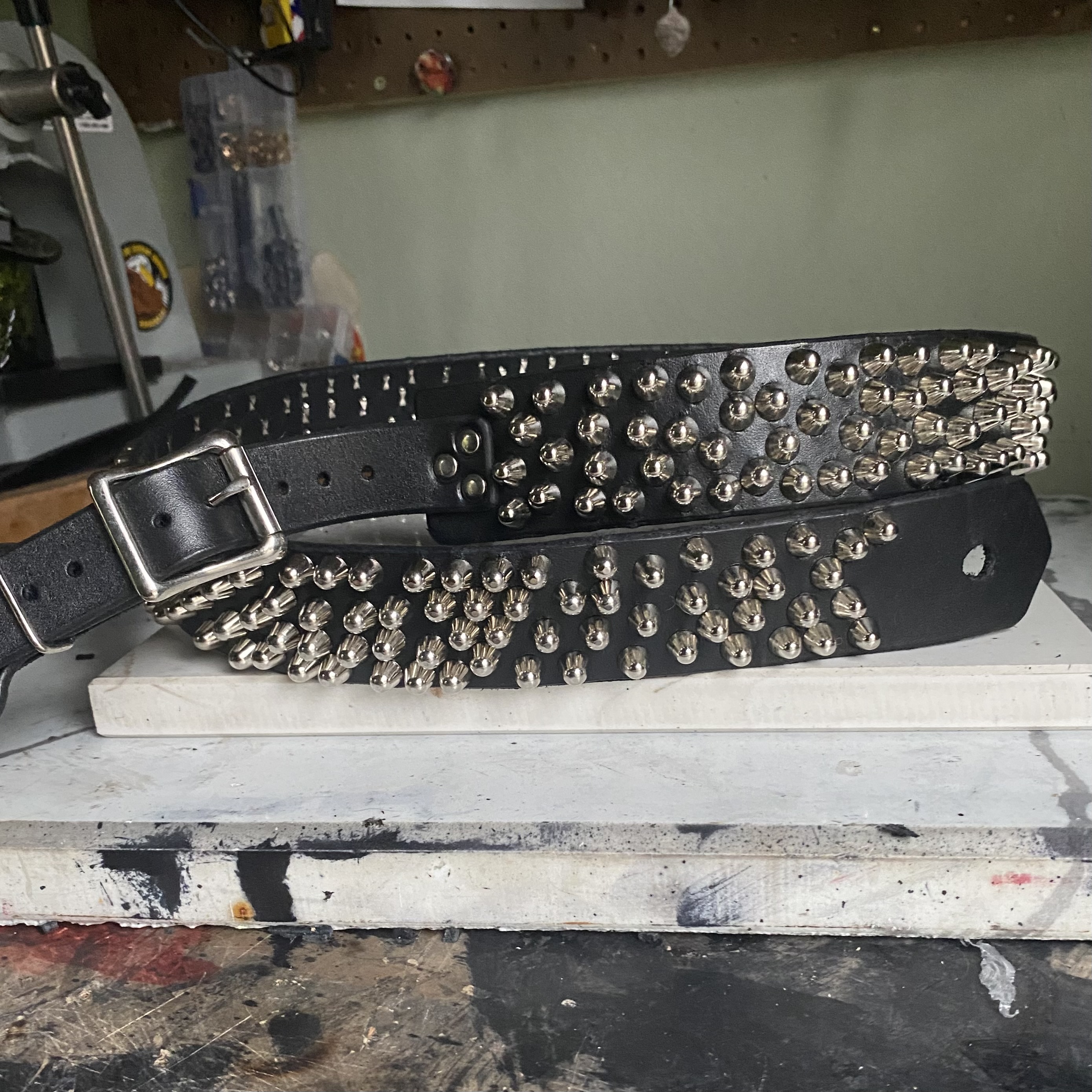 Genuine black leather 1.75” wide guitar strap, short British studs and buckle/strap for adjustment