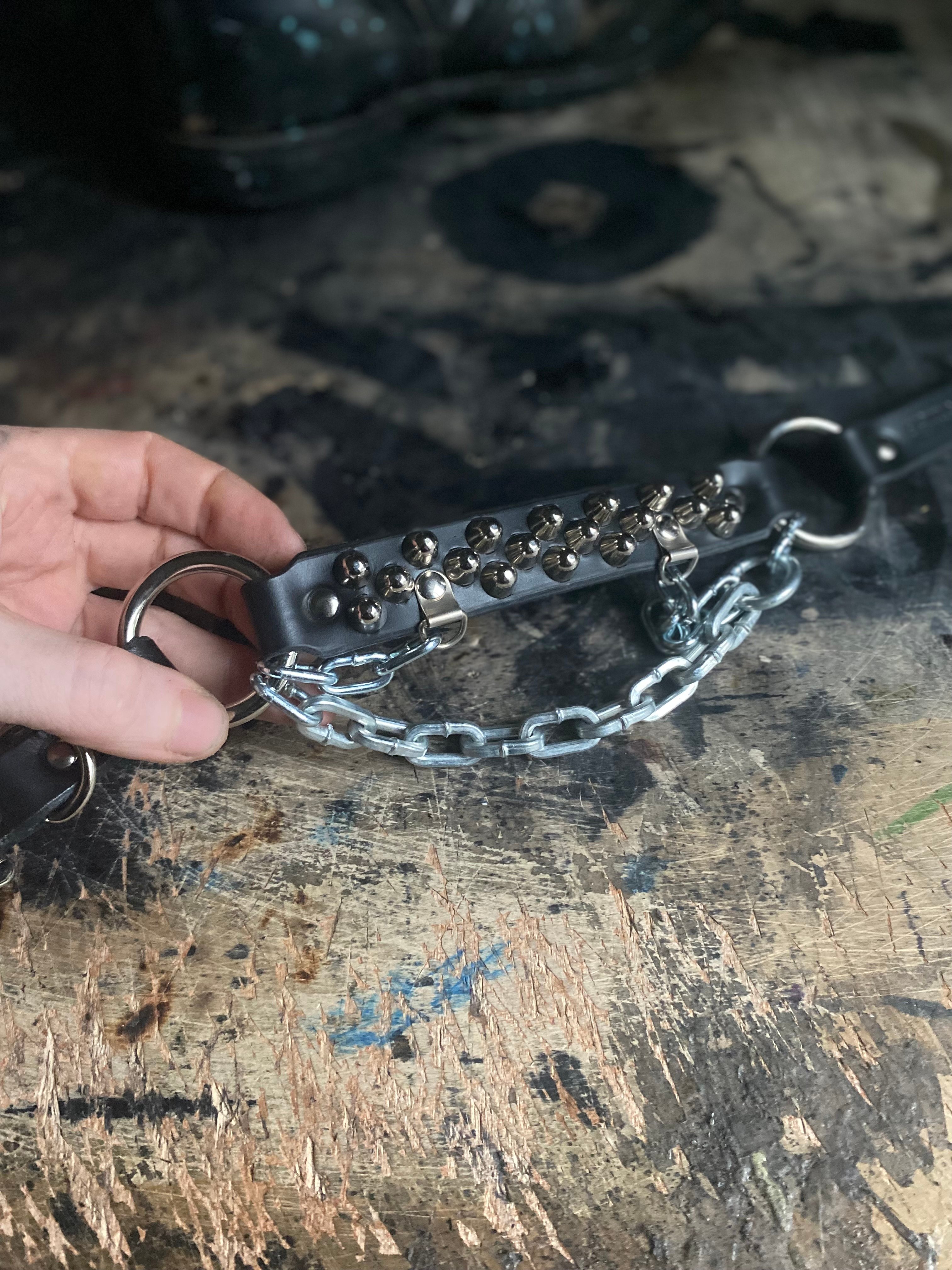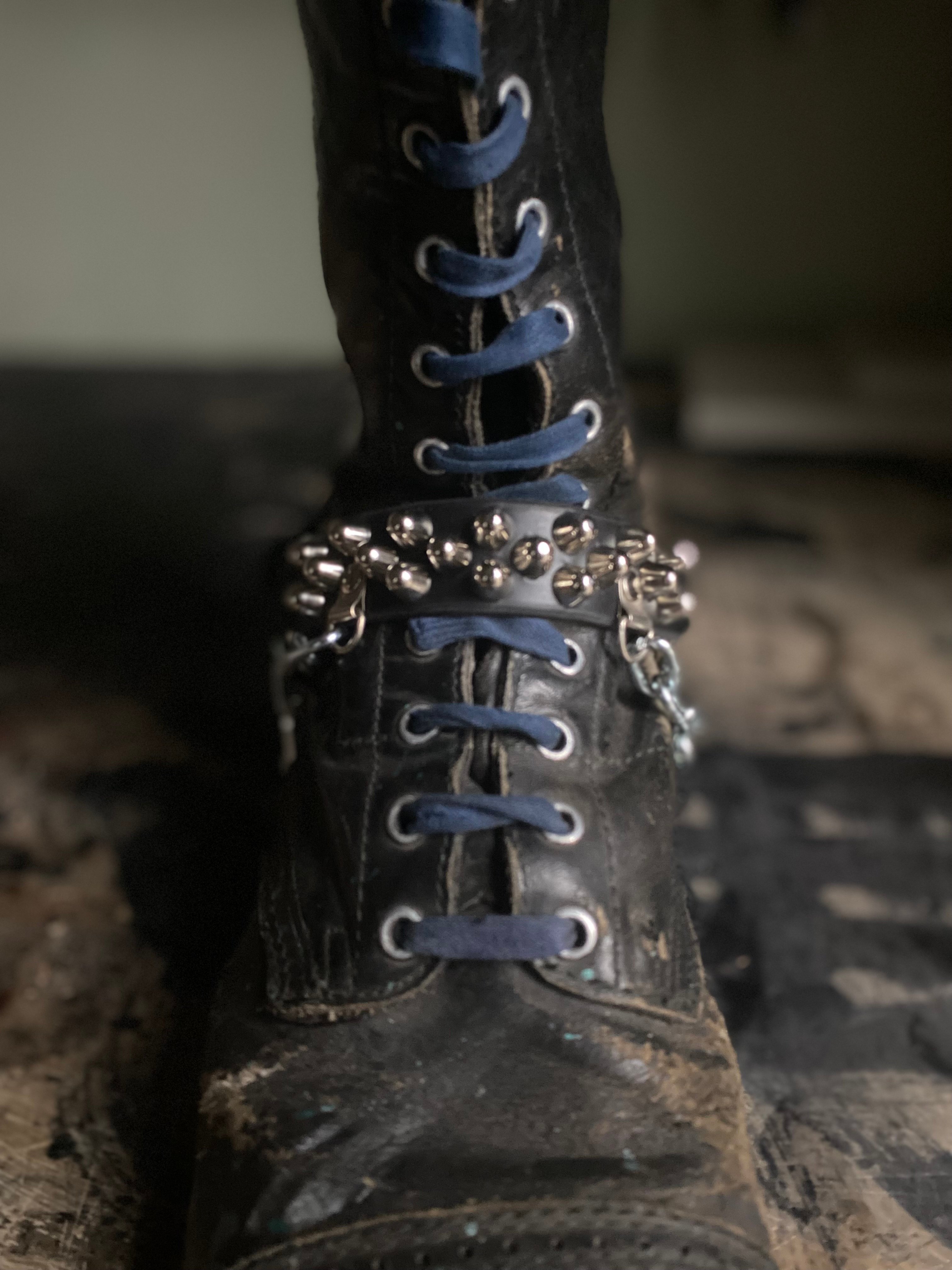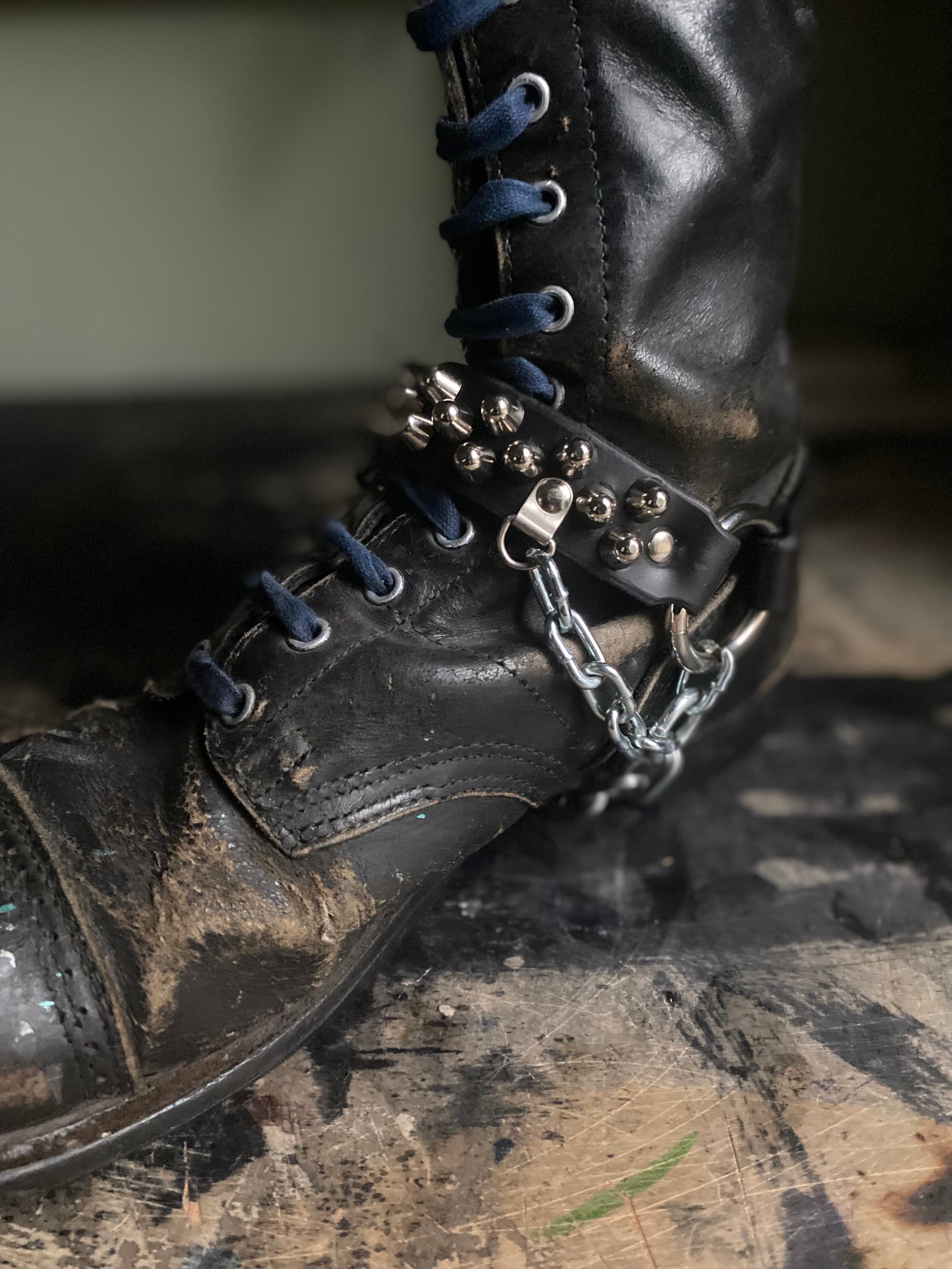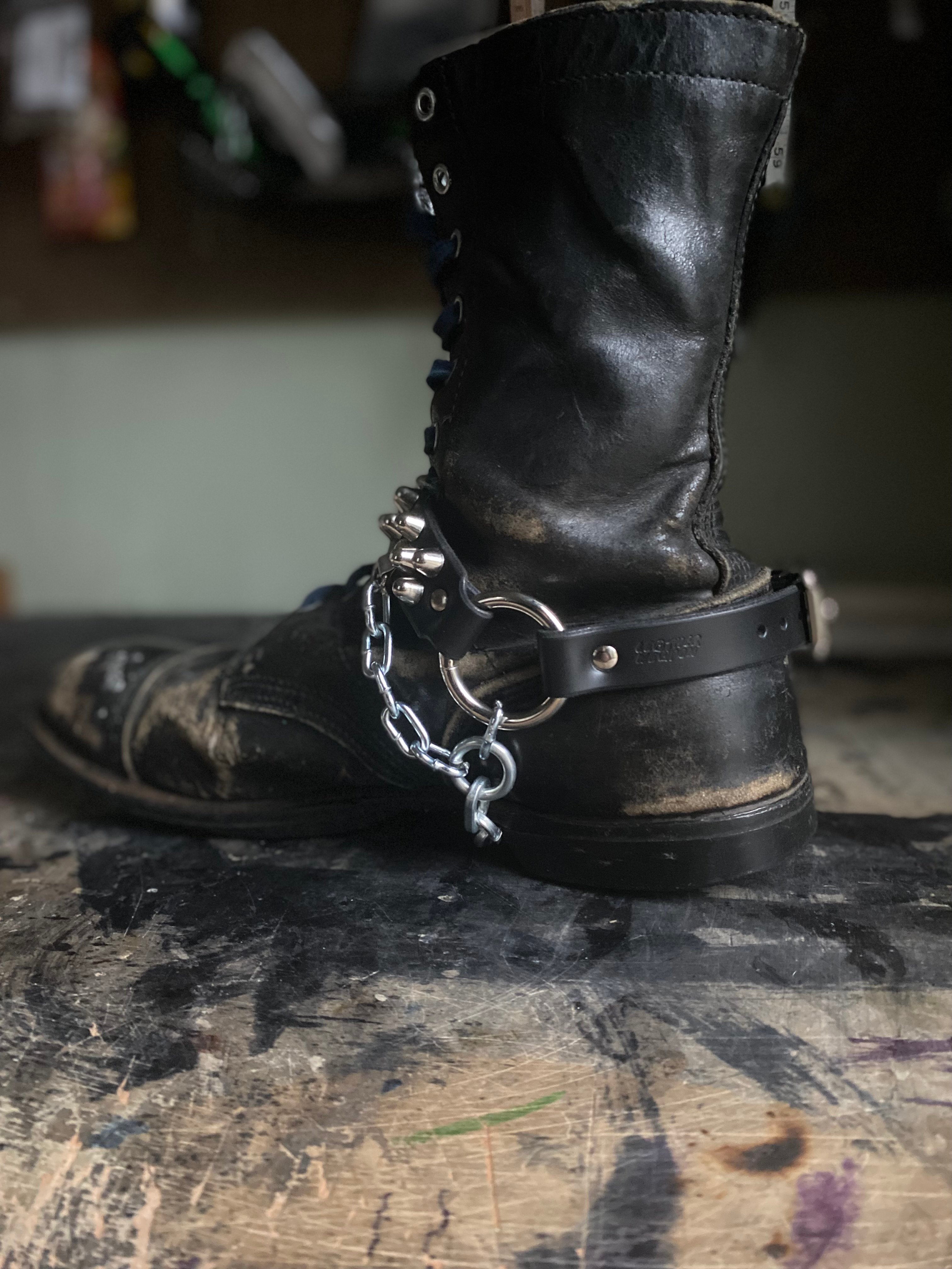 One premade bootstrap. Nickel buckle, o rings, and chains. Genuine black leather with short British studs.