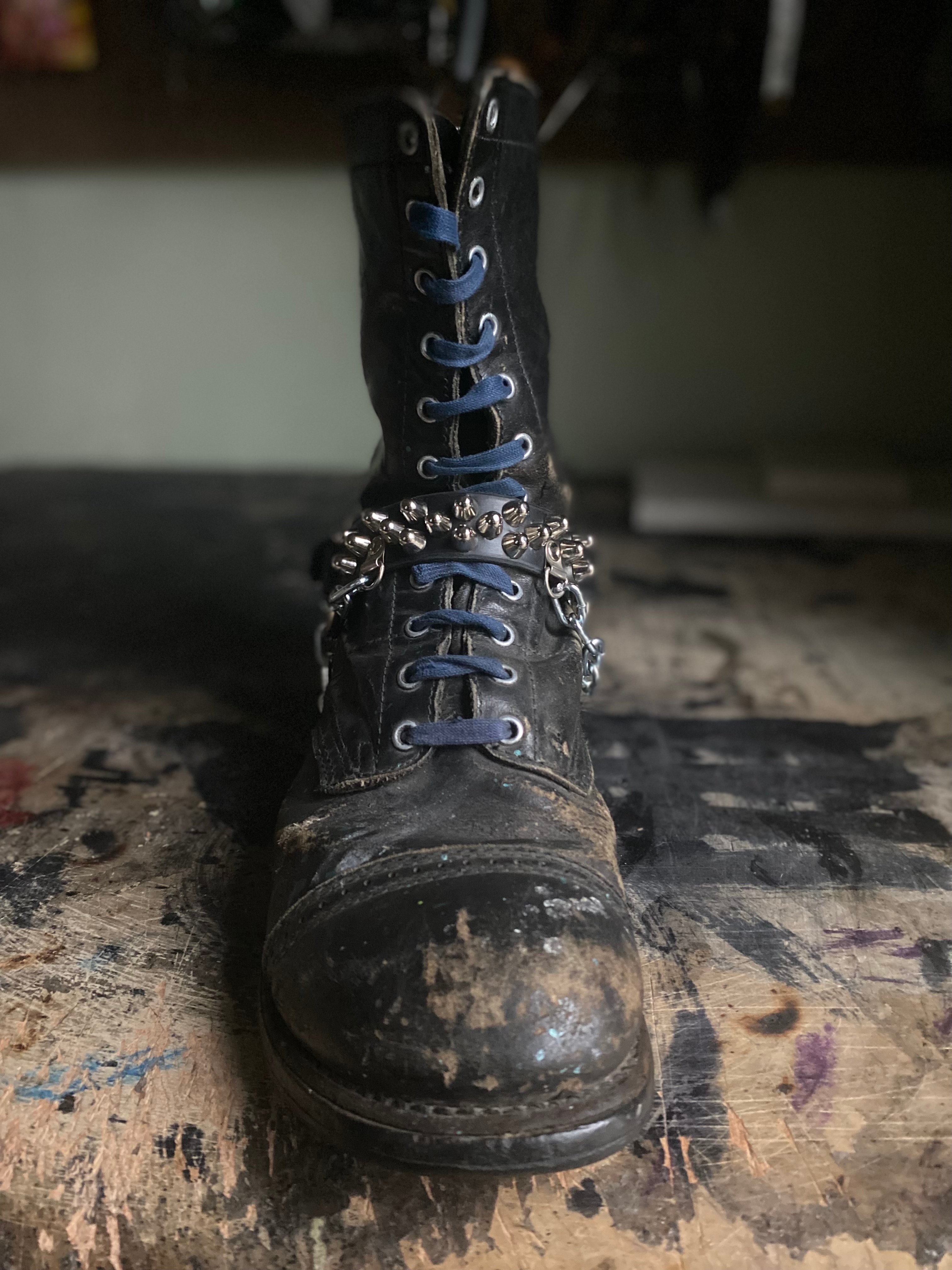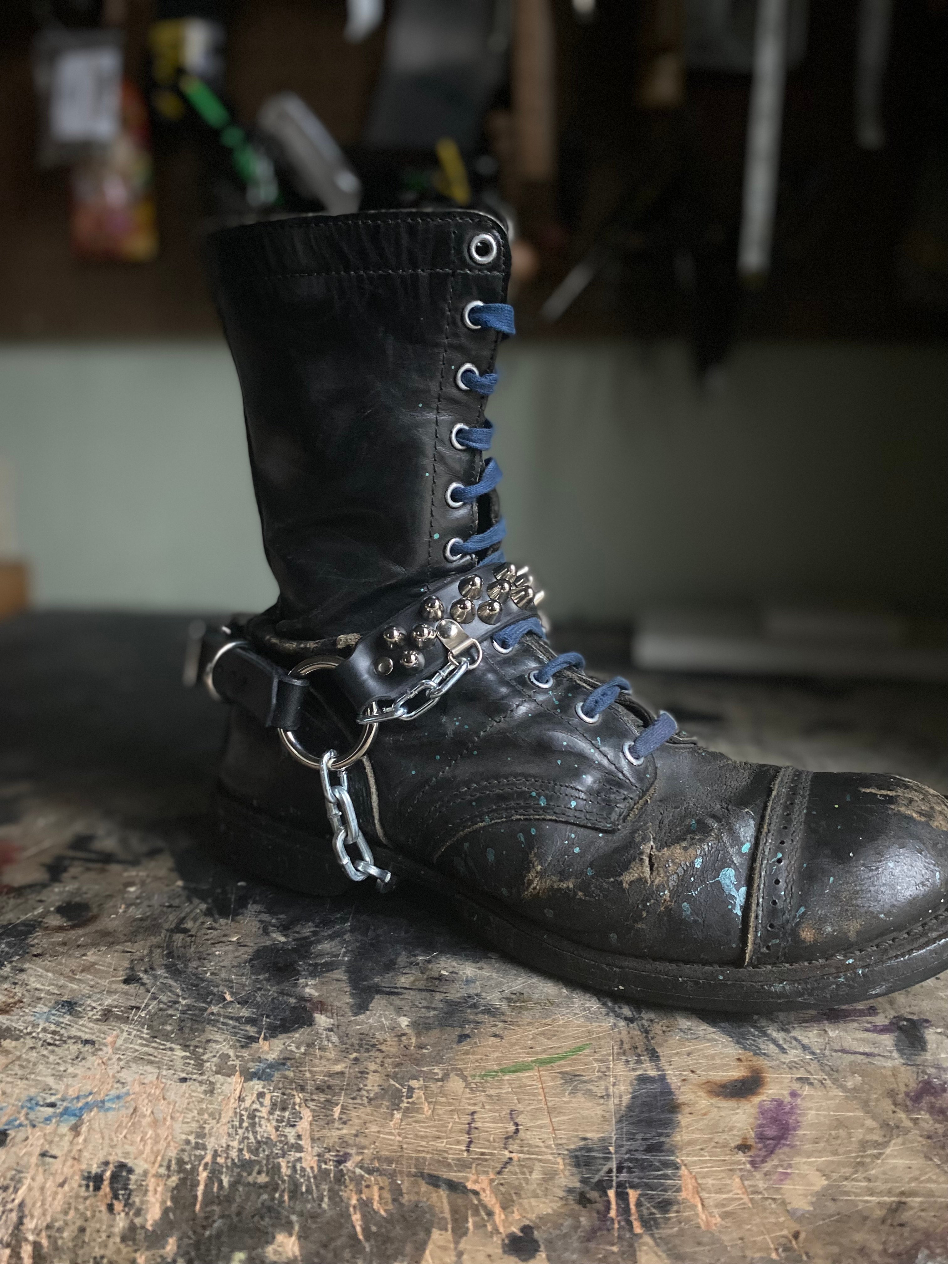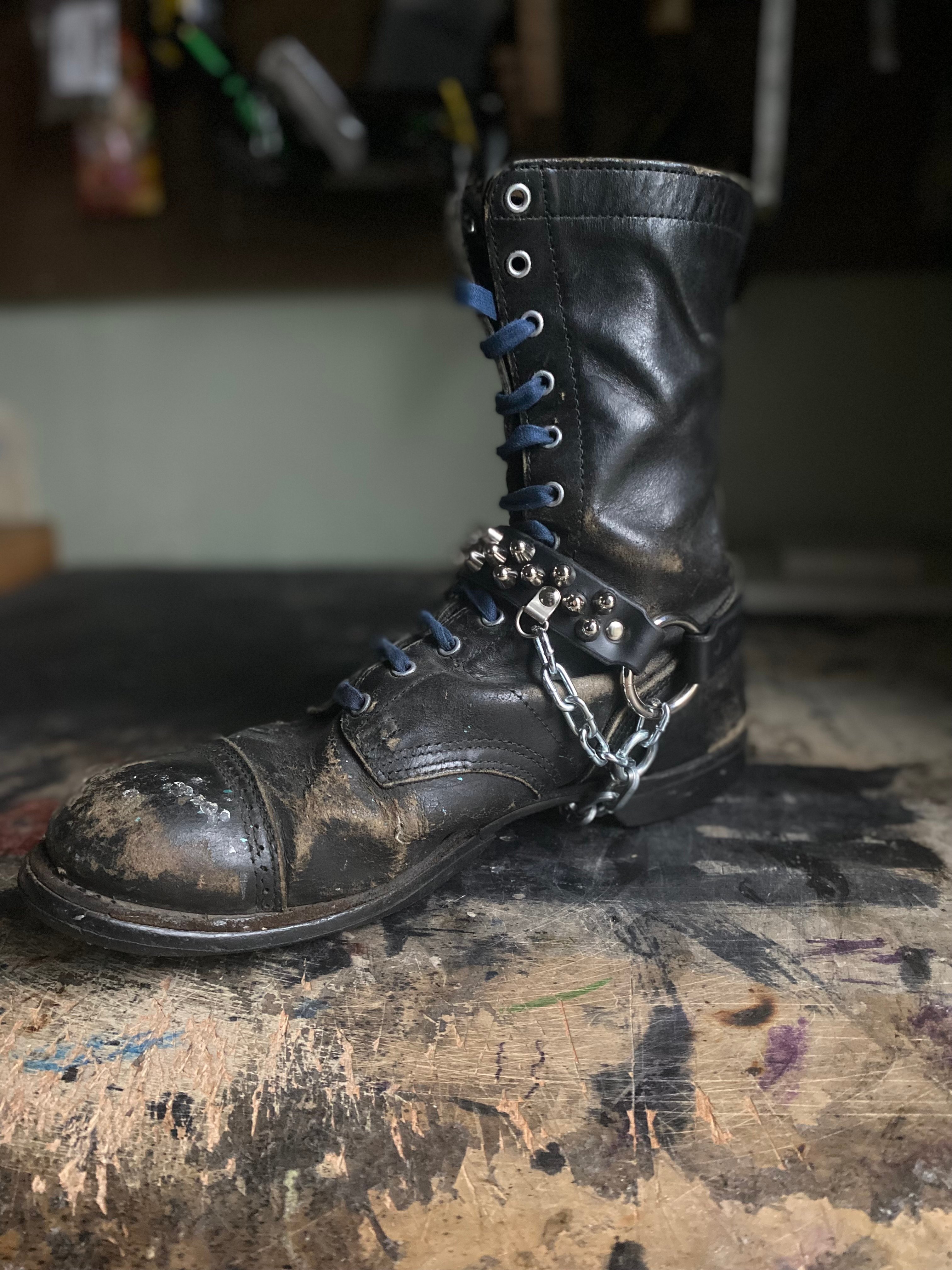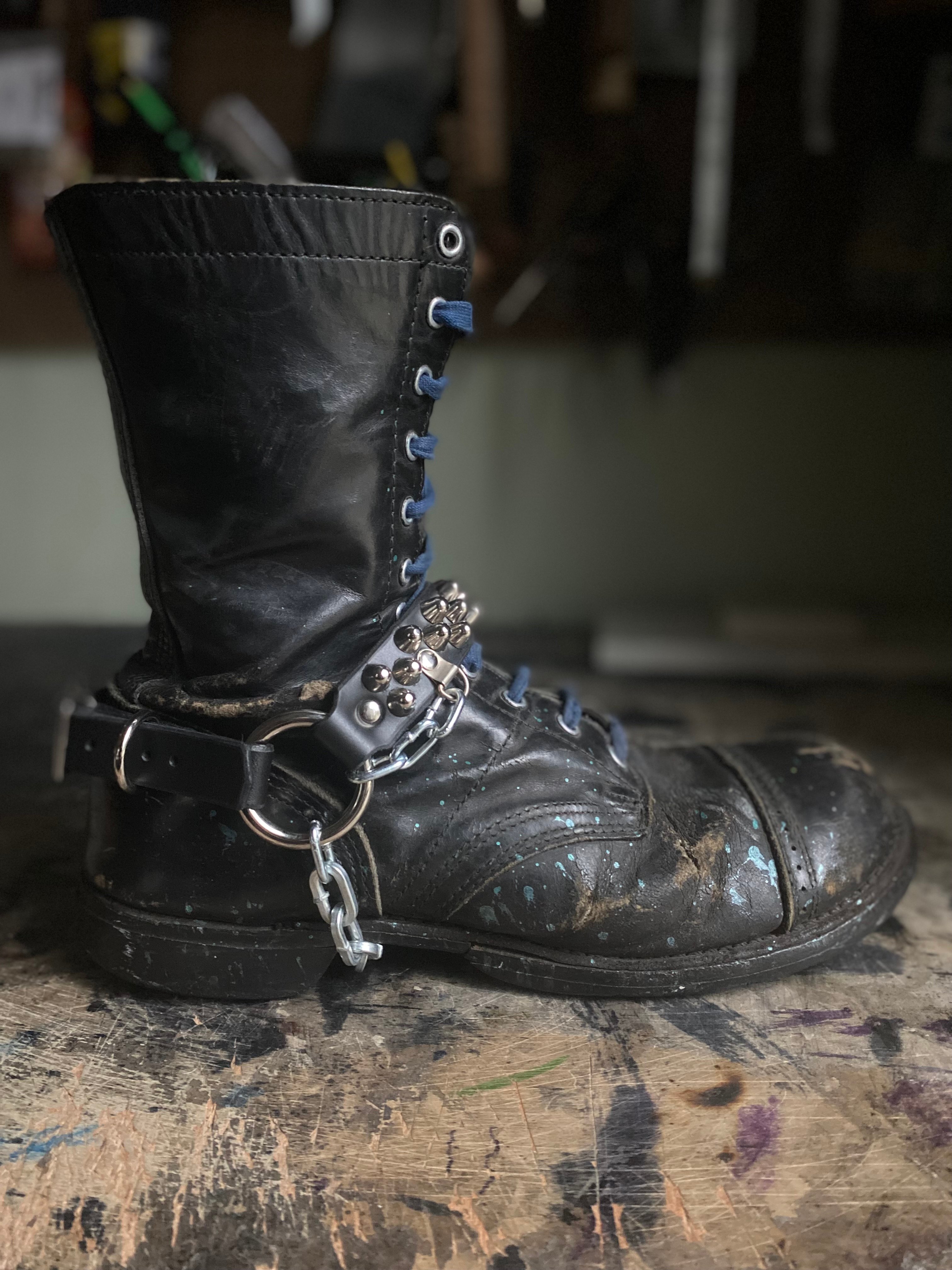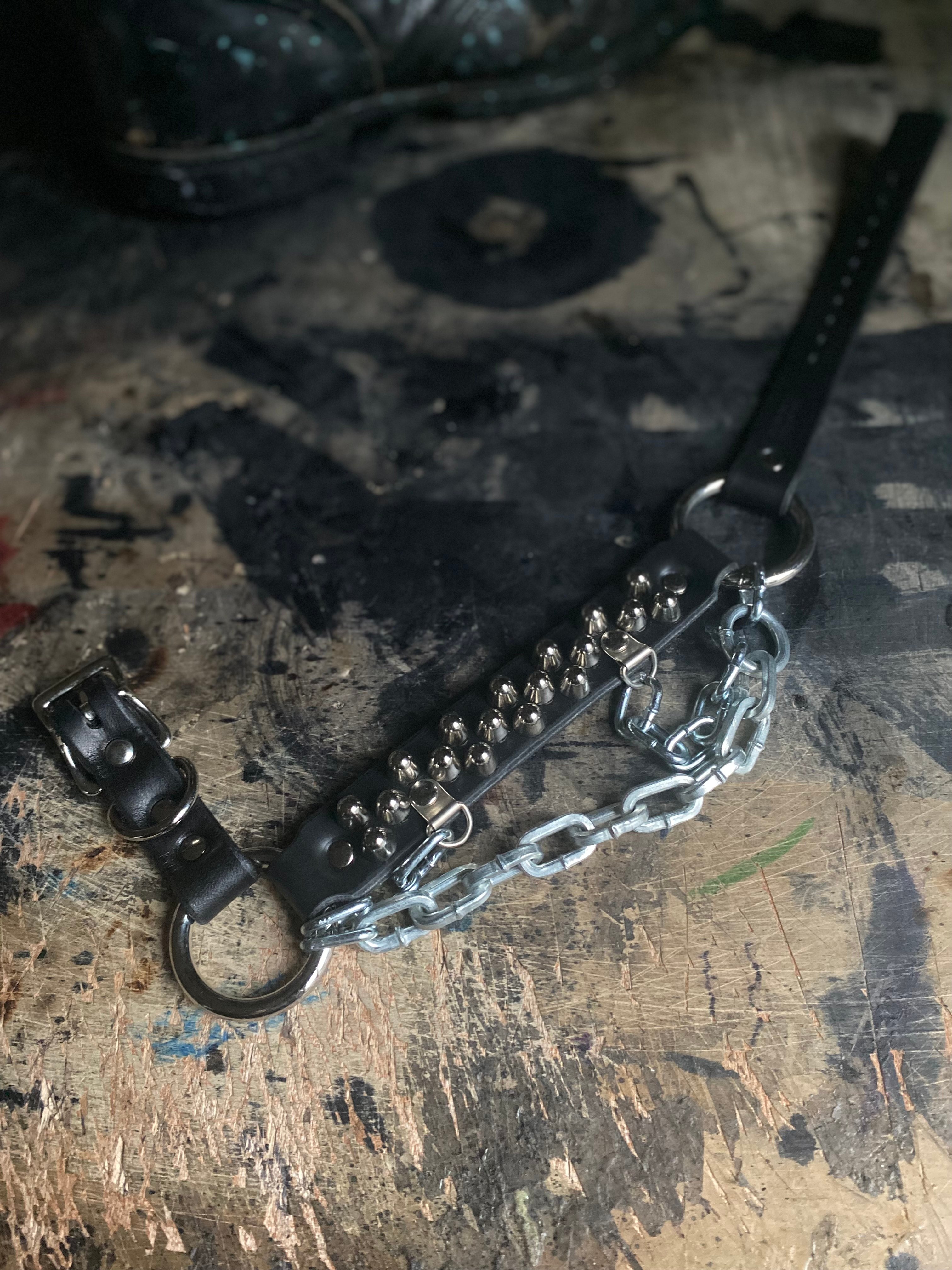 One premade bootstrap. Nickel buckle, o rings, and chains. Genuine black leather with short British studs.
