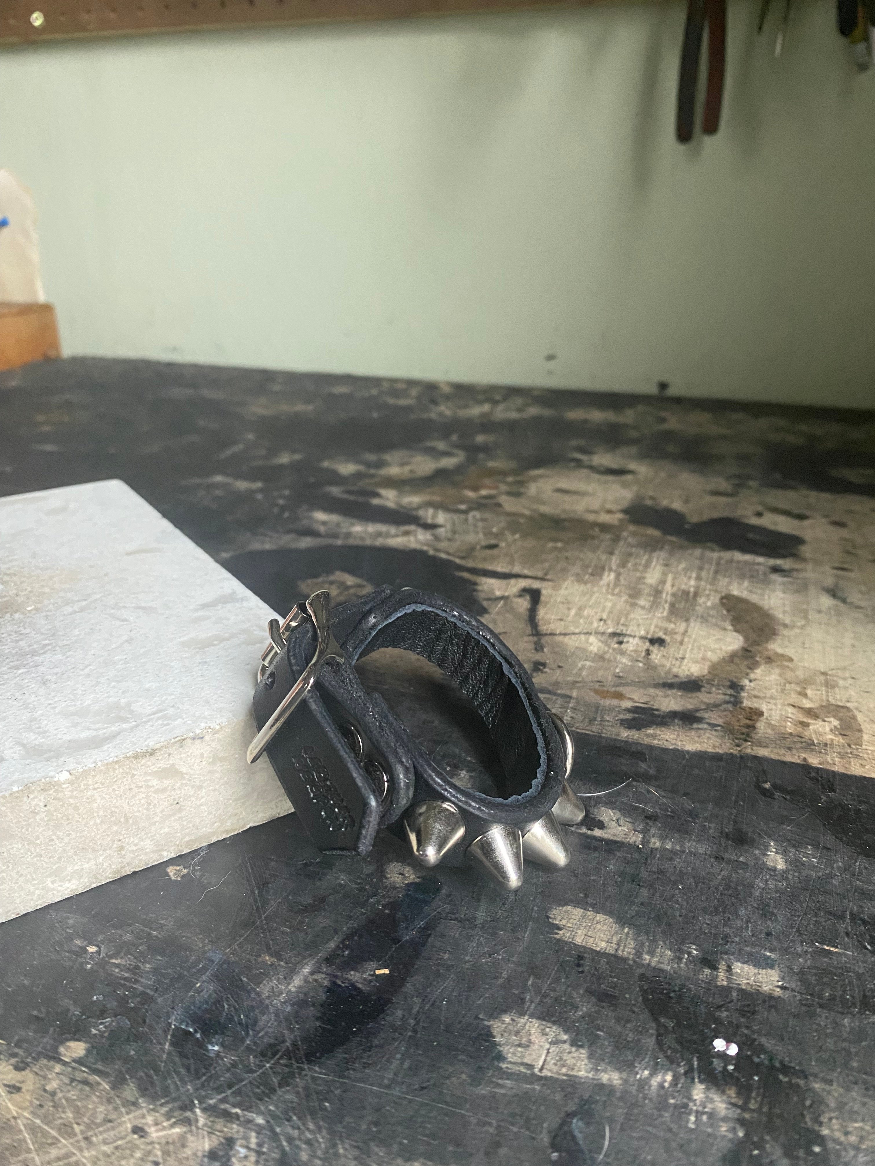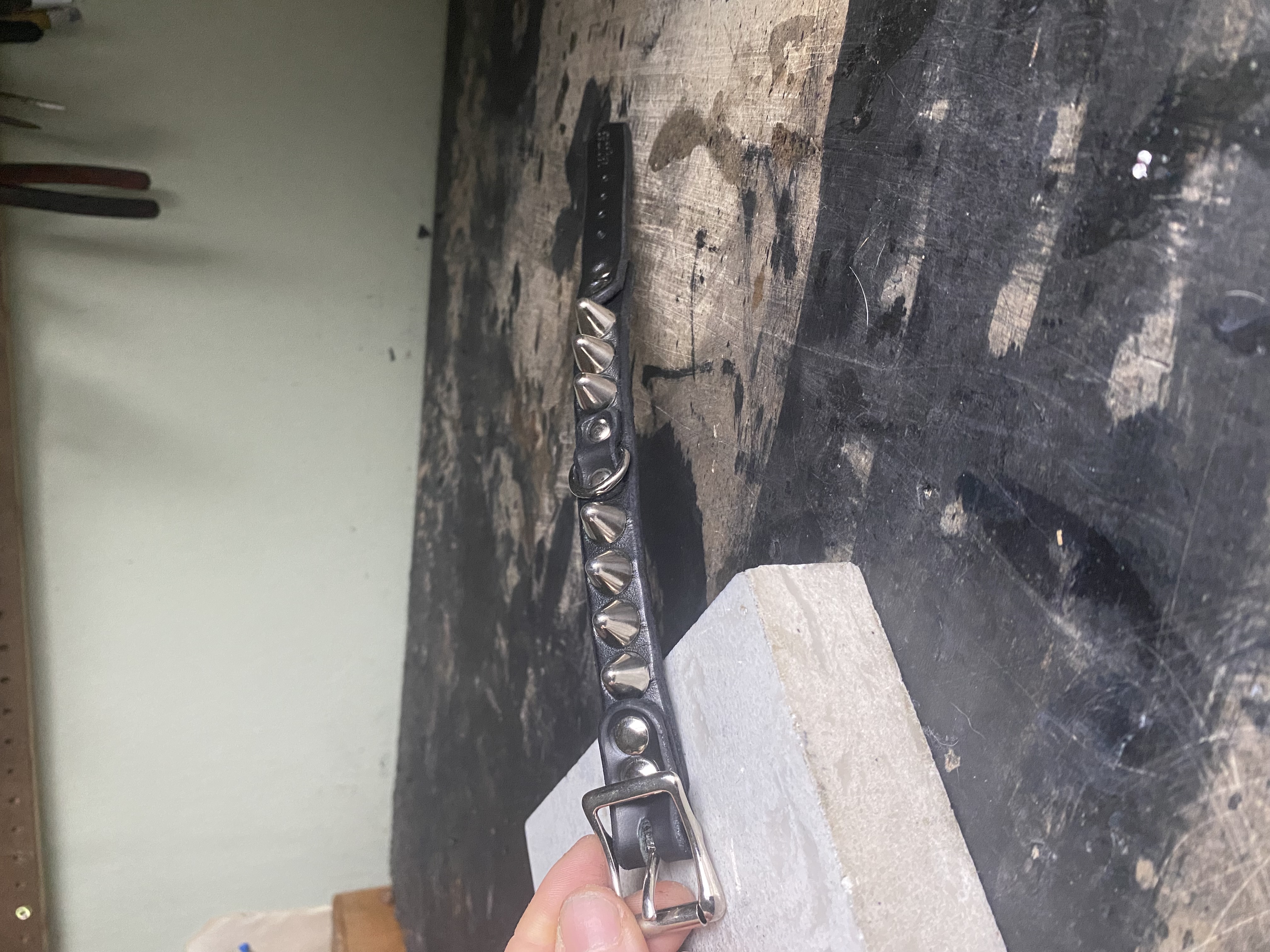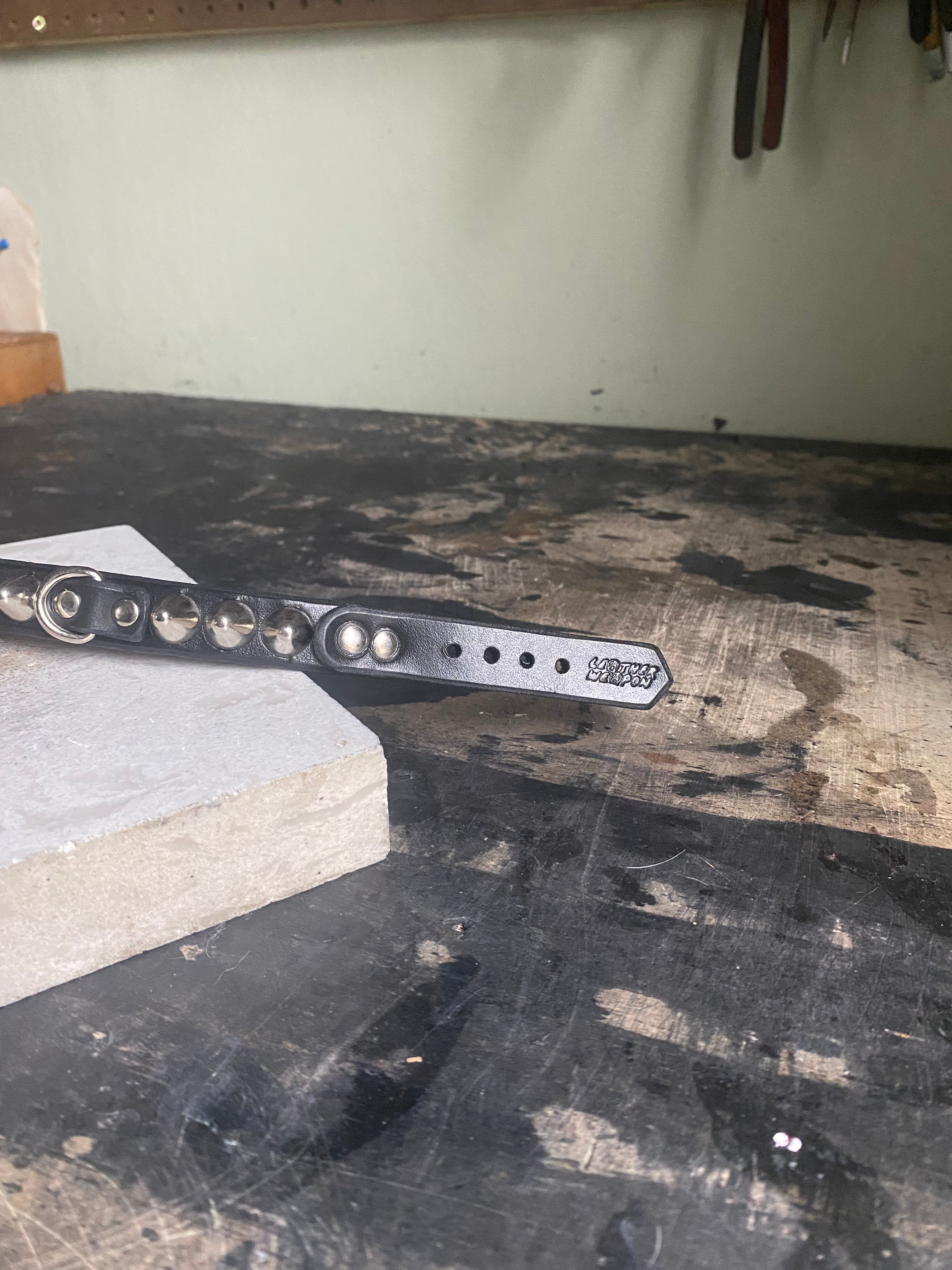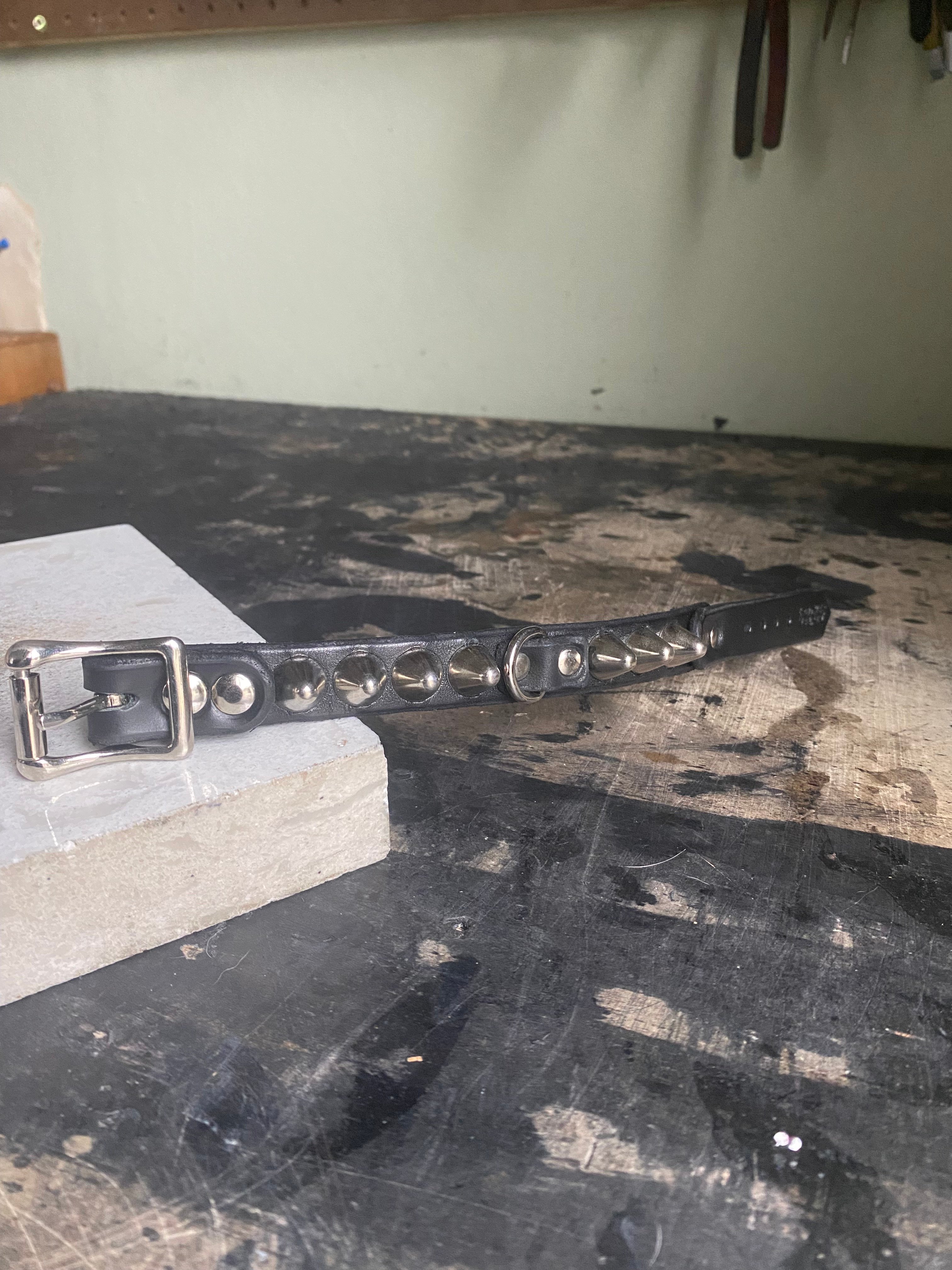 Complete with a self-keeping buckle/d-ring, panelled genuine black leather, nickel hardware, protective leather backing & tall british studs.