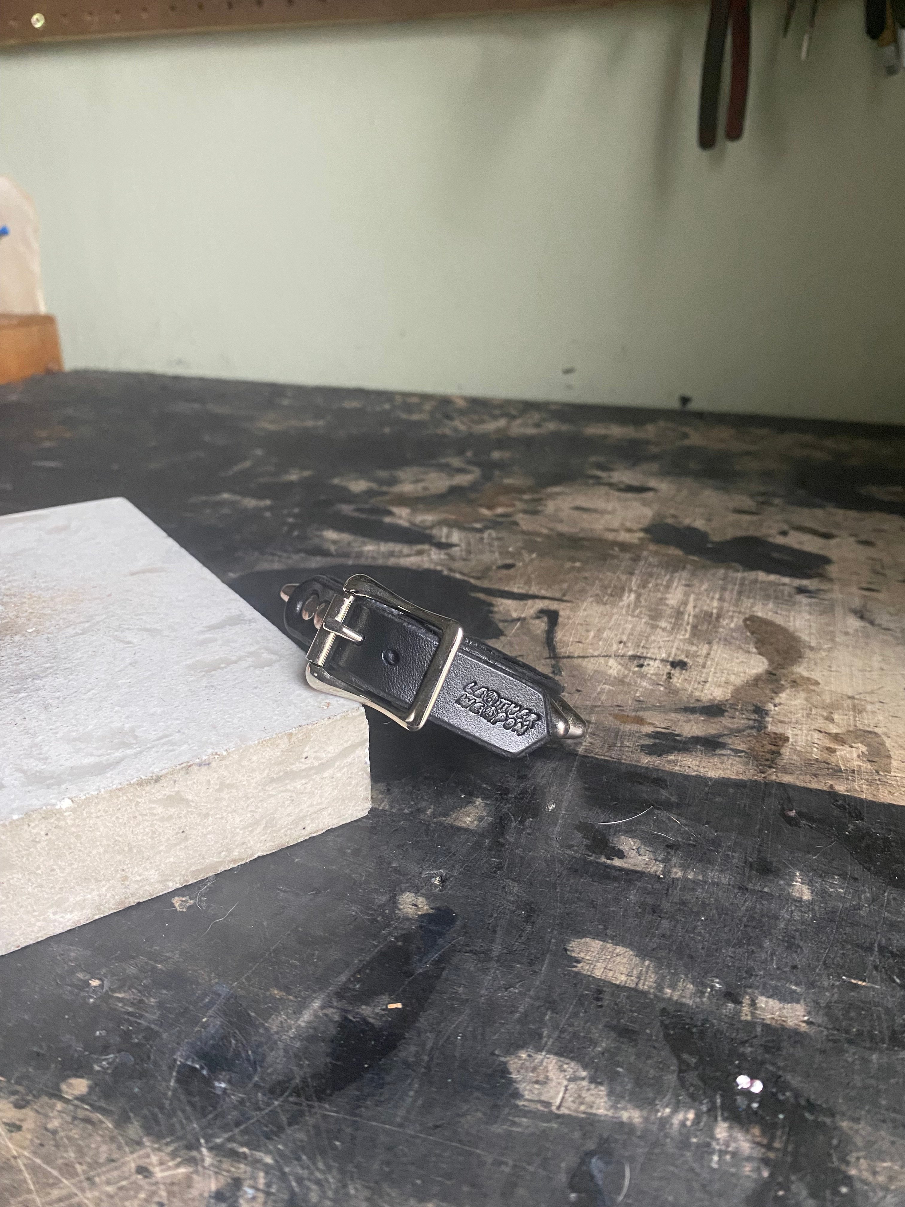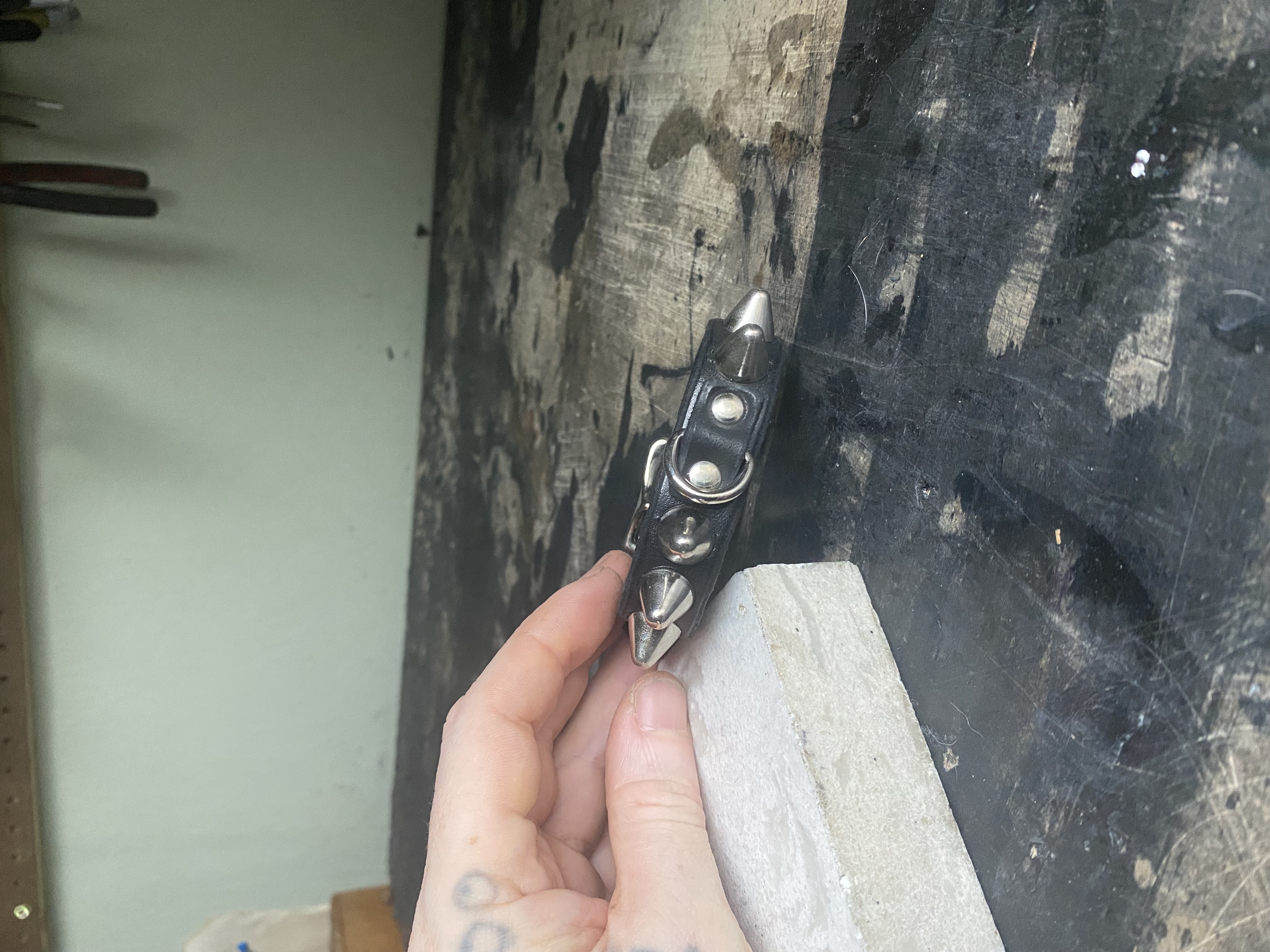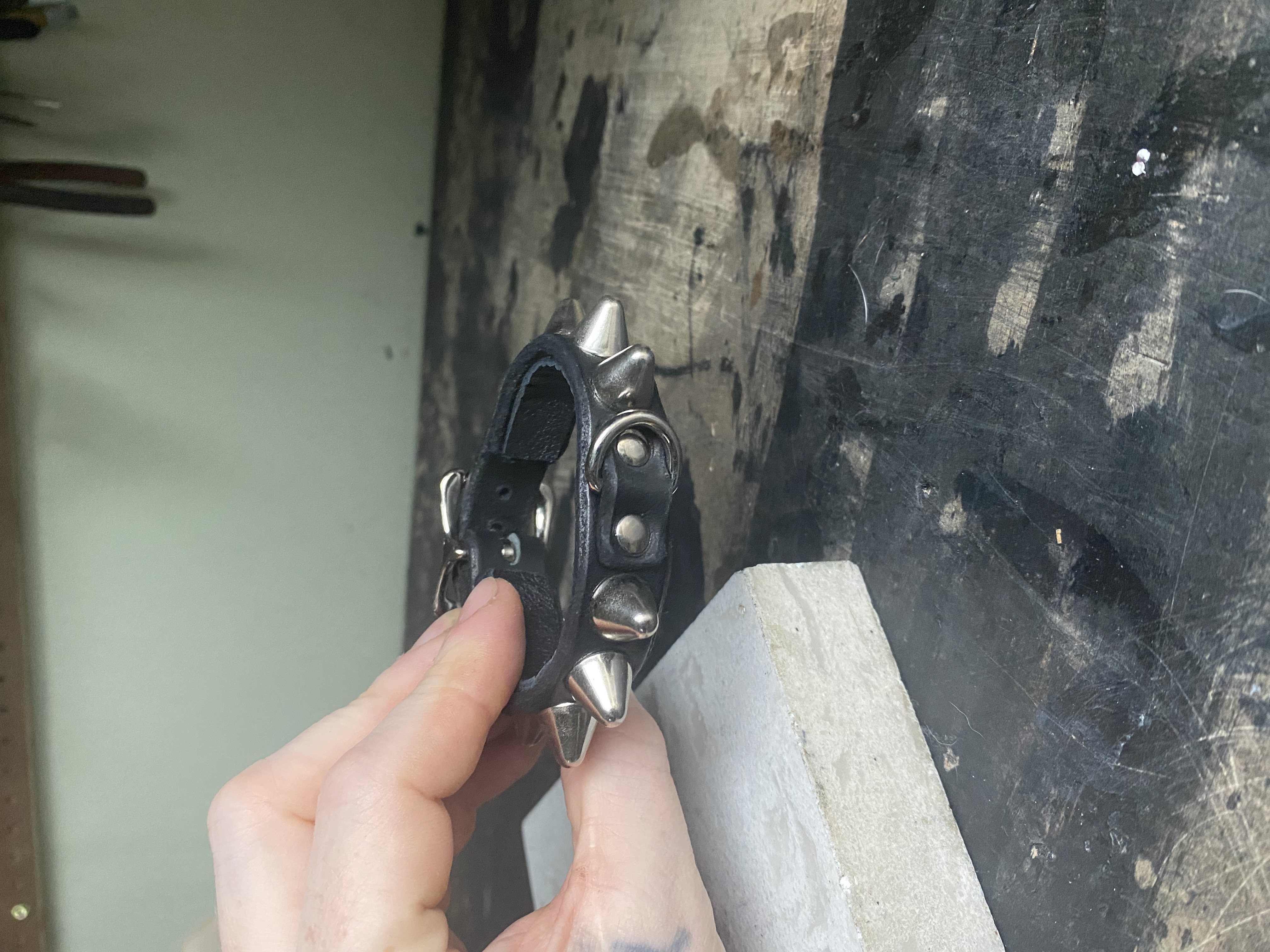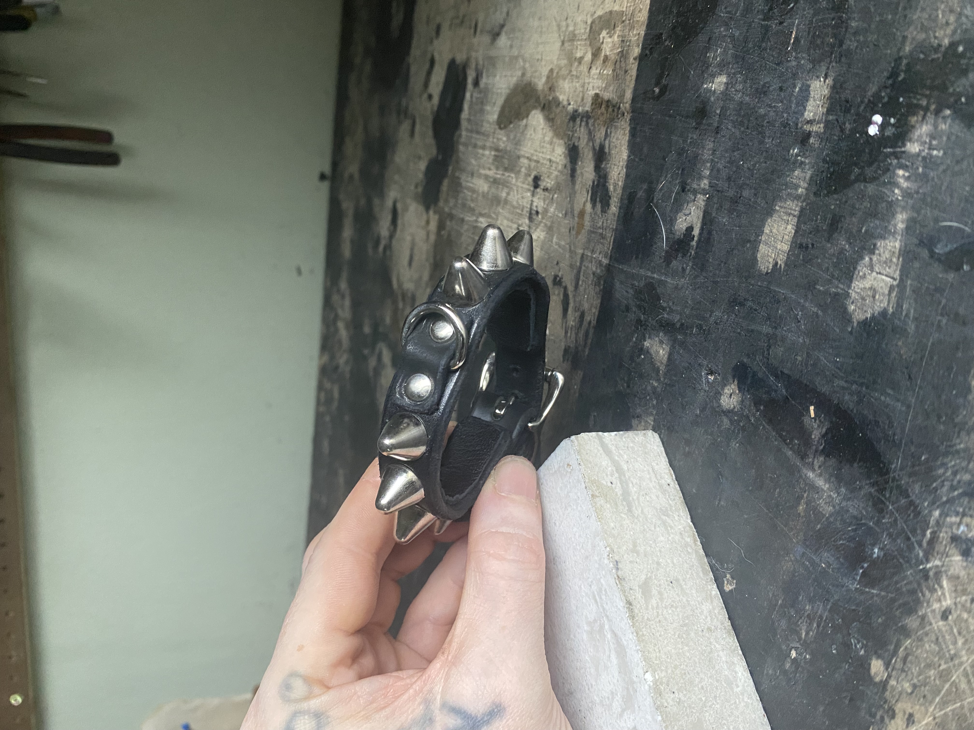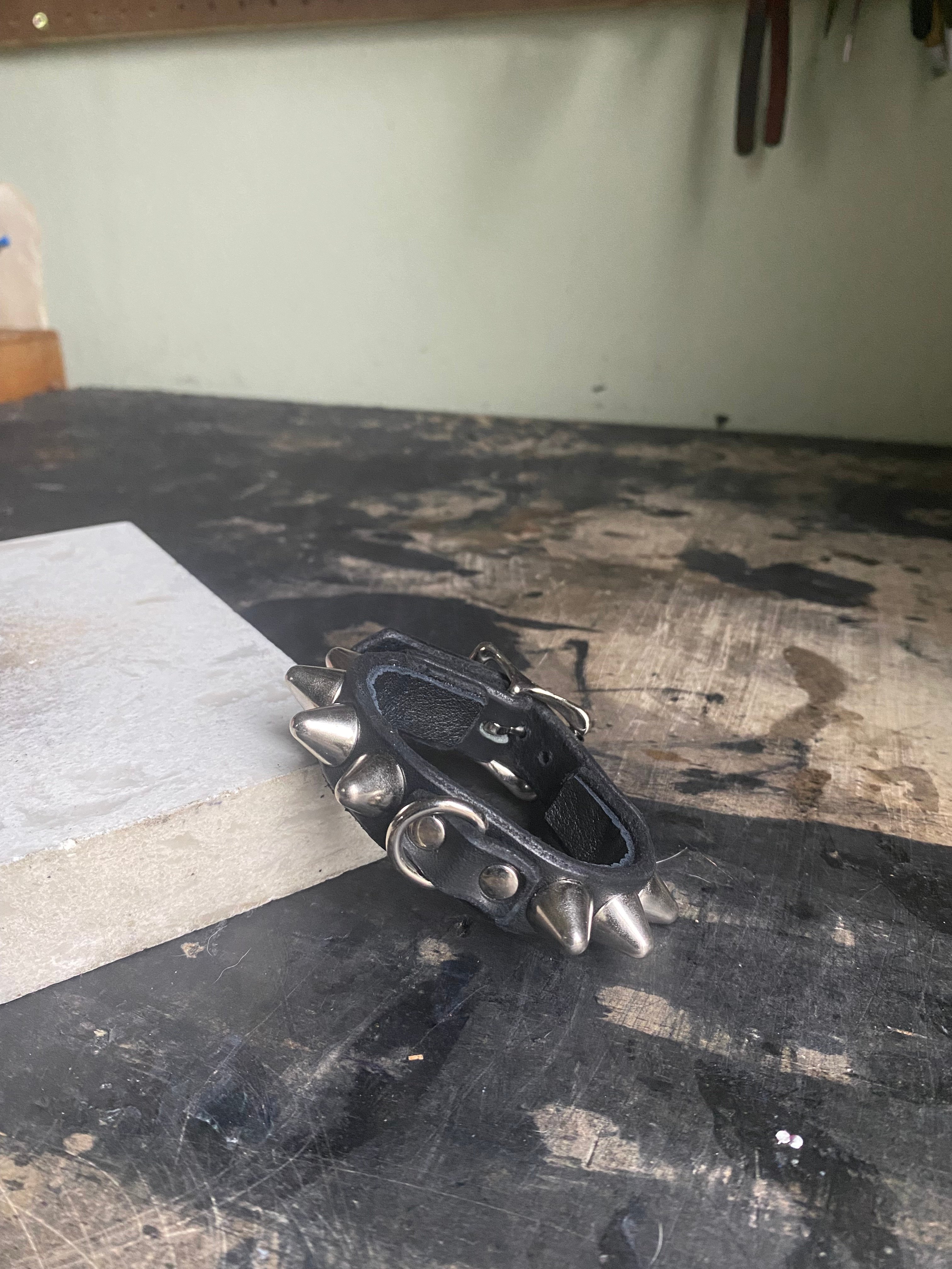 Complete with a self-keeping buckle/d-ring, panelled genuine black leather, nickel hardware, protective leather backing & tall british studs.
