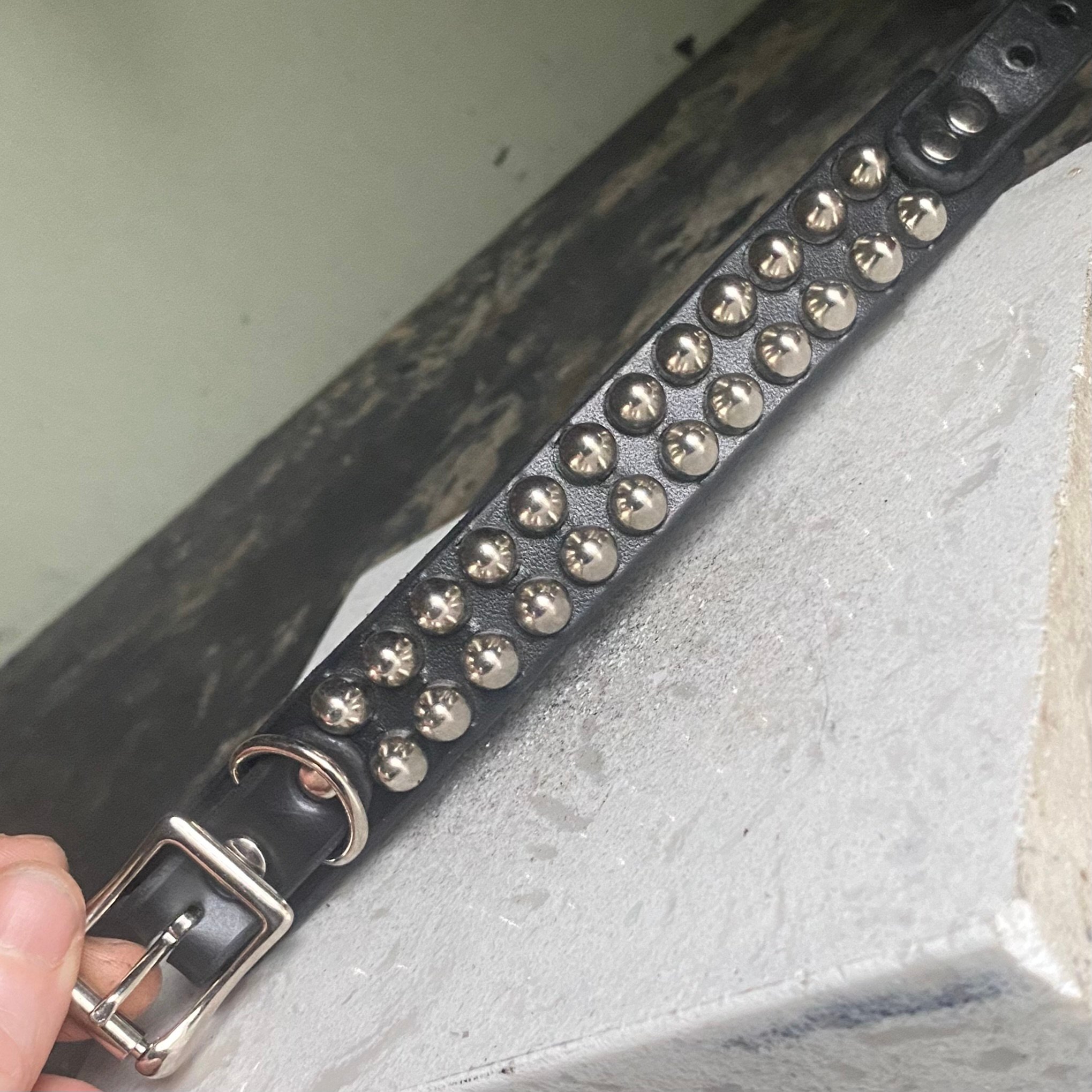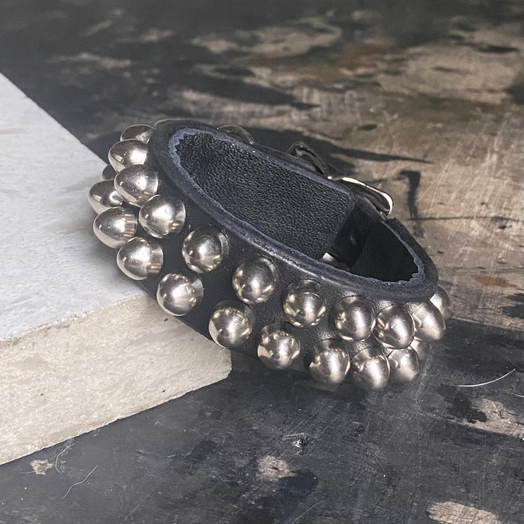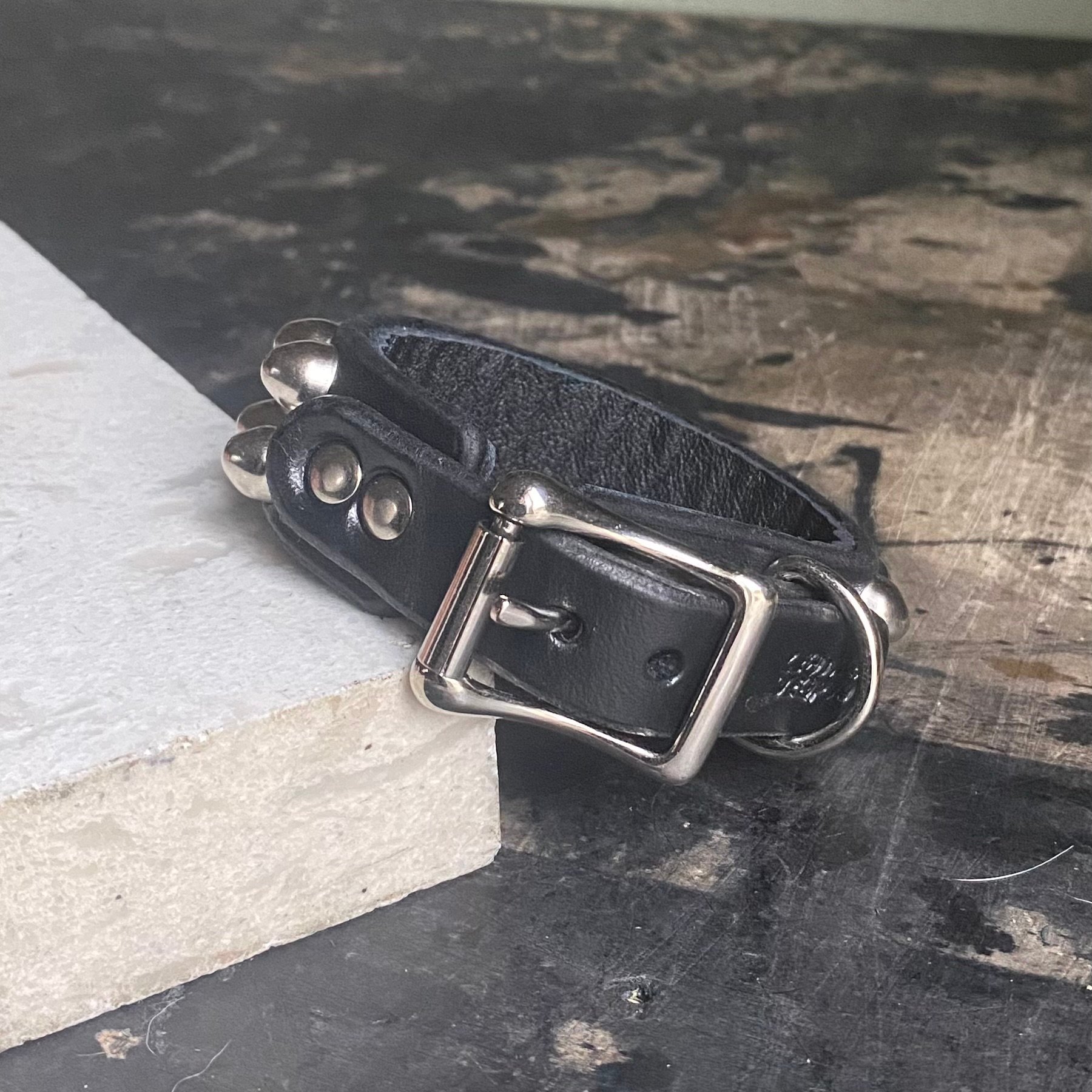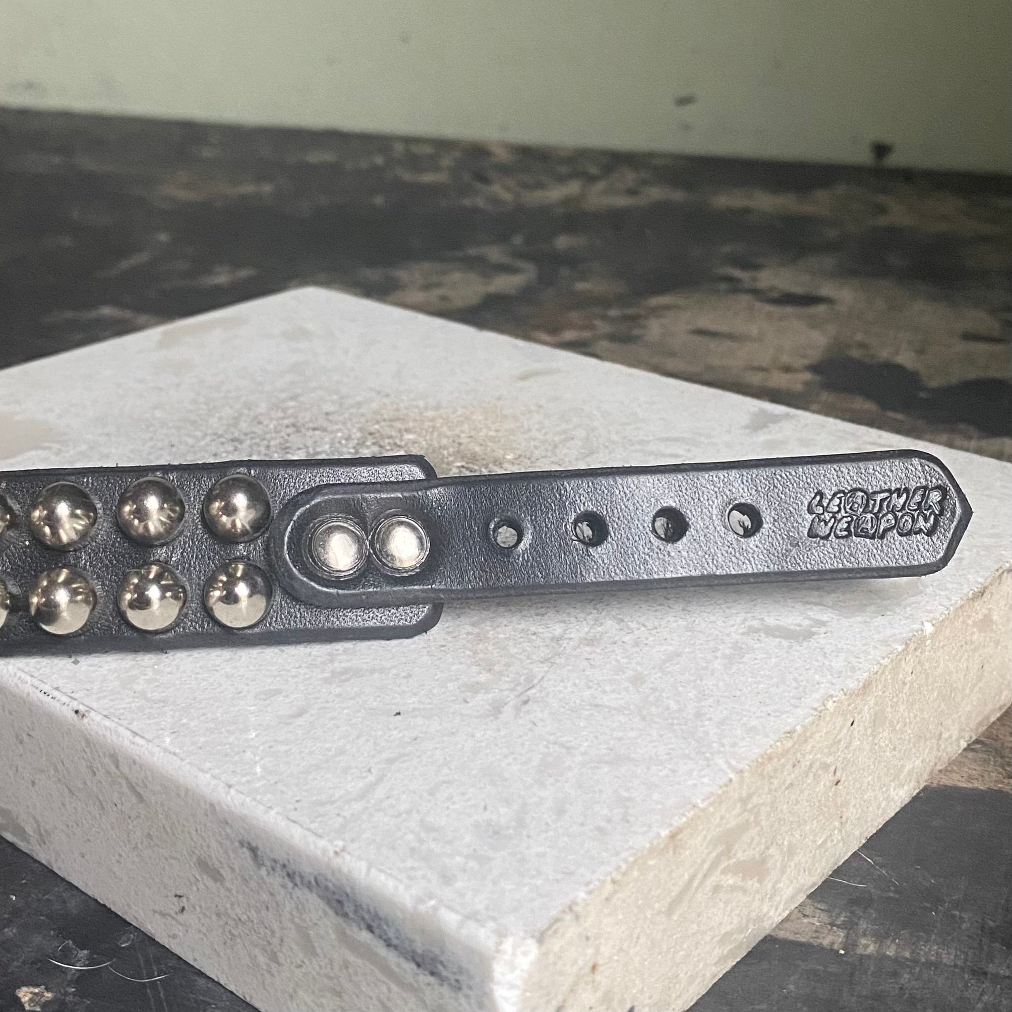 Complete with a self keeper buckle/d-ring, panelled genuine black leather, nickel hardware, protective leather backing & two rows of Bullet studs.