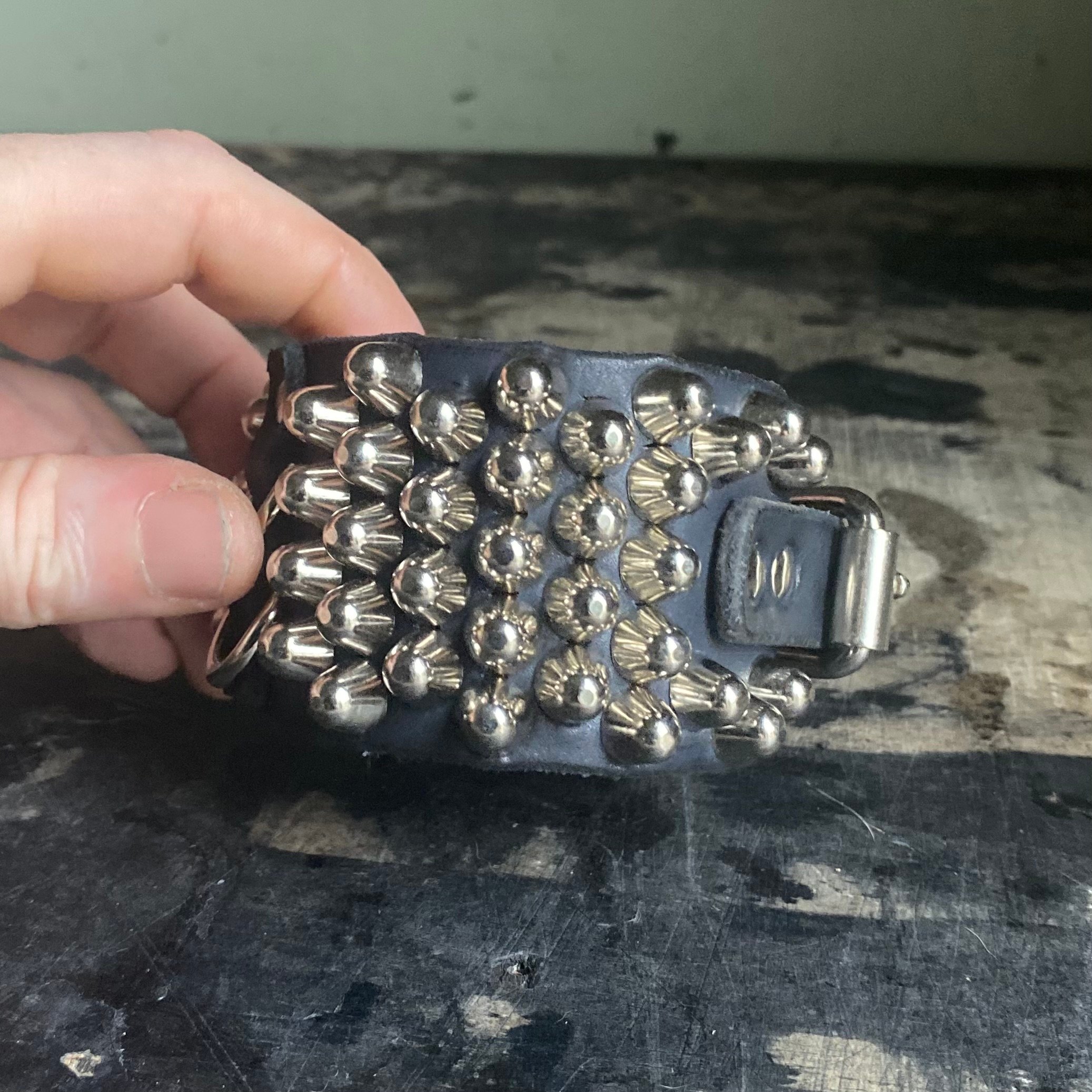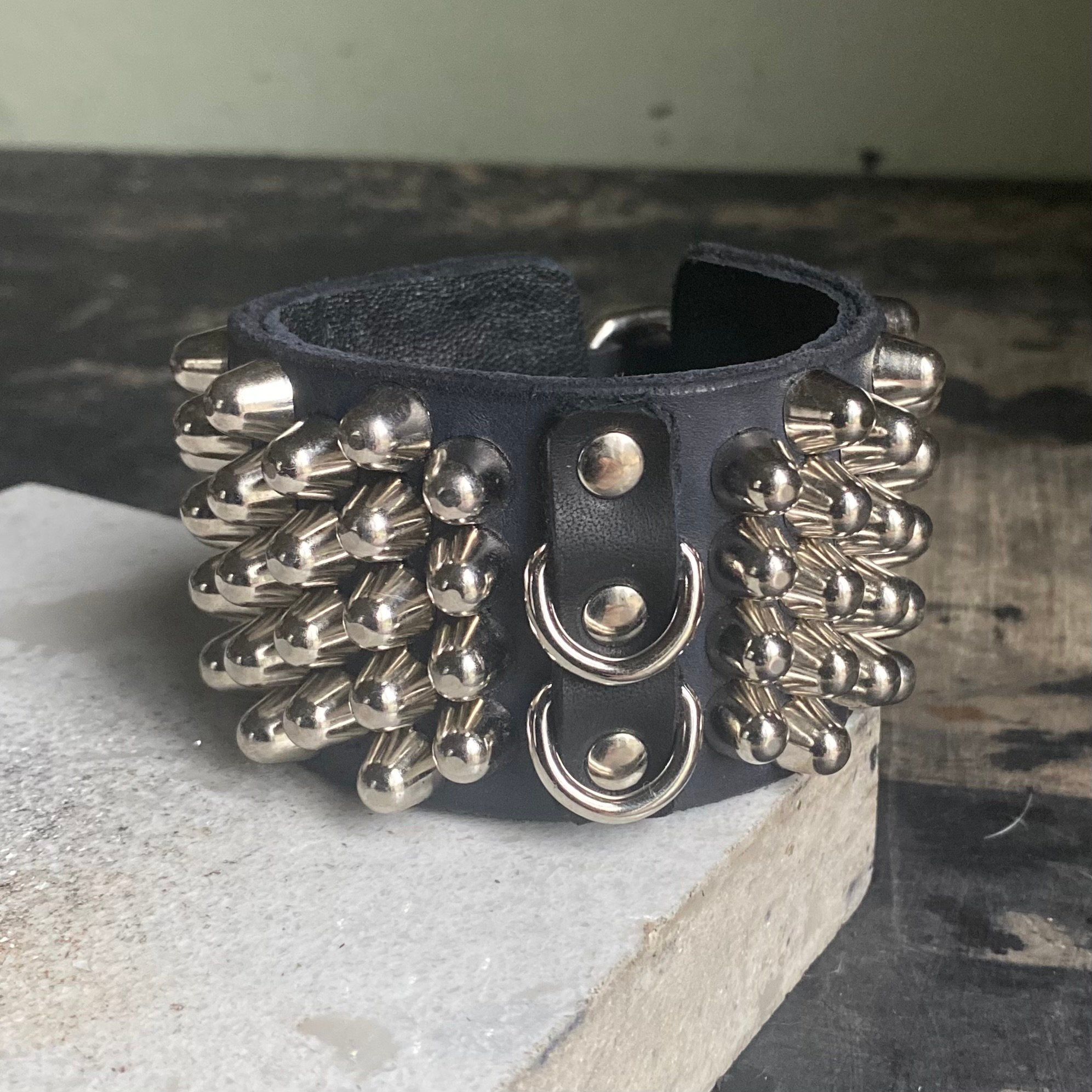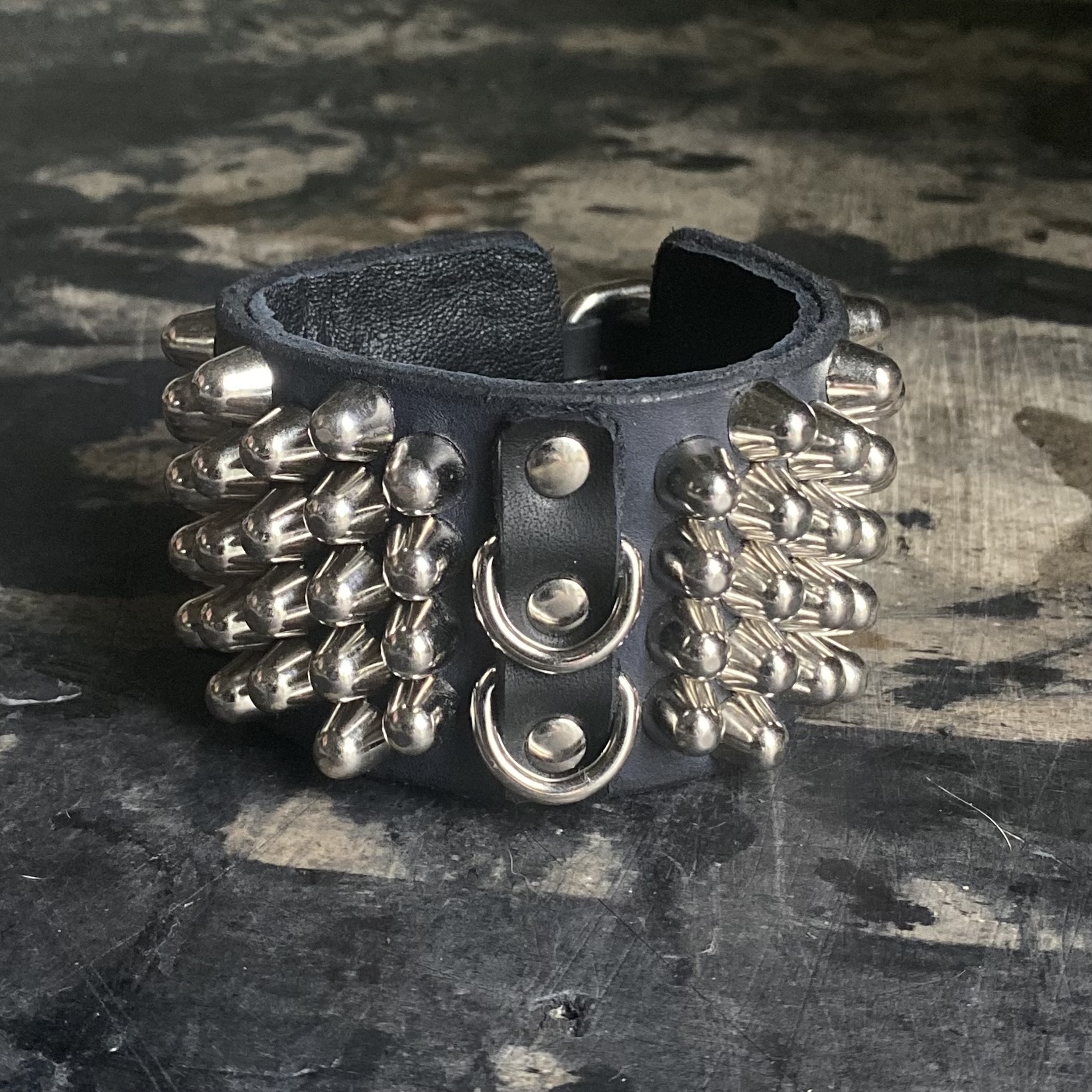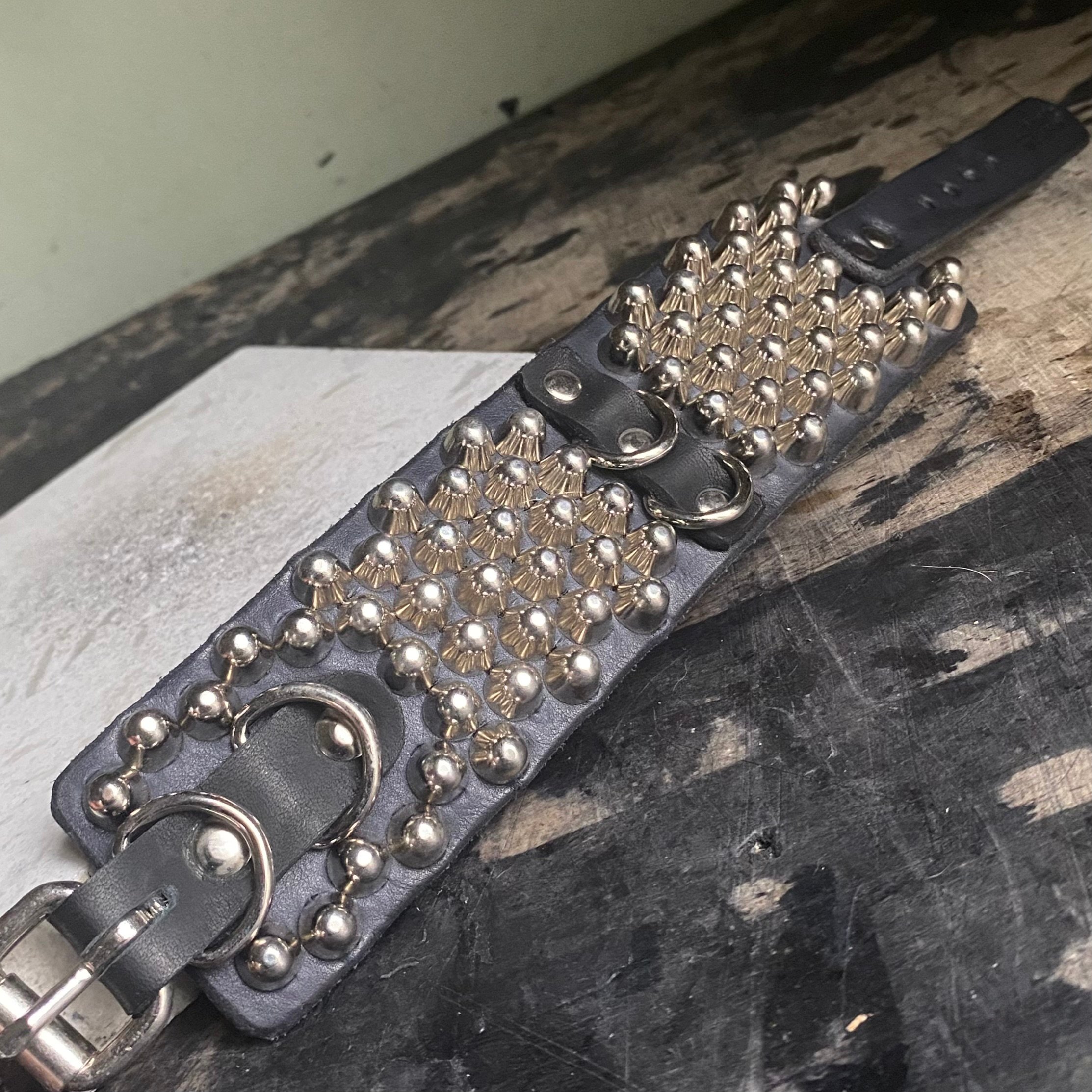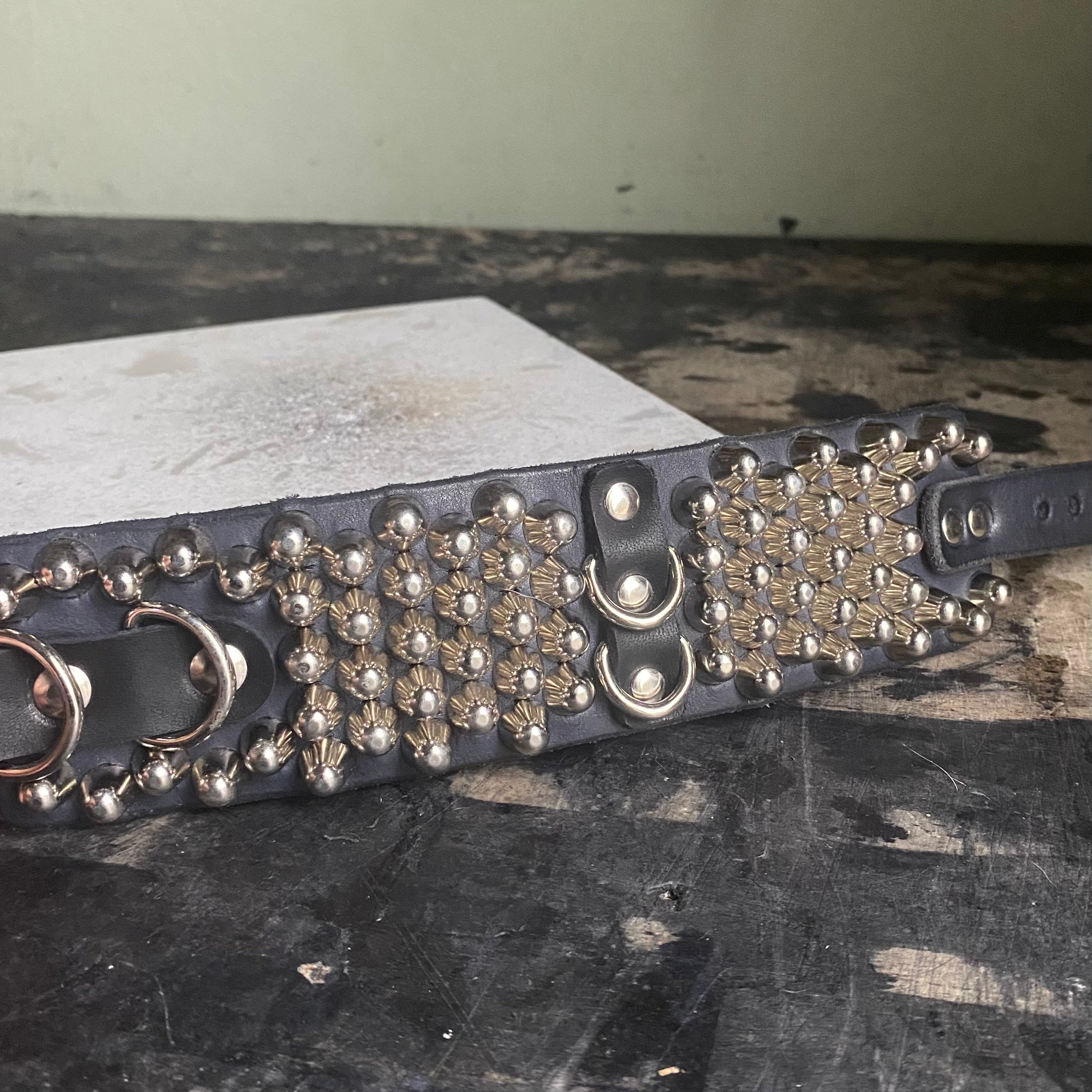 Complete with a roller buckle/d-ring, panelled genuine black leather, nickel hardware, protective leather backing, d-rings panel & short British studs.